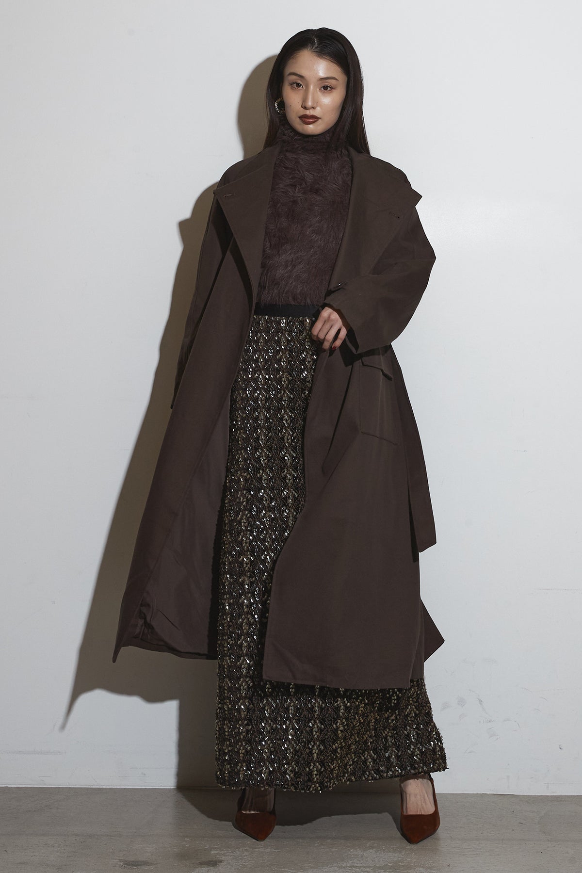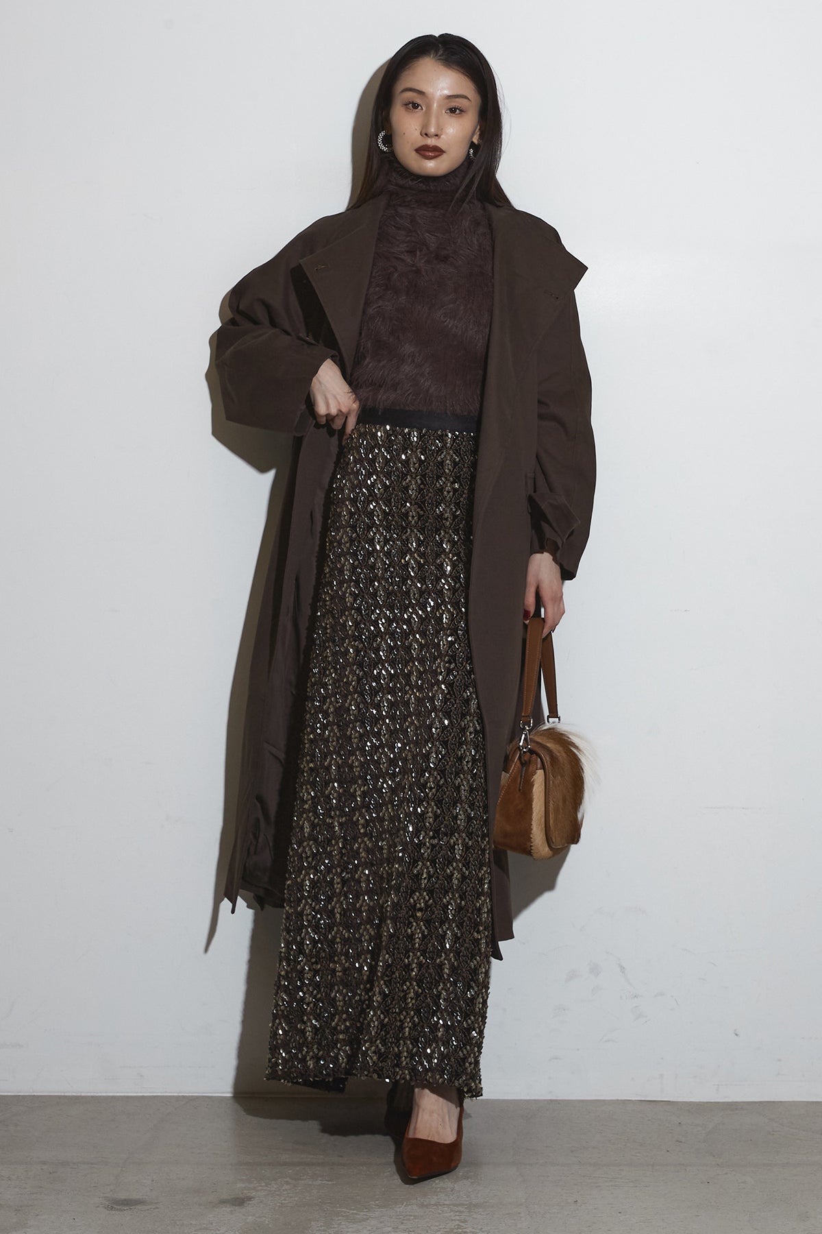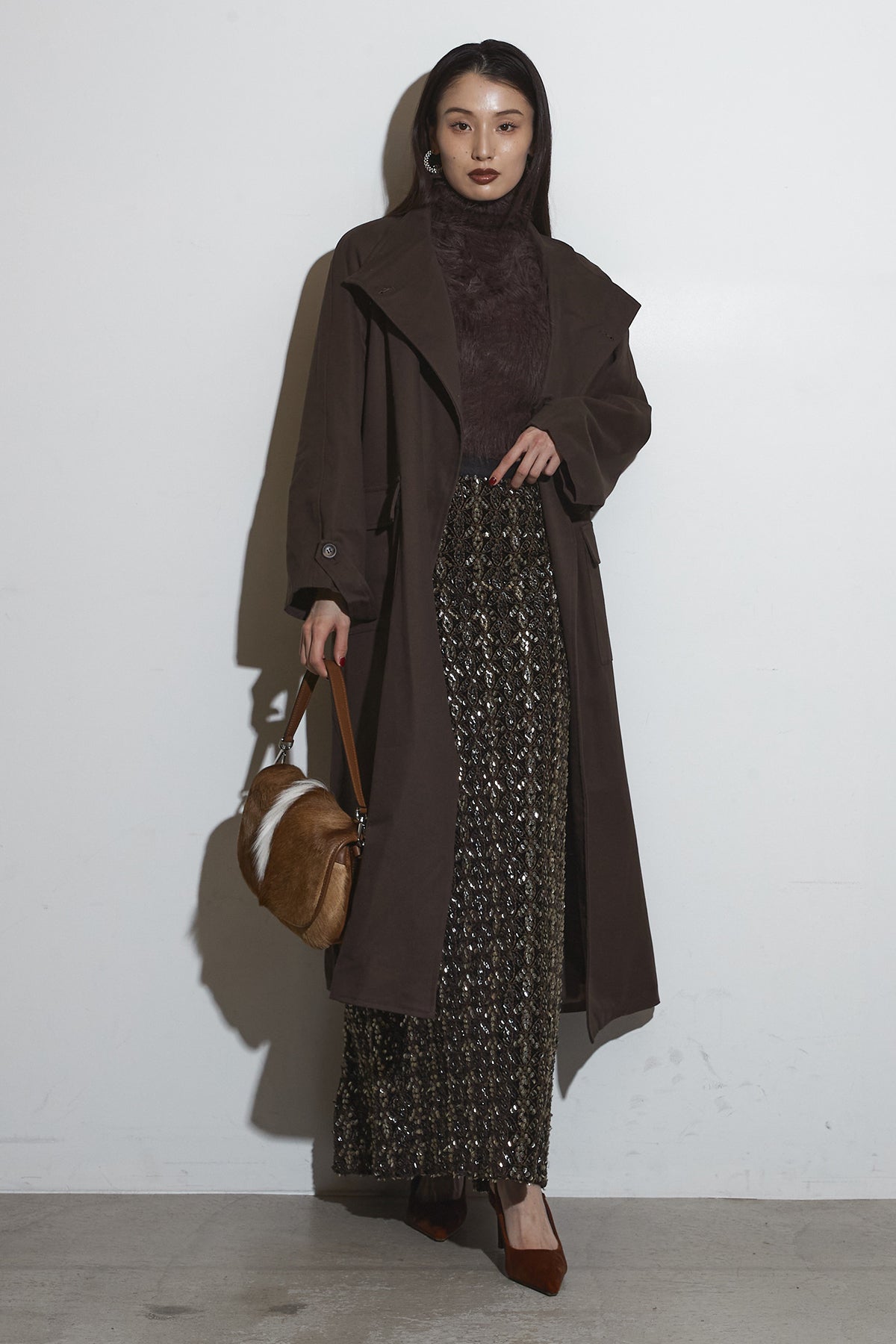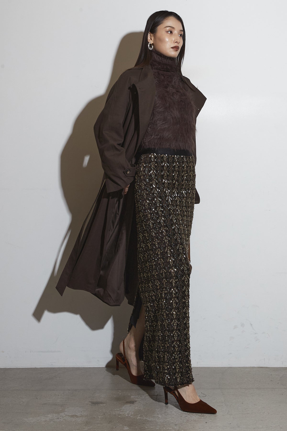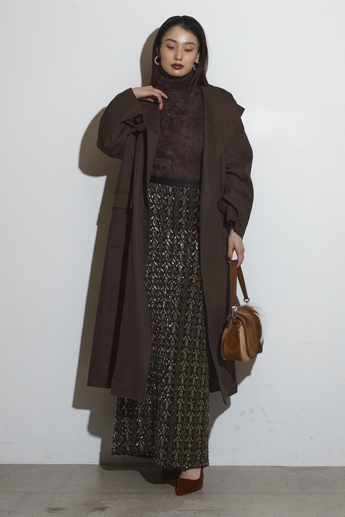 【SET】ベルテッドロングコート+ショートスリーブシャギーニット+コード刺繍スパンコールスカート