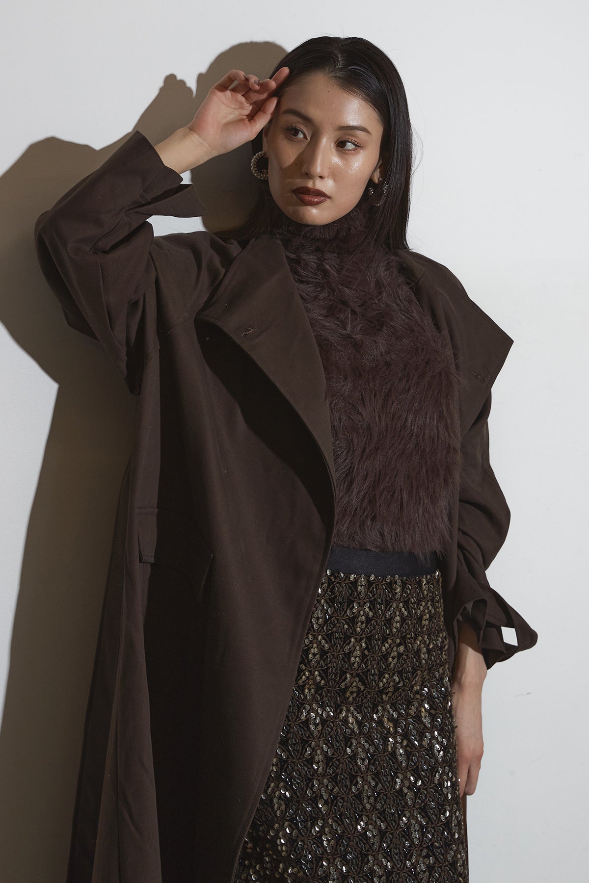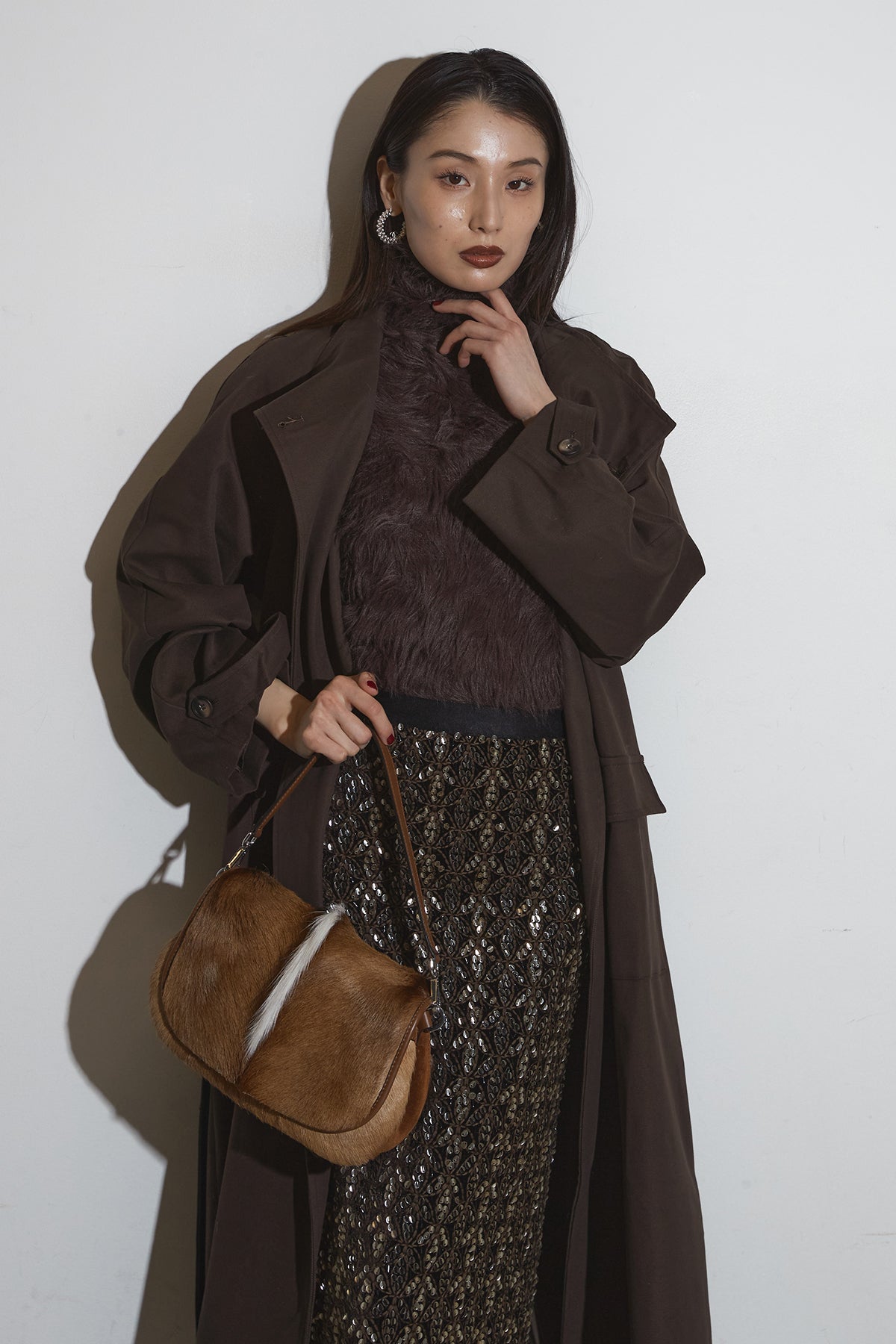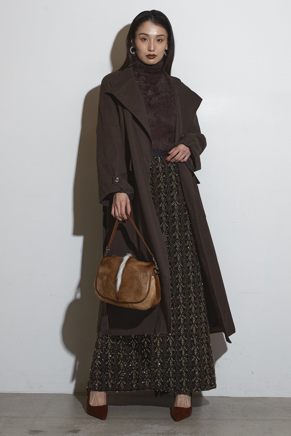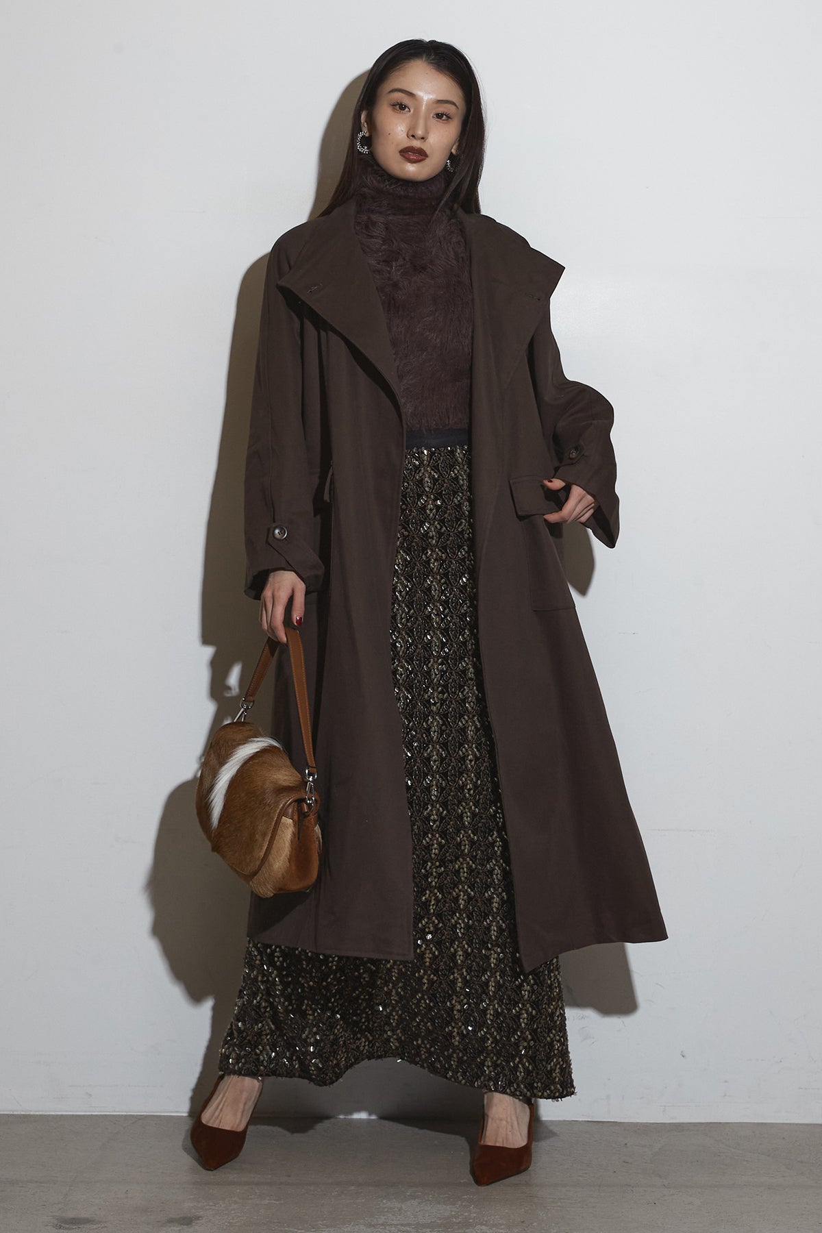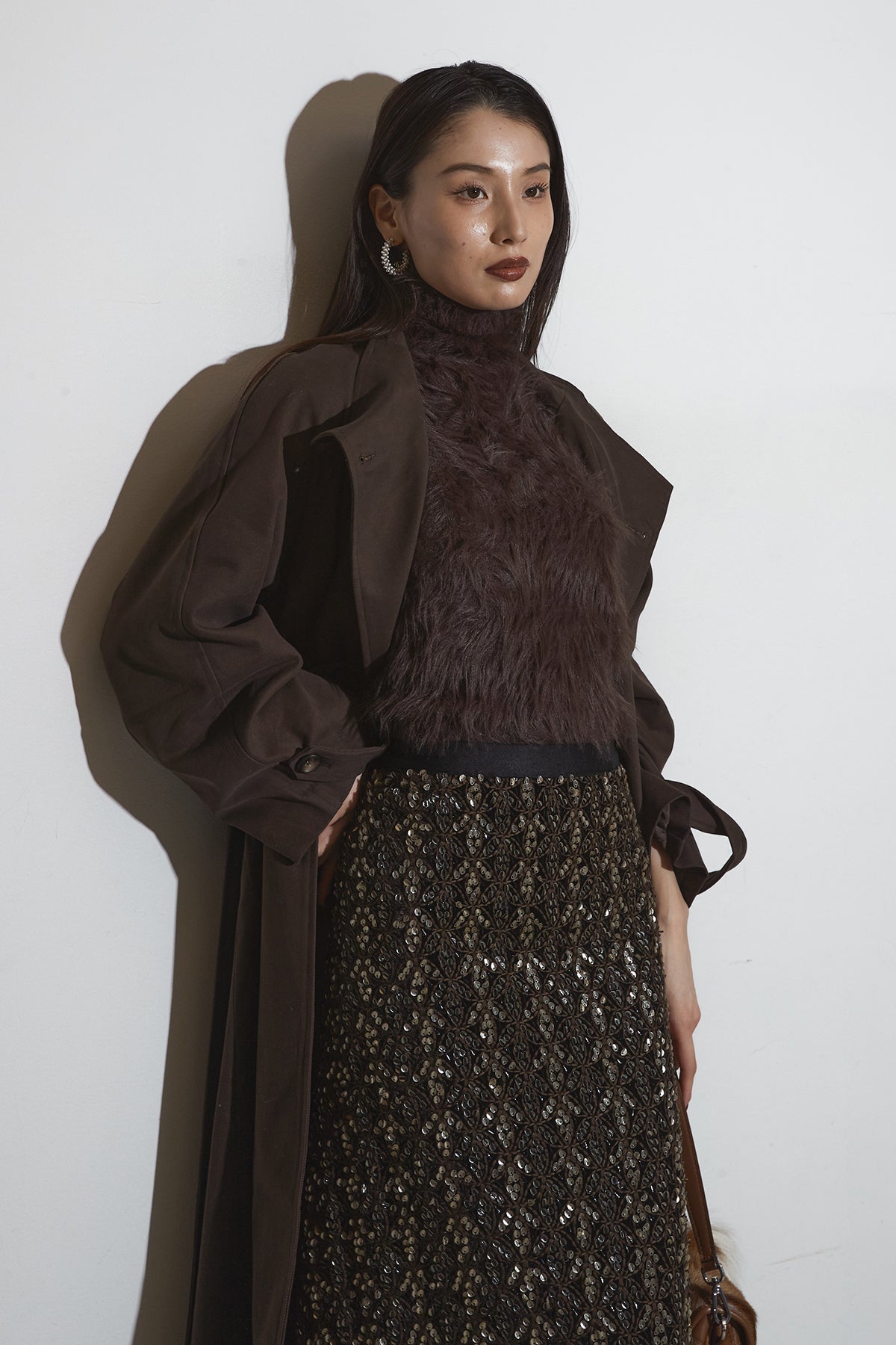 【SET】ベルテッドロングコート+ショートスリーブシャギーニット+コード刺繍スパンコールスカート