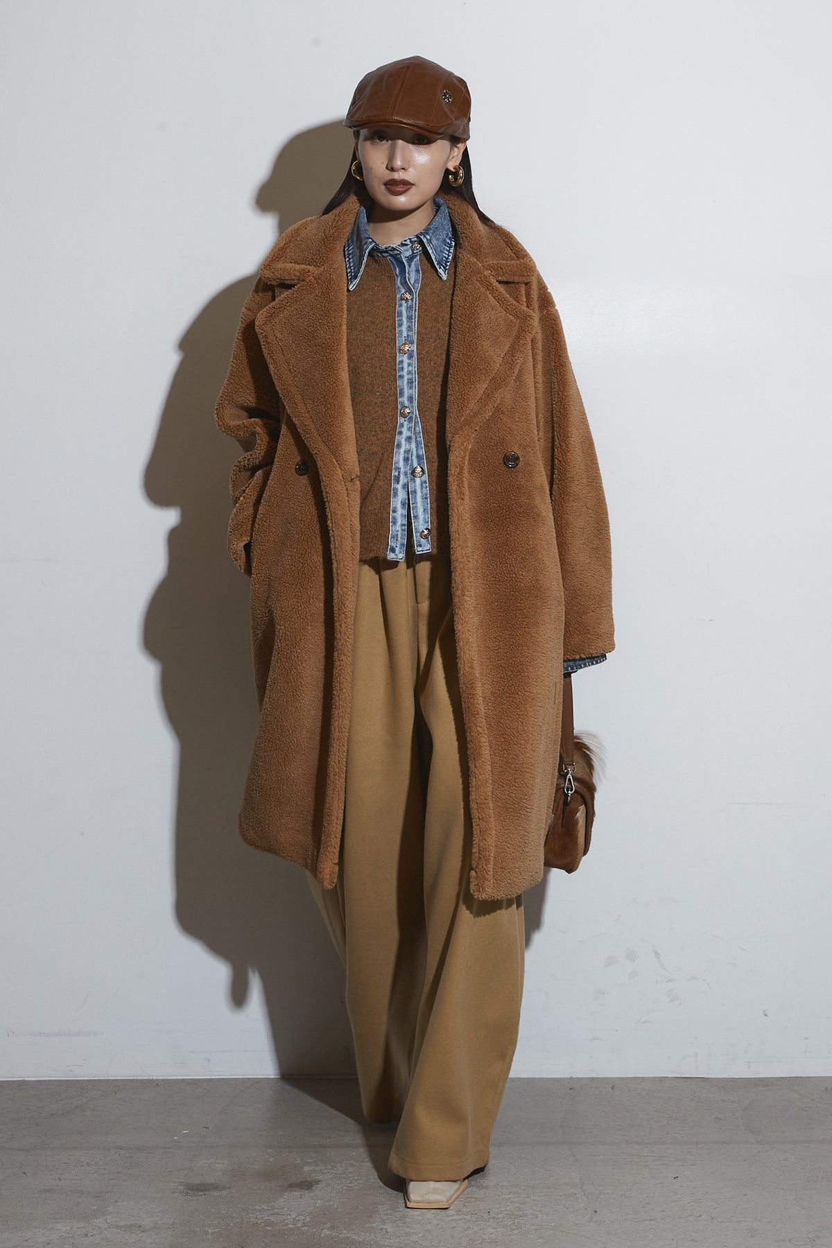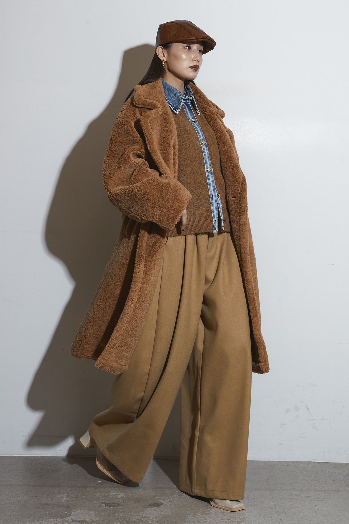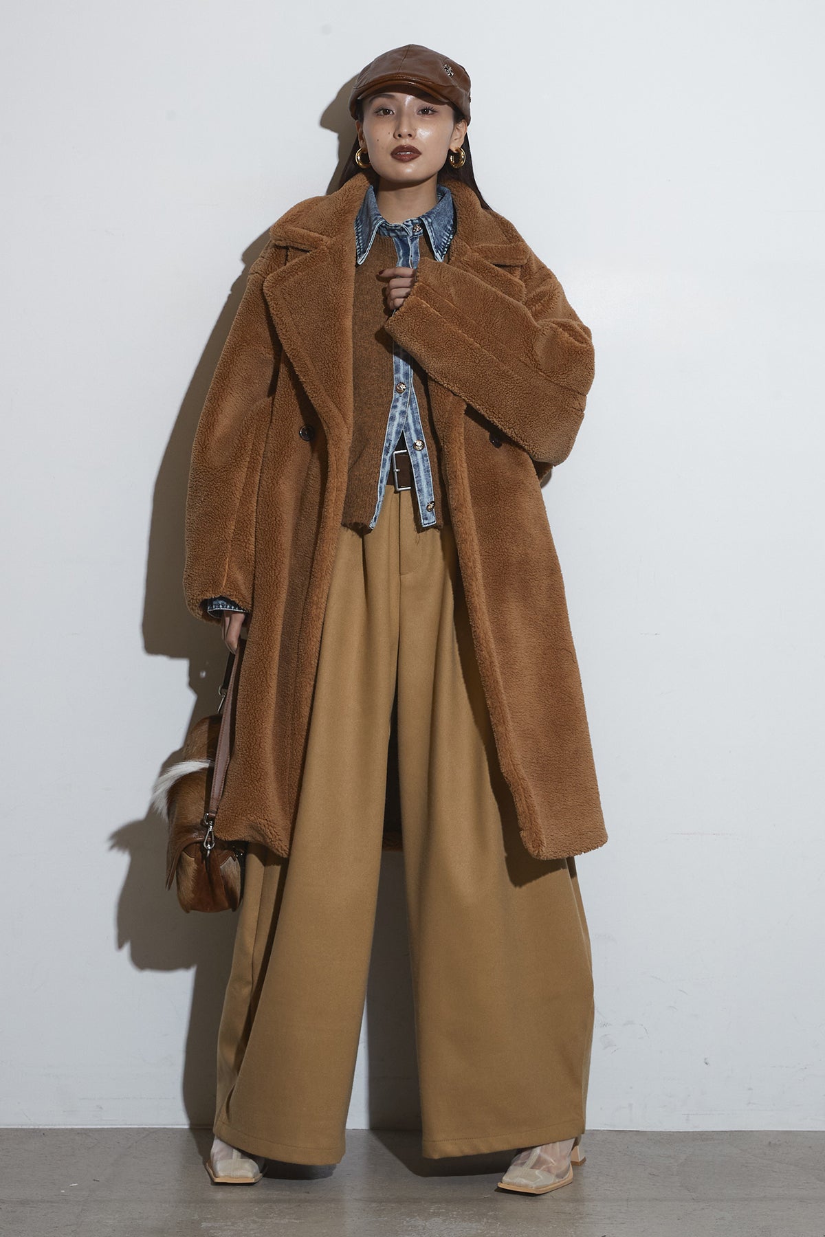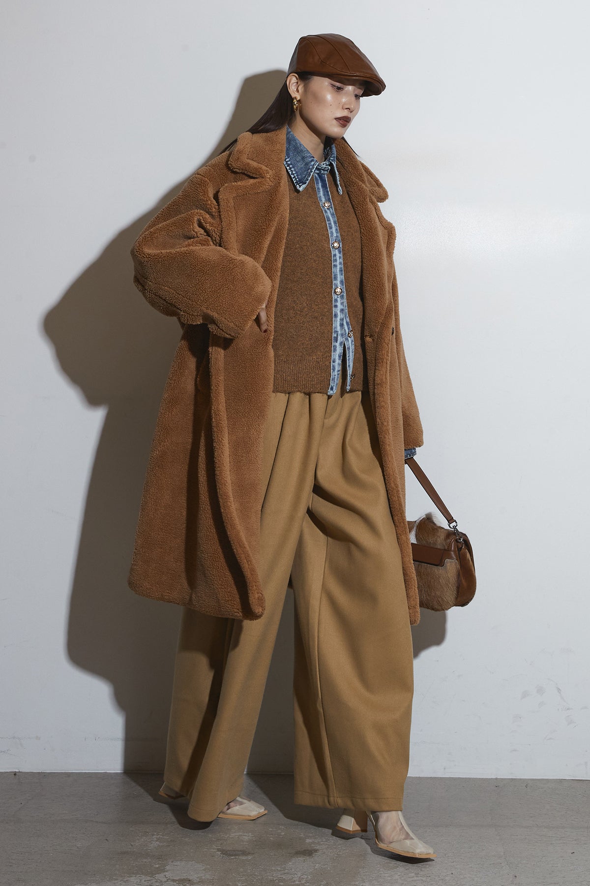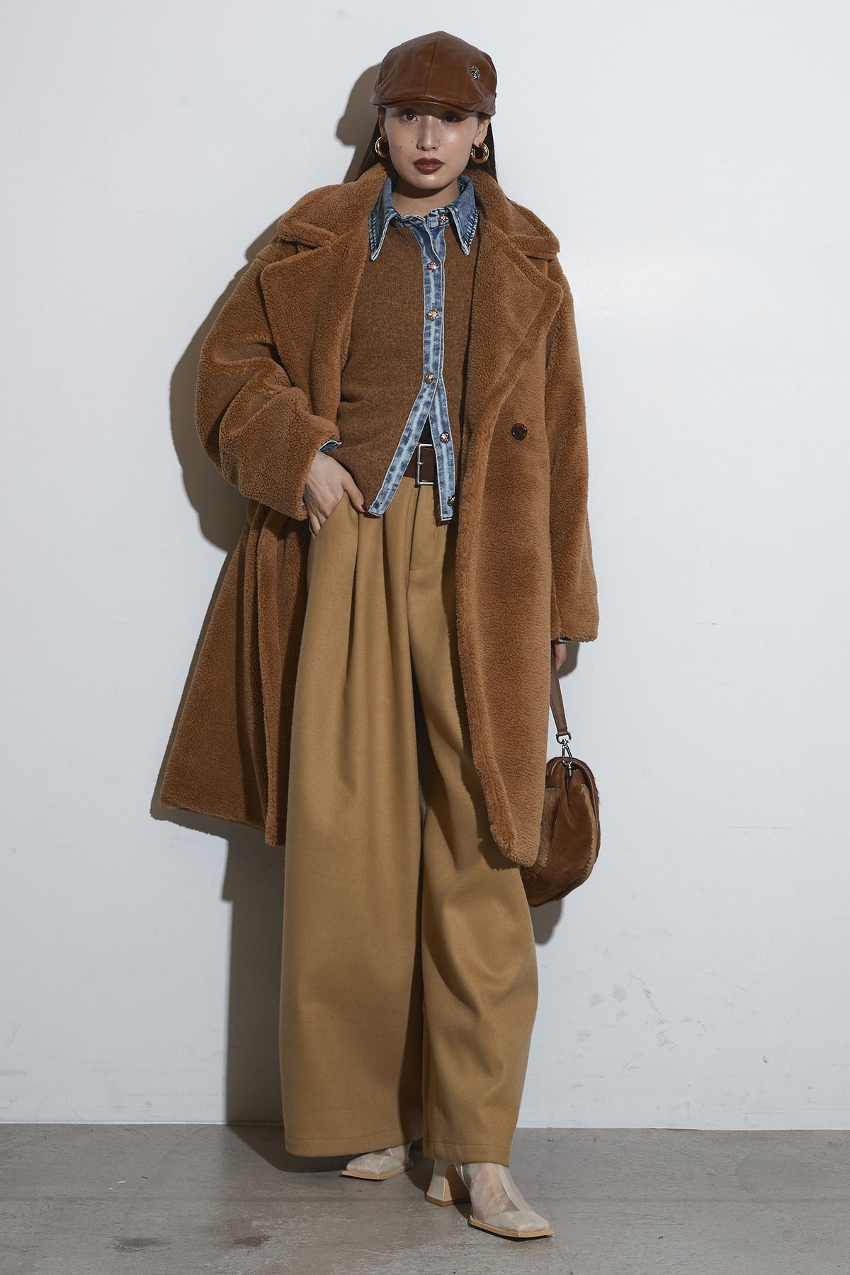 【SET】ボアロングコート+デニムレイヤードニットカーディガン+ワイドレッグトラウザー