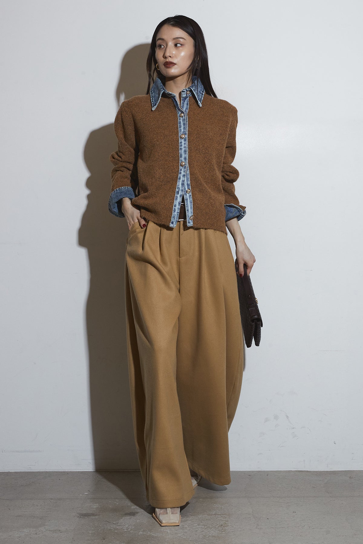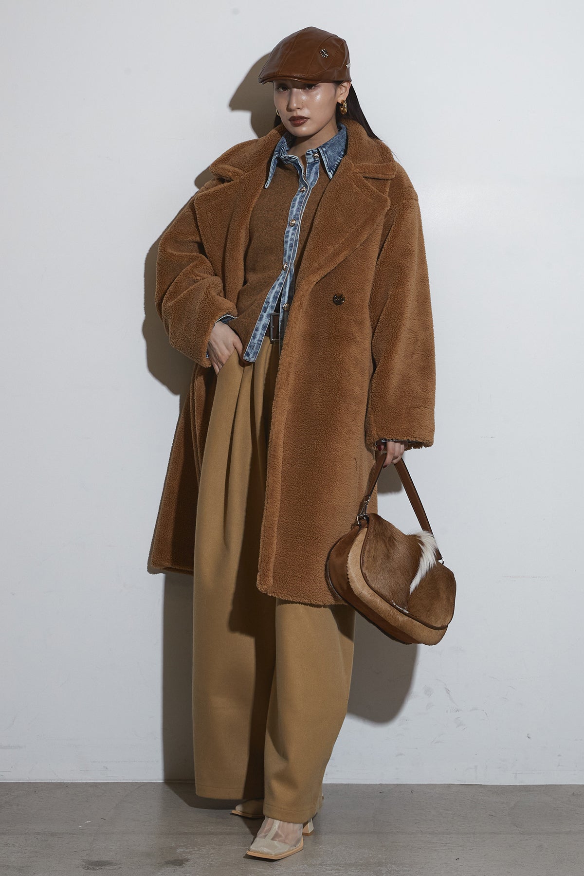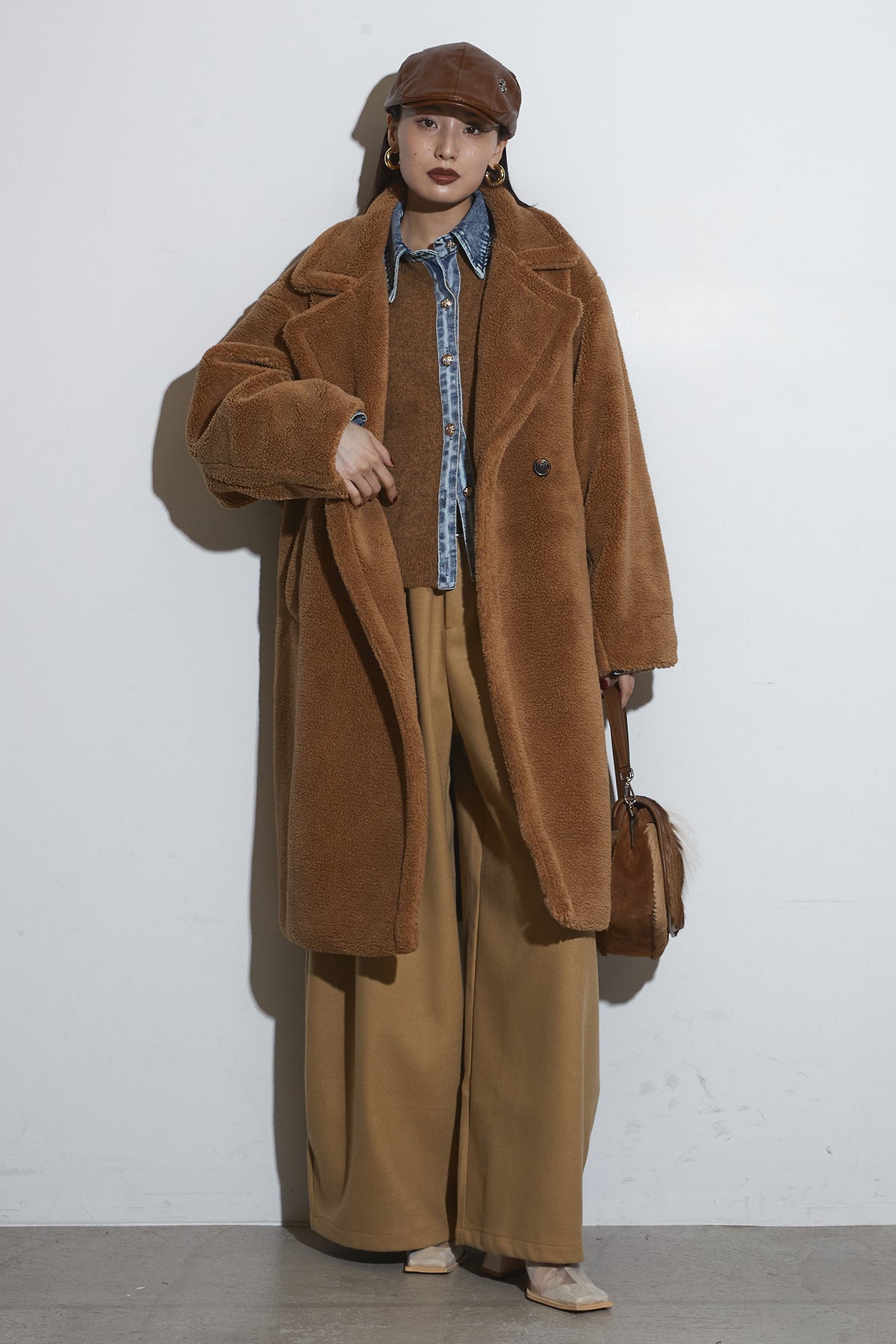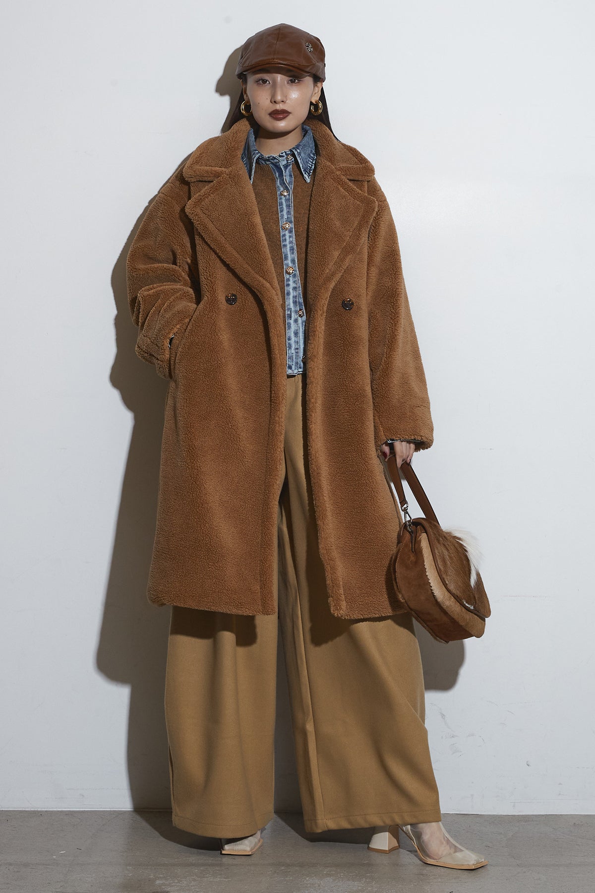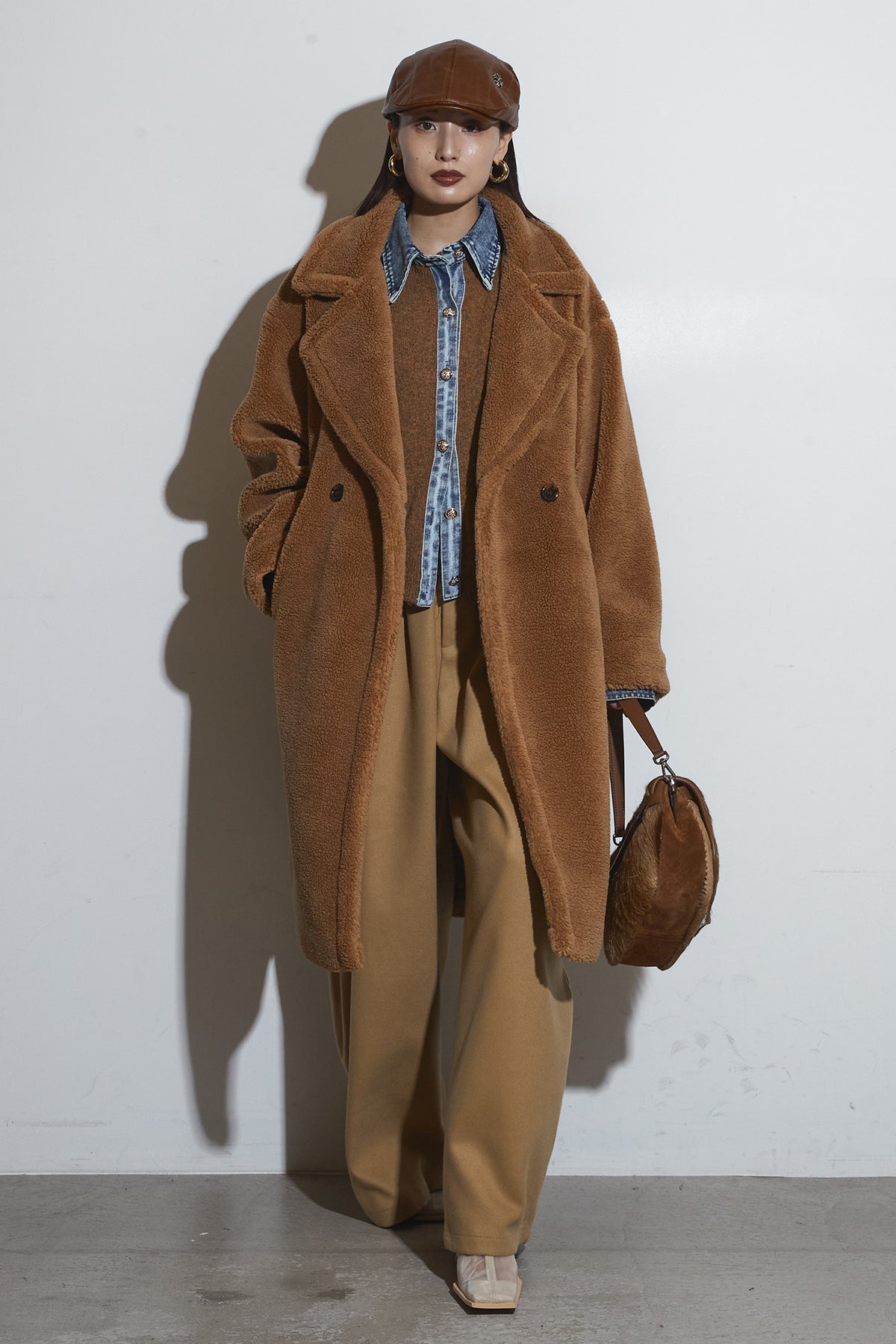 【SET】ボアロングコート+デニムレイヤードニットカーディガン+ワイドレッグトラウザー