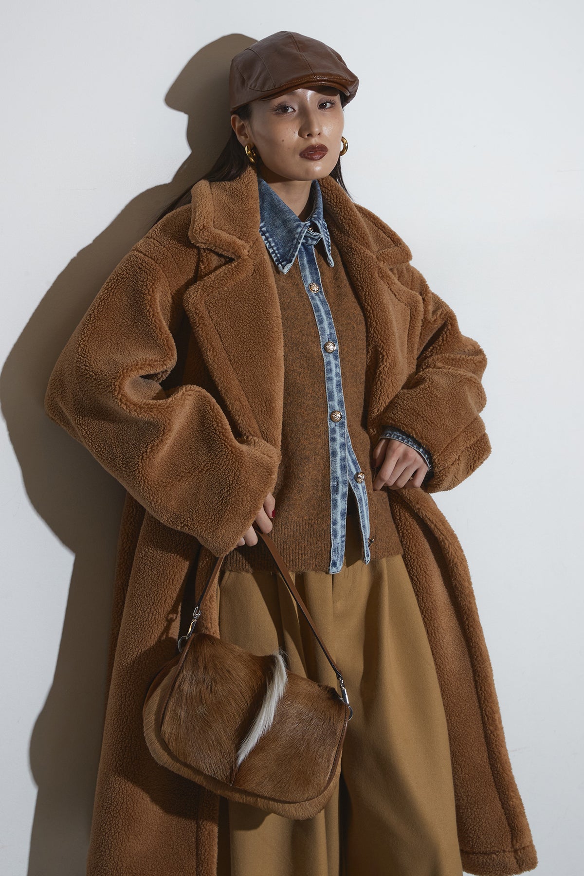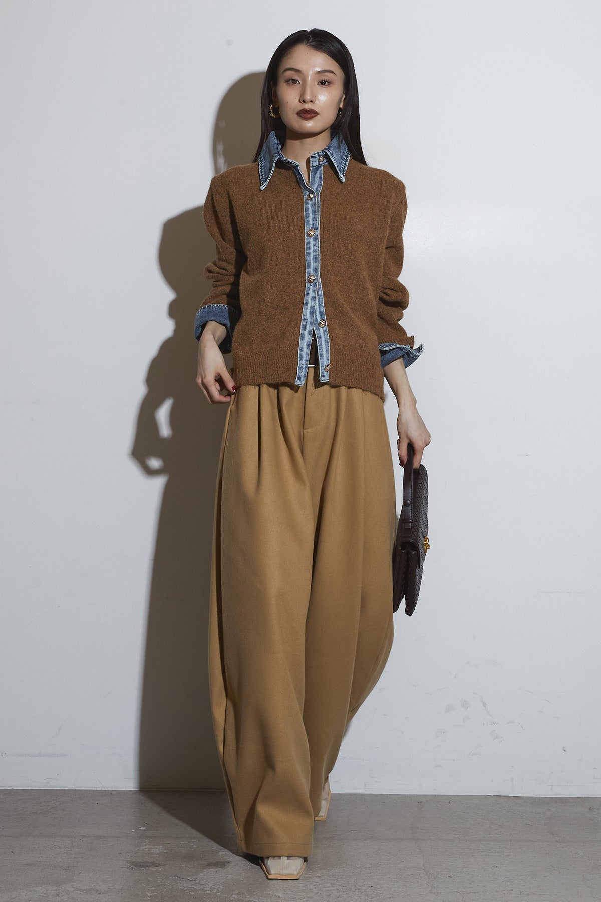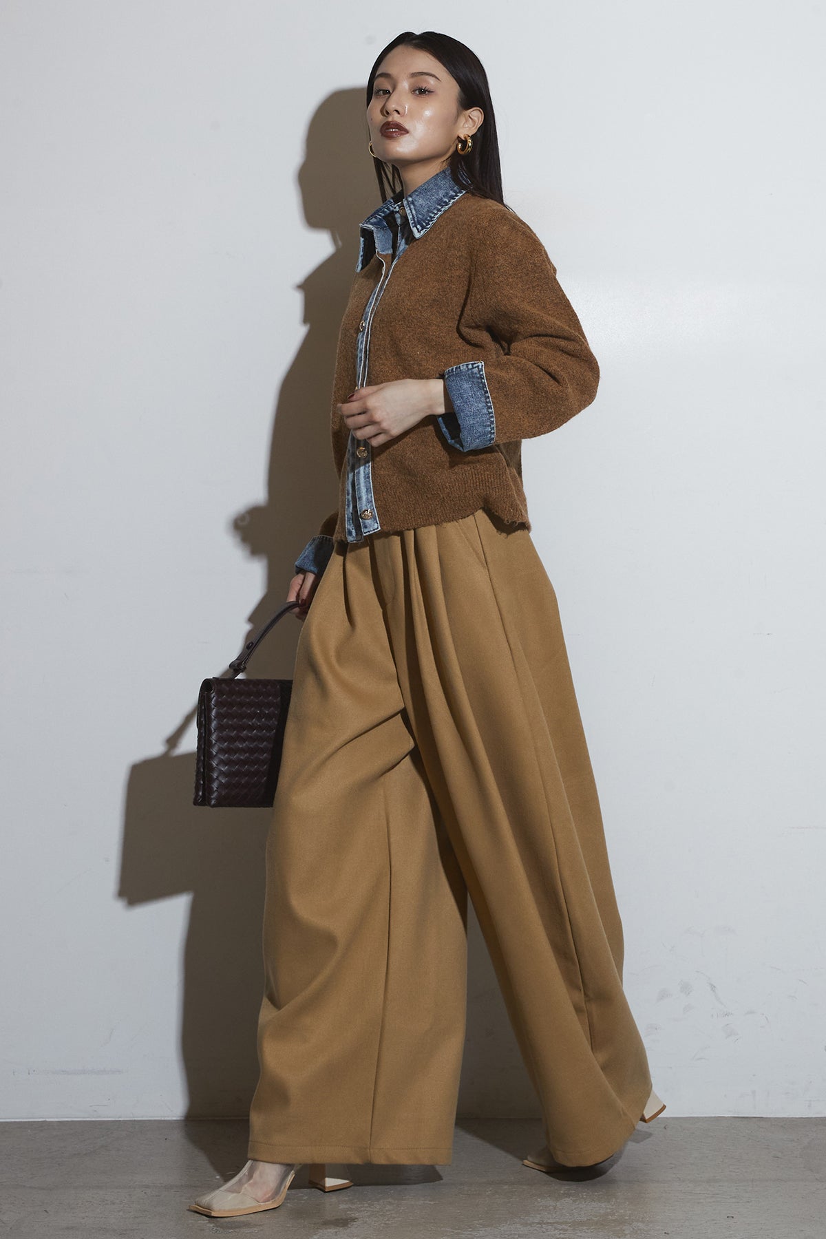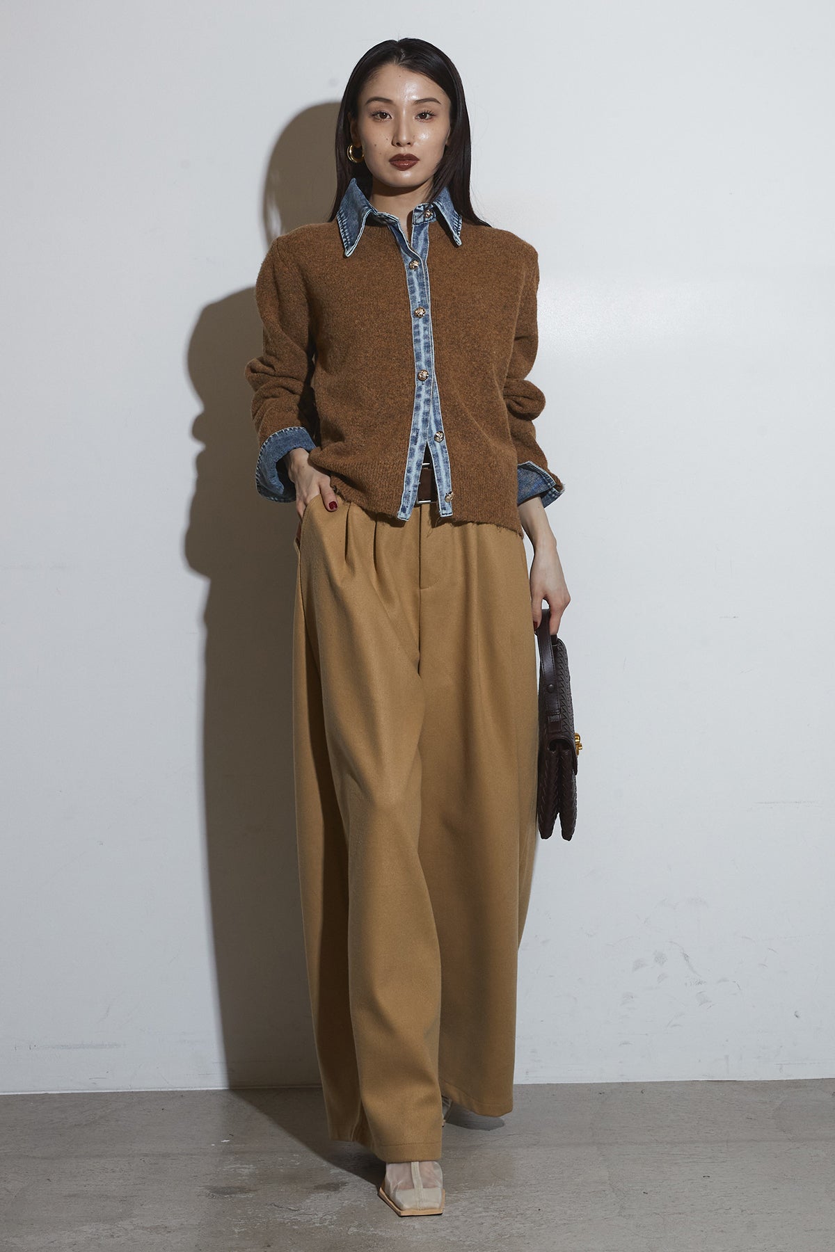 【SET】ボアロングコート+デニムレイヤードニットカーディガン+ワイドレッグトラウザー