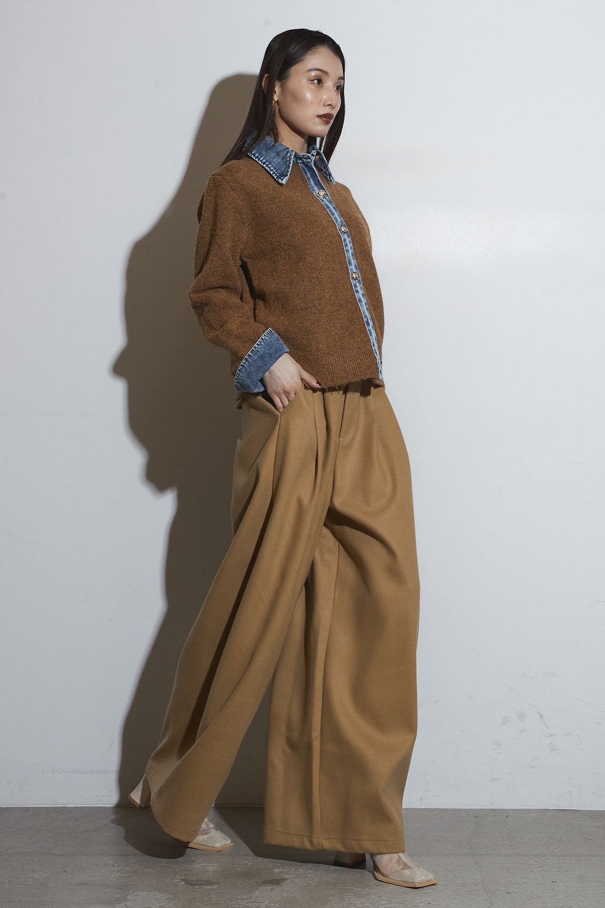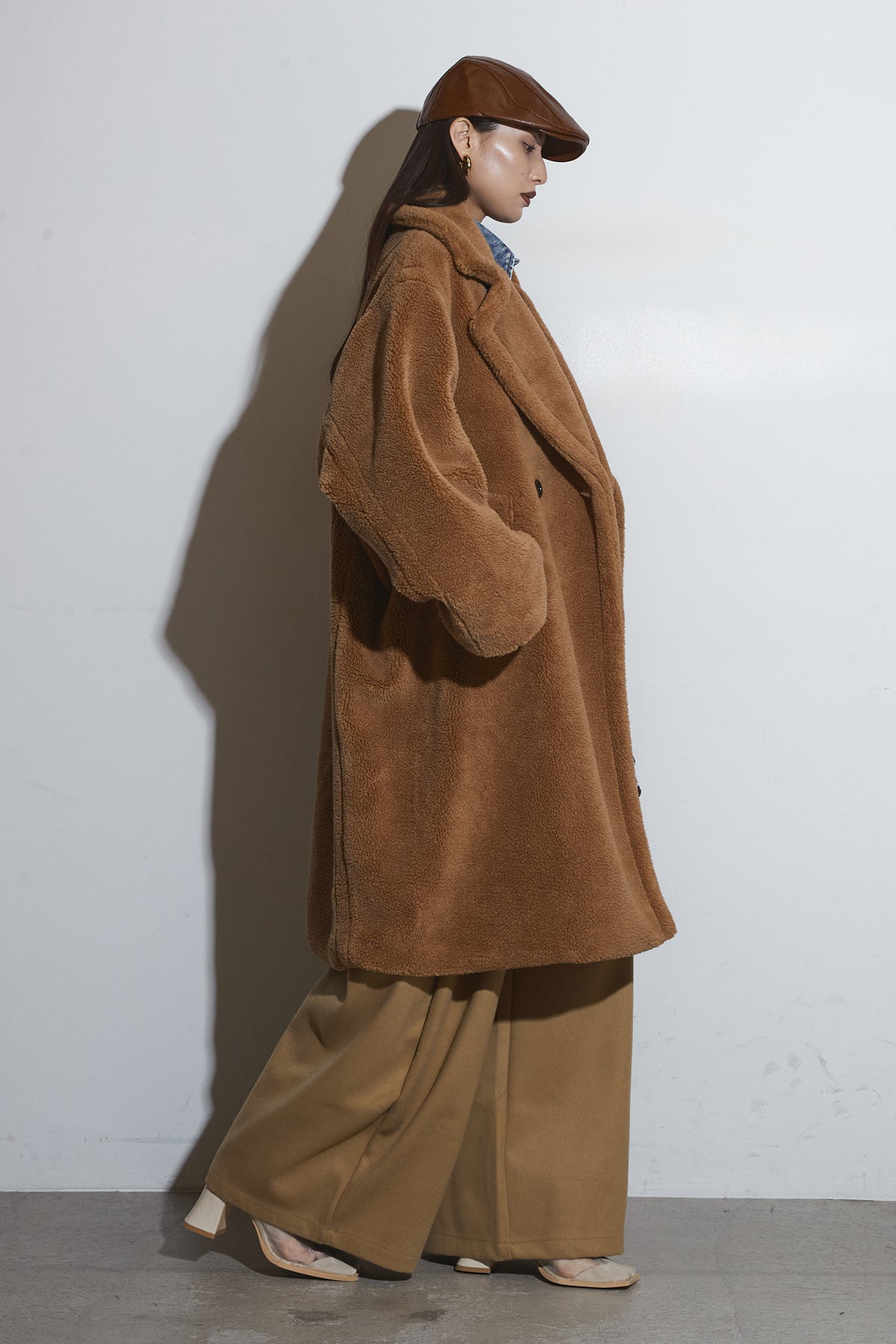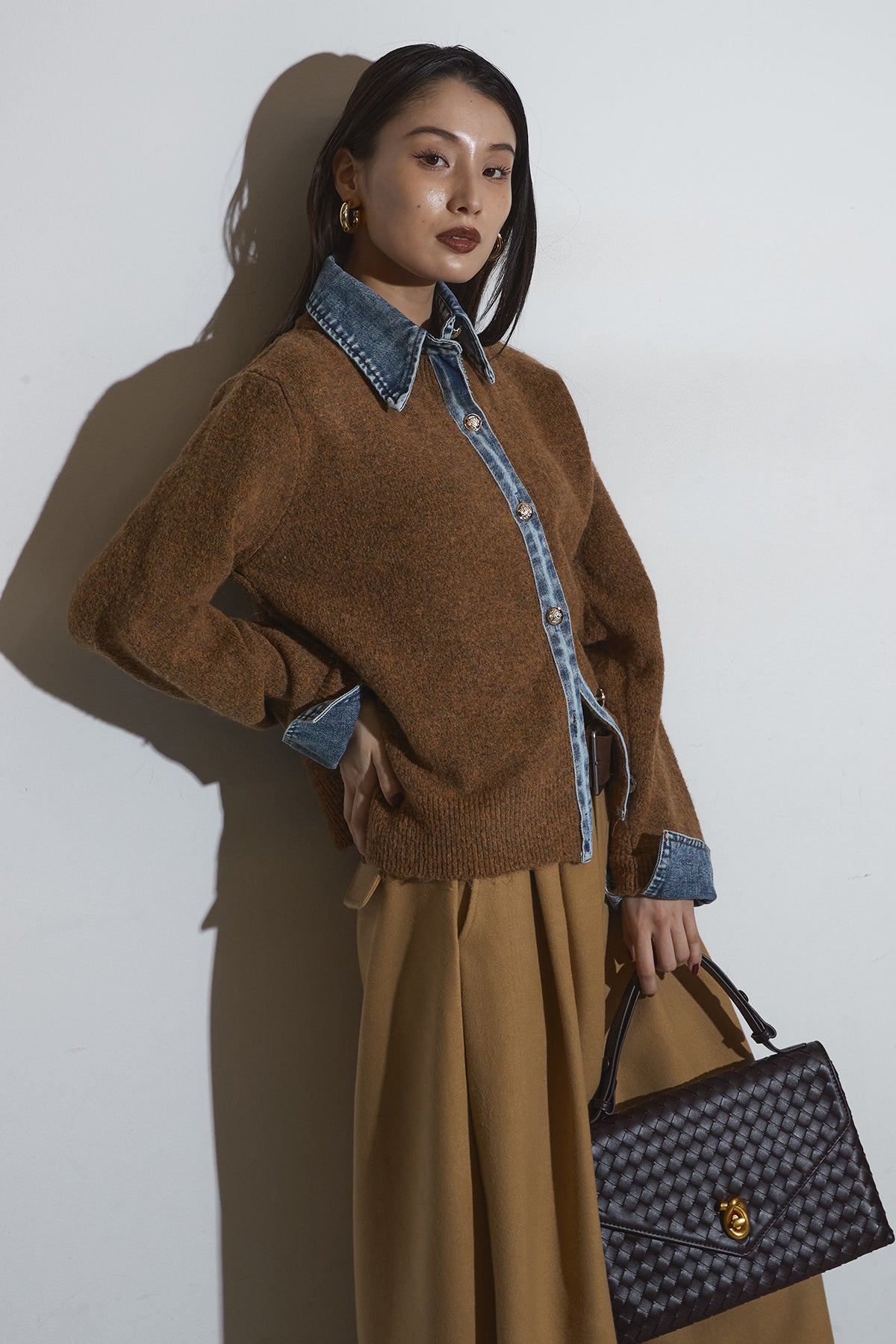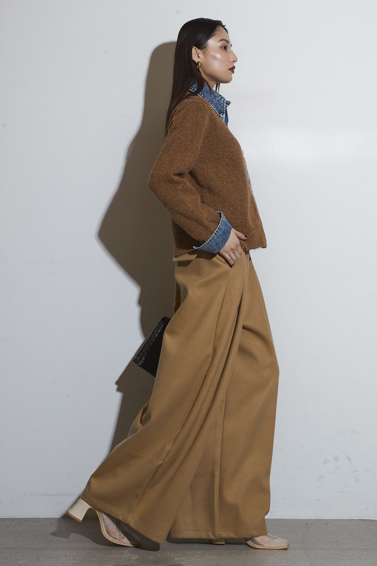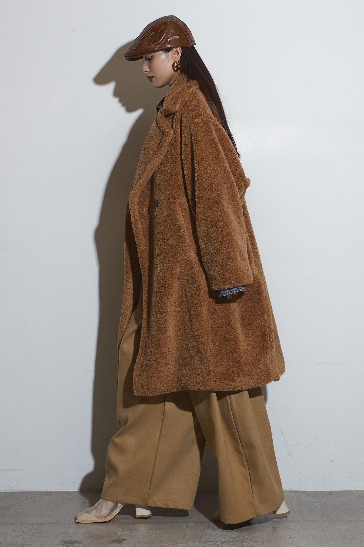 【SET】ボアロングコート+デニムレイヤードニットカーディガン+ワイドレッグトラウザー