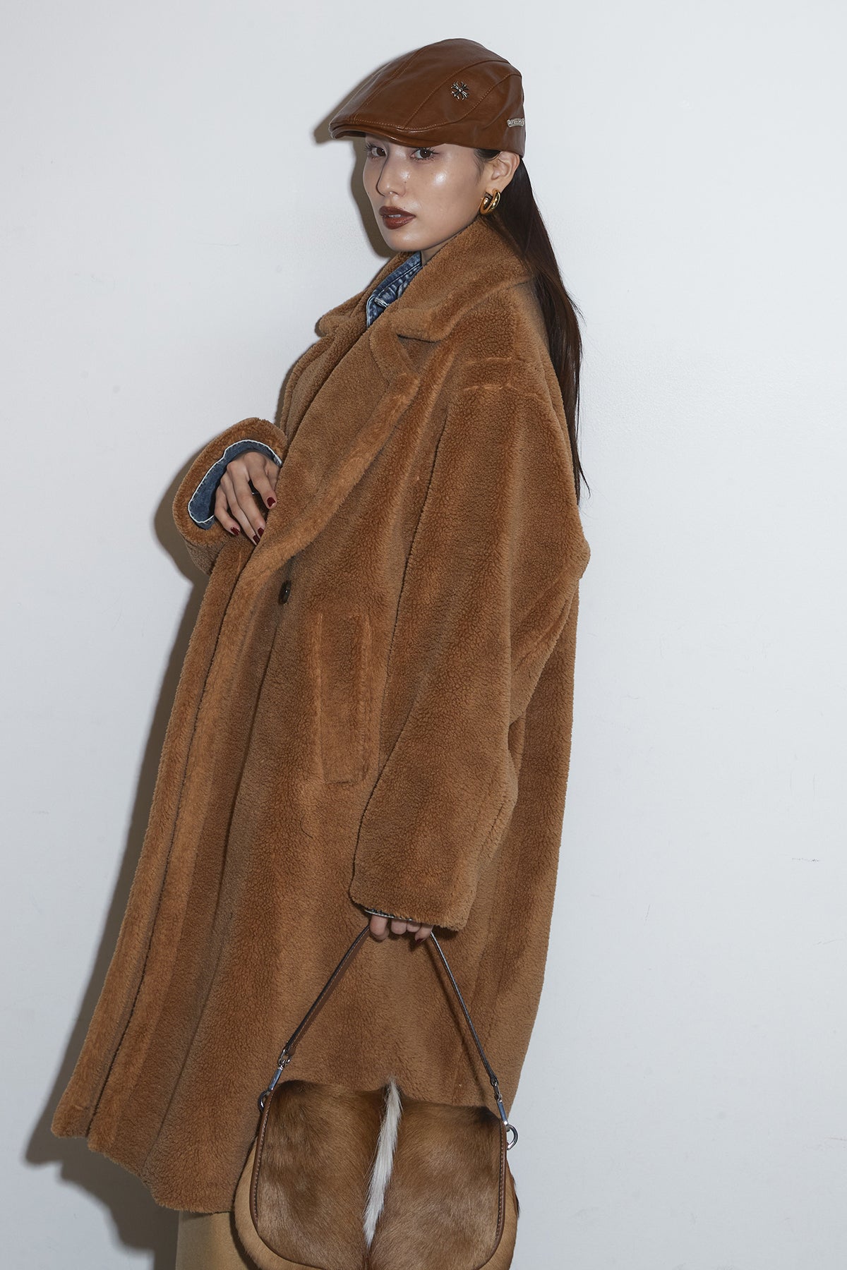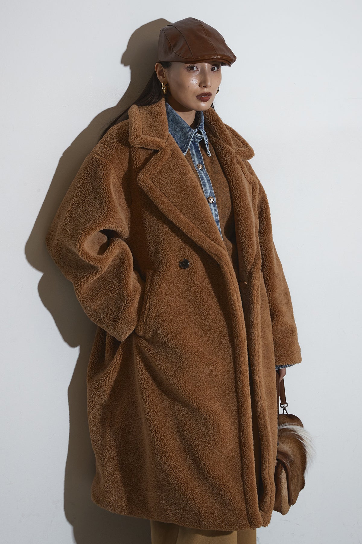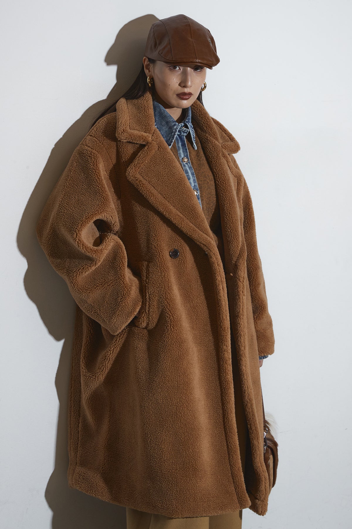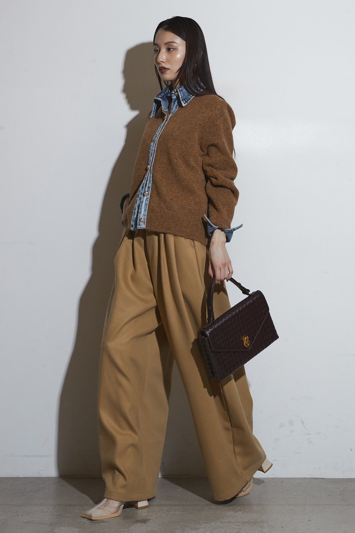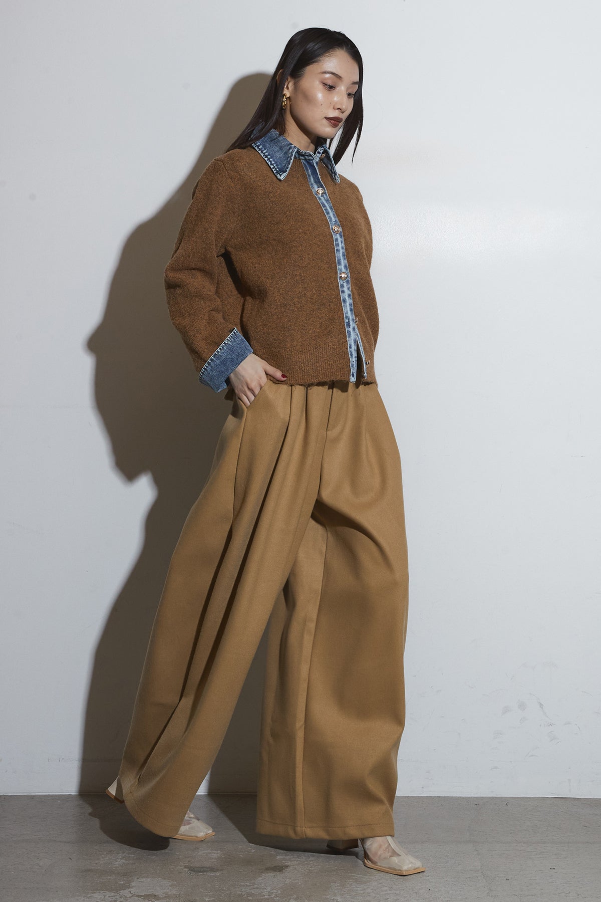 【SET】ボアロングコート+デニムレイヤードニットカーディガン+ワイドレッグトラウザー