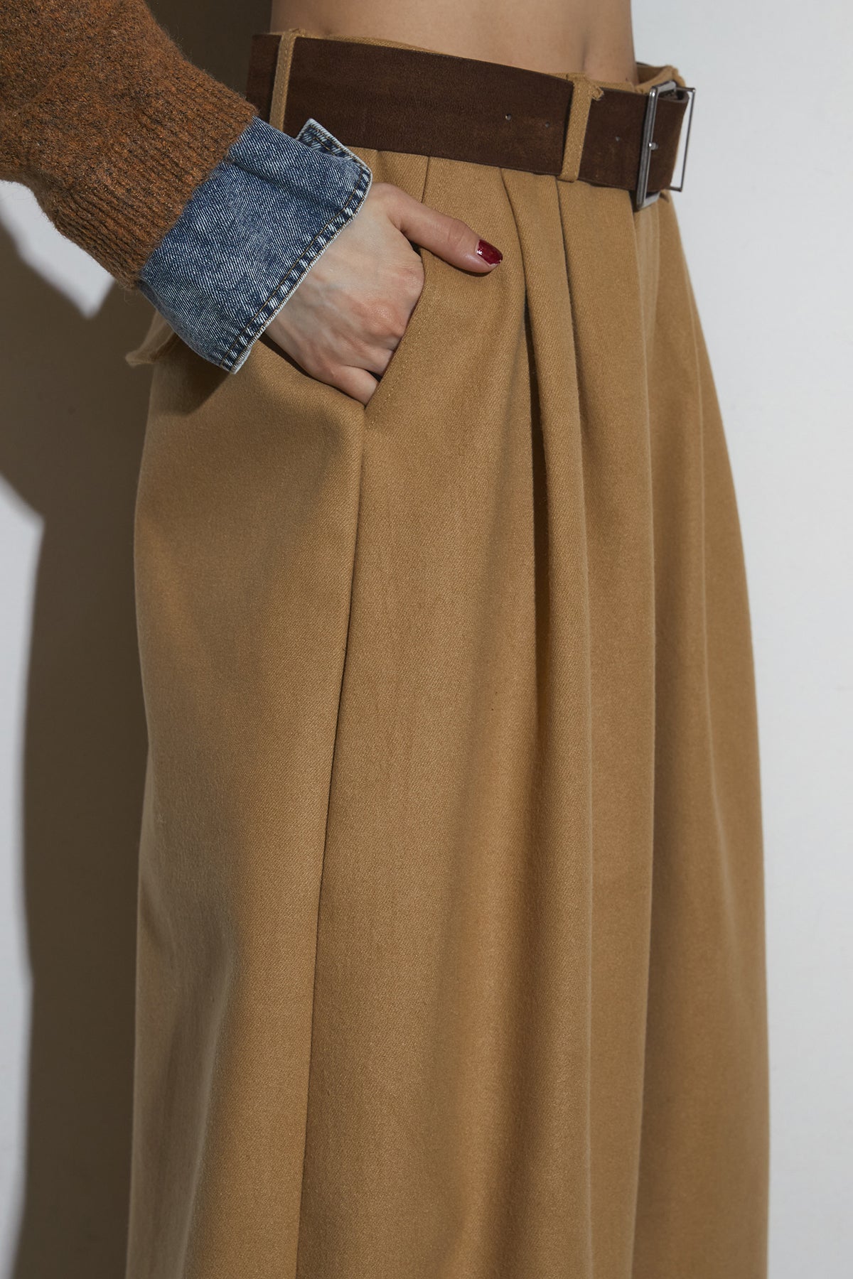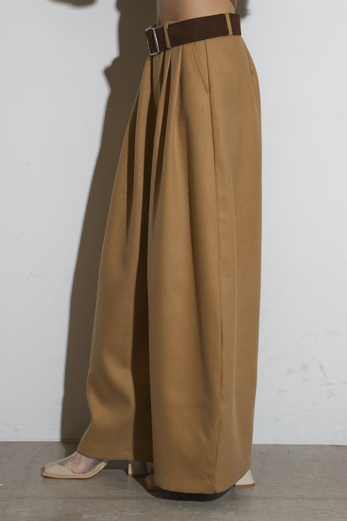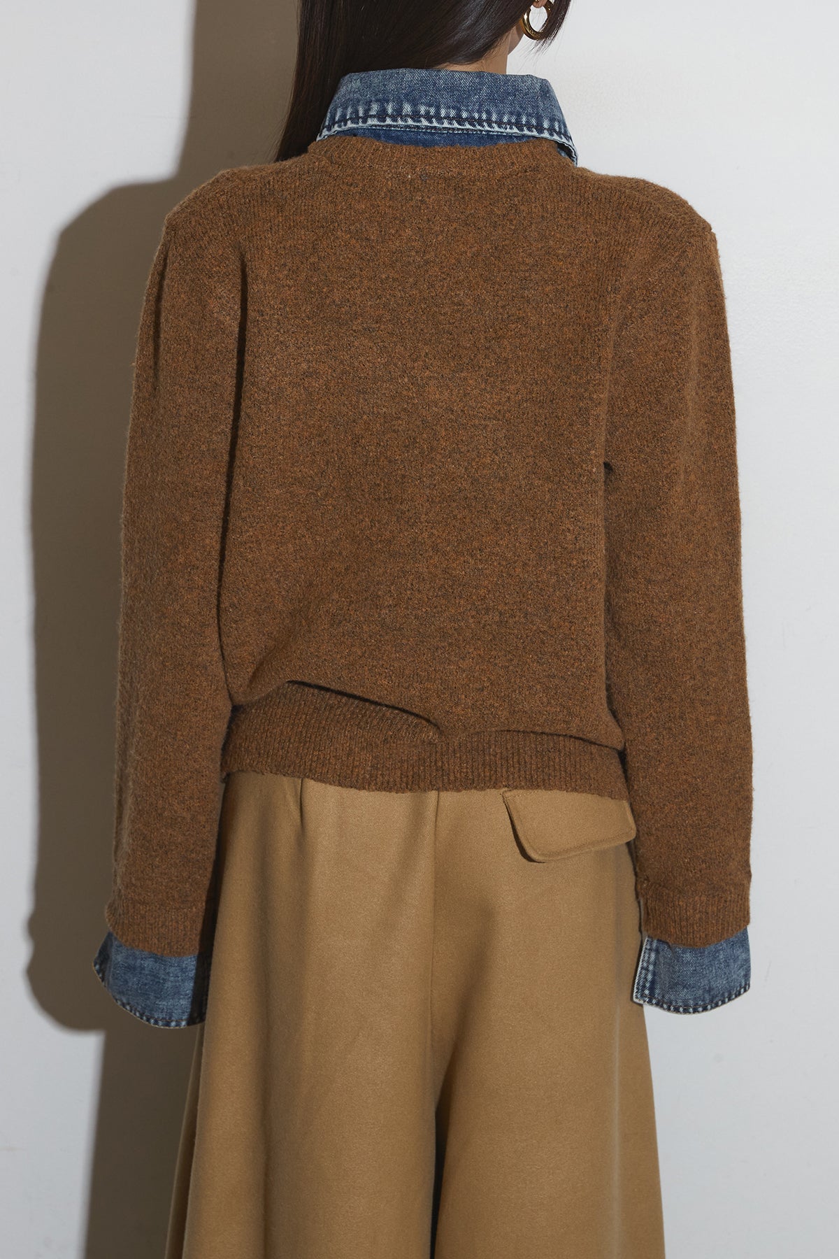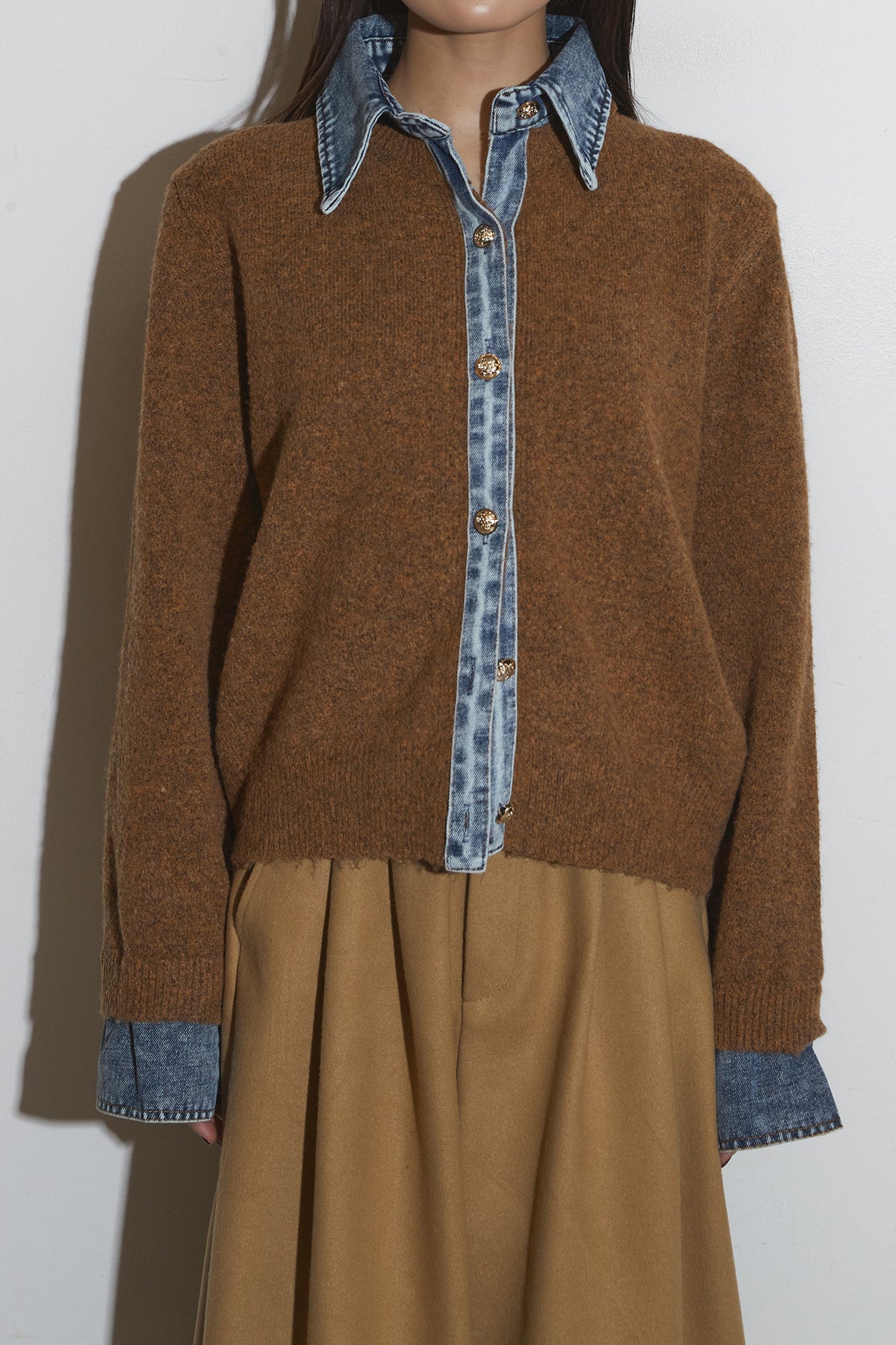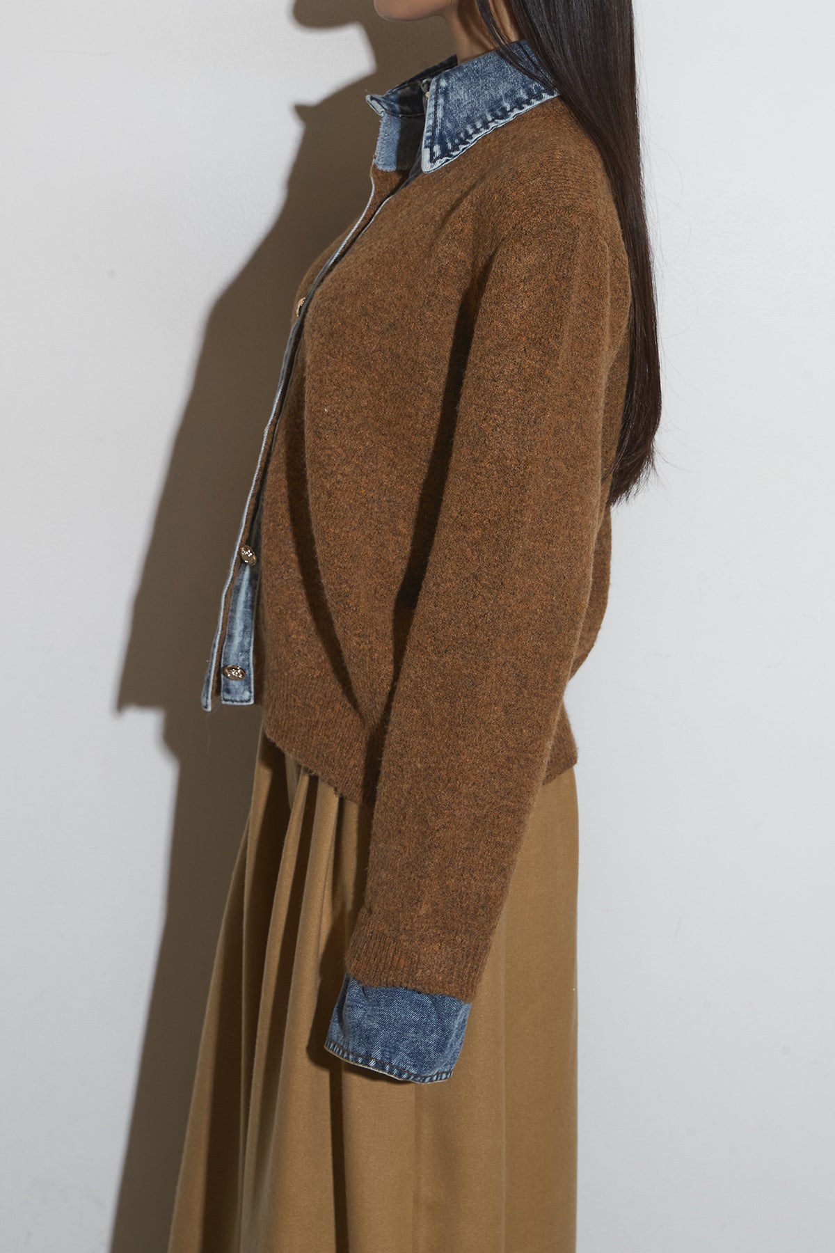 【SET】ボアロングコート+デニムレイヤードニットカーディガン+ワイドレッグトラウザー