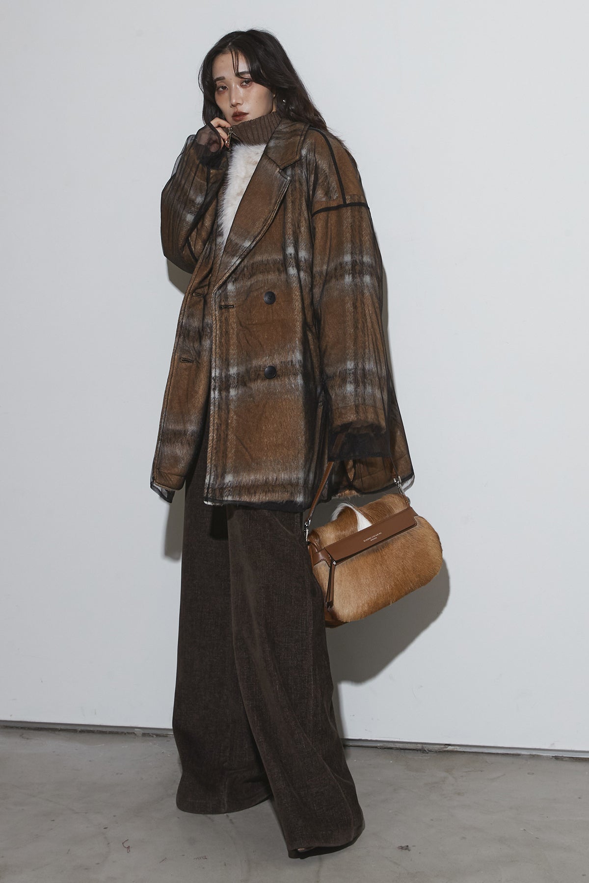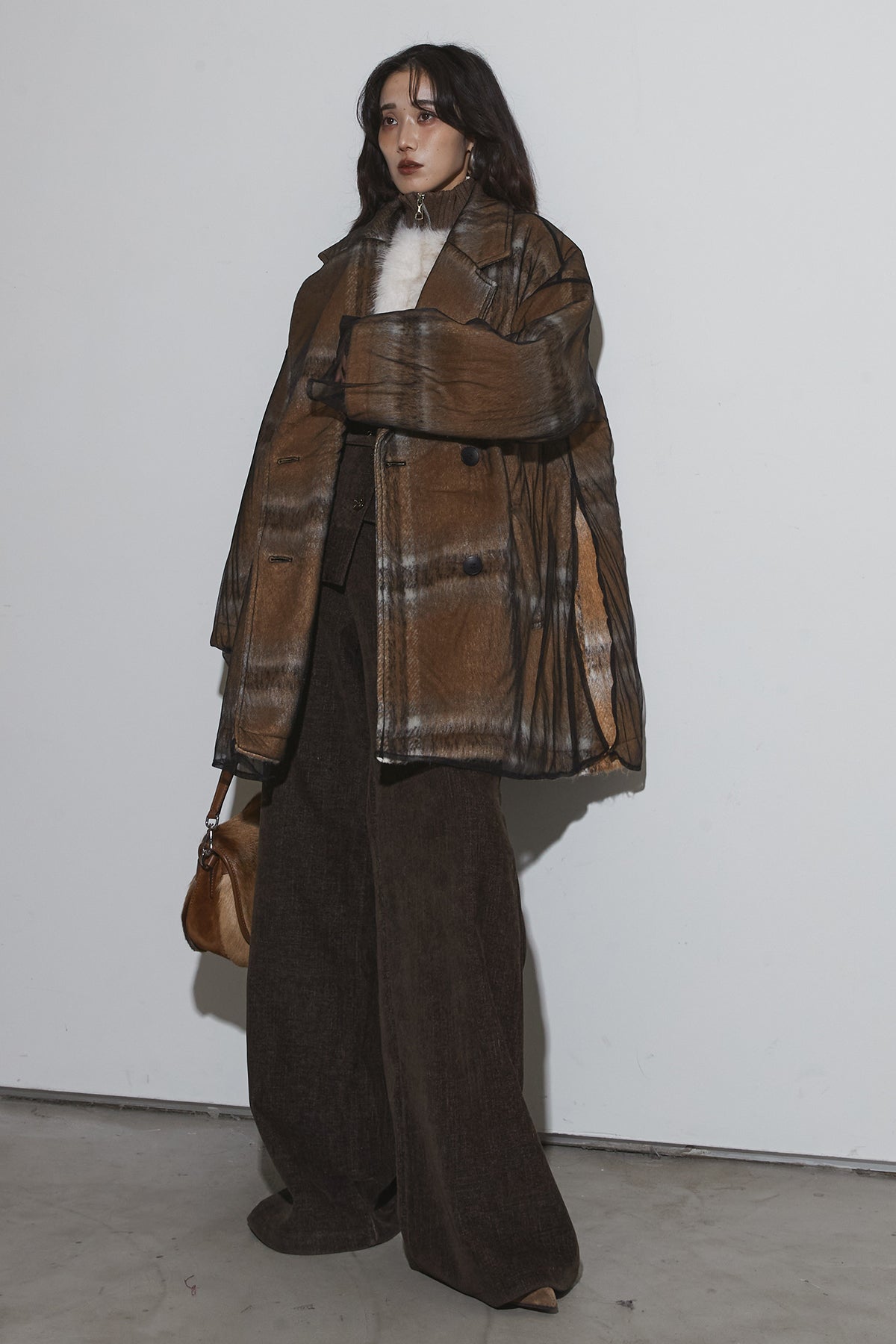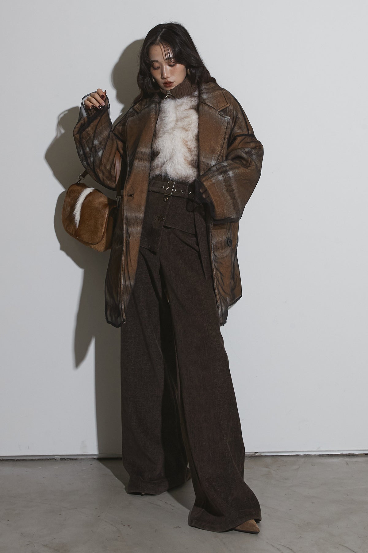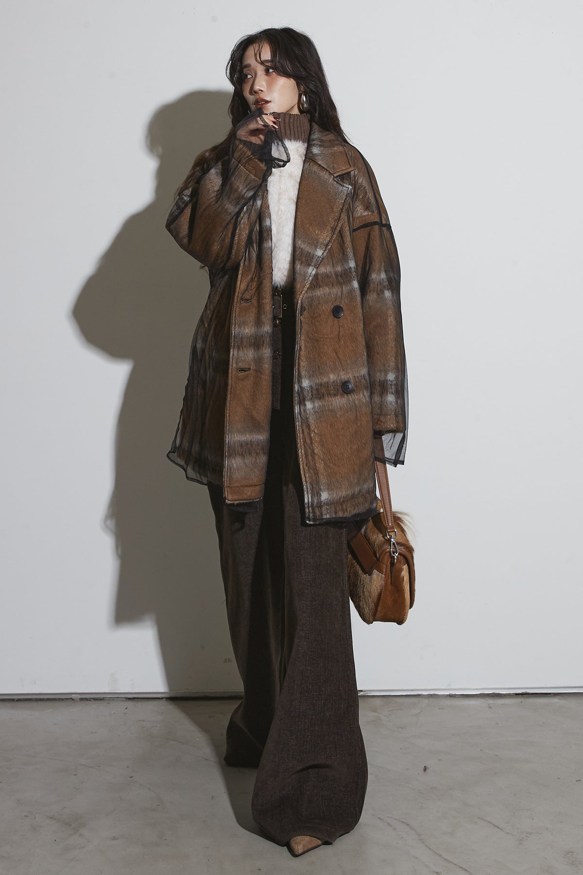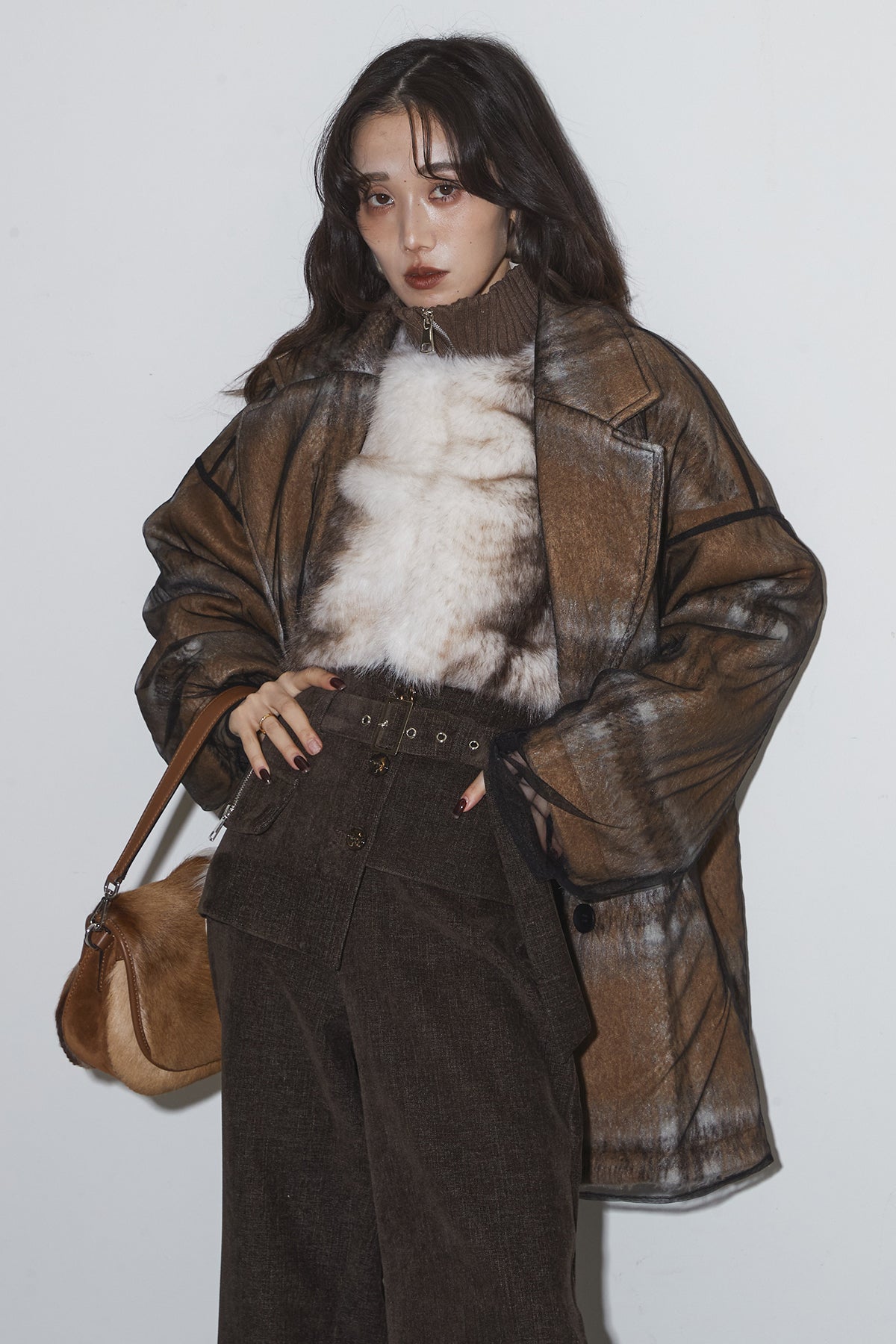 【SET】チュールレイヤードチェックジャケット+ファードッキングZIPニット+レイヤーベルトデザインデニム