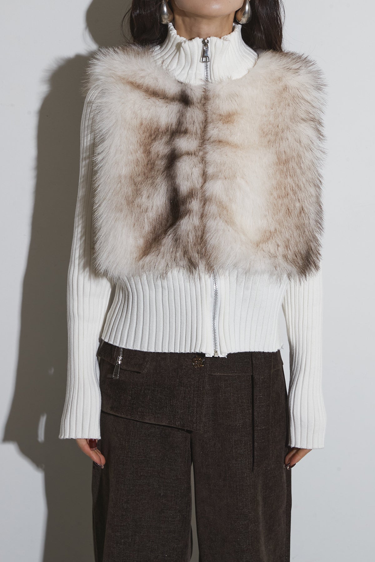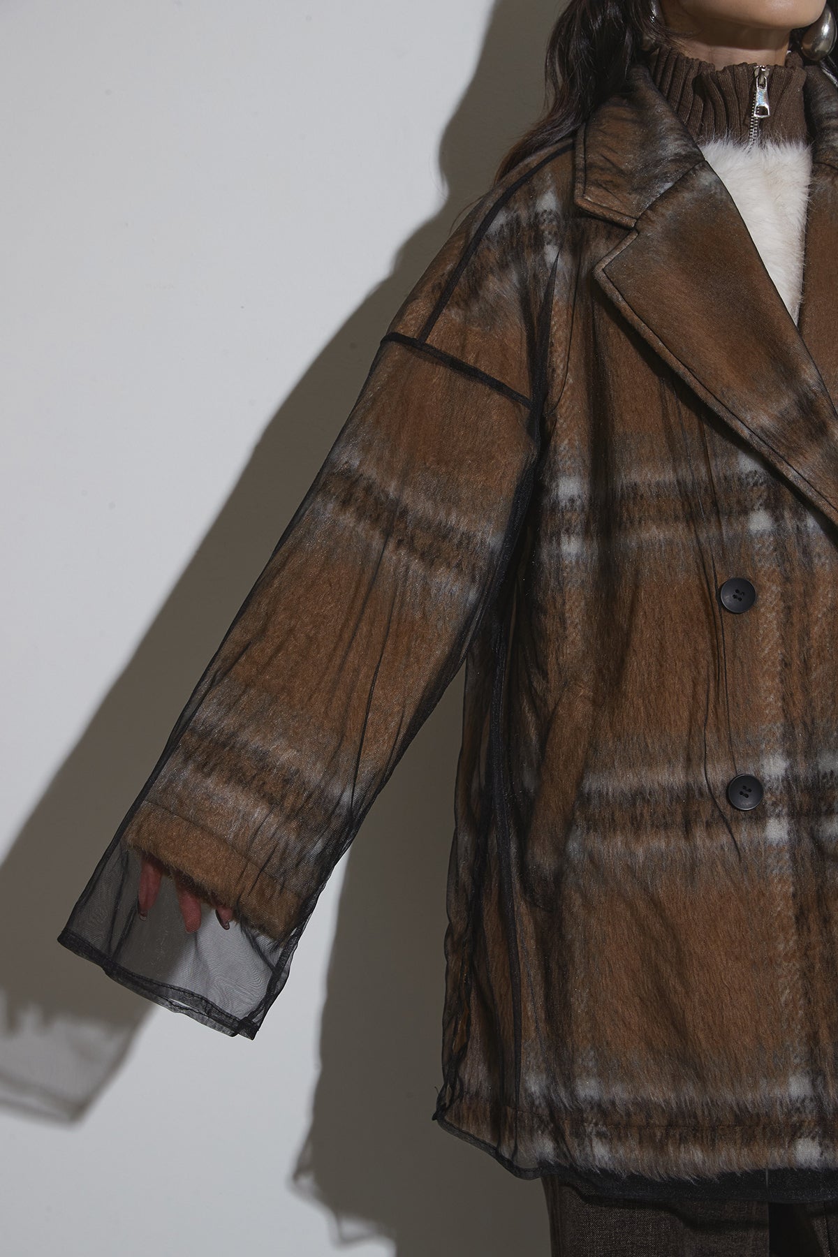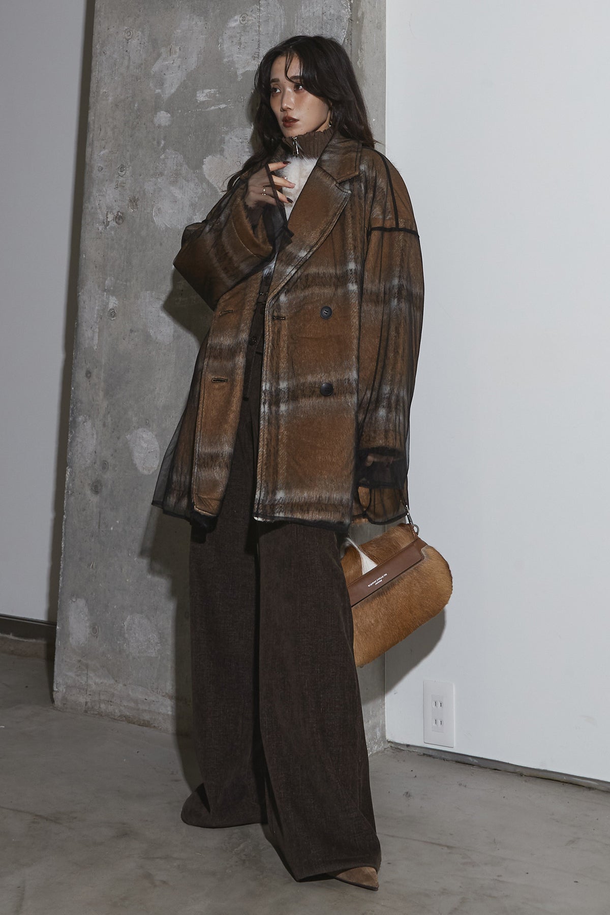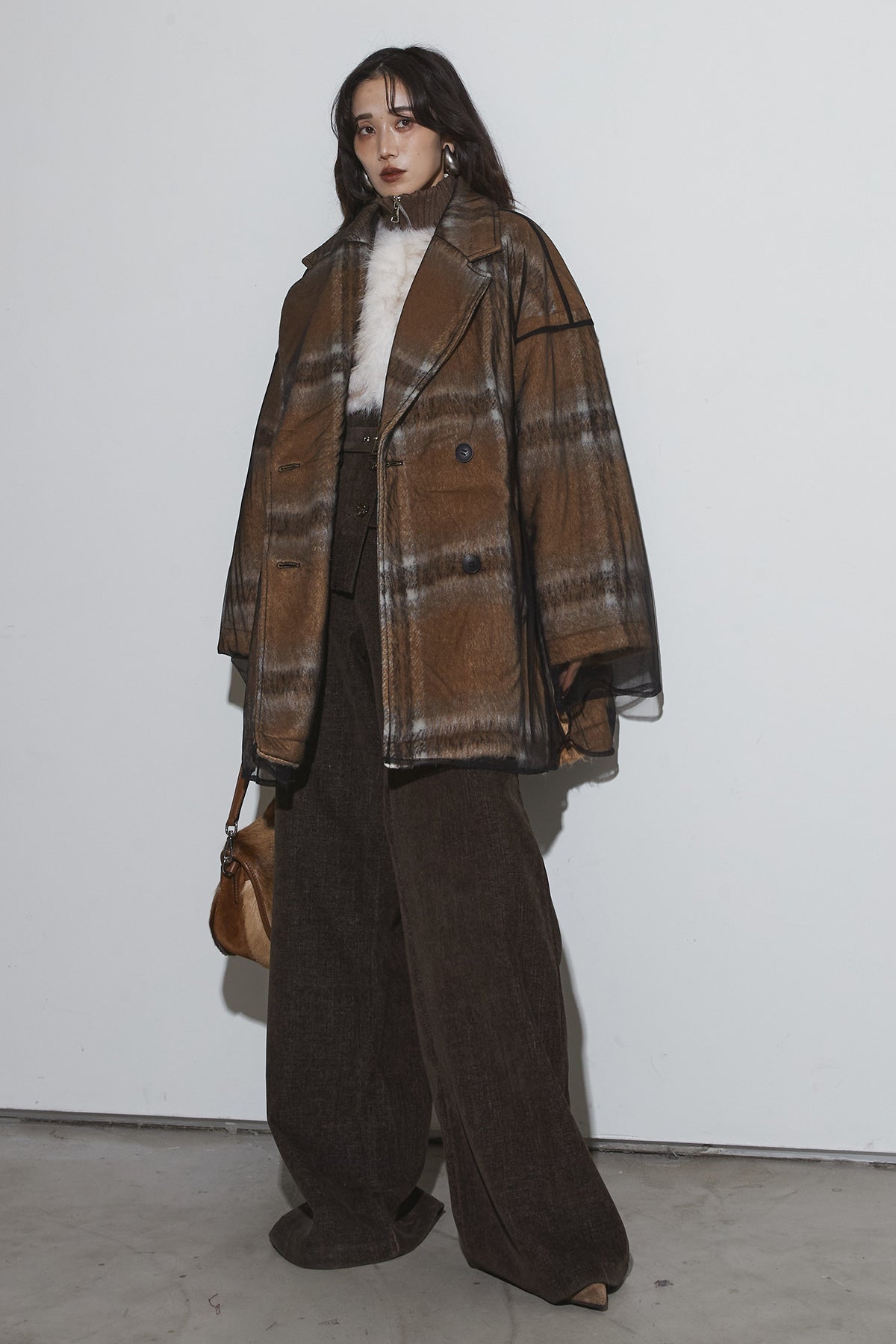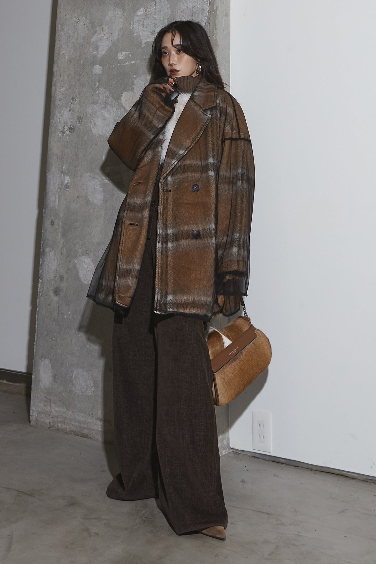 【SET】チュールレイヤードチェックジャケット+ファードッキングZIPニット+レイヤーベルトデザインデニム