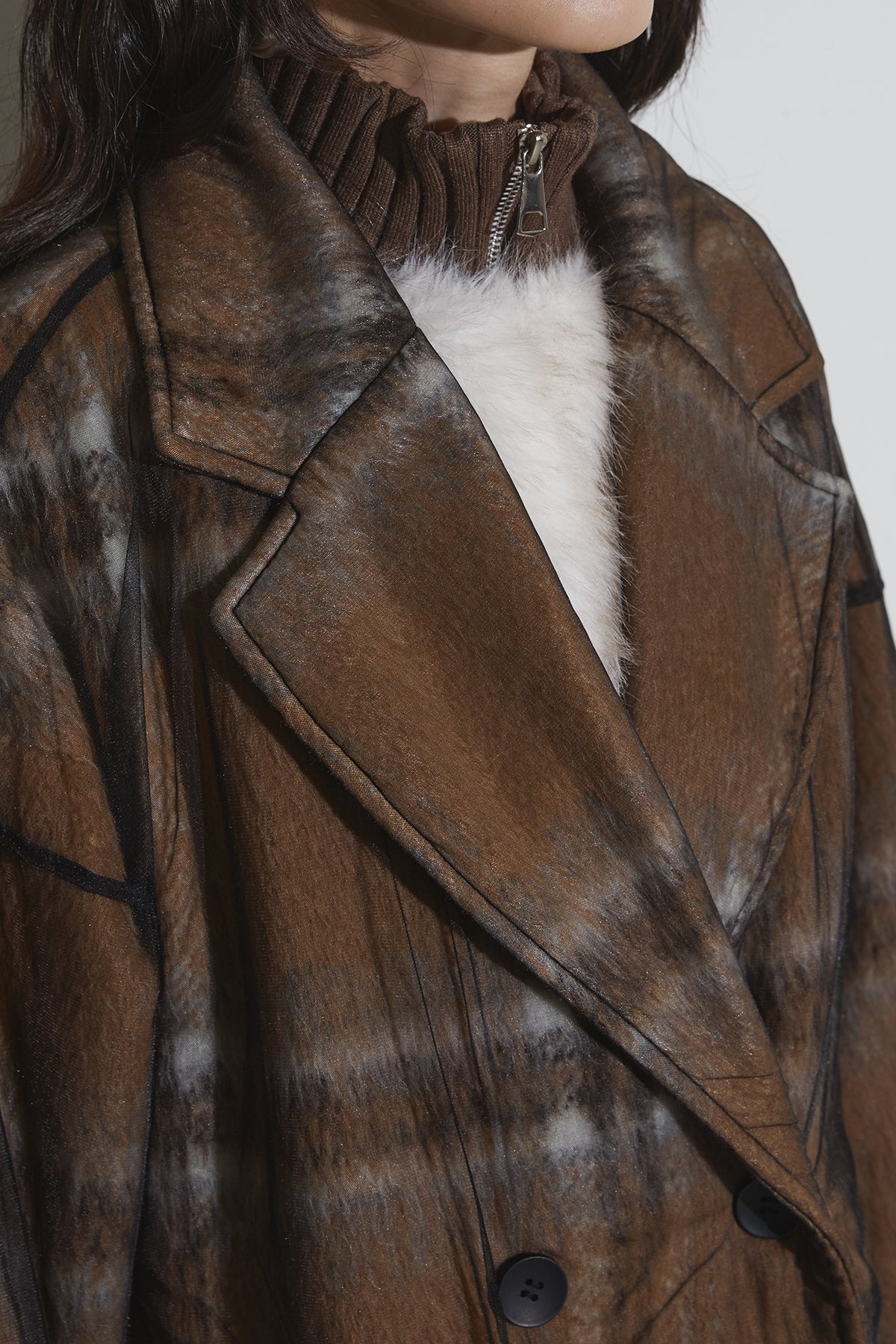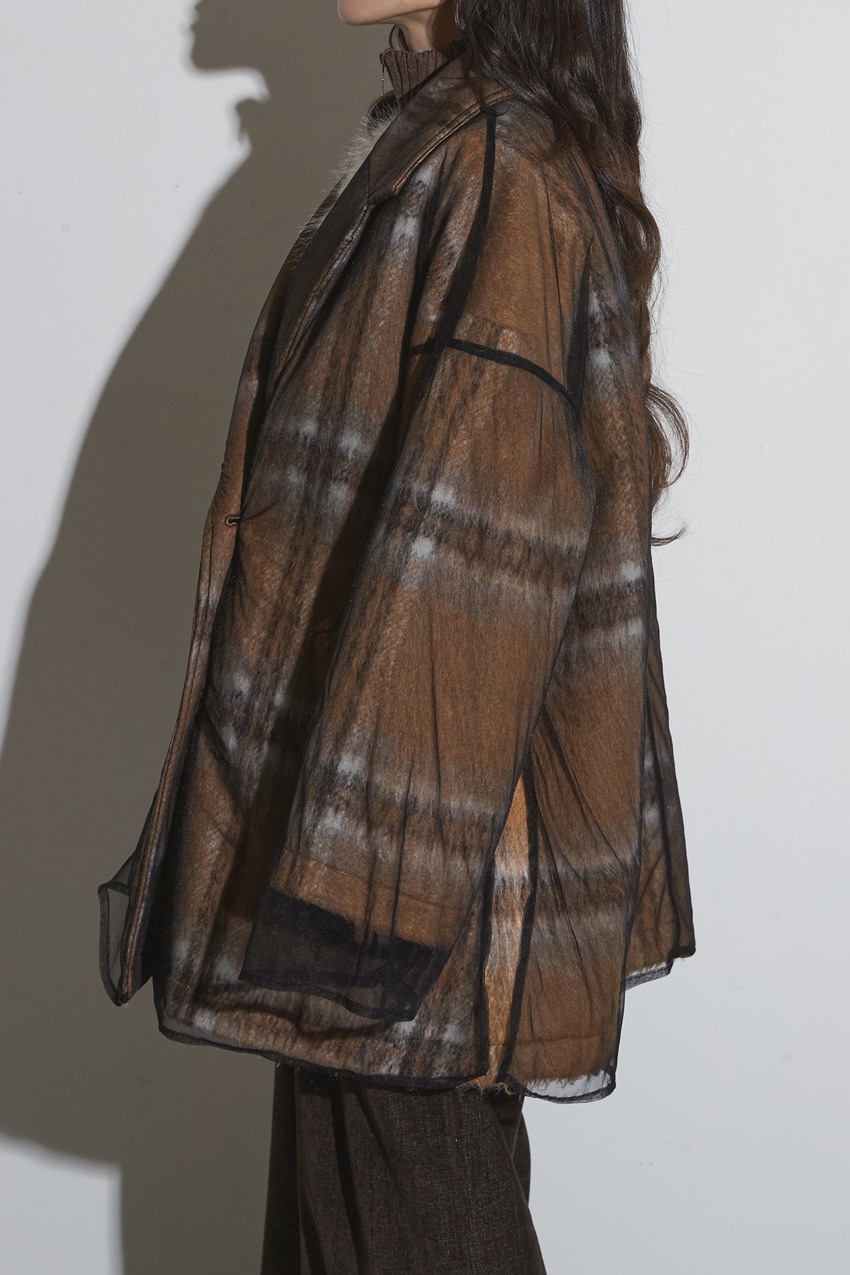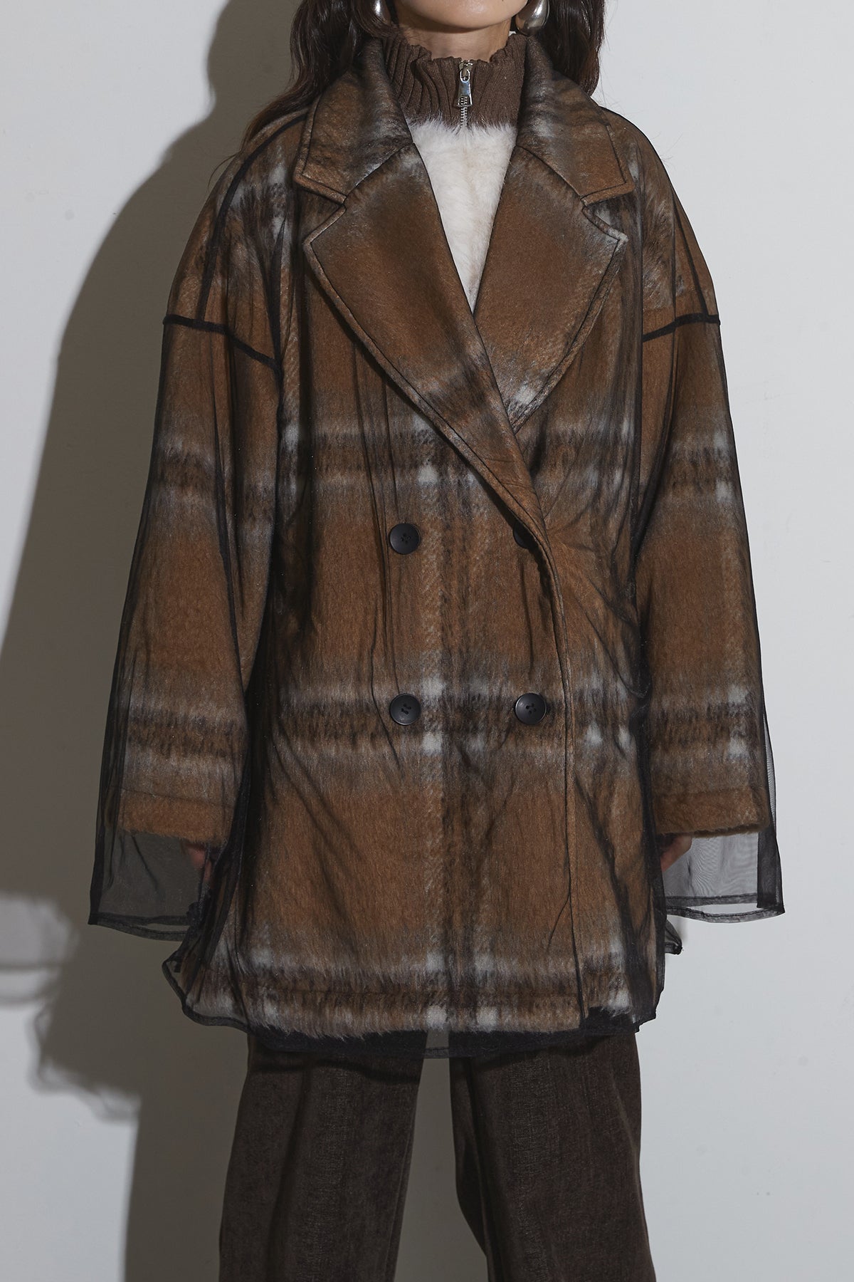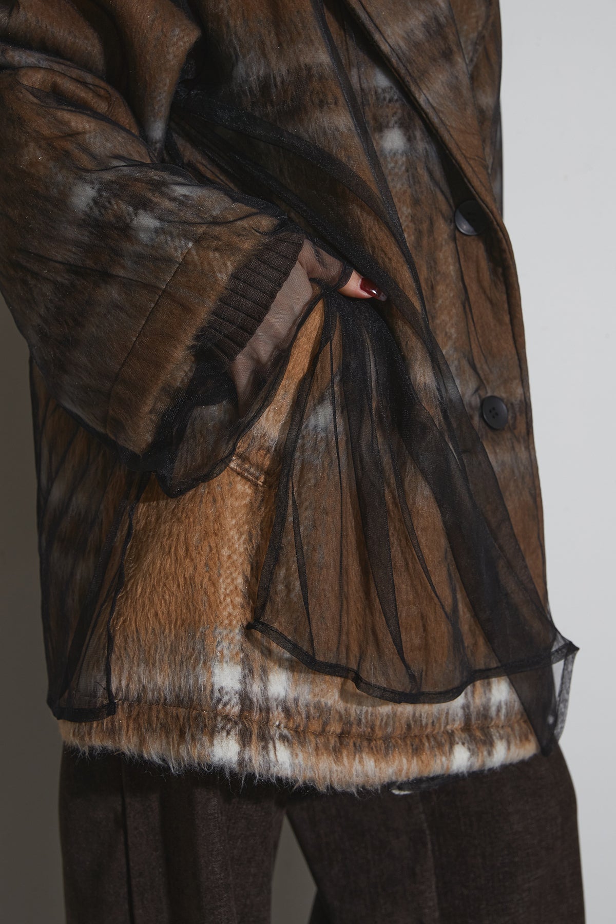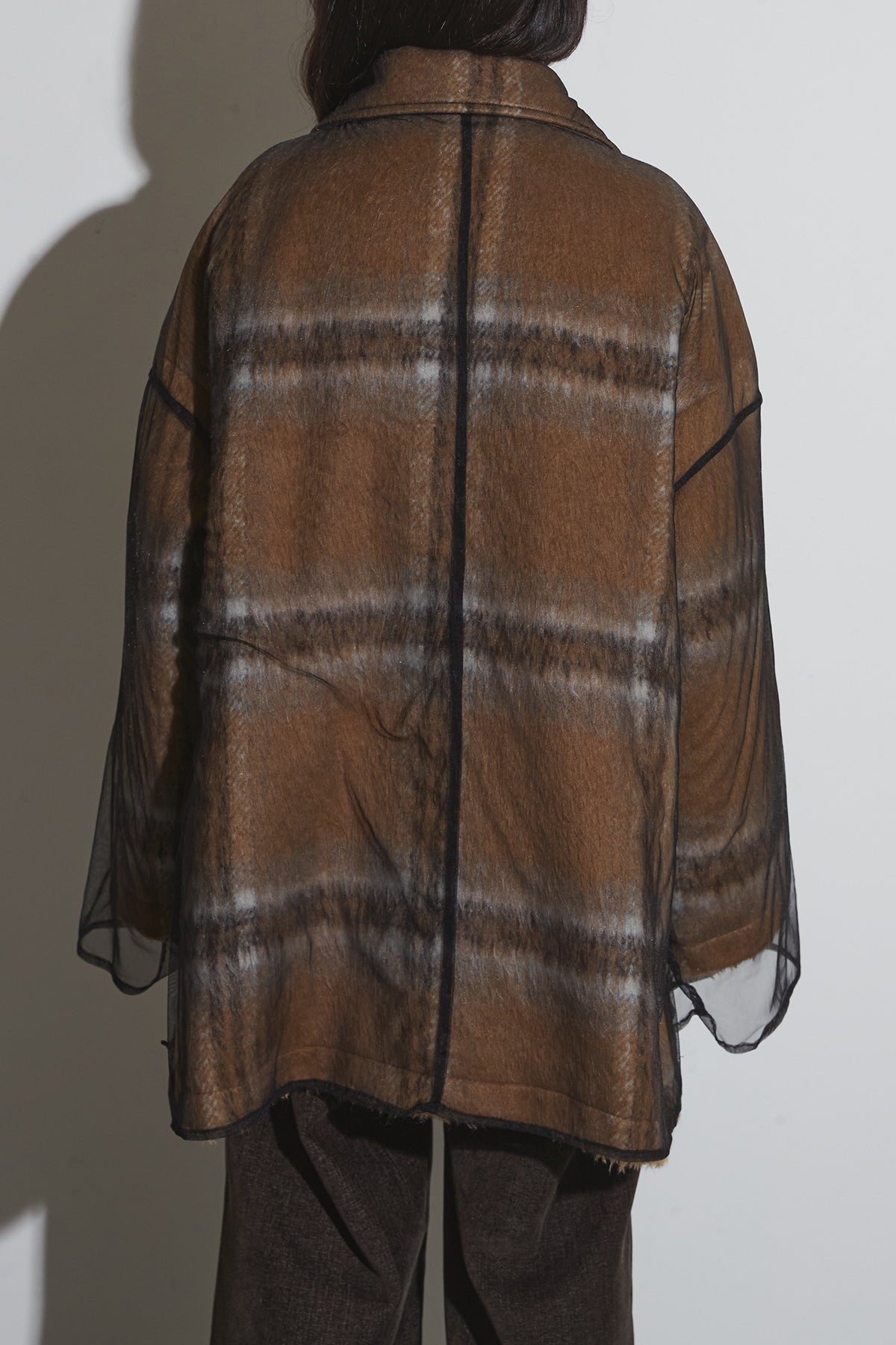 【SET】チュールレイヤードチェックジャケット+ファードッキングZIPニット+レイヤーベルトデザインデニム