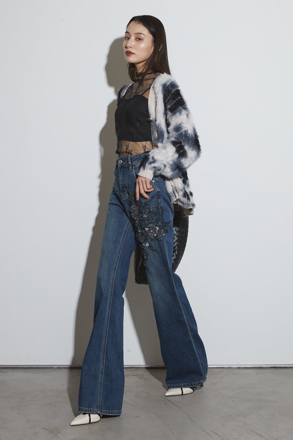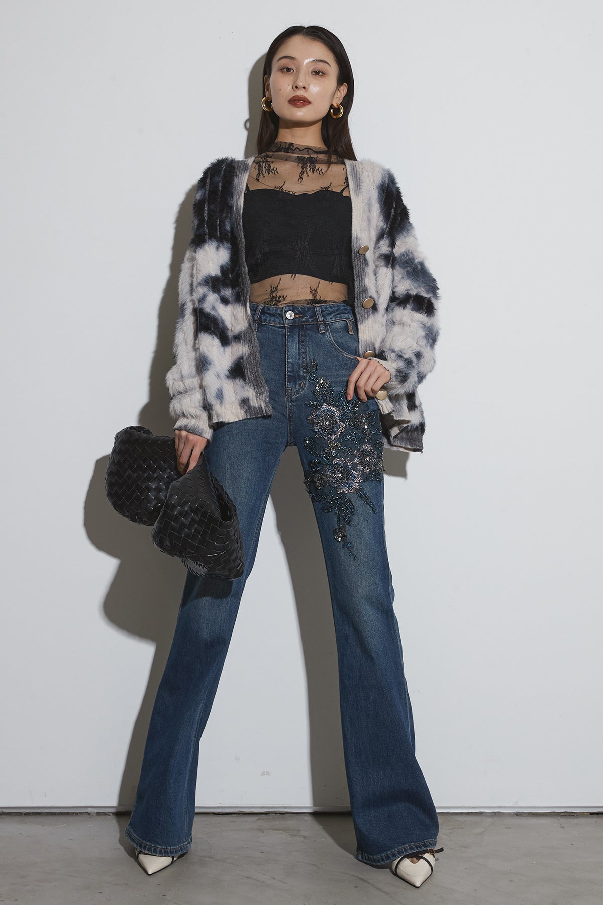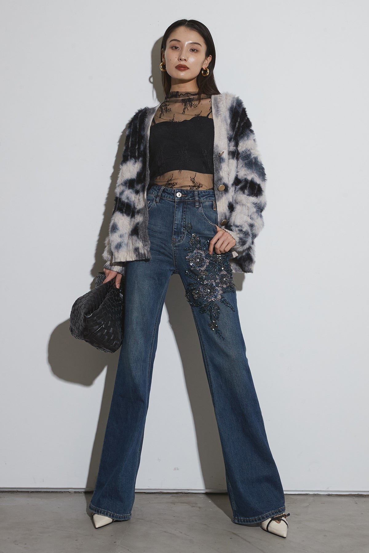 【SET】マーブルジャガードニットカーデ+ビジューエンブロイダリーデニム
