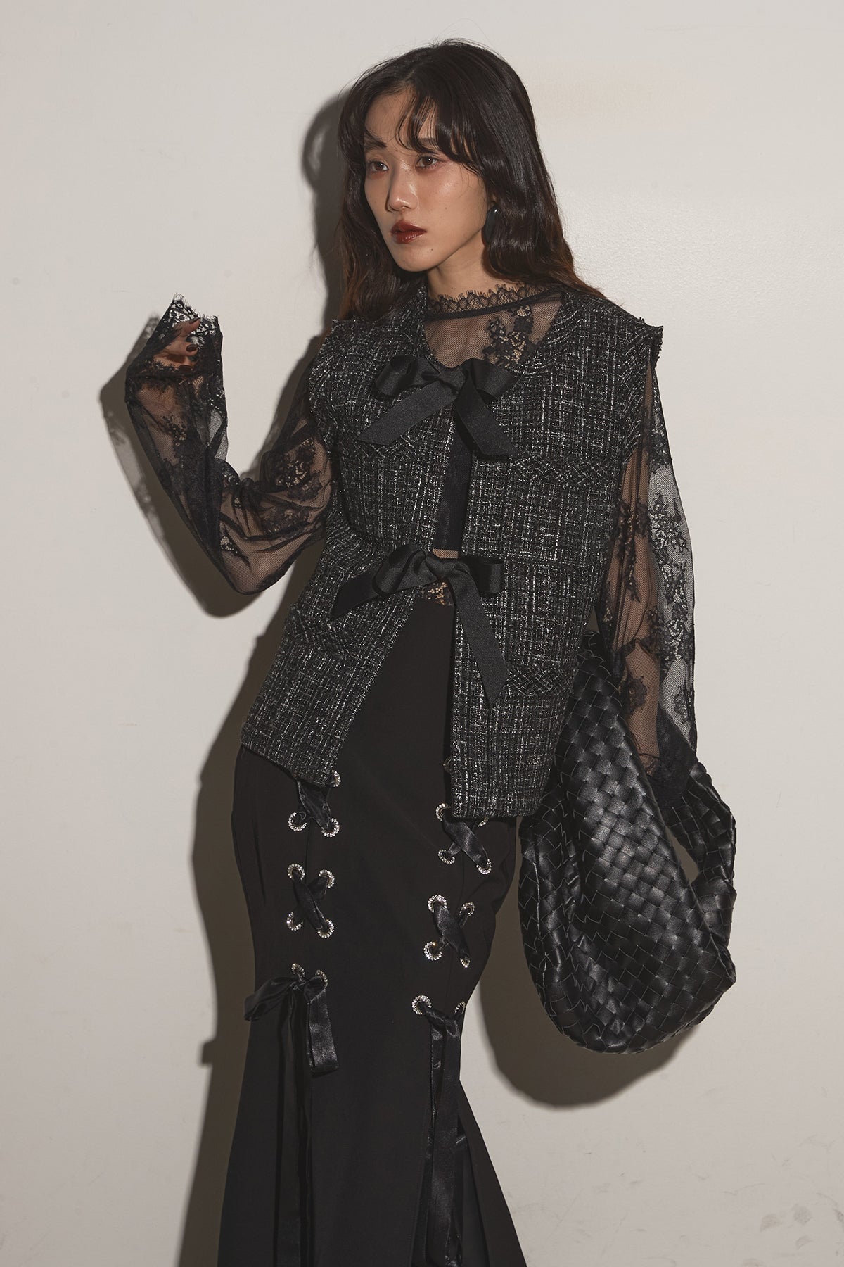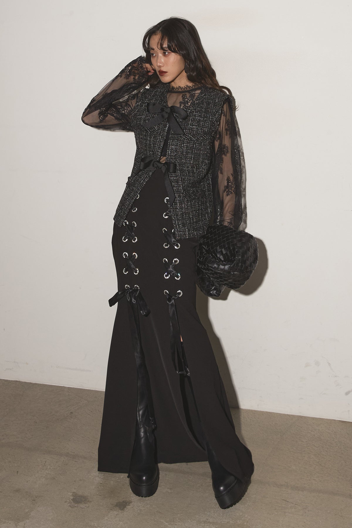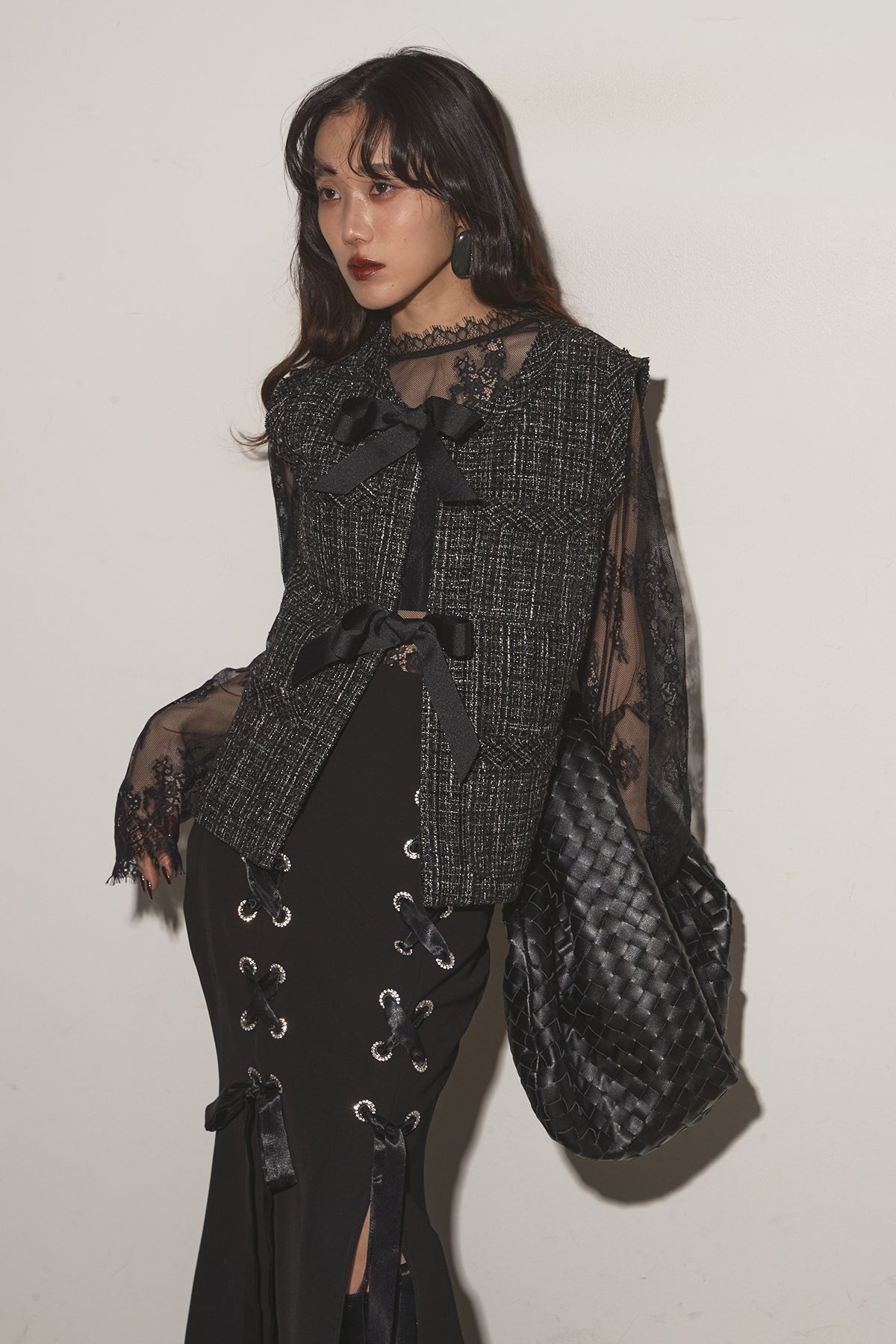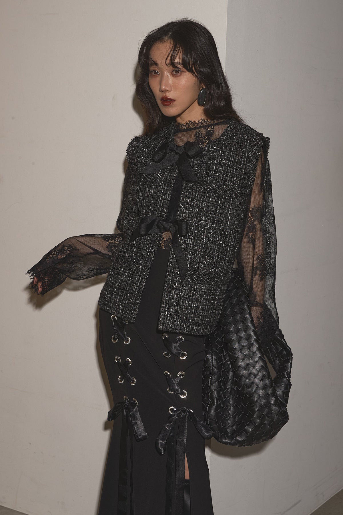 【SET】リボンツイードベスト+レースアップマーメイドスカート