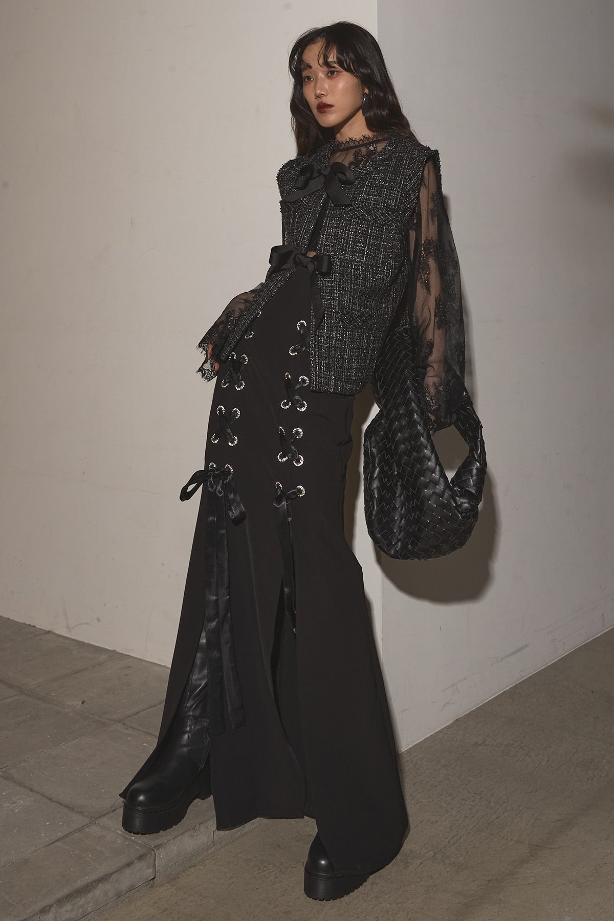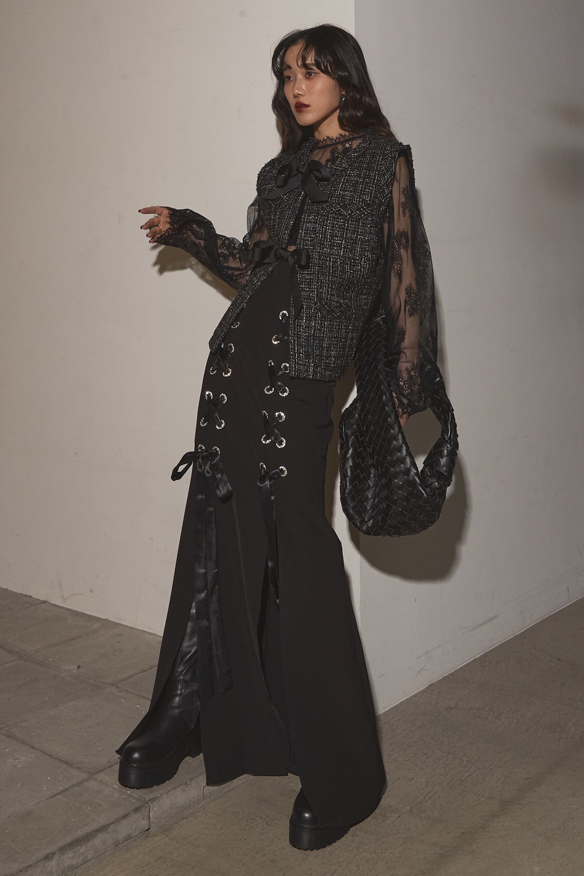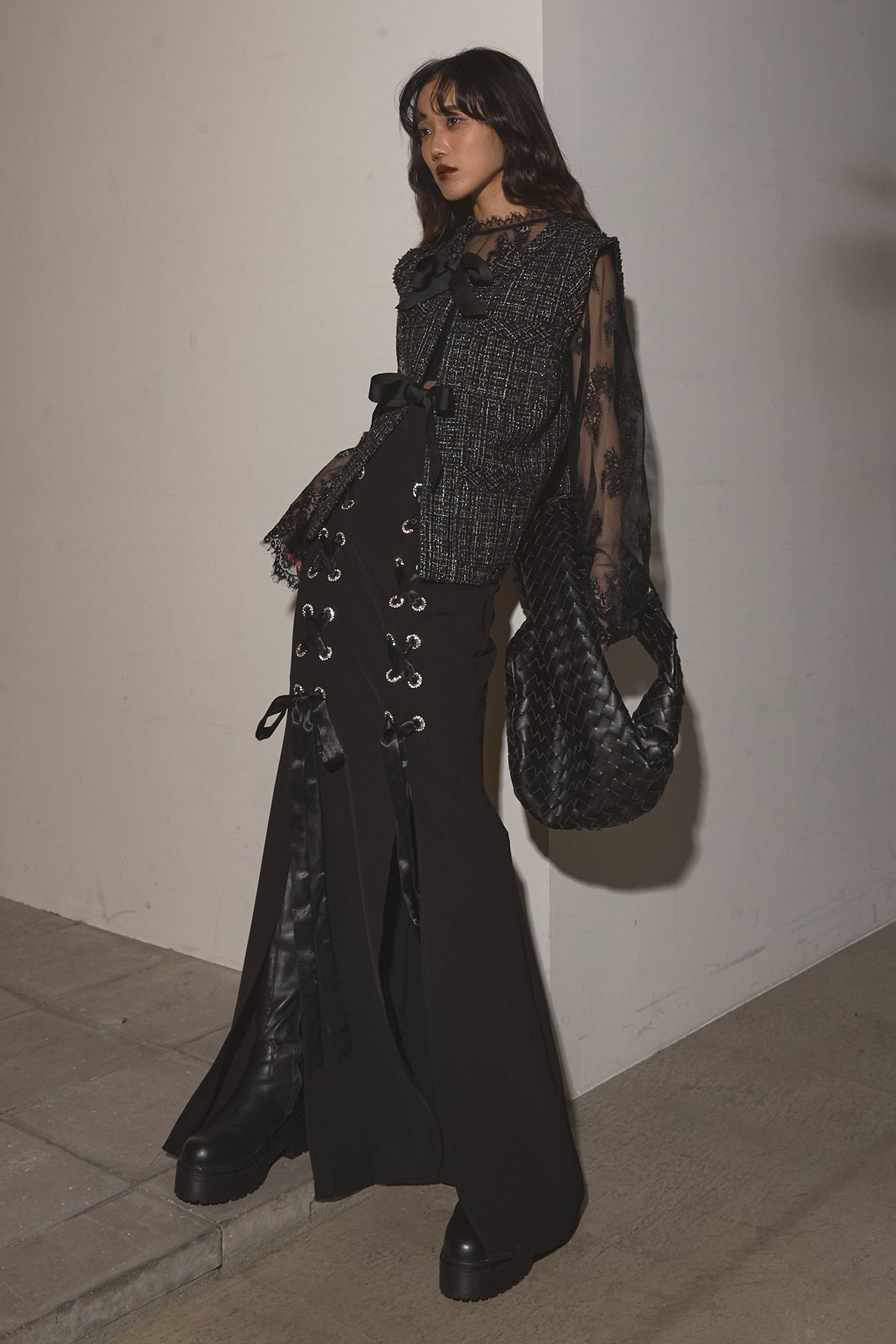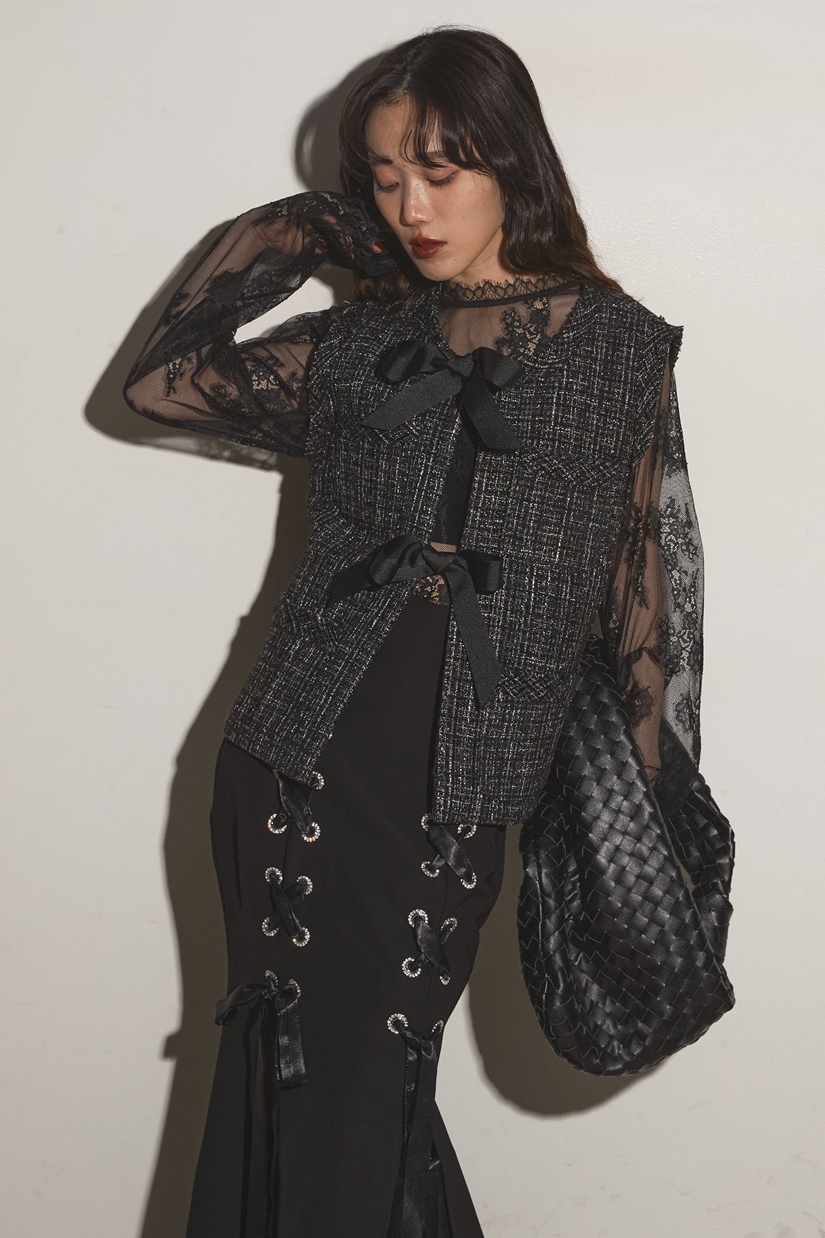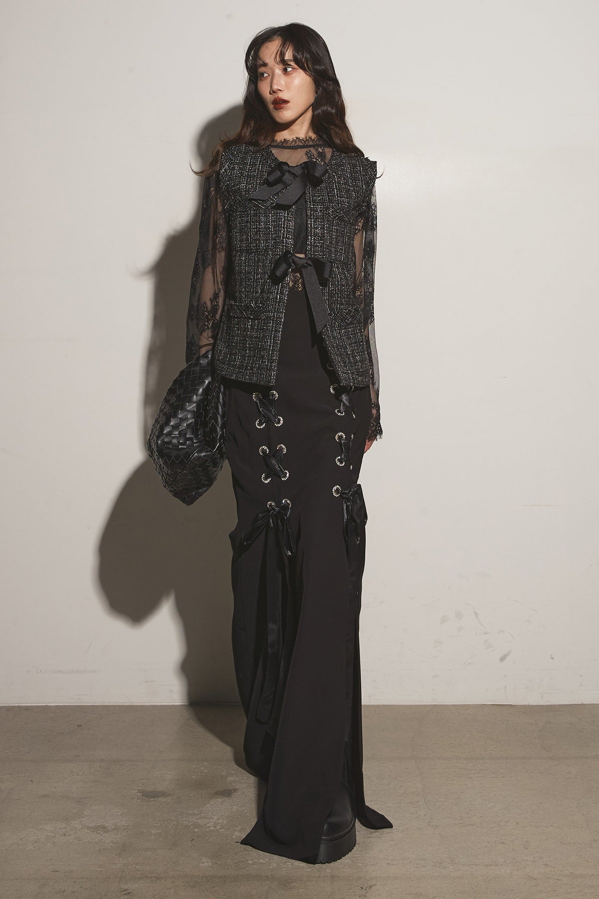【SET】リボンツイードベスト+レースアップマーメイドスカート