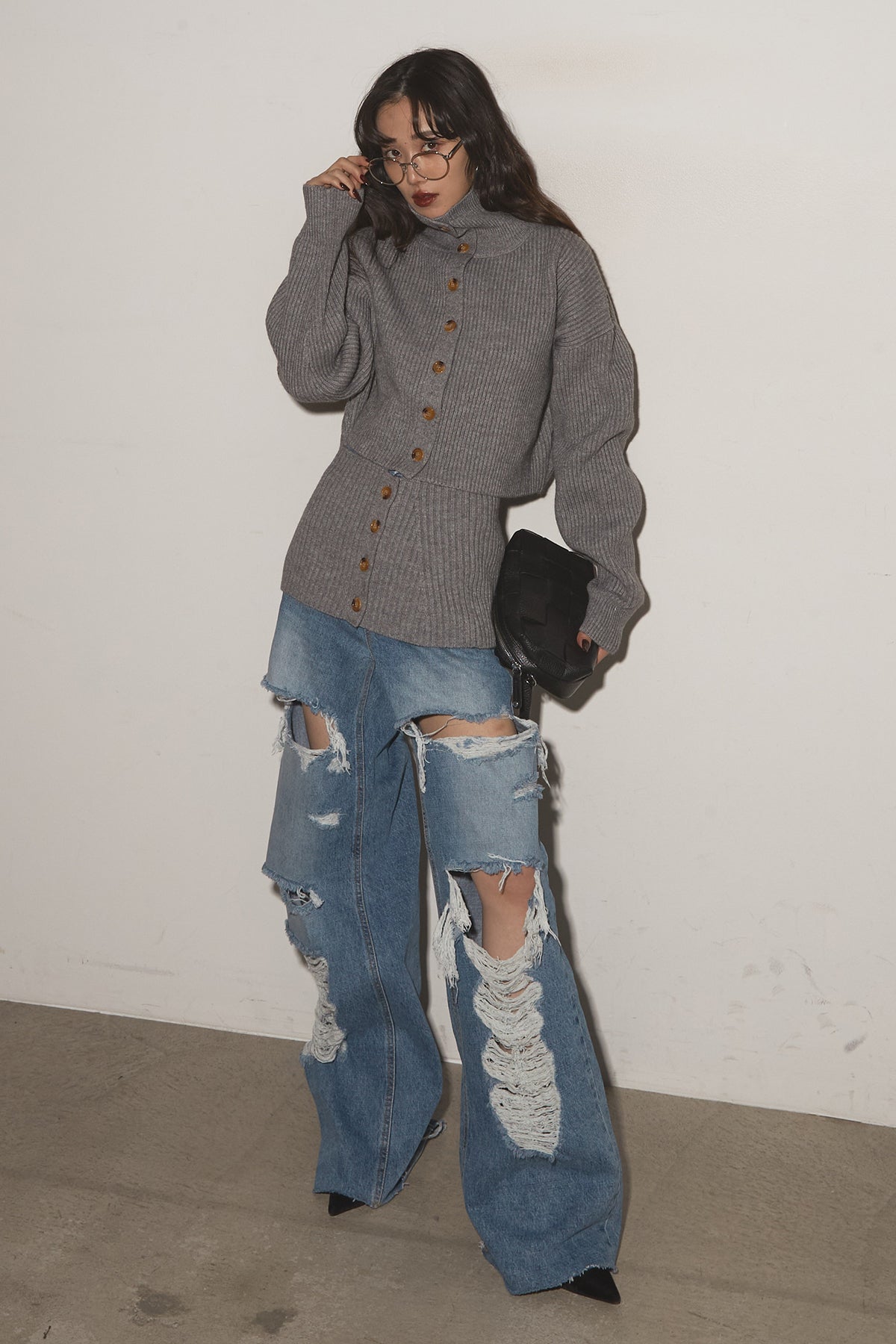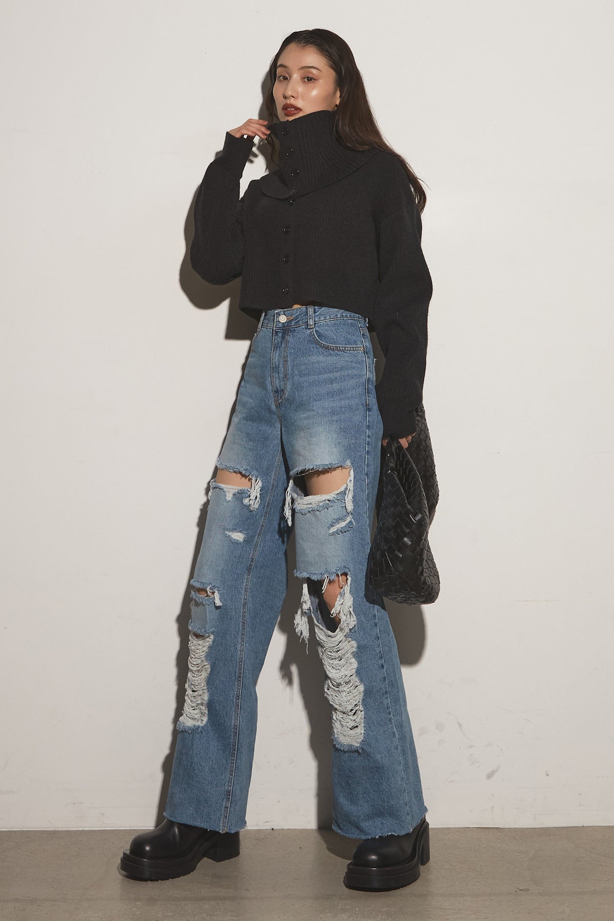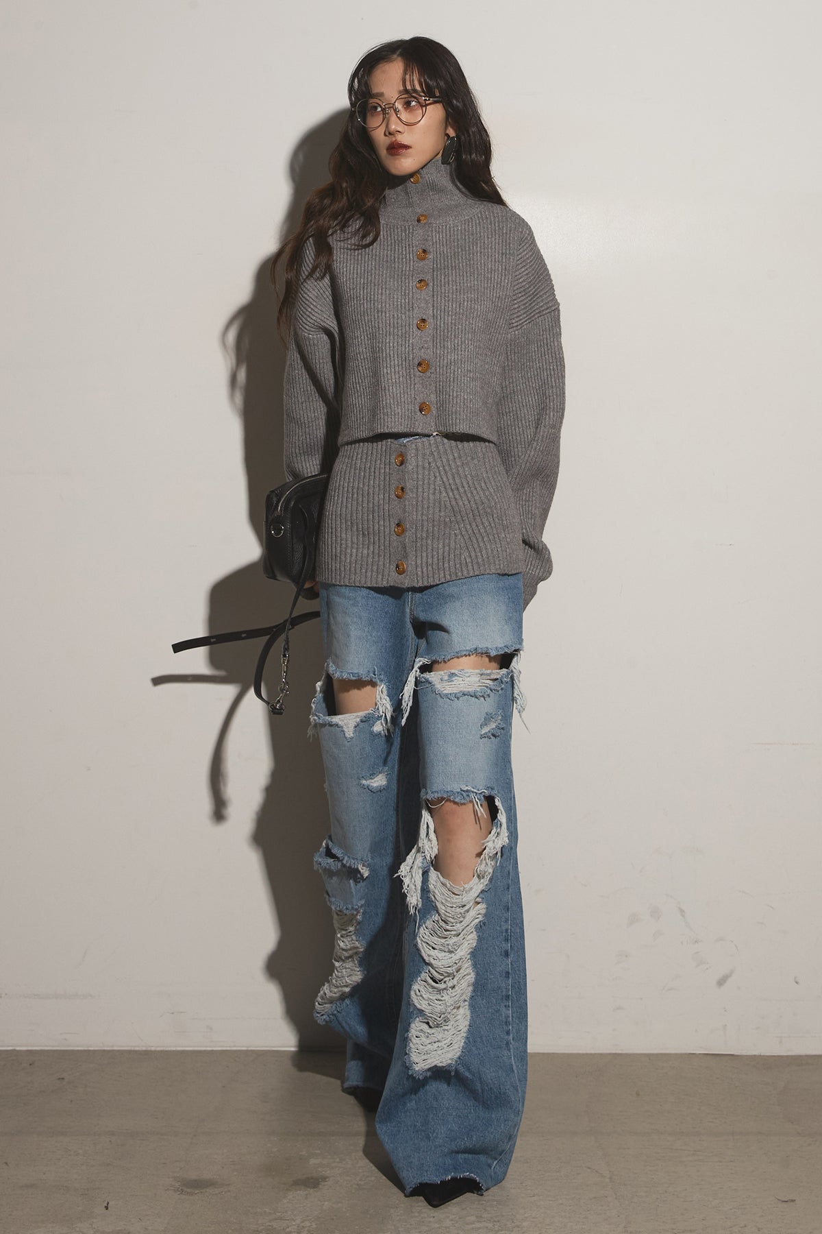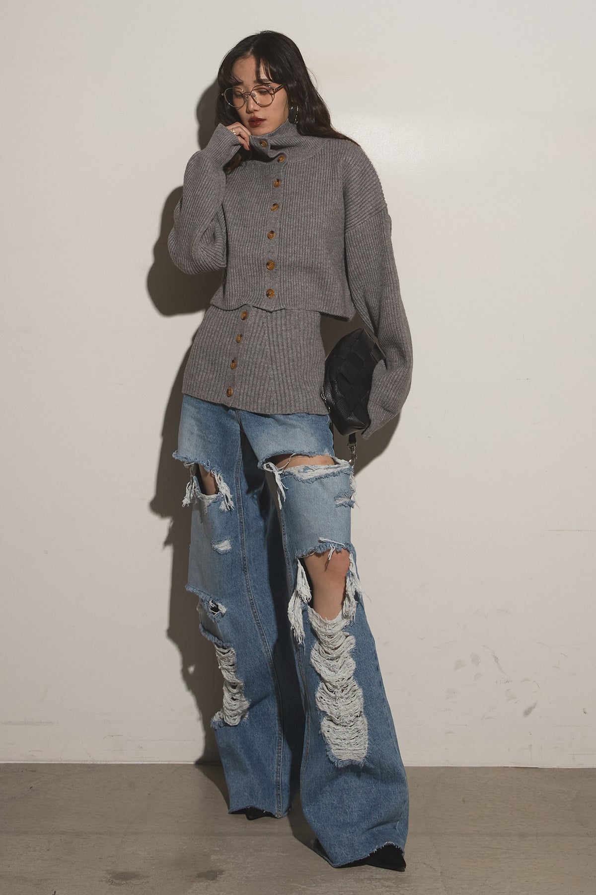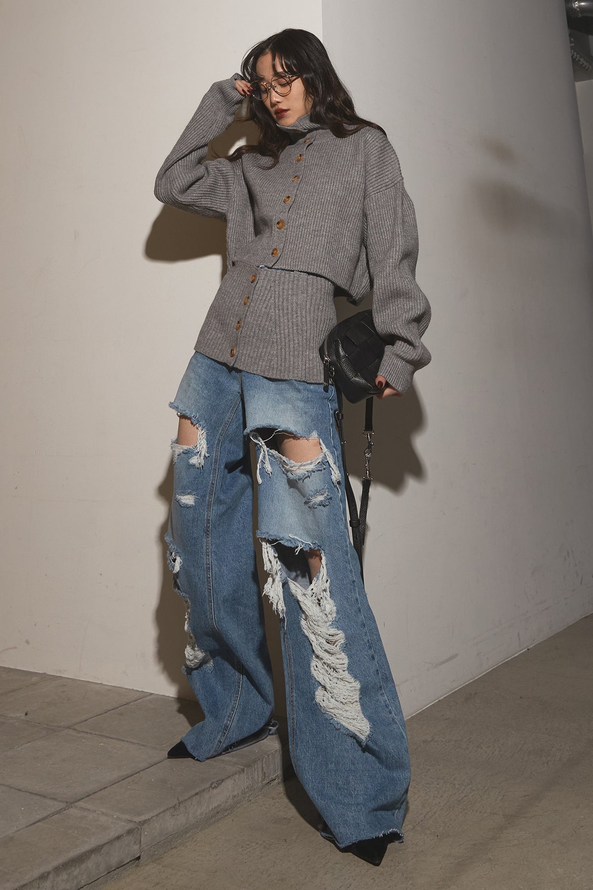 【SET】2Wayレイヤーニット+クラッシュワイドデニムパンツ