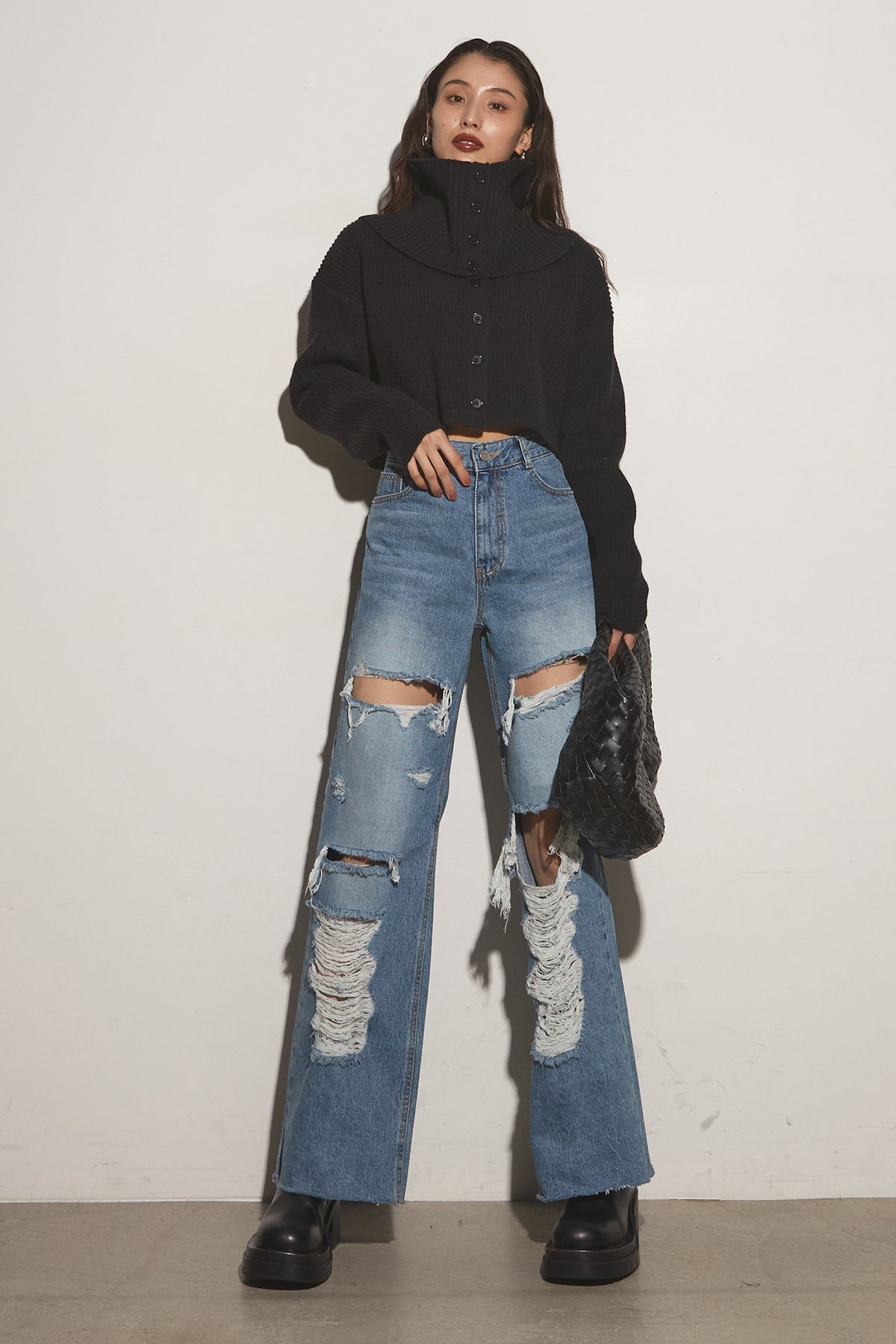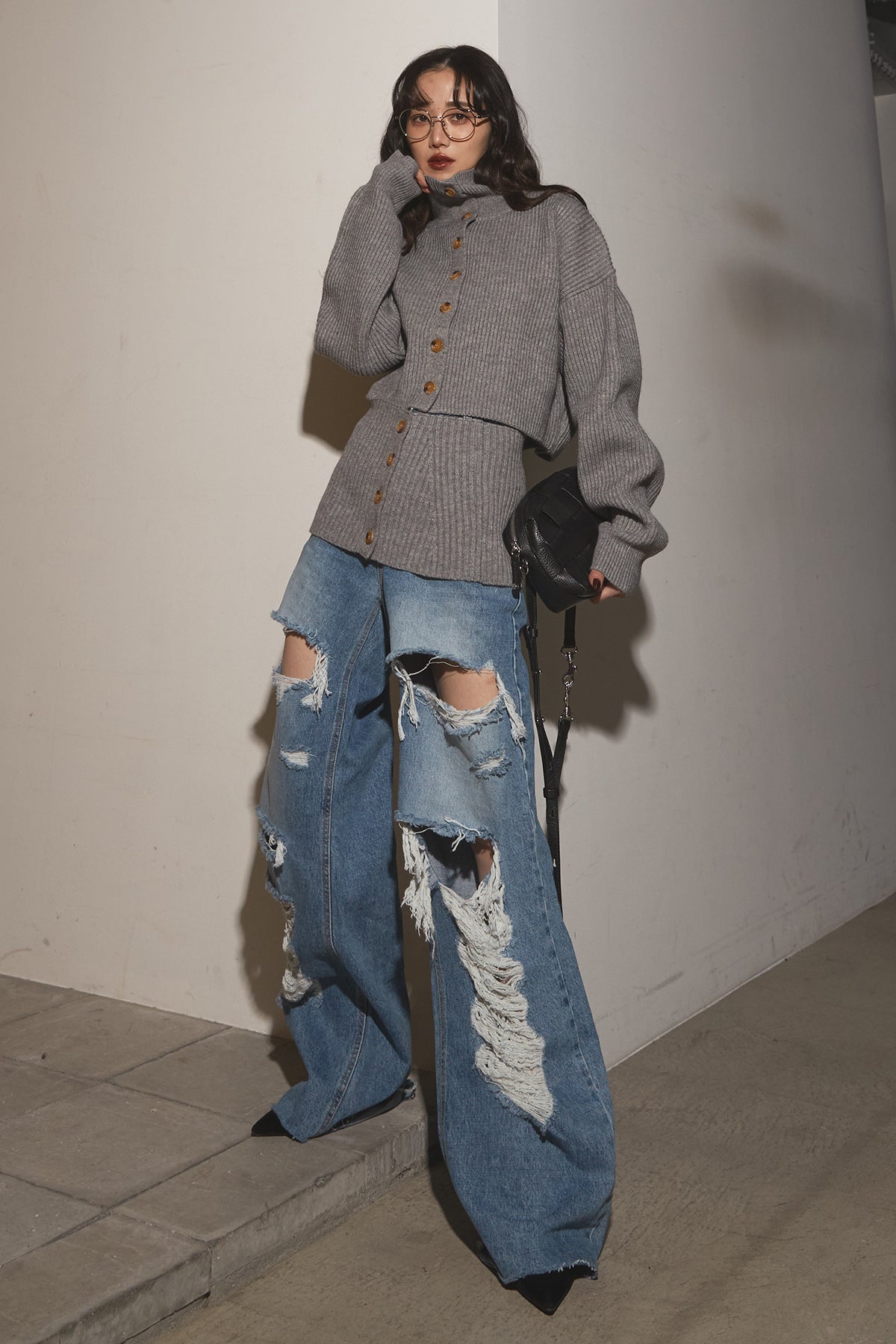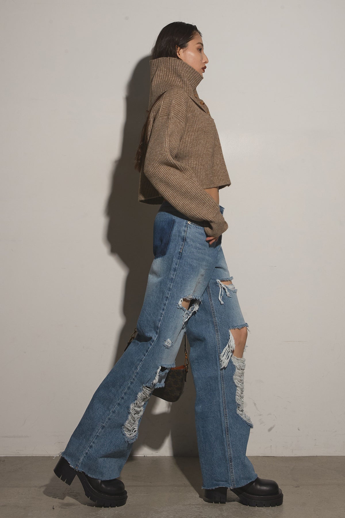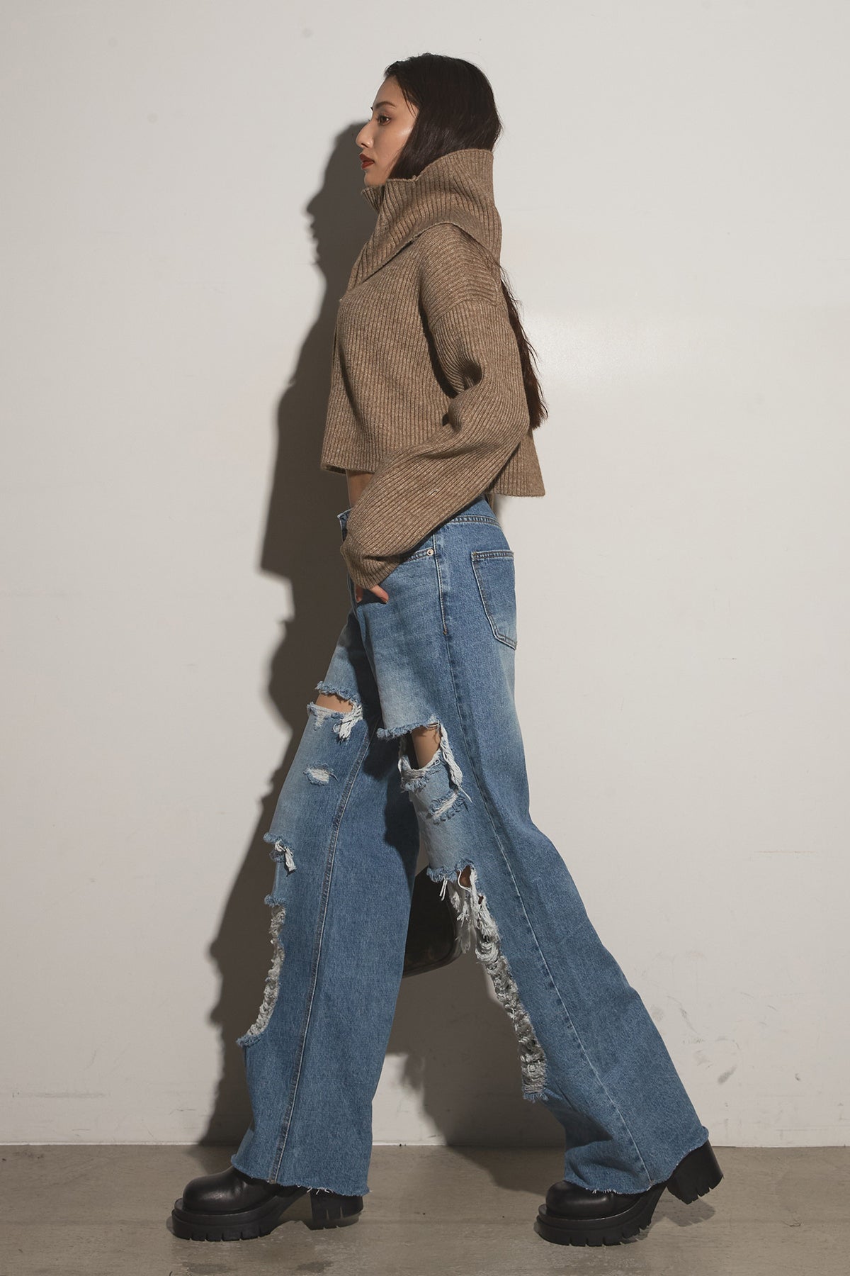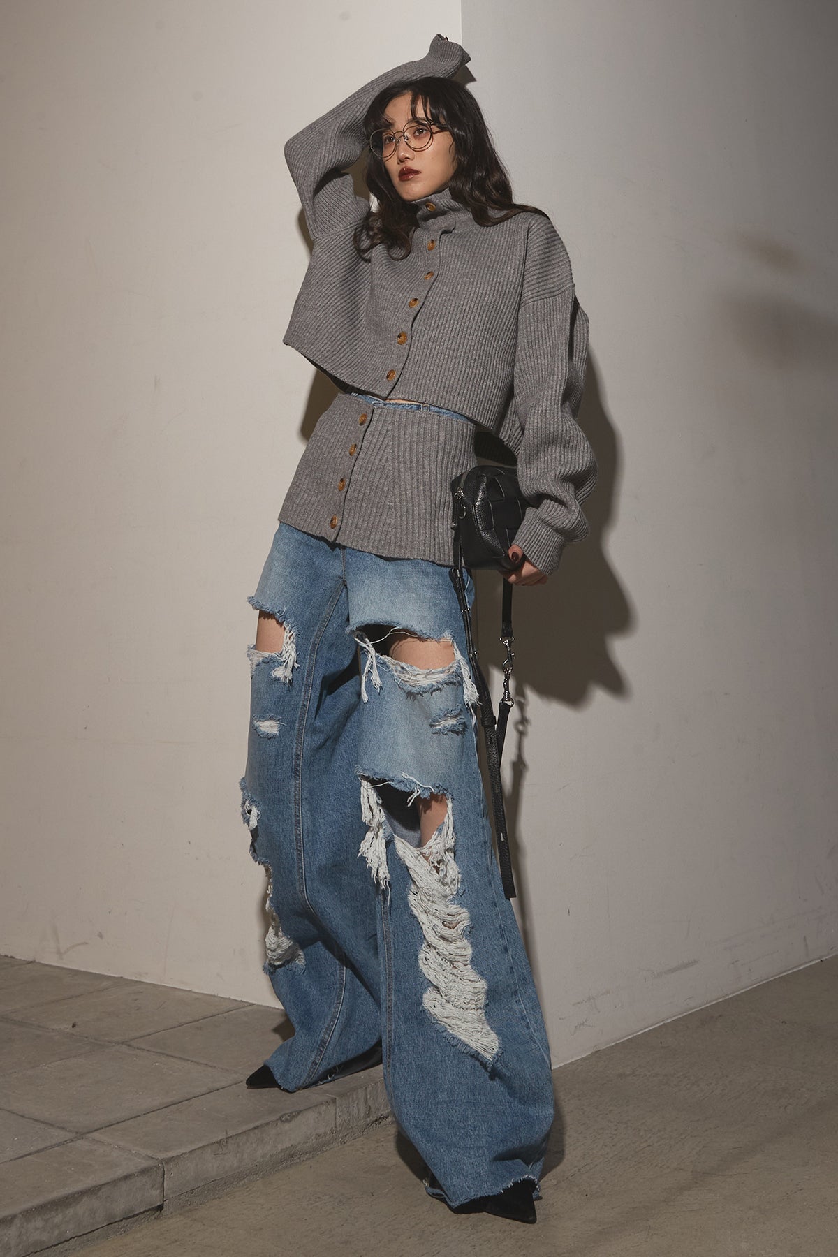 【SET】2Wayレイヤーニット+クラッシュワイドデニムパンツ