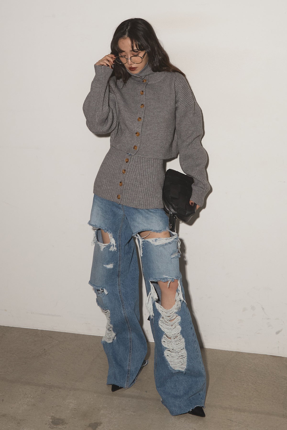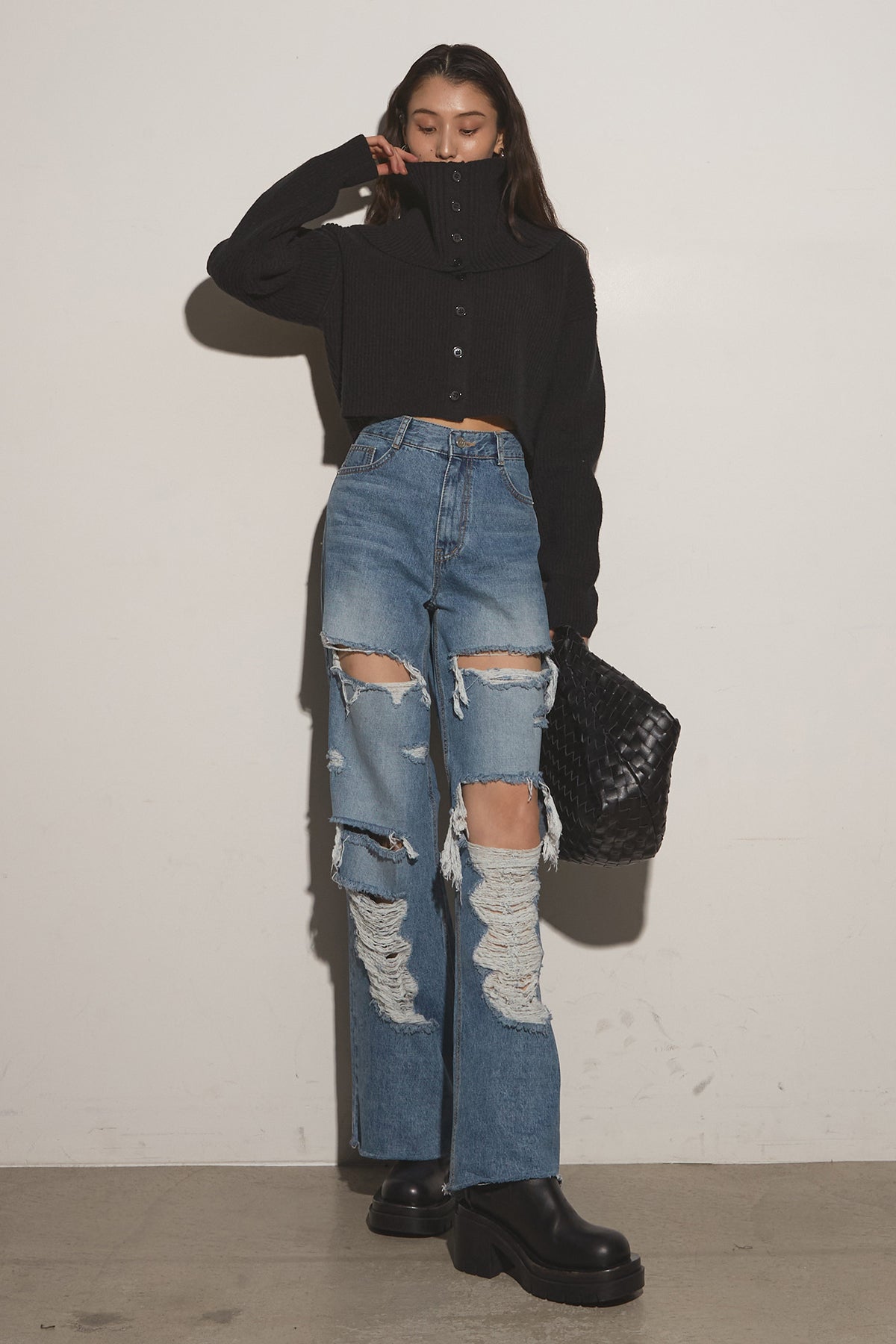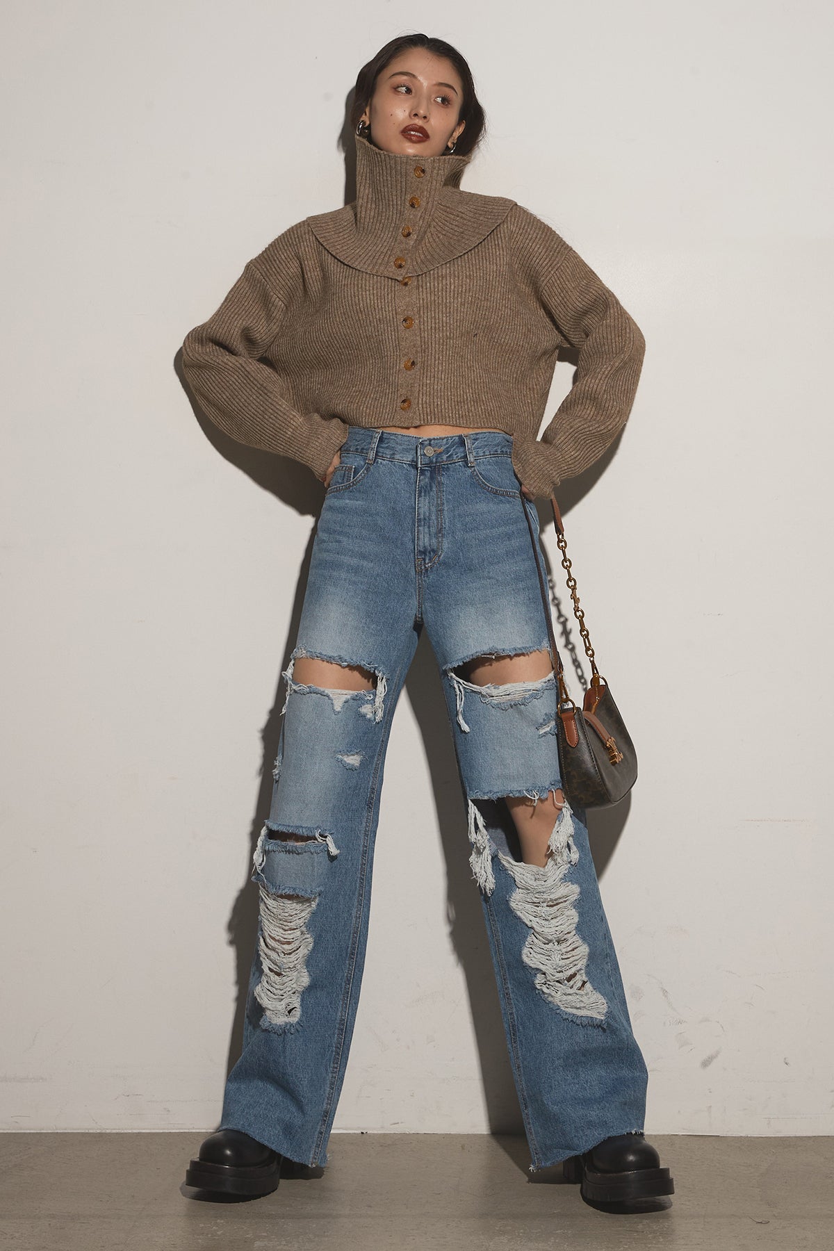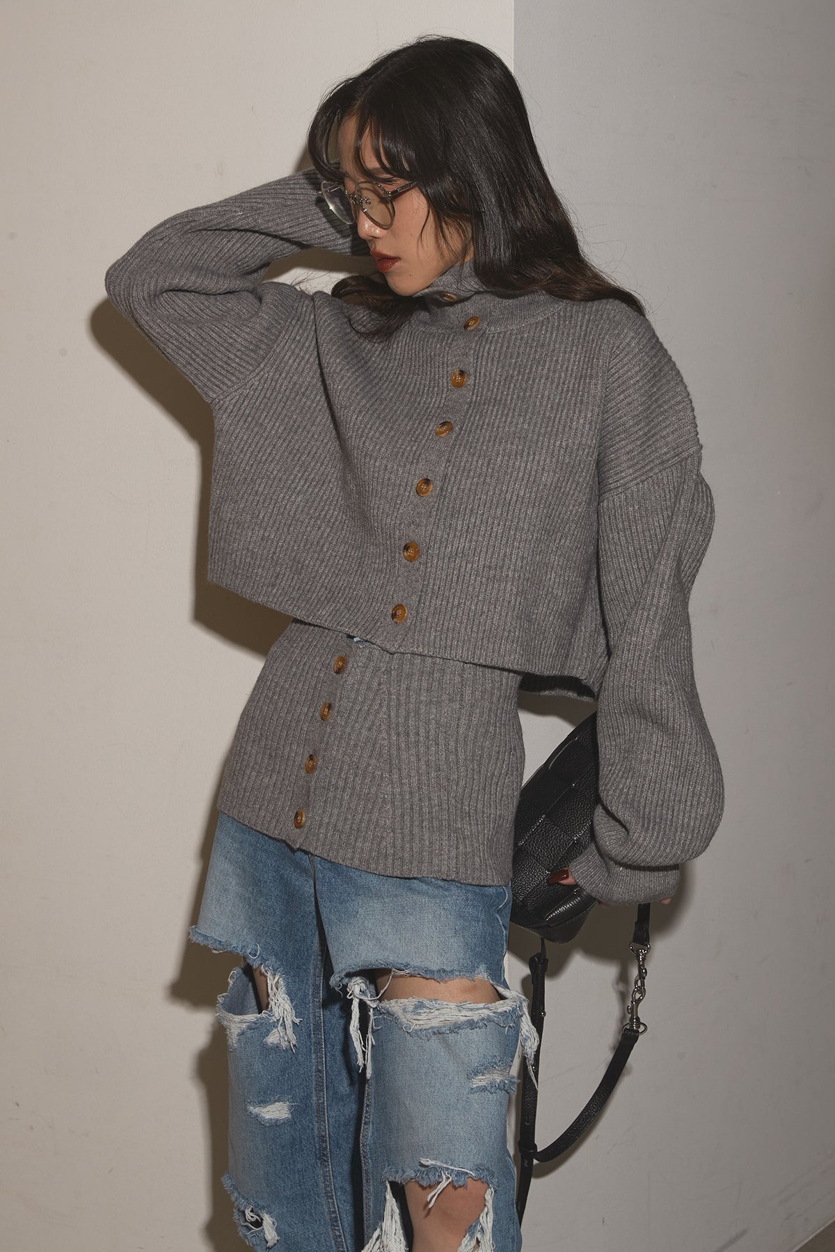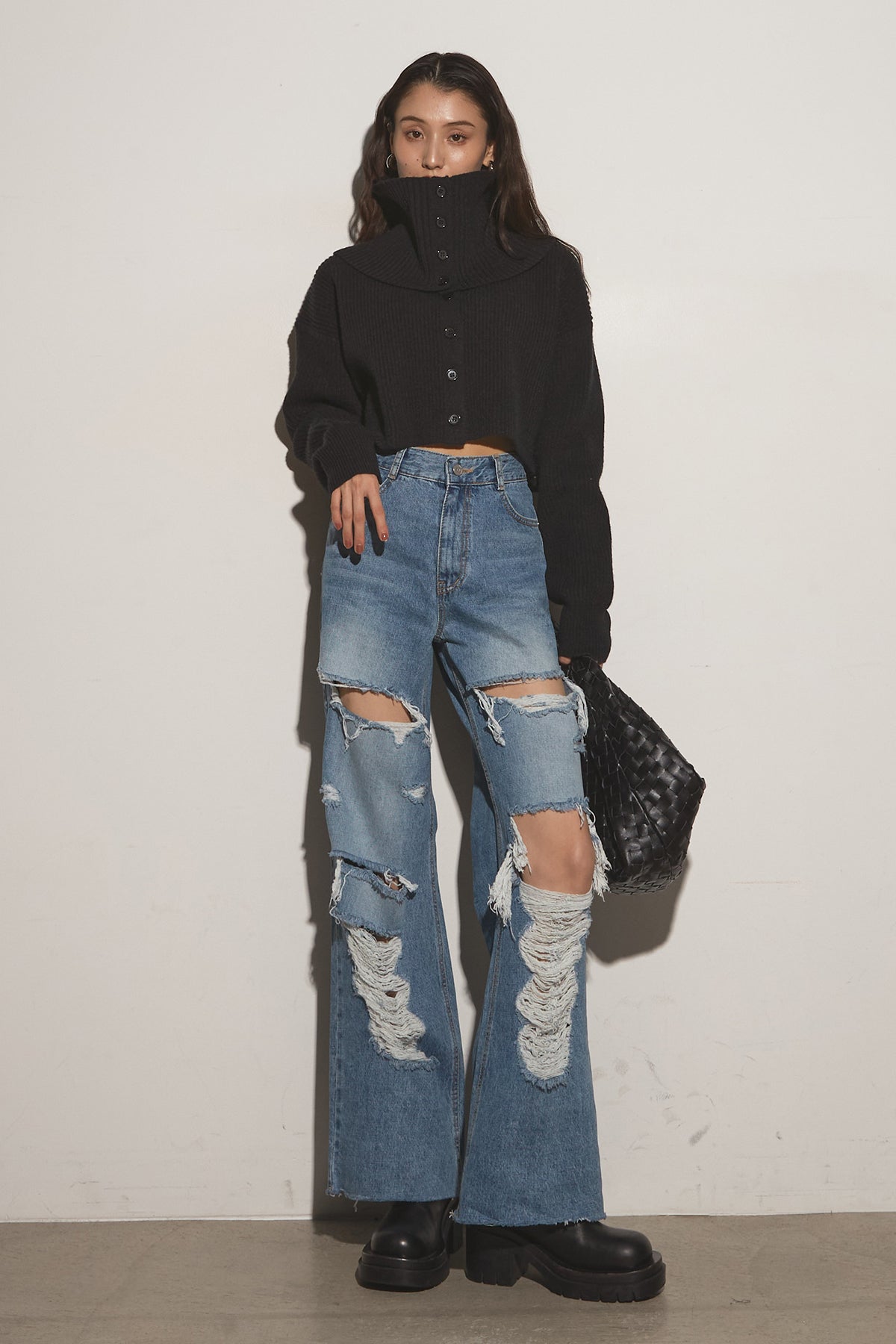 【SET】2Wayレイヤーニット+クラッシュワイドデニムパンツ