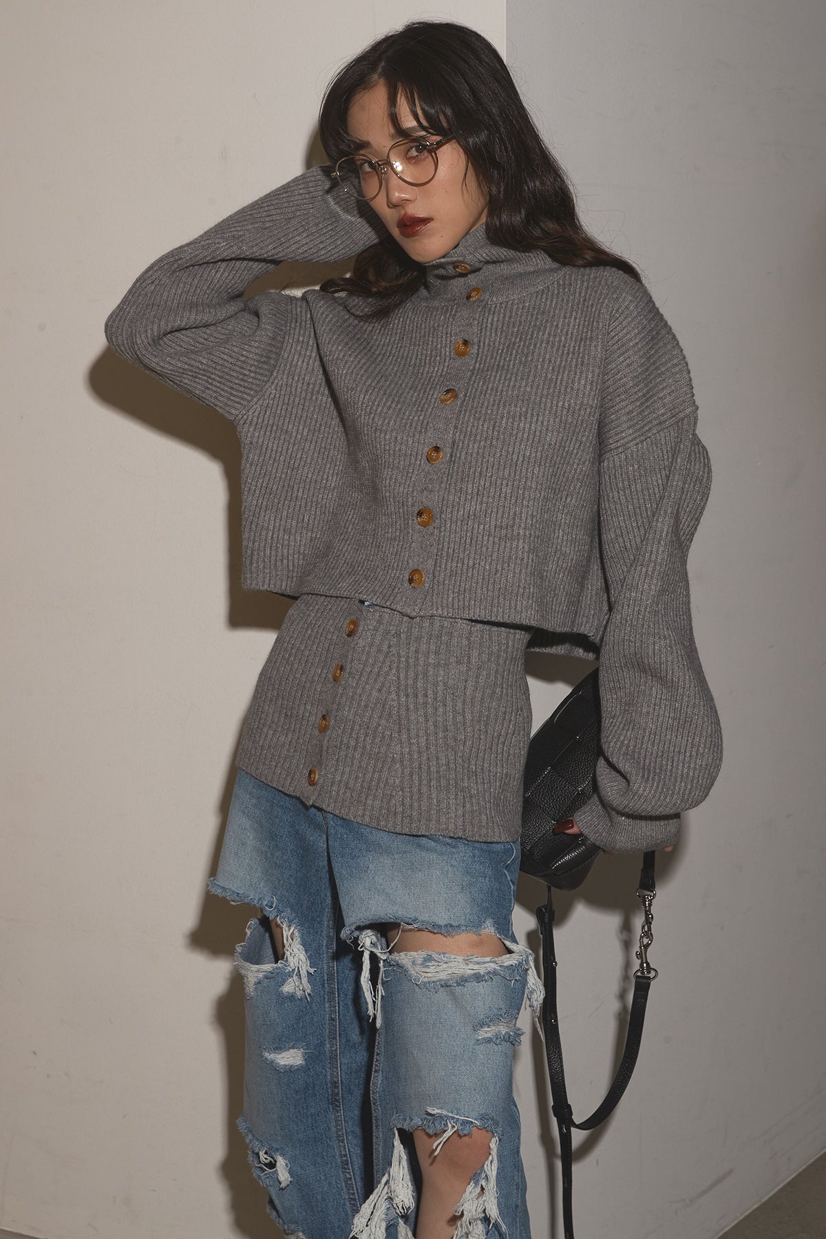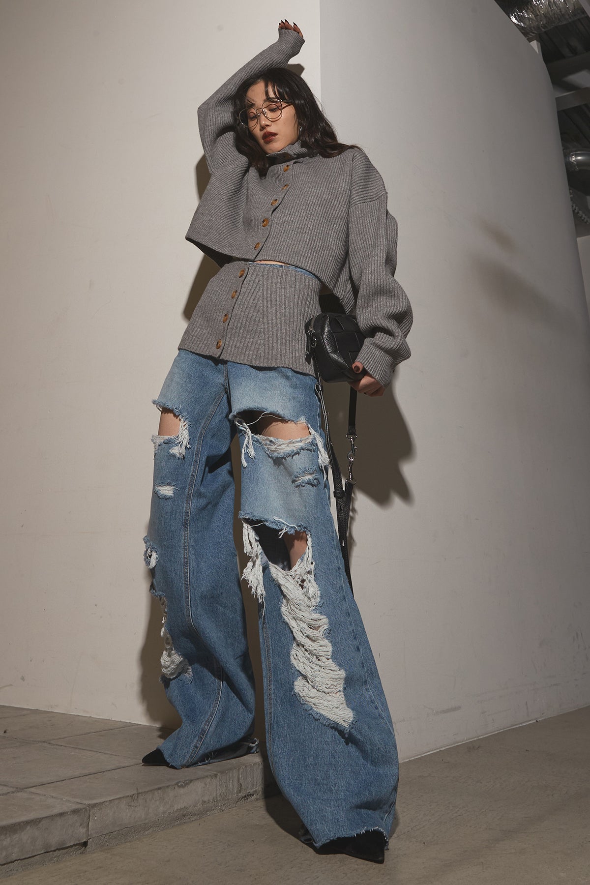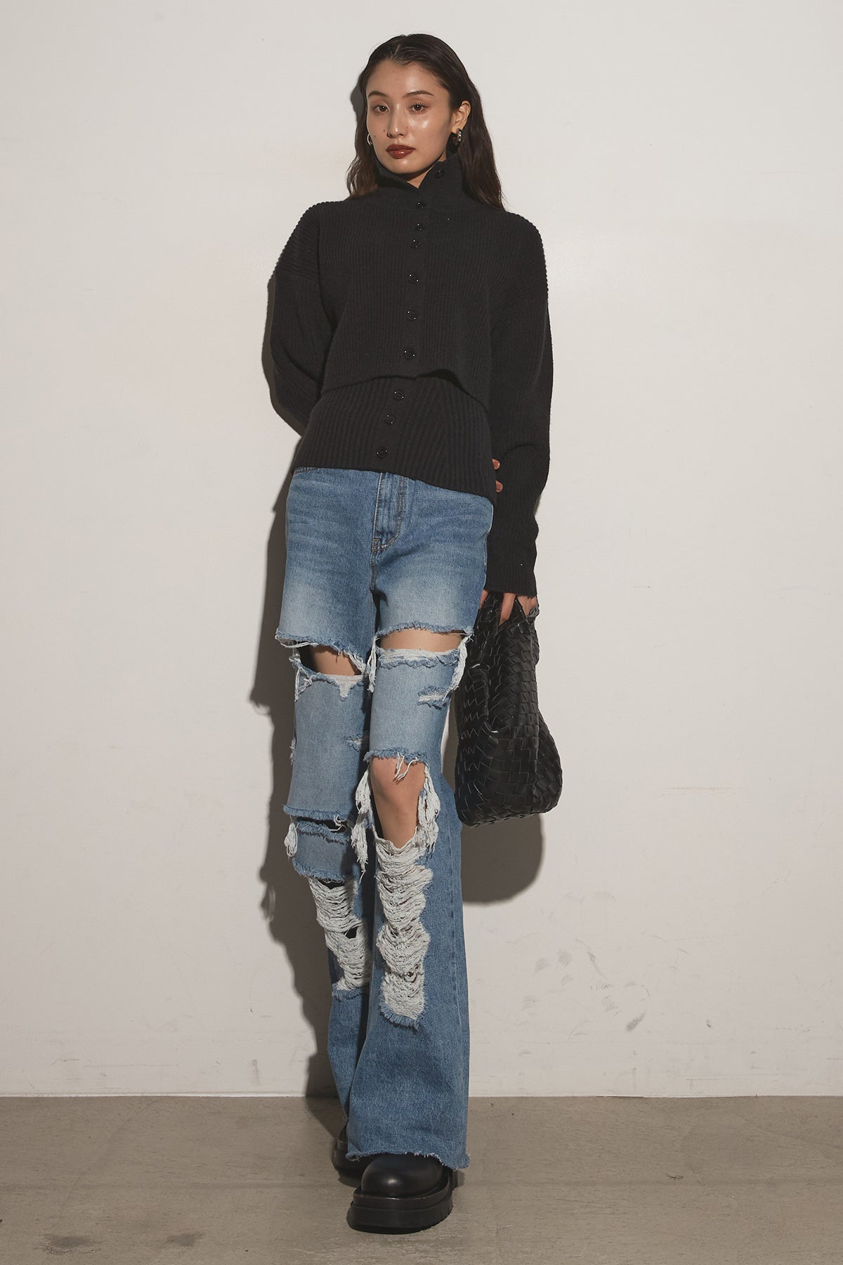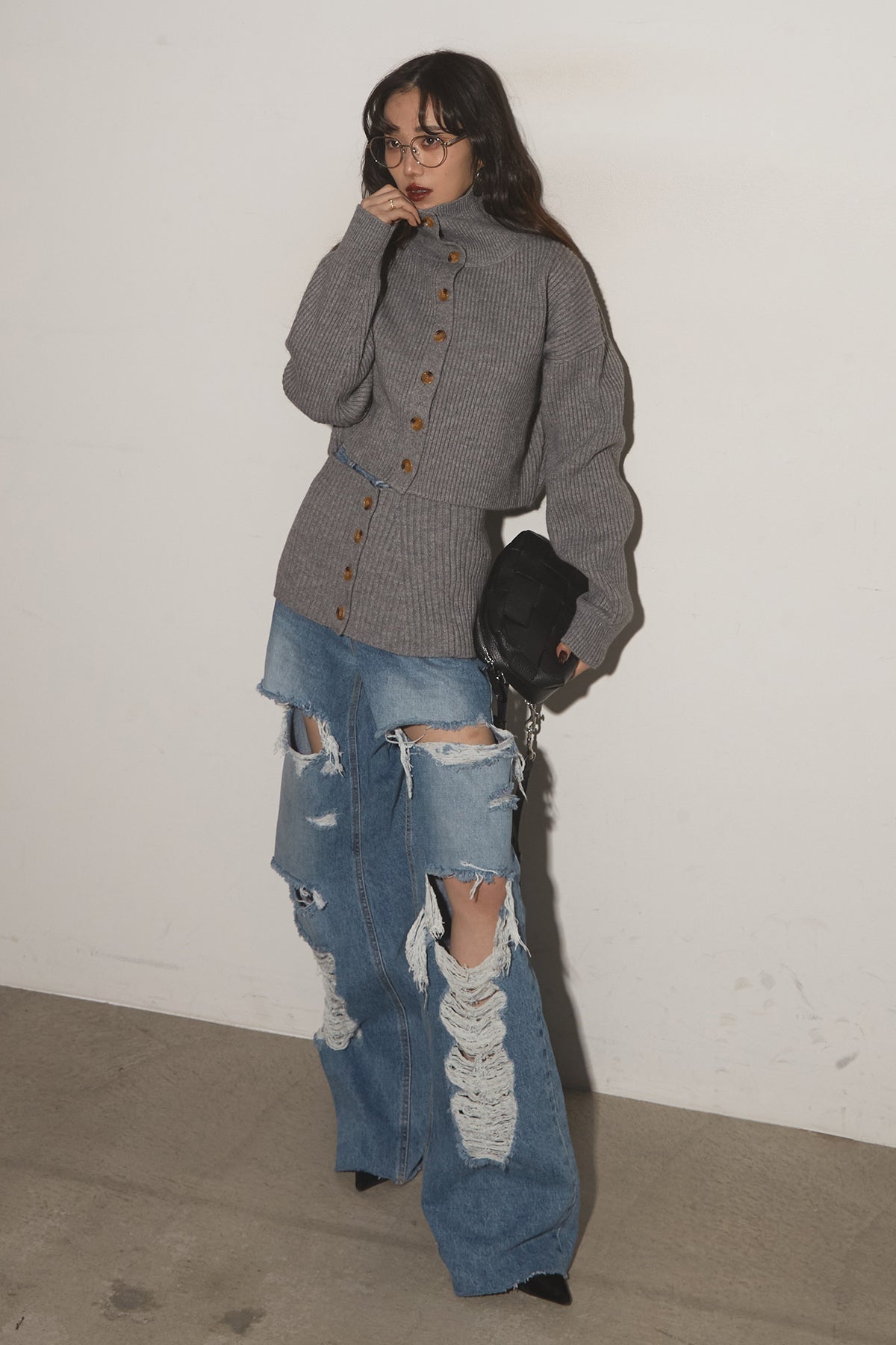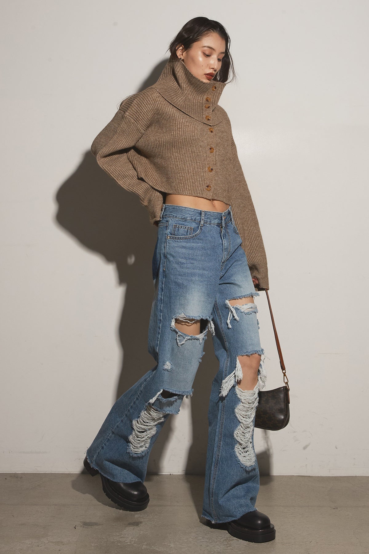 【SET】2Wayレイヤーニット+クラッシュワイドデニムパンツ