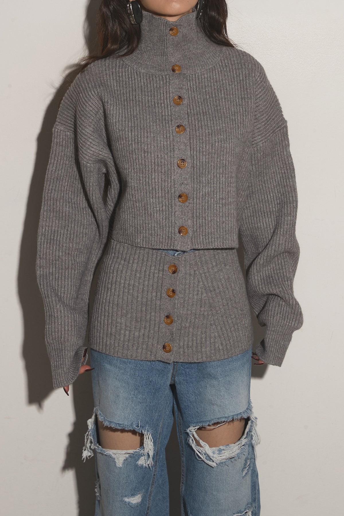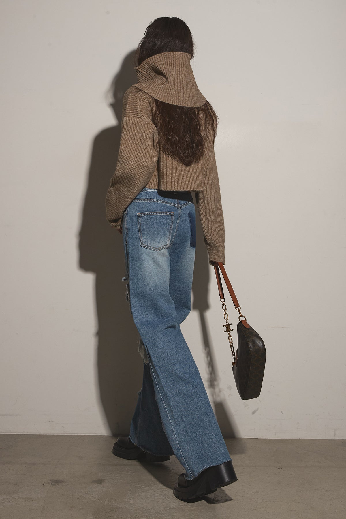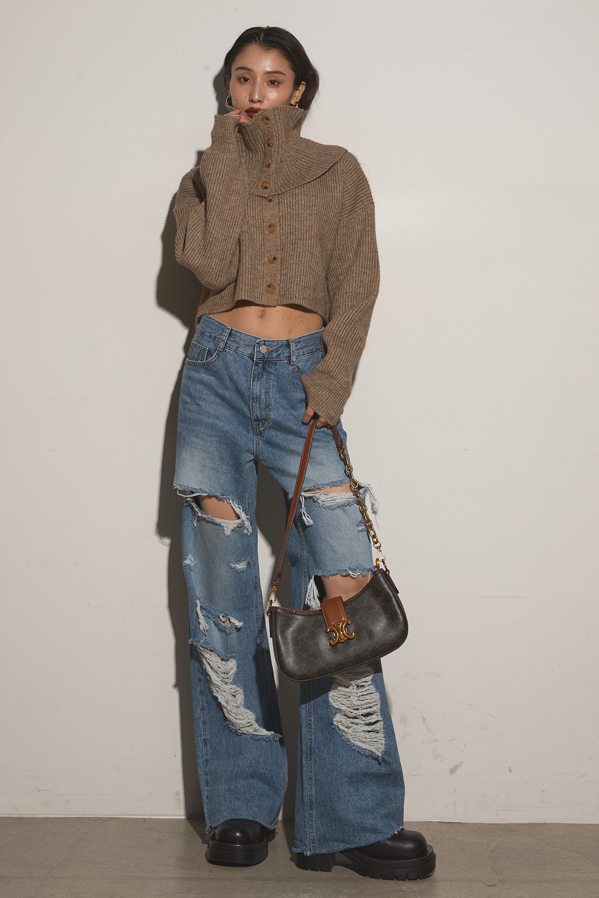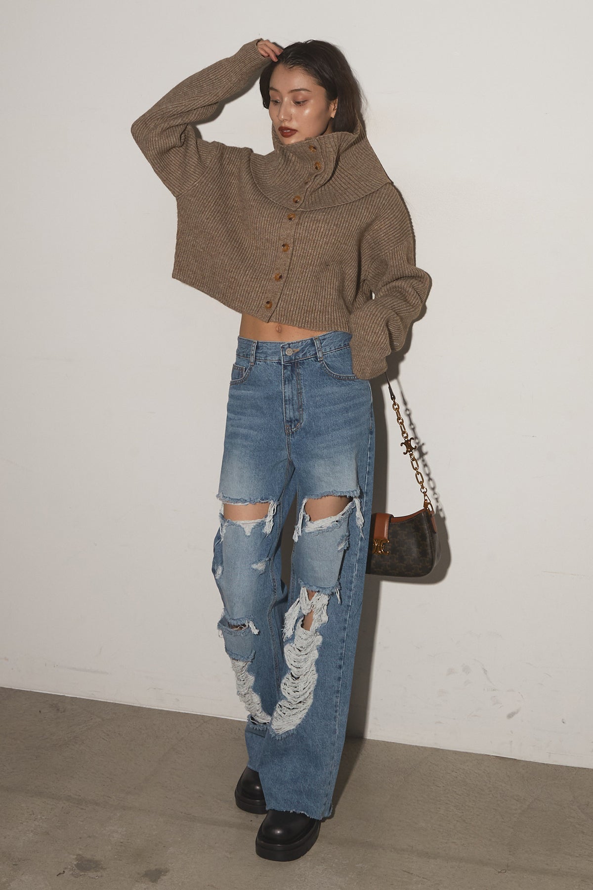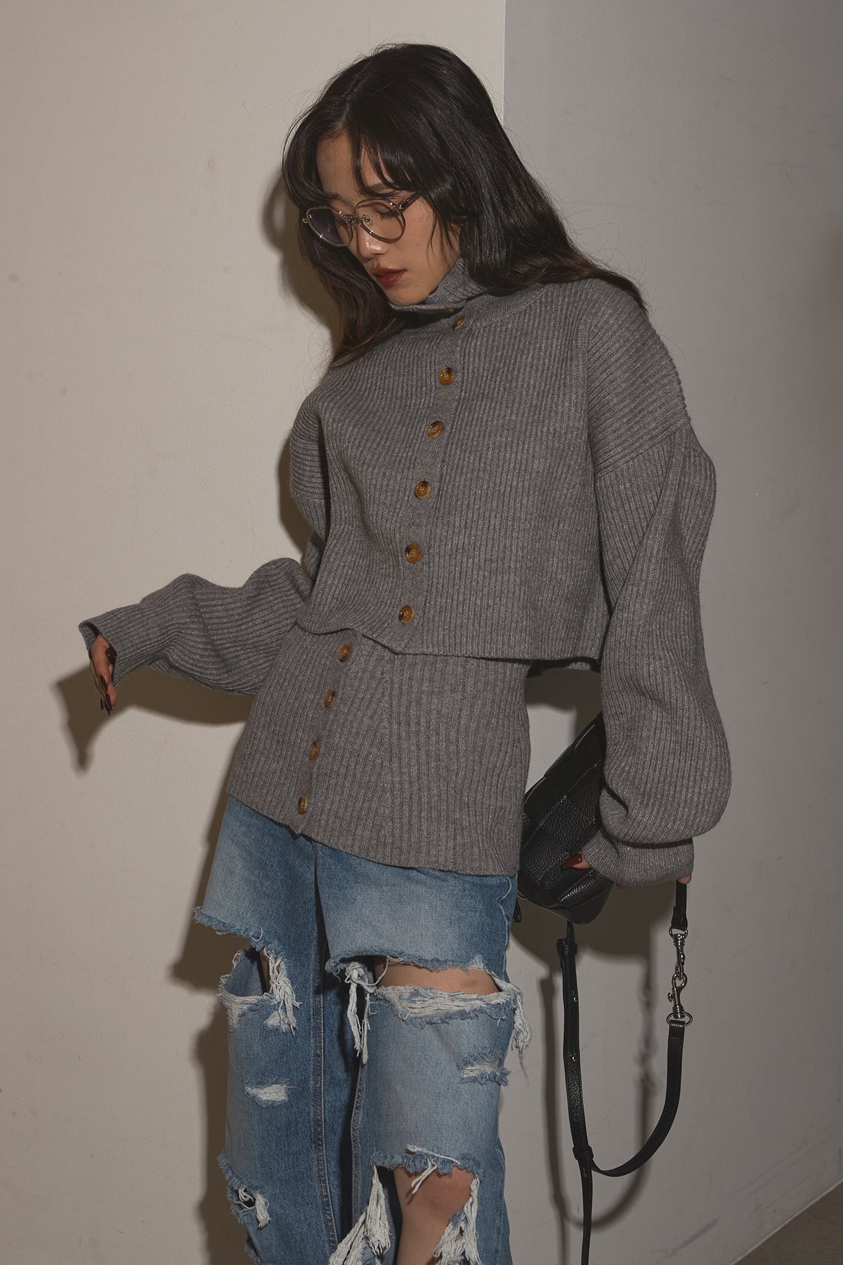 【SET】2Wayレイヤーニット+クラッシュワイドデニムパンツ