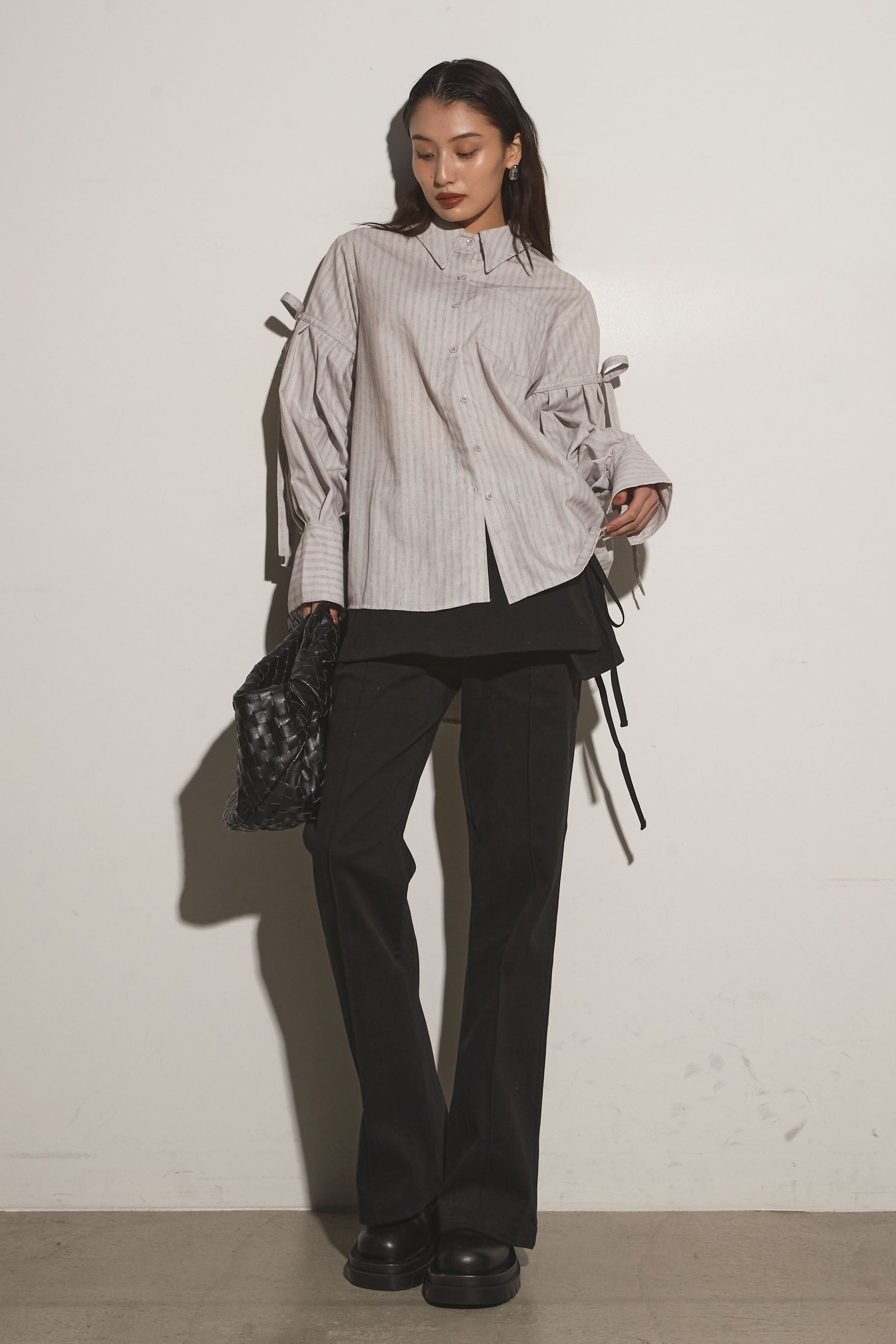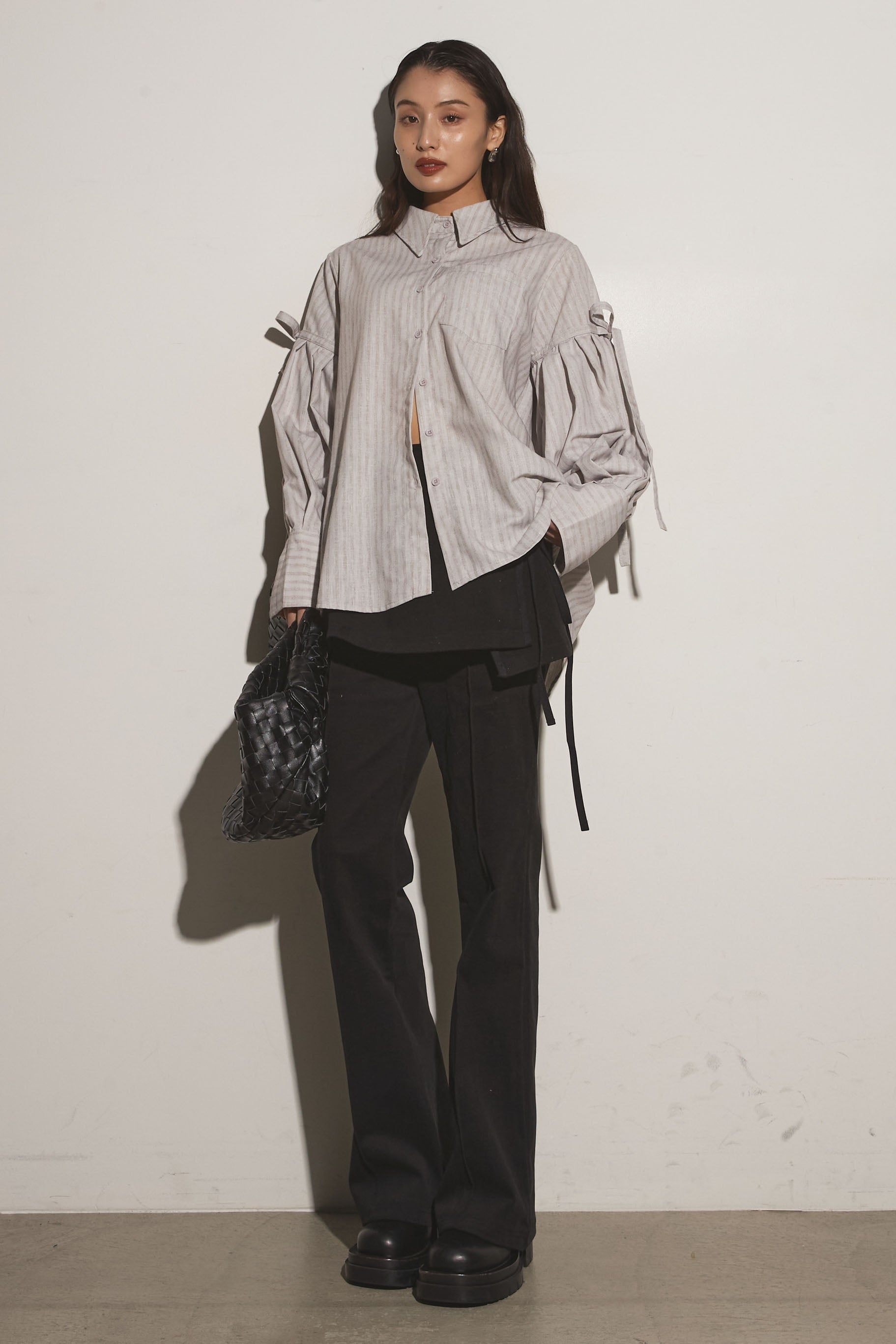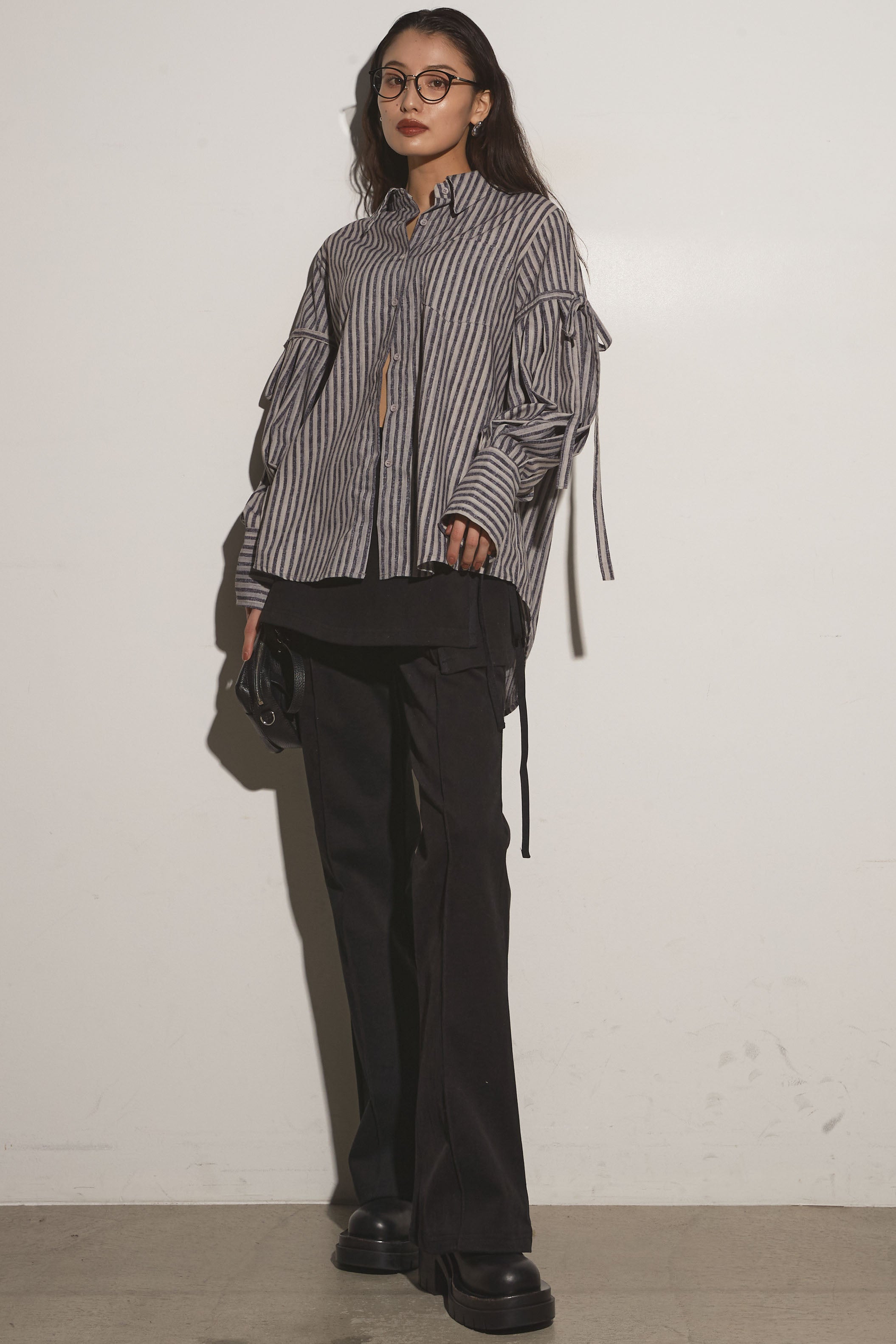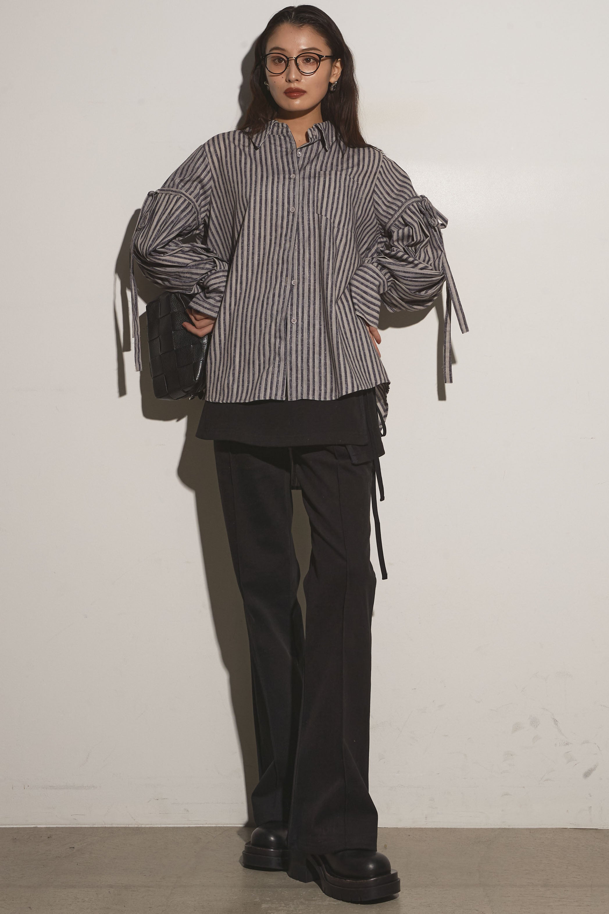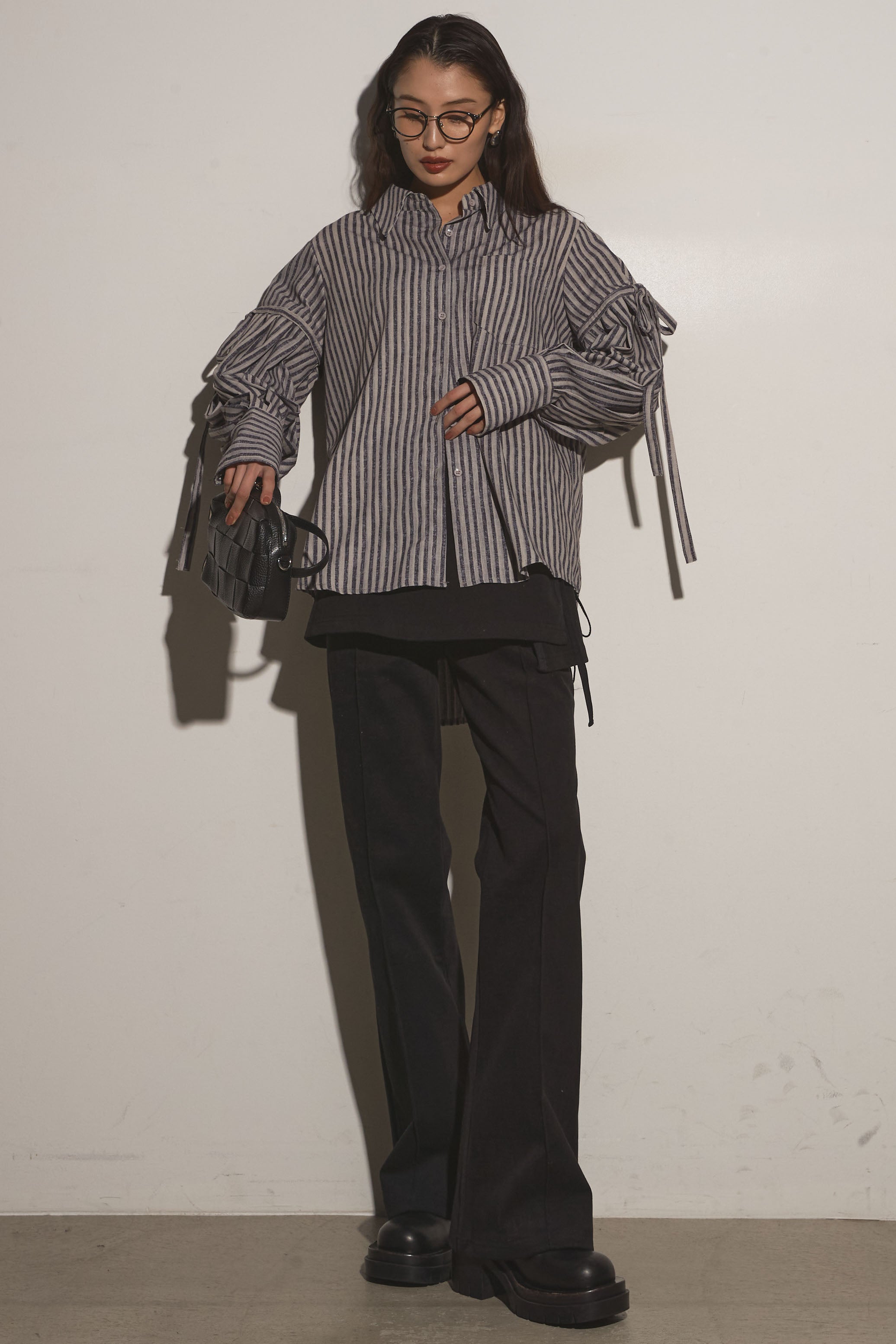 【SET】ストライプリボンスリーブシャツ+ラップスカートフレアパンツ