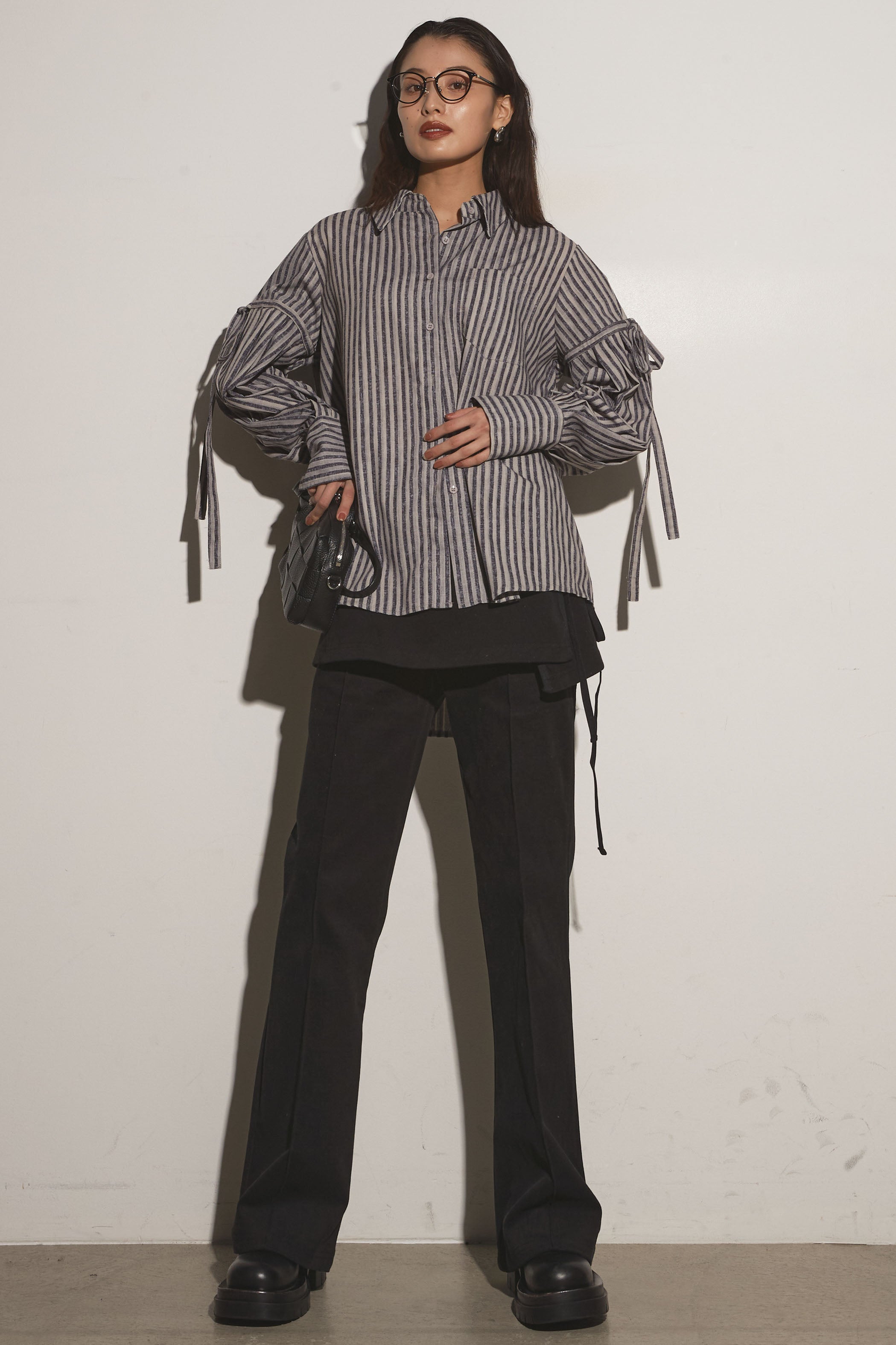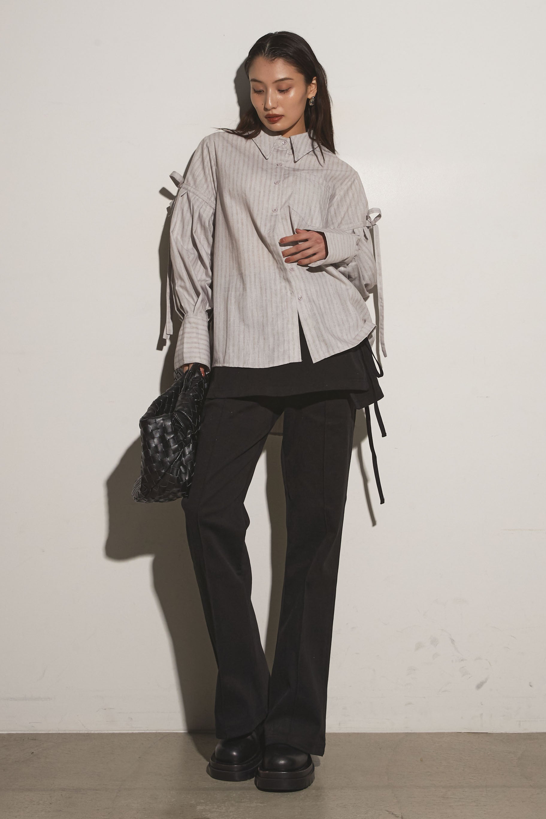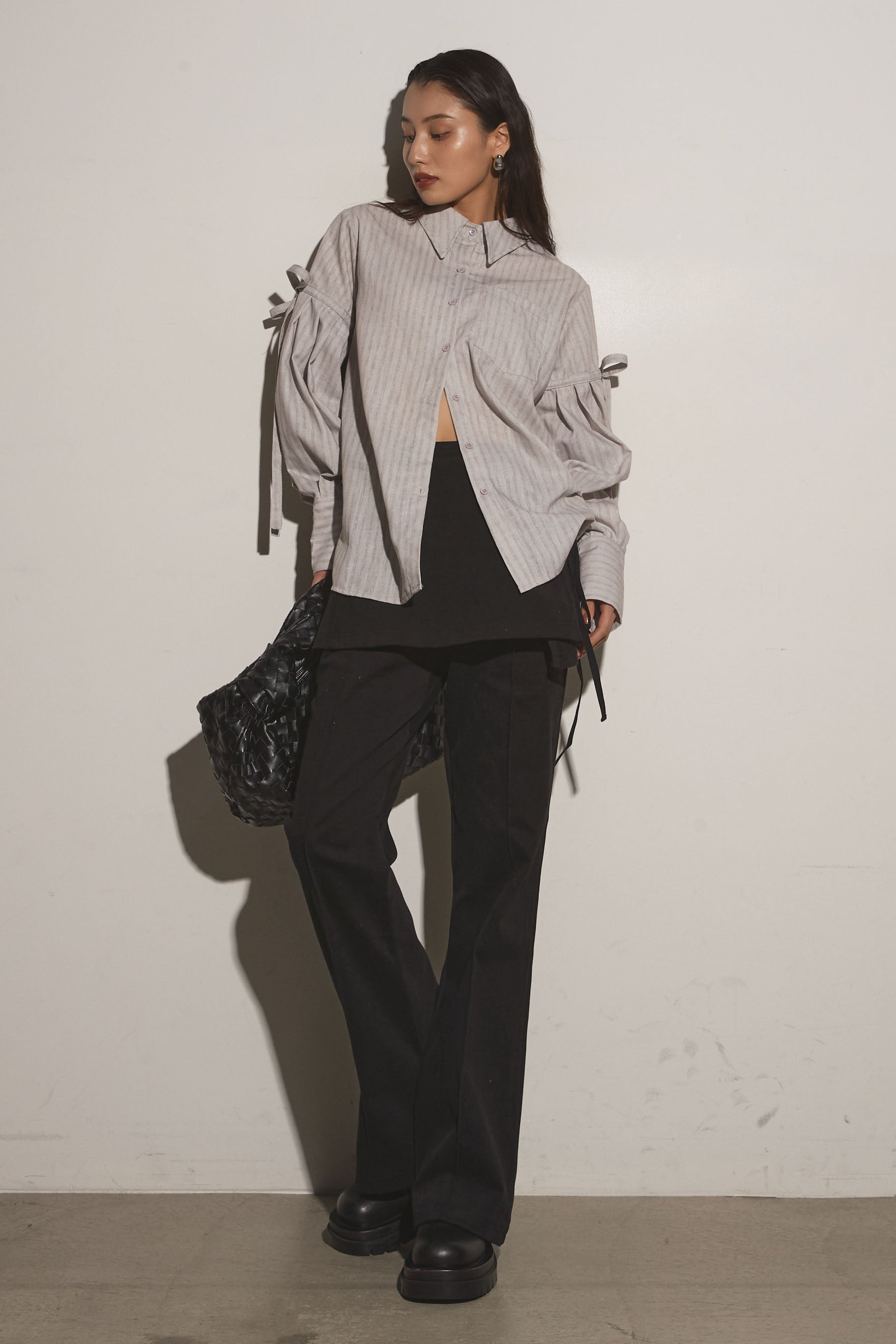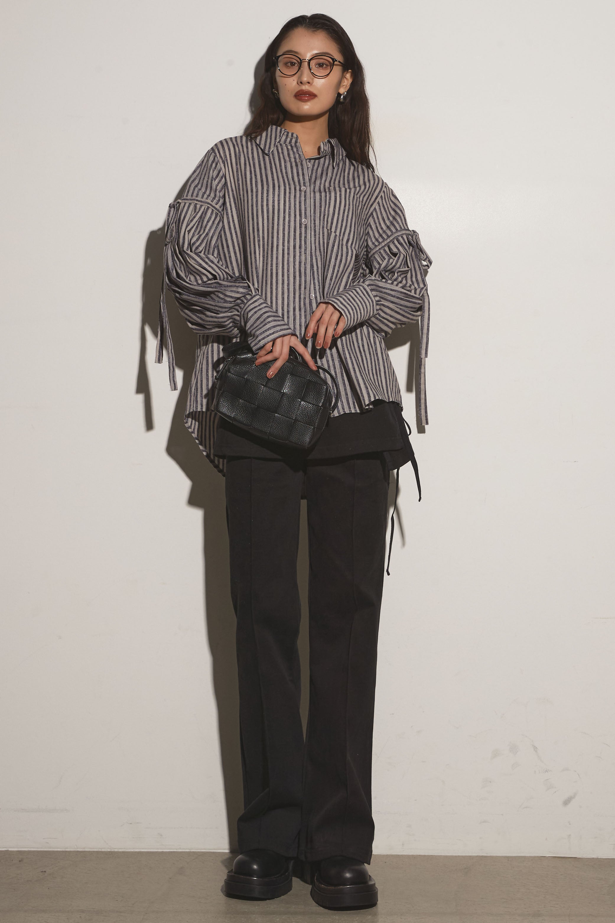 【SET】ストライプリボンスリーブシャツ+ラップスカートフレアパンツ