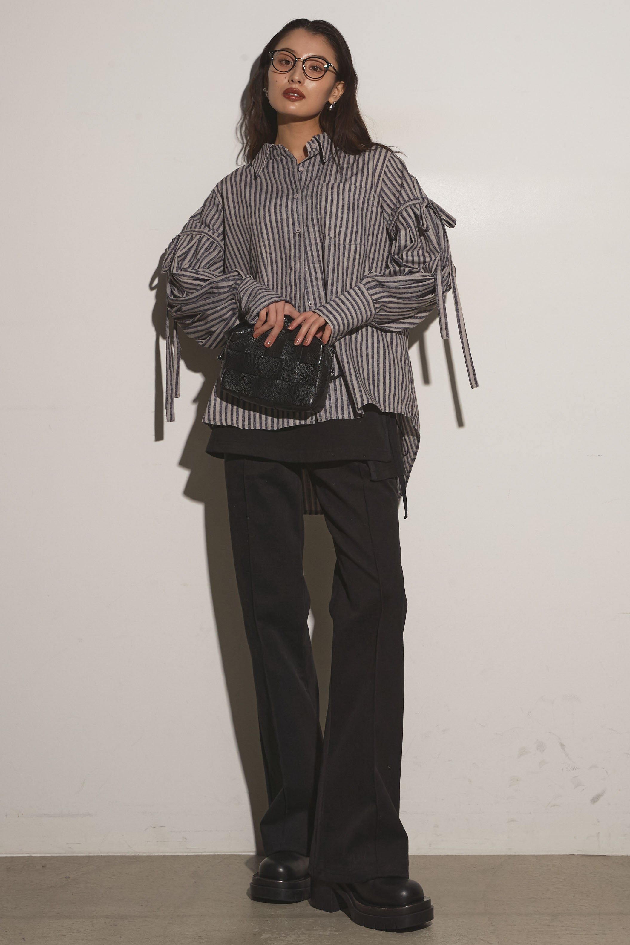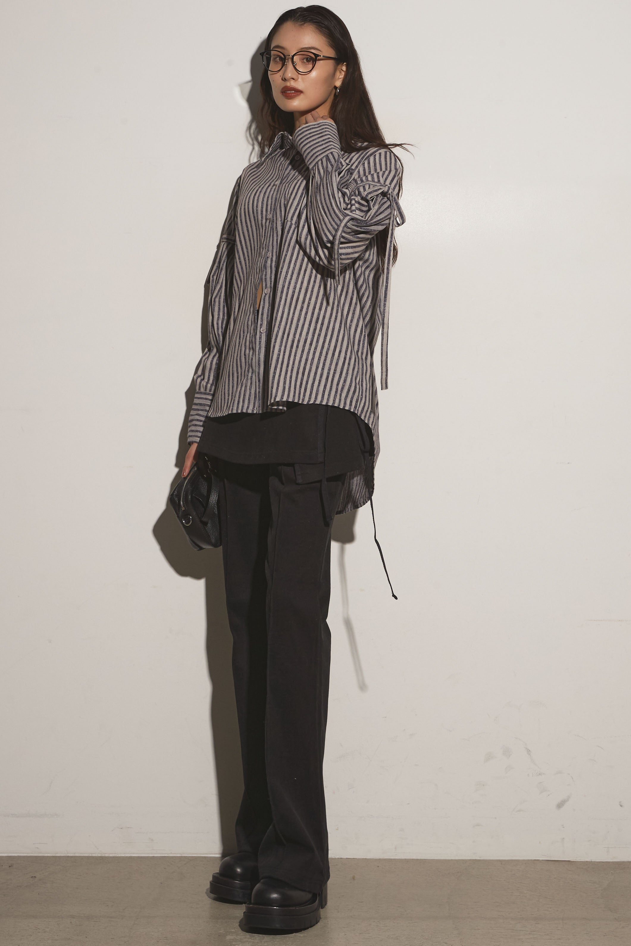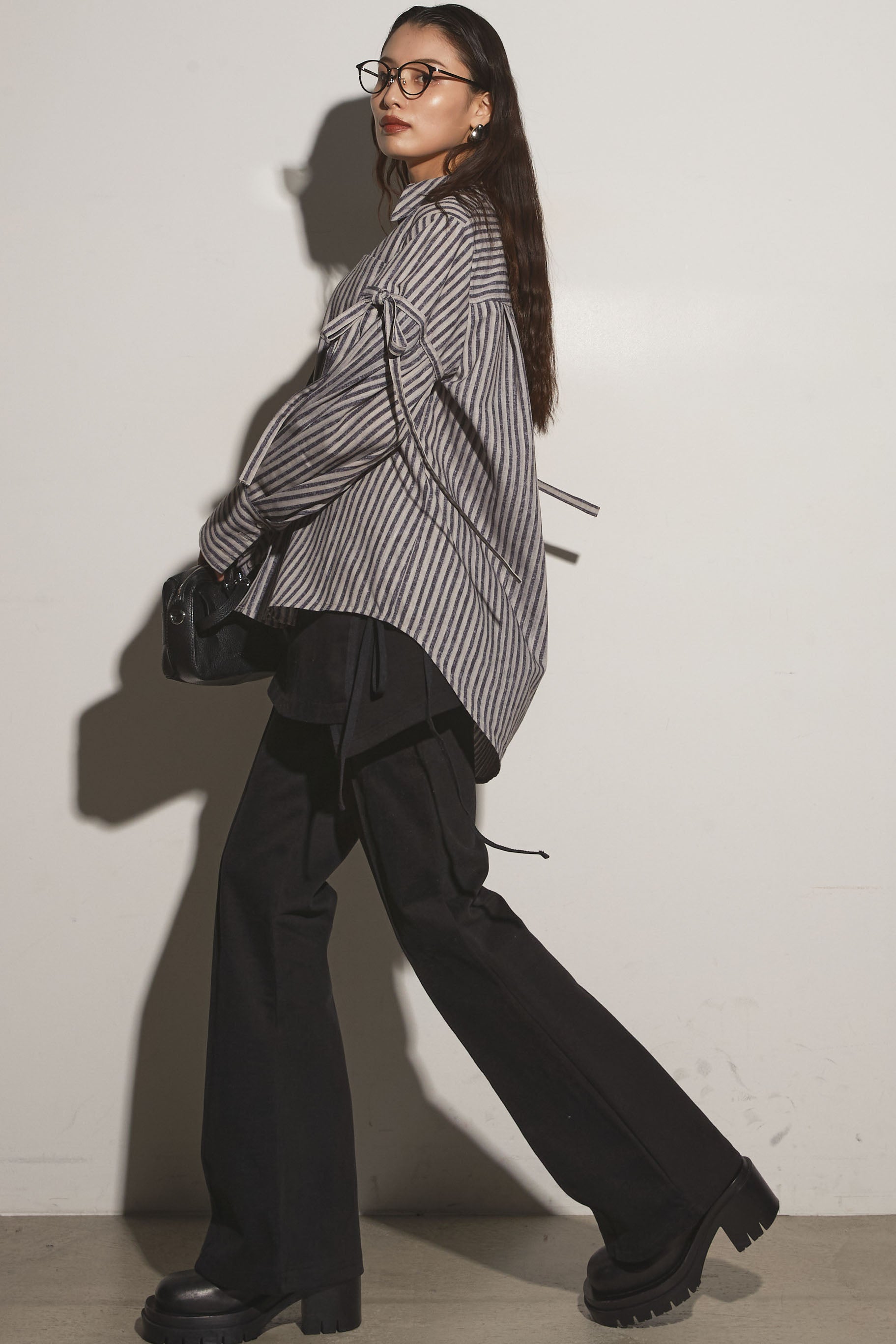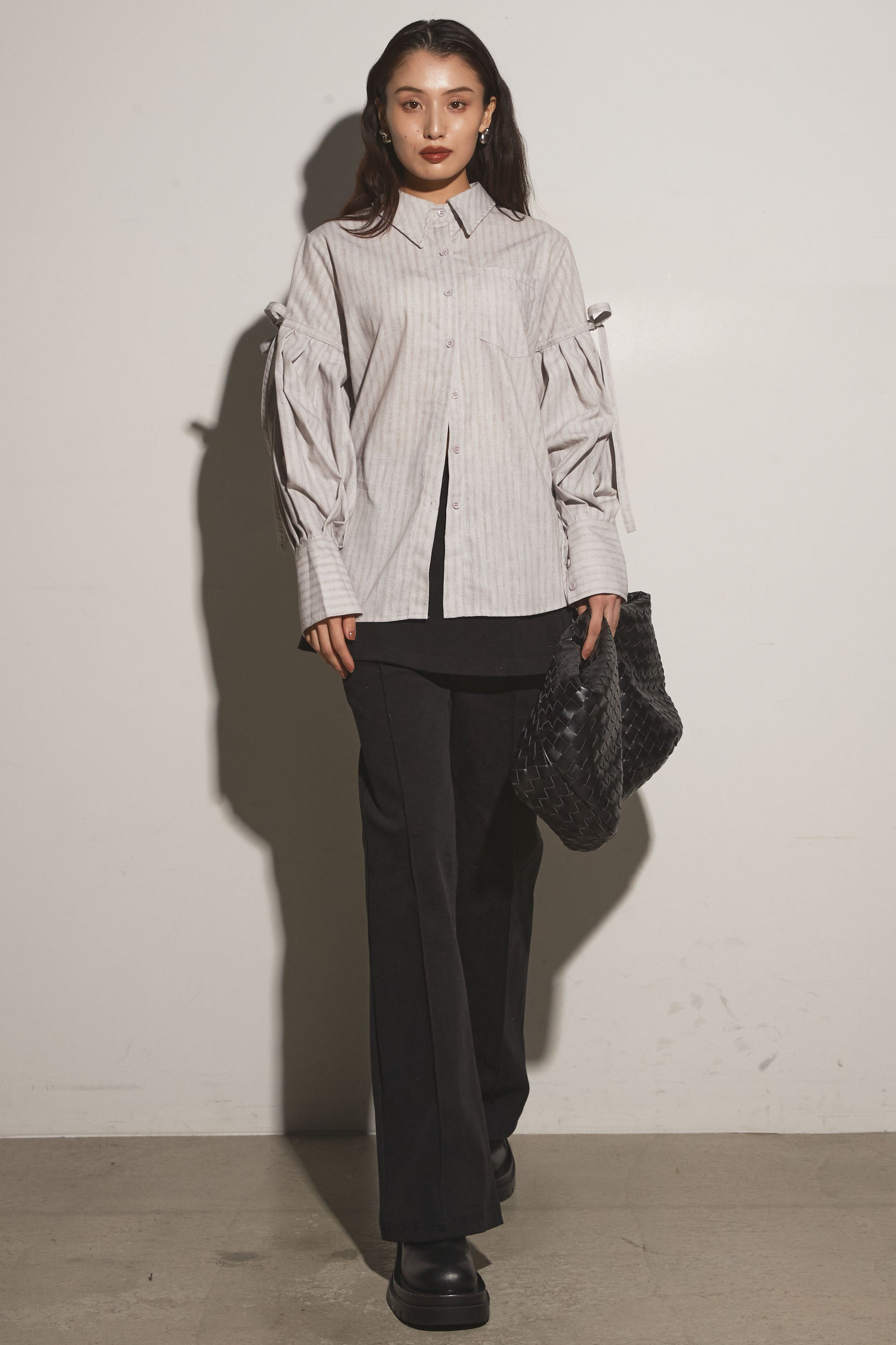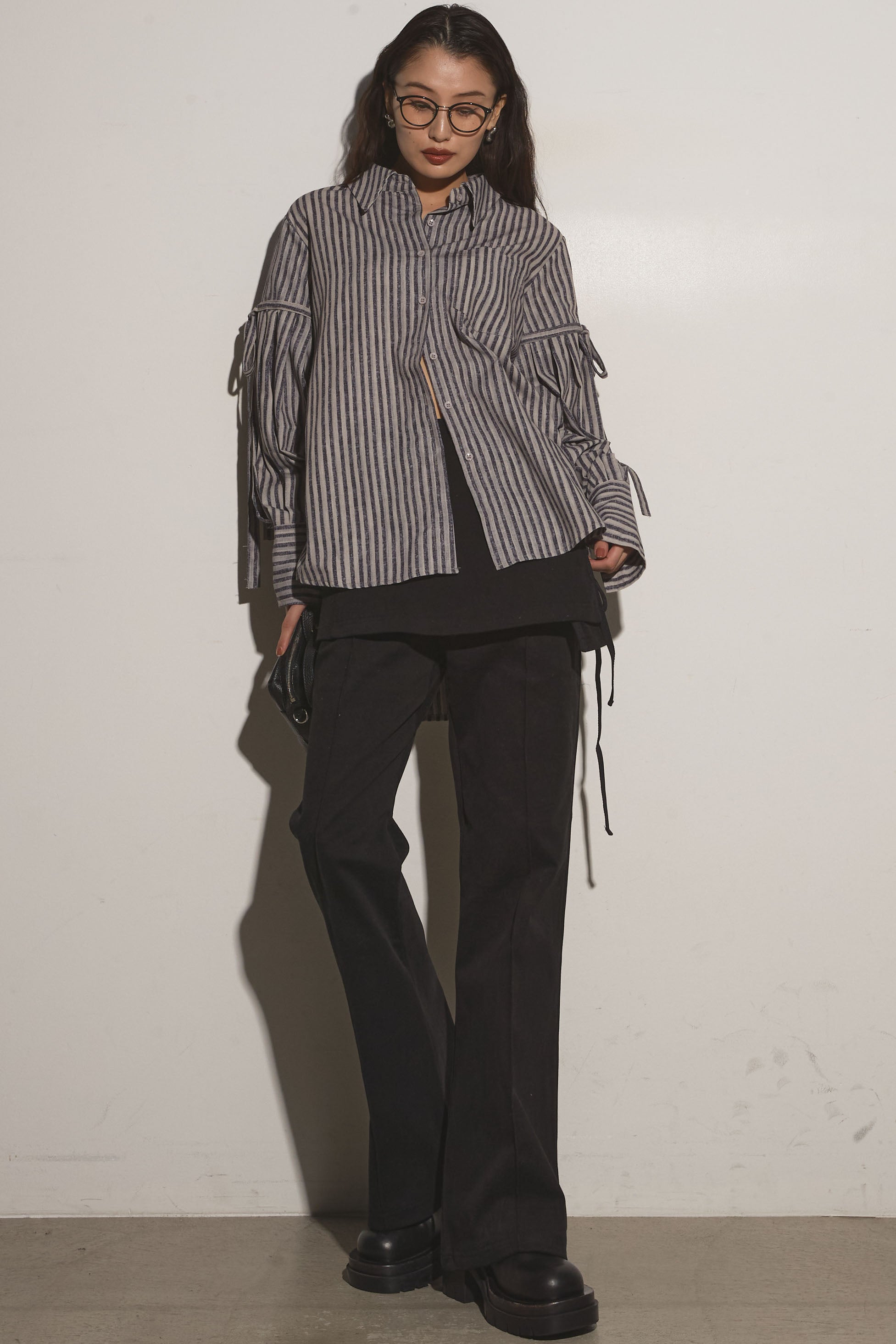 【SET】ストライプリボンスリーブシャツ+ラップスカートフレアパンツ