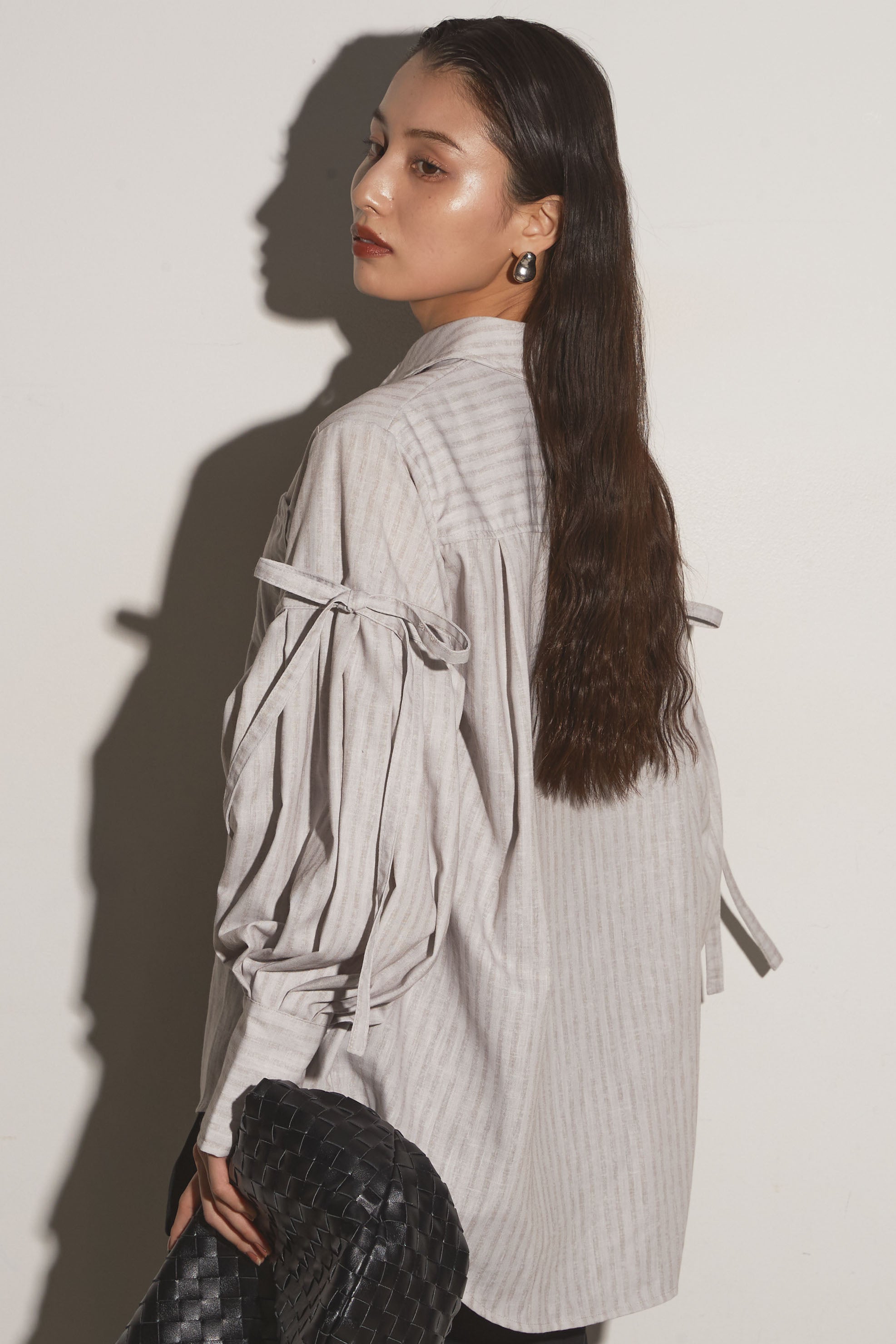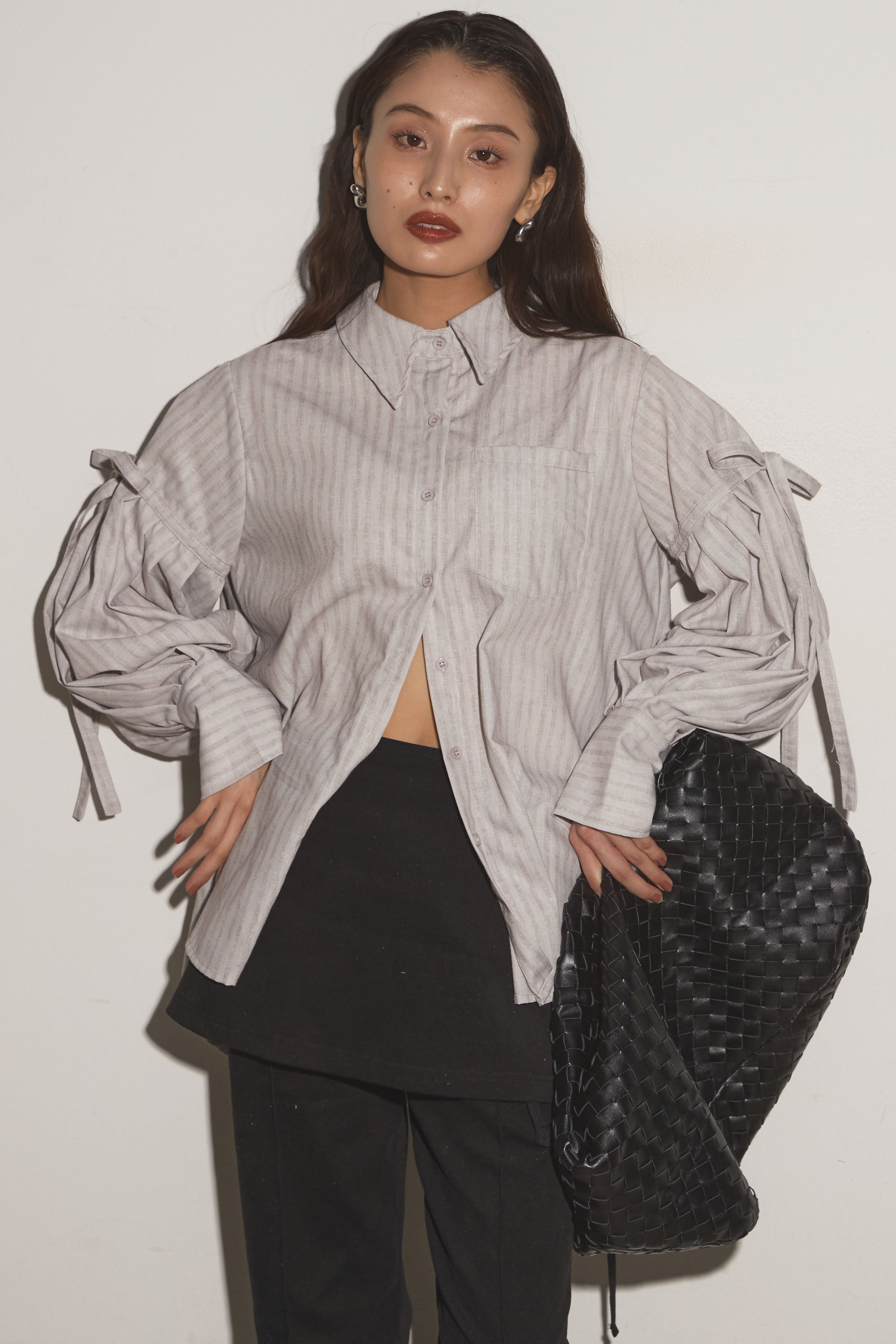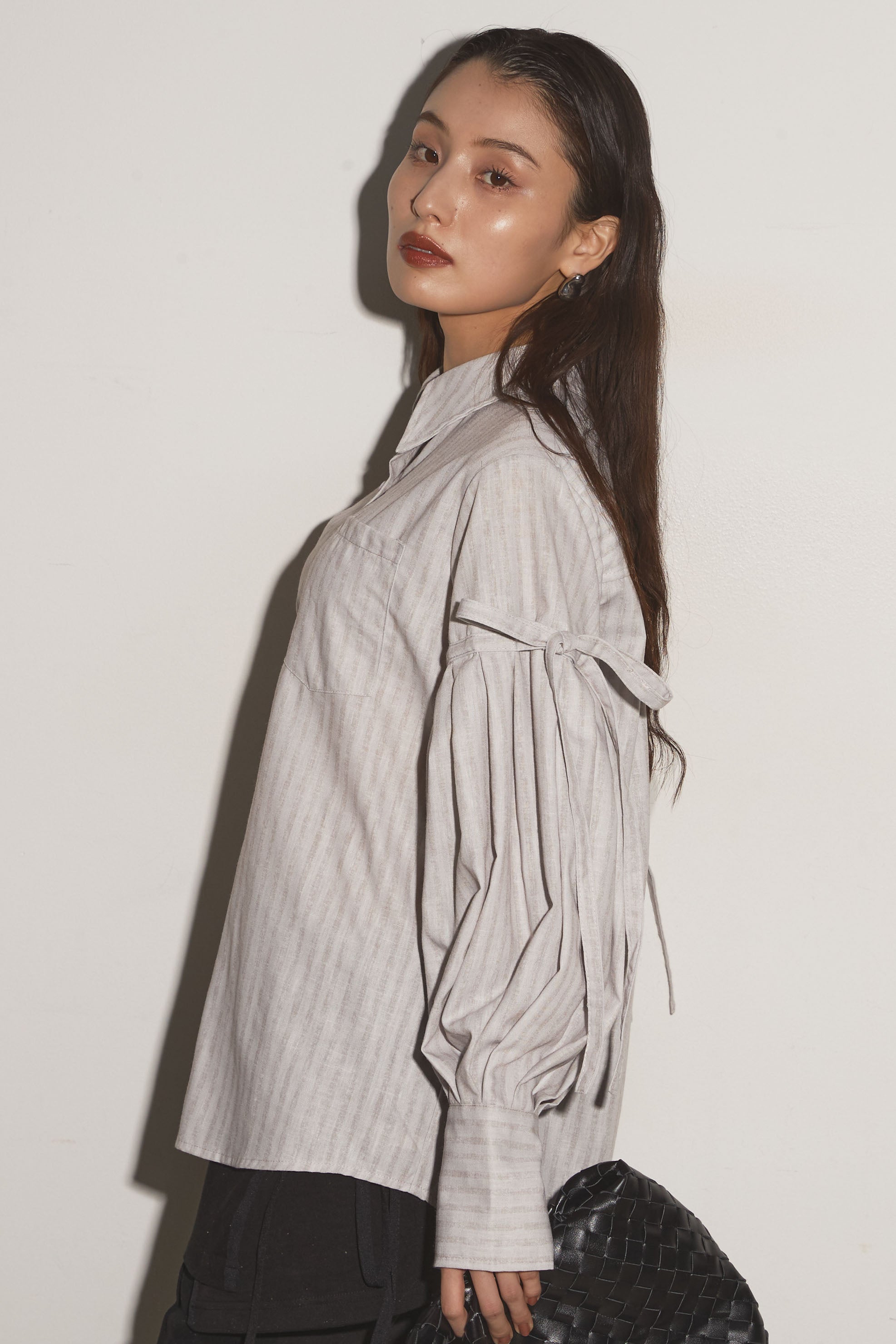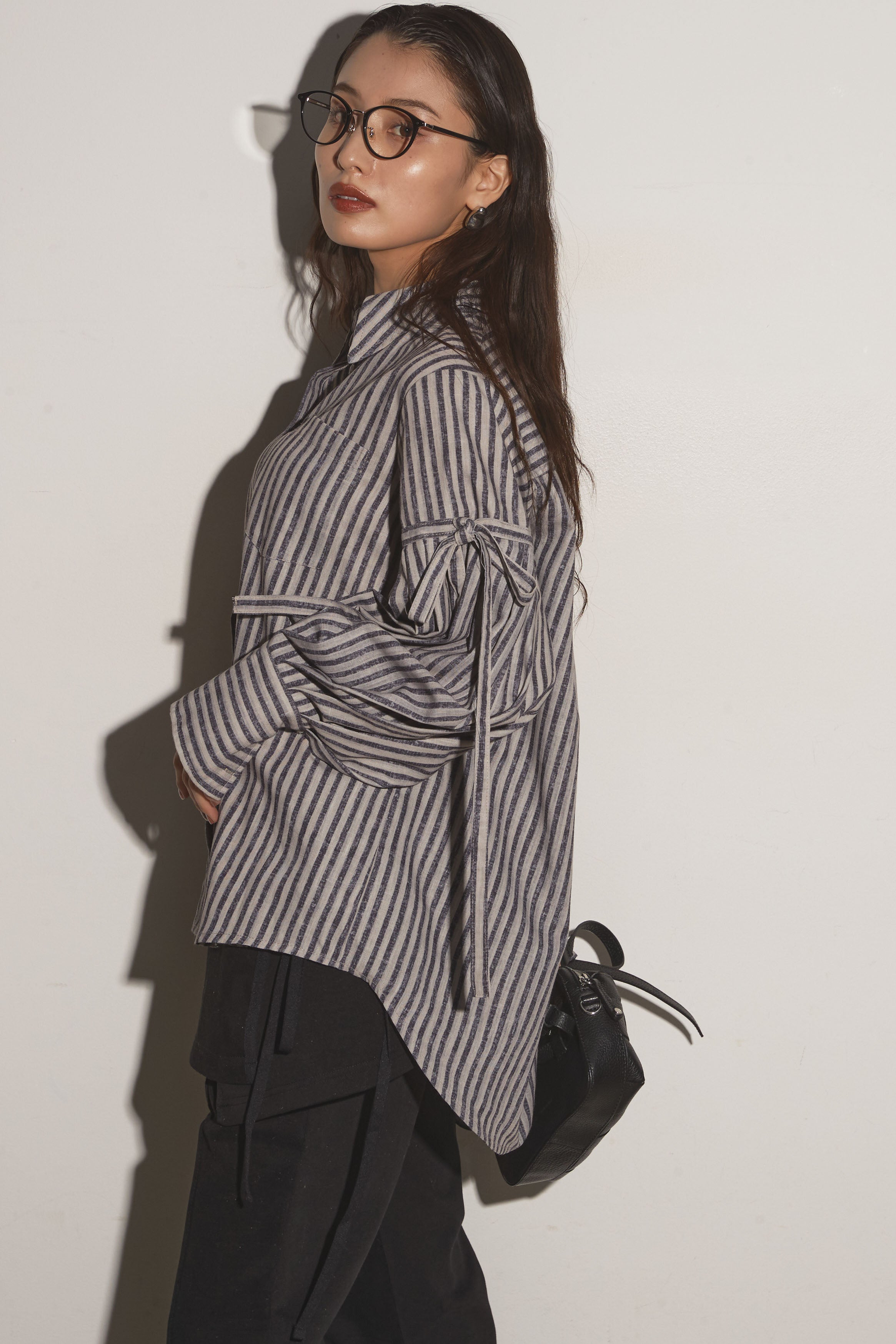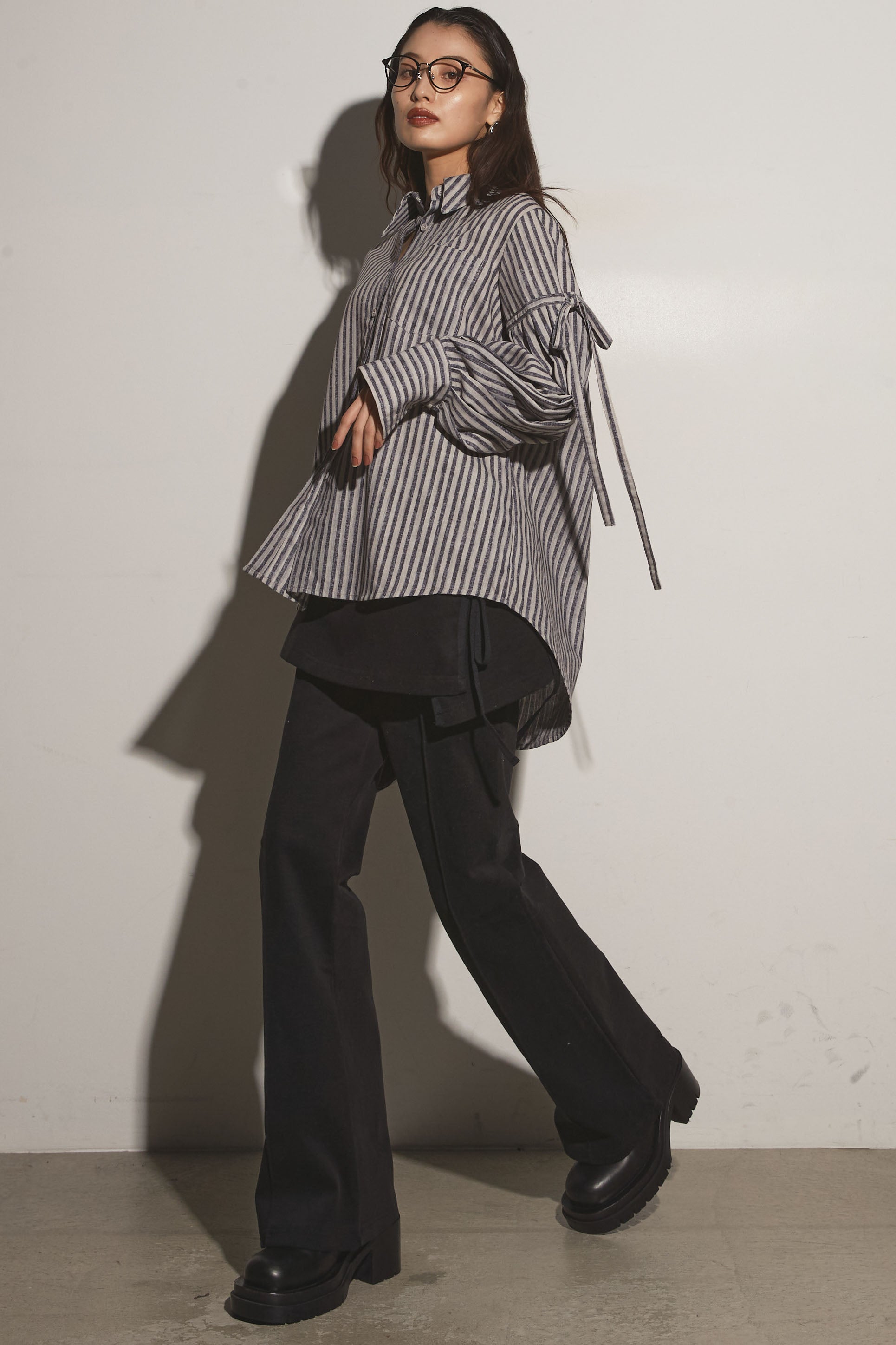 【SET】ストライプリボンスリーブシャツ+ラップスカートフレアパンツ