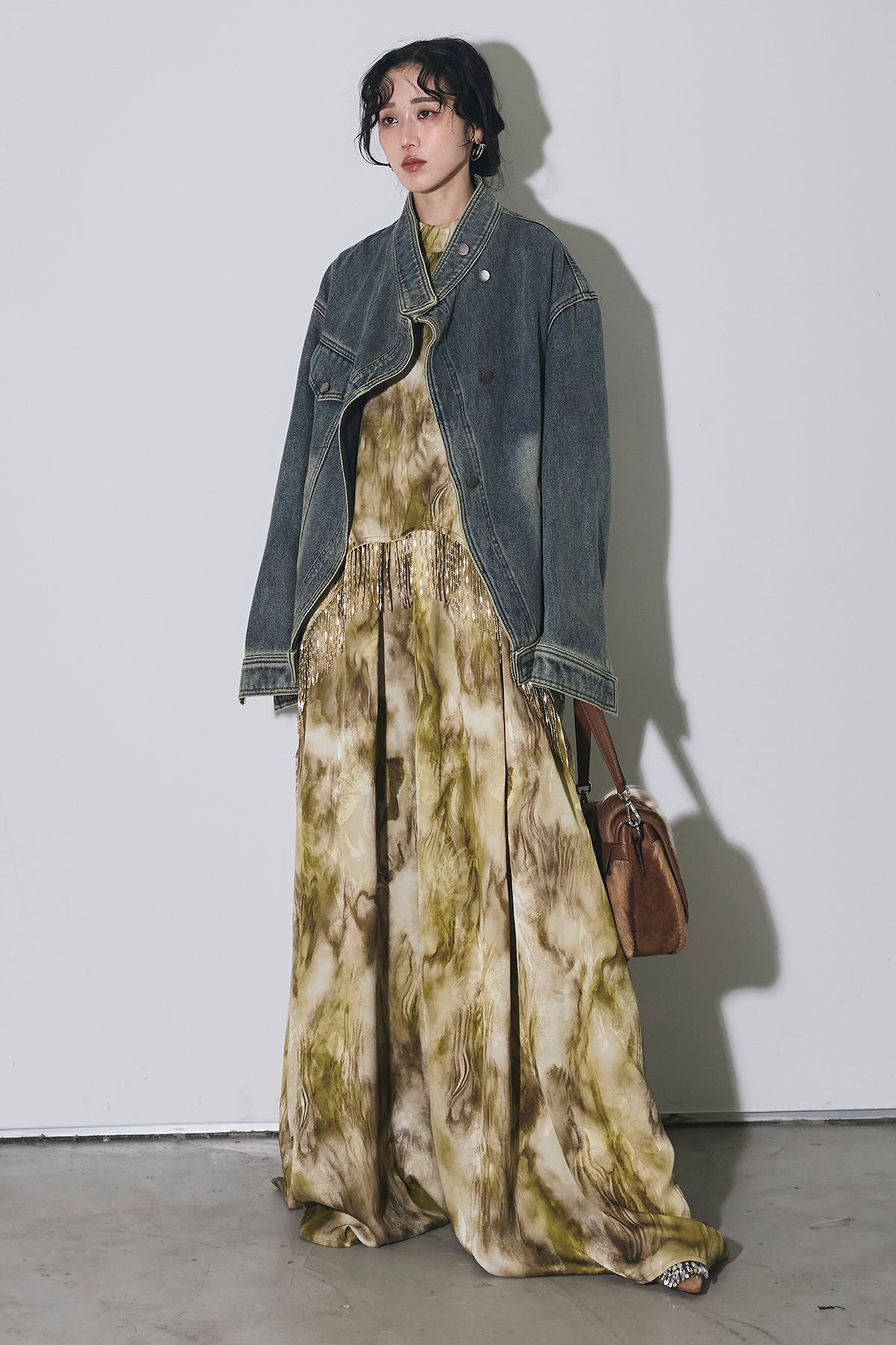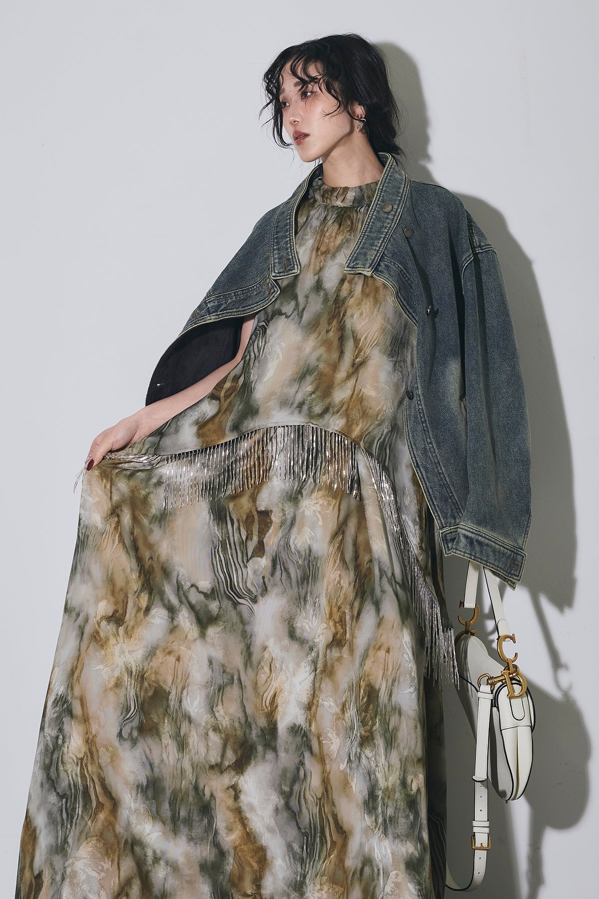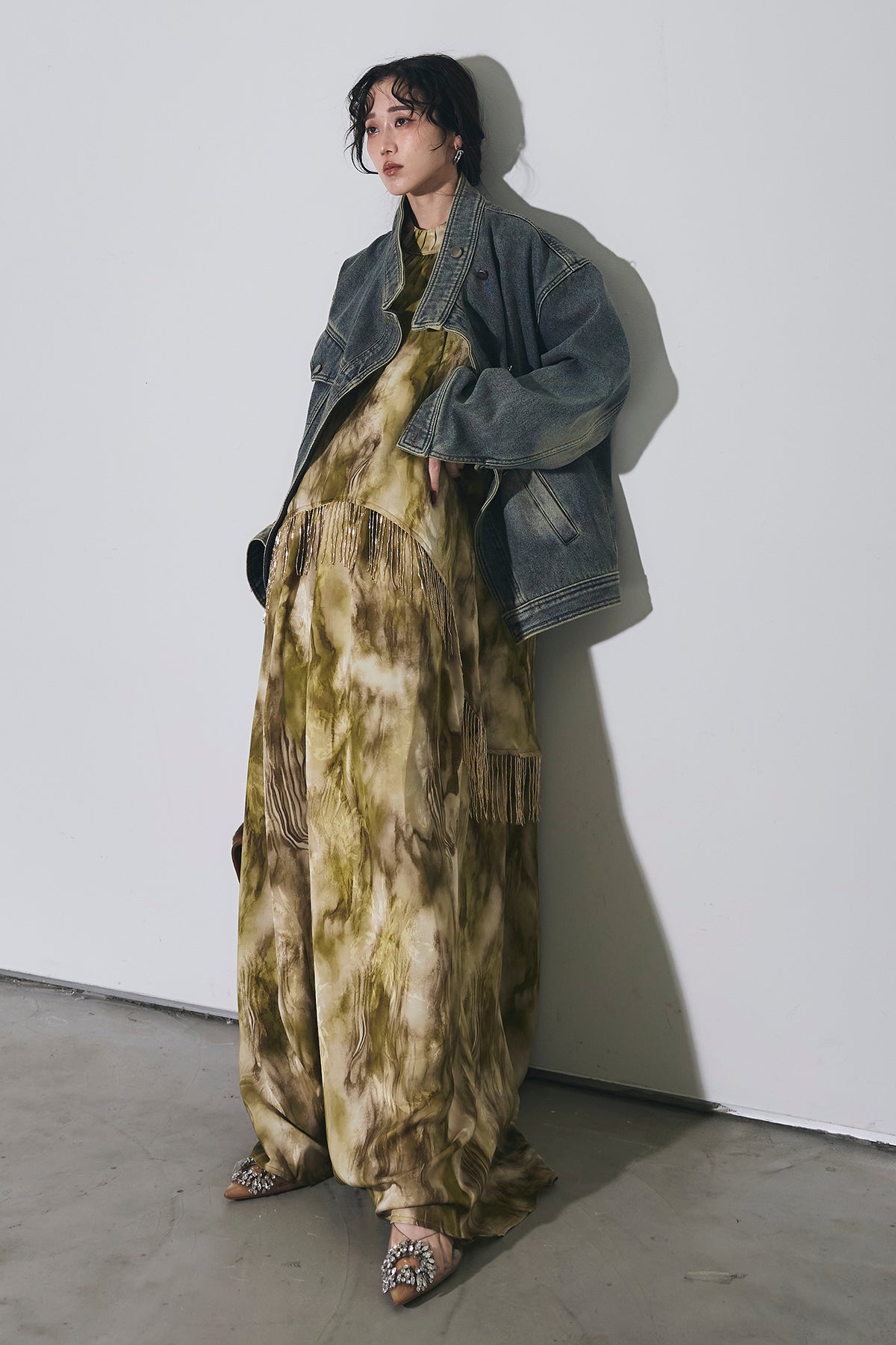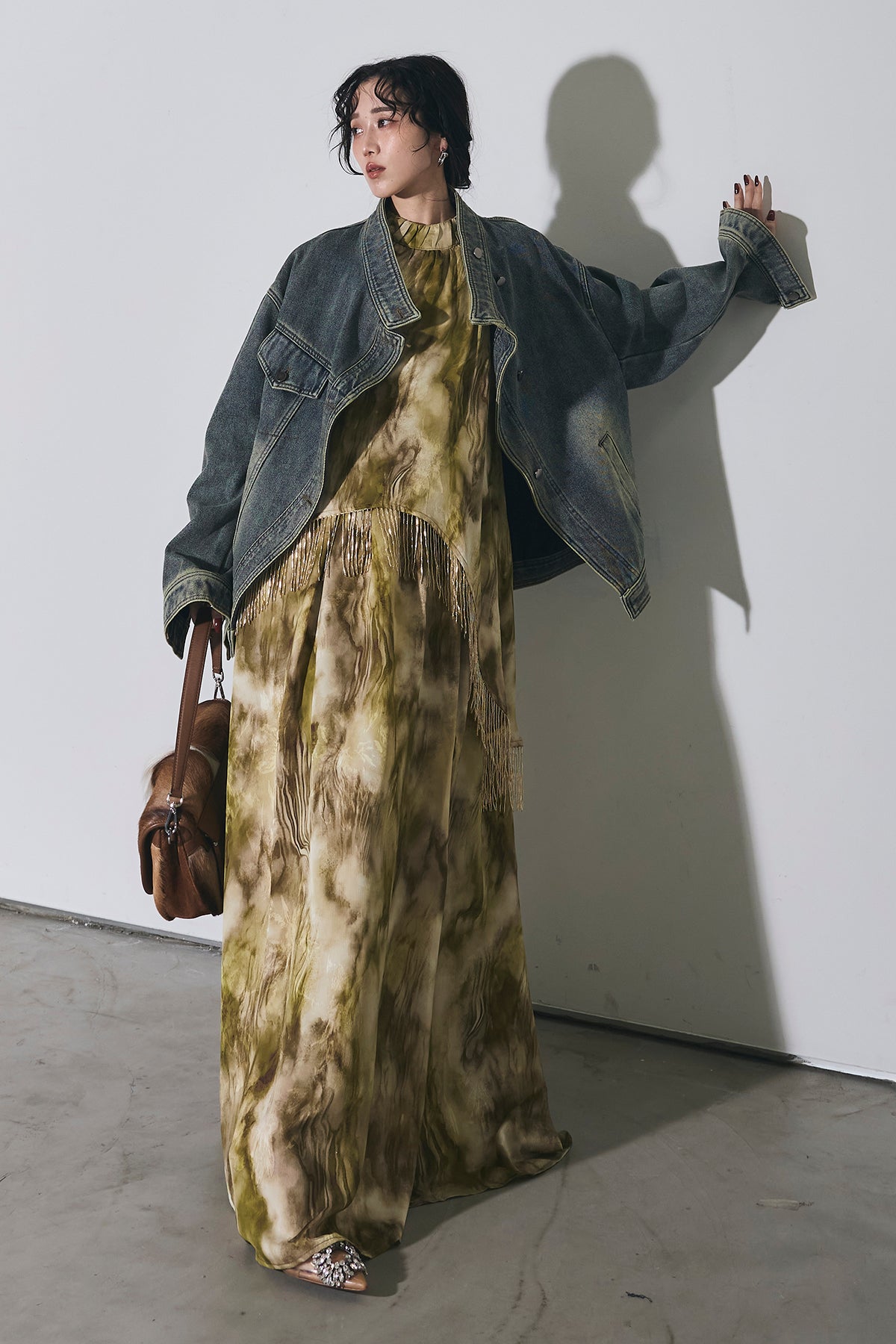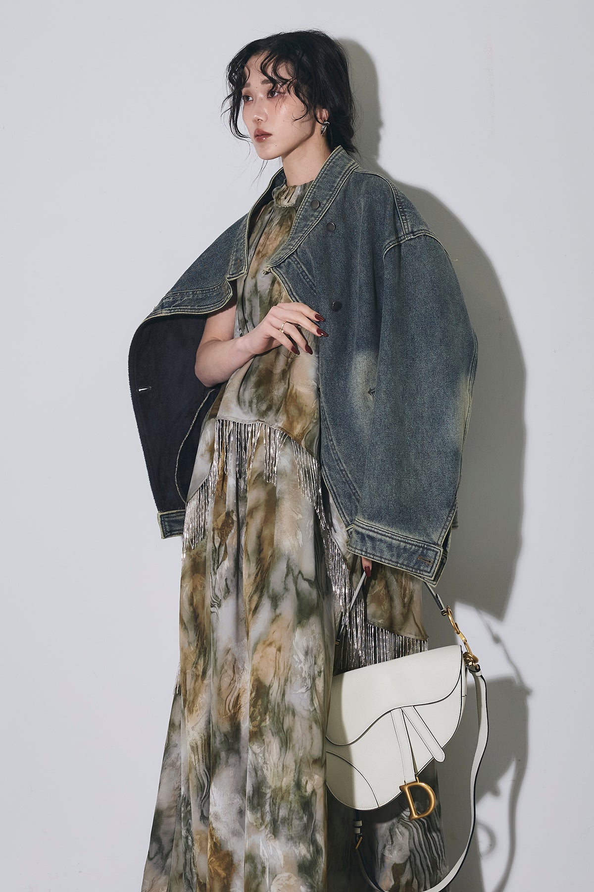 【SET】タイダイフリンジアートワンピース+スタンドカラーデニムジャケット