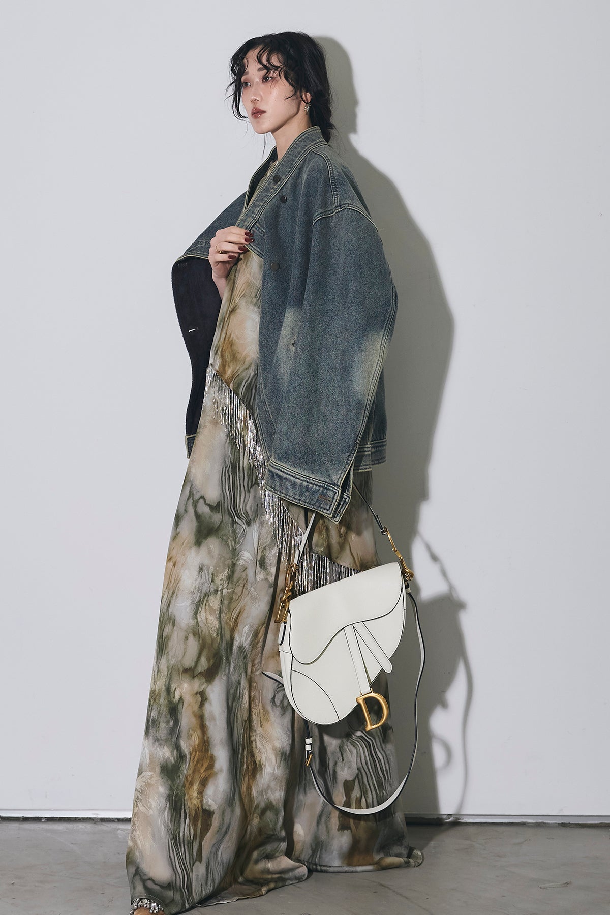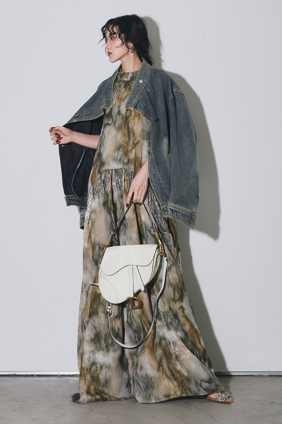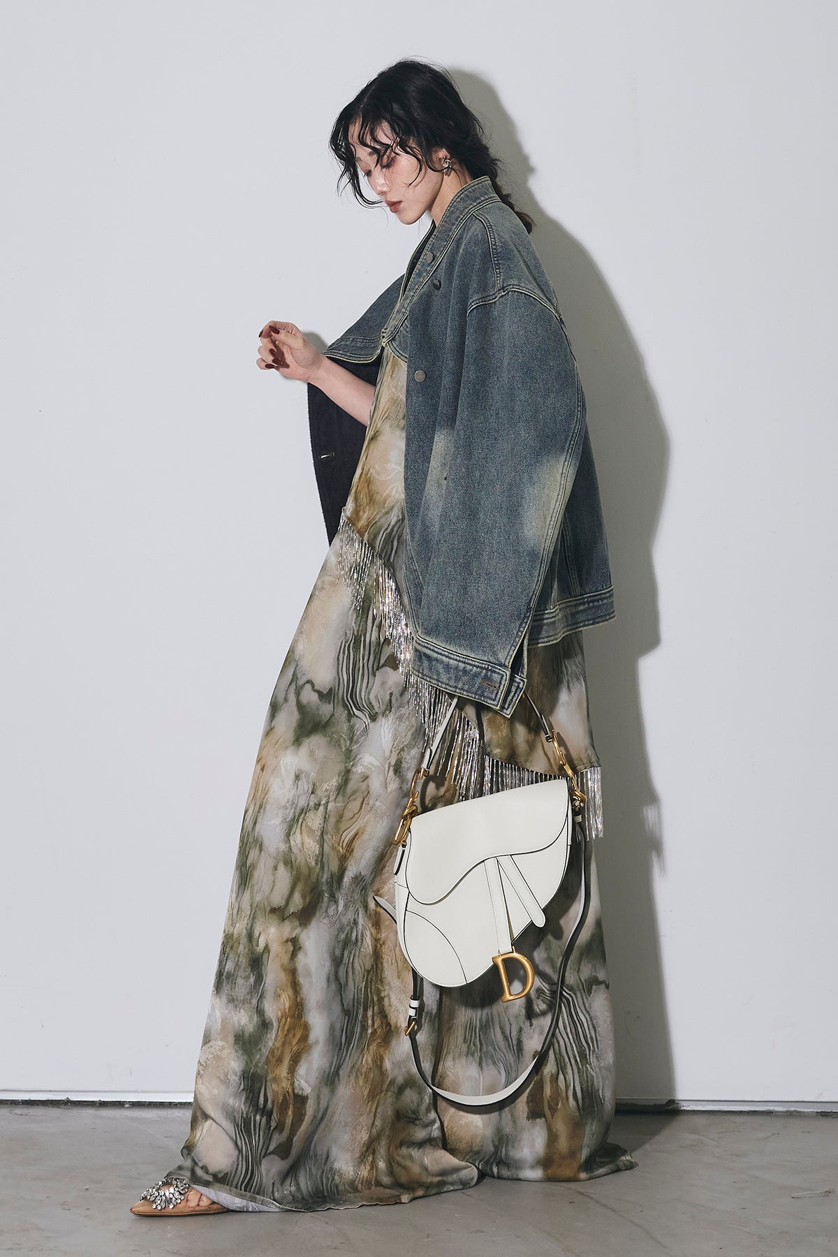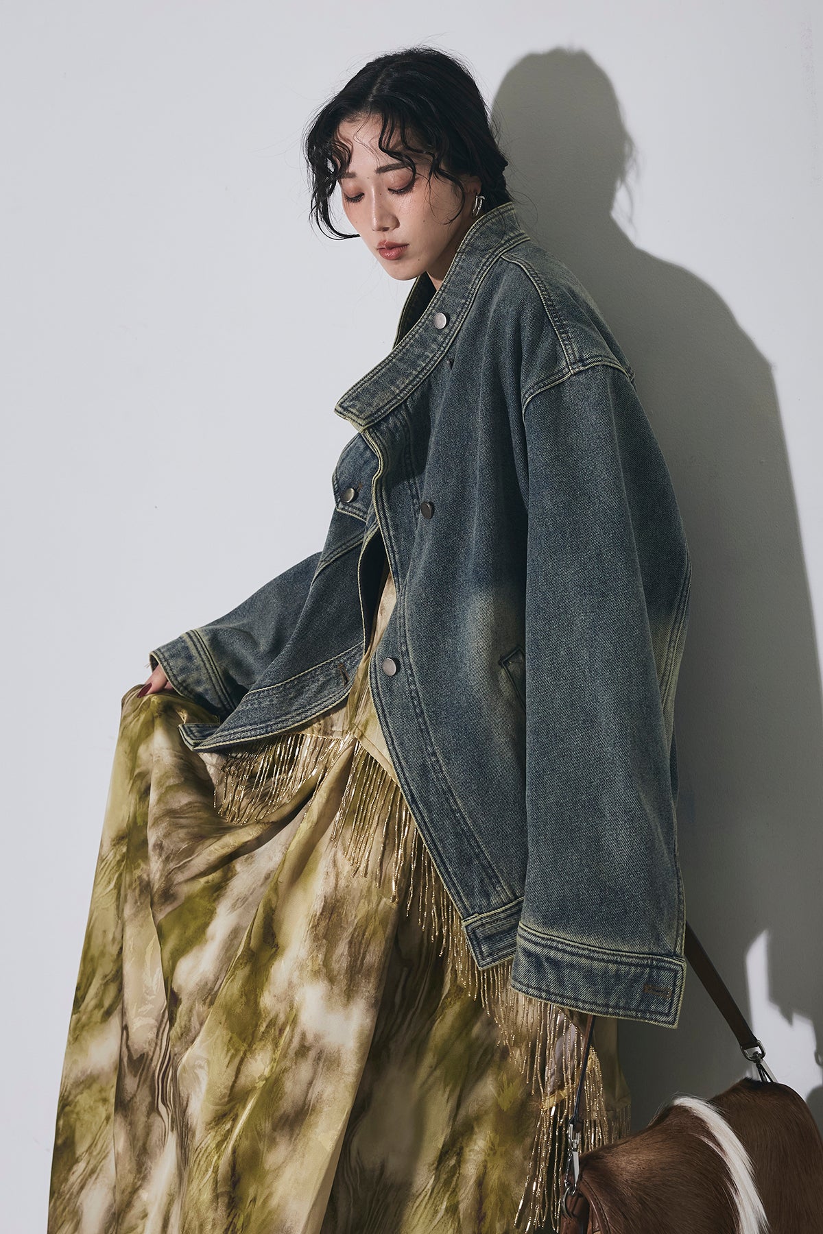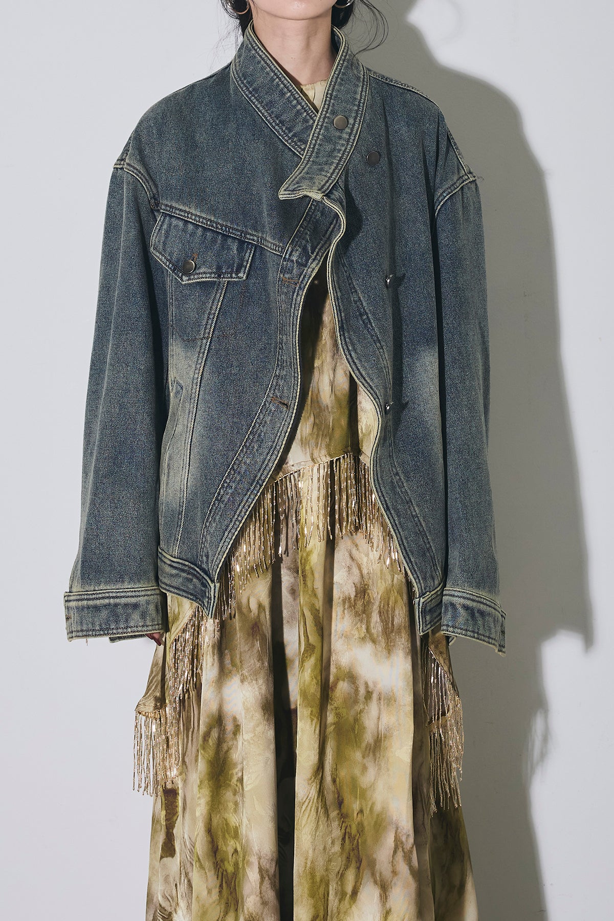 【SET】タイダイフリンジアートワンピース+スタンドカラーデニムジャケット