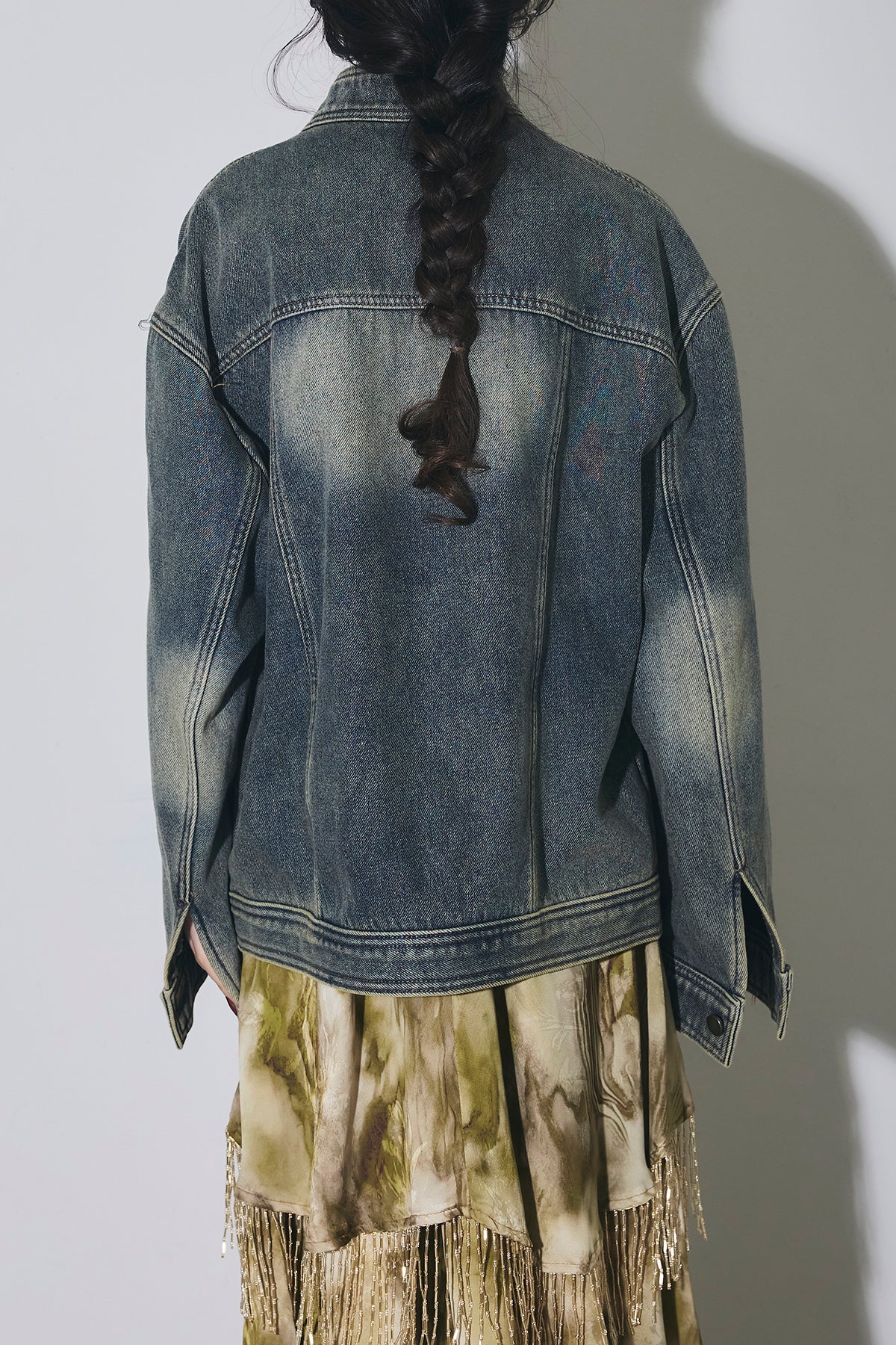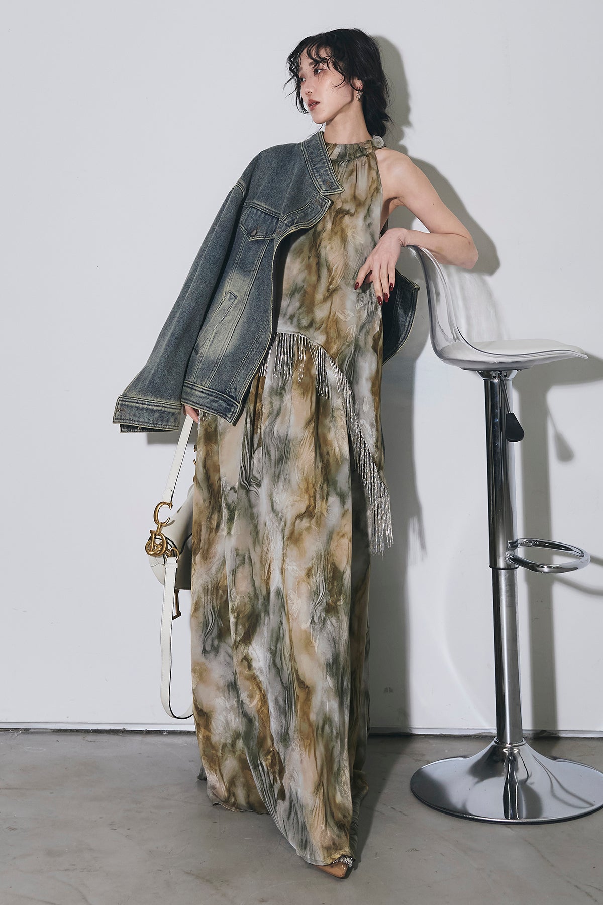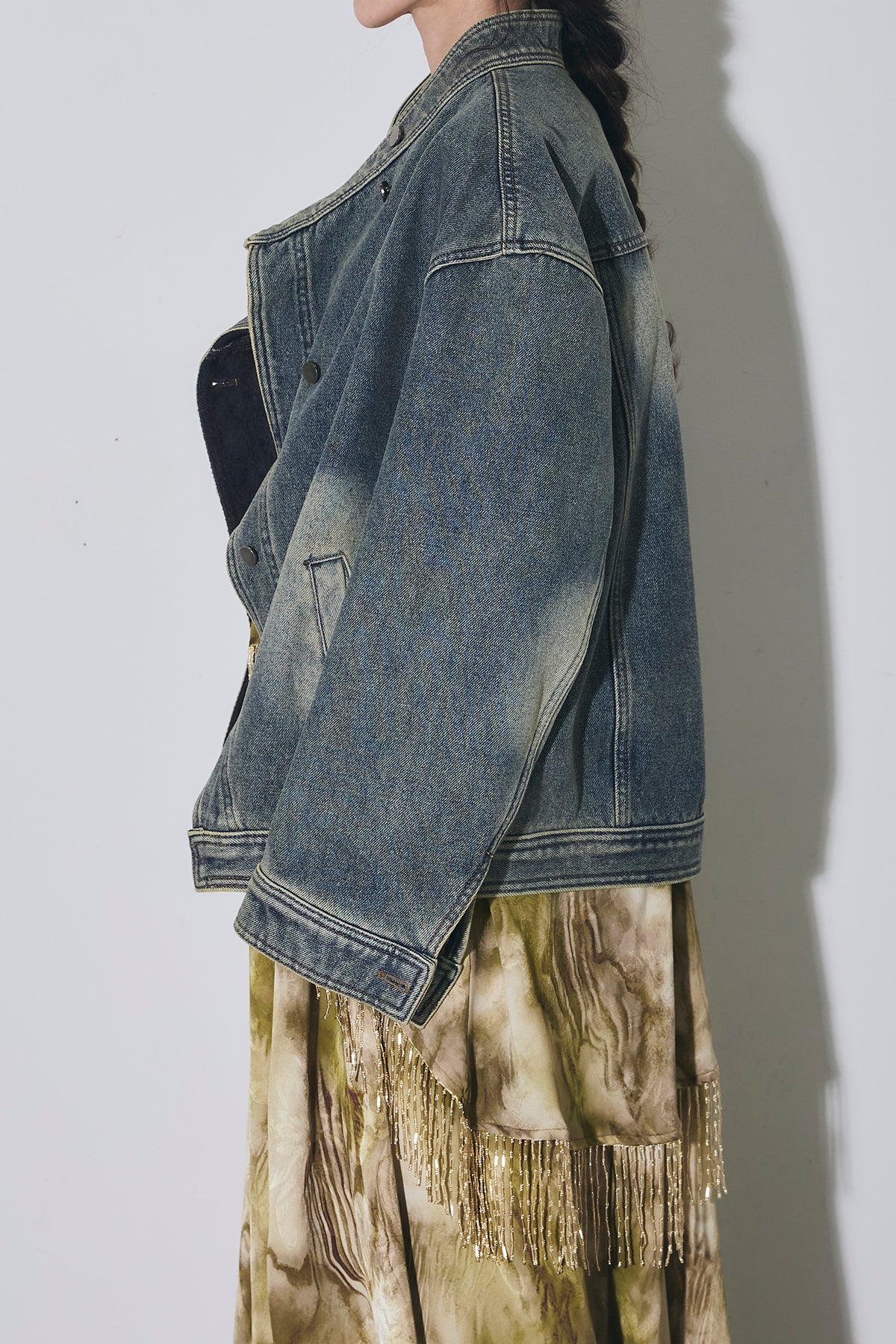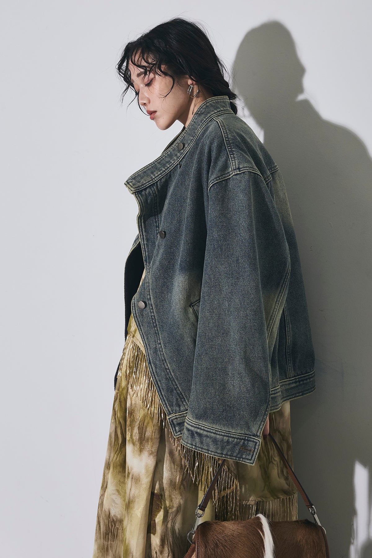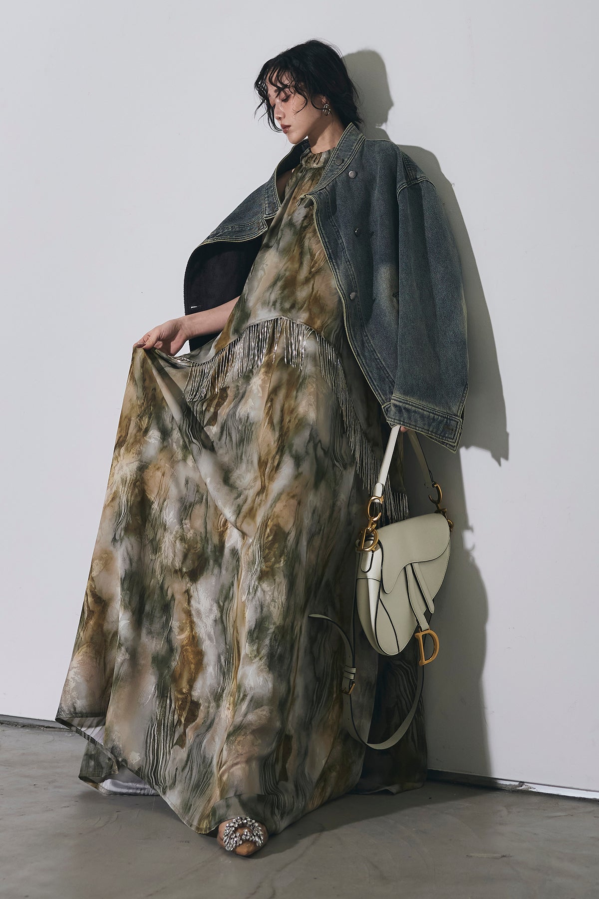 【SET】タイダイフリンジアートワンピース+スタンドカラーデニムジャケット