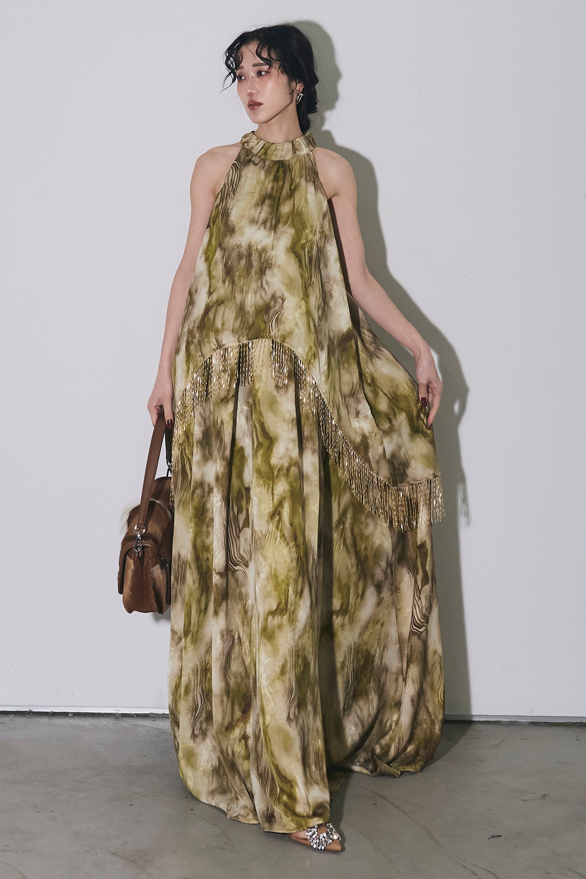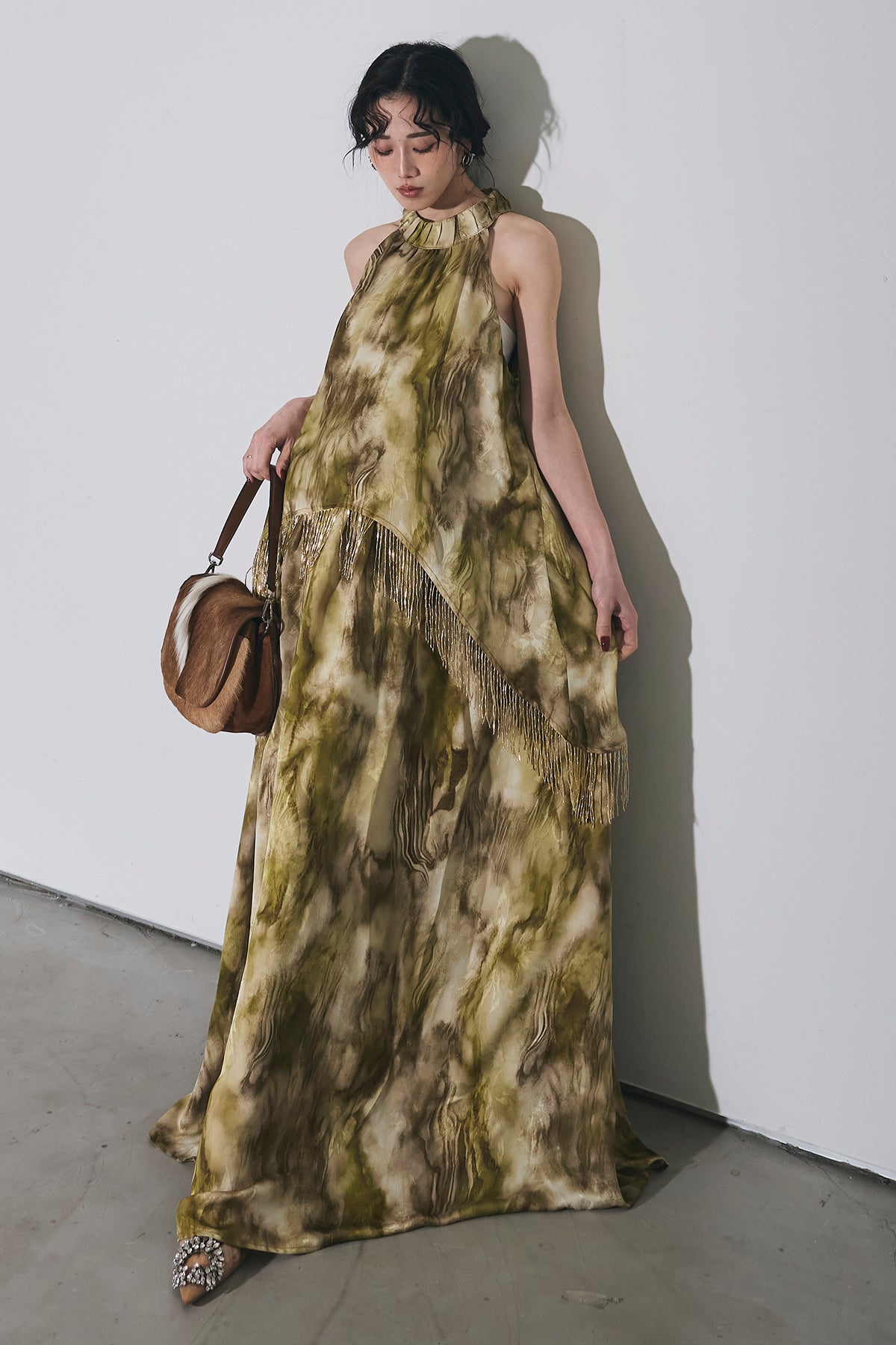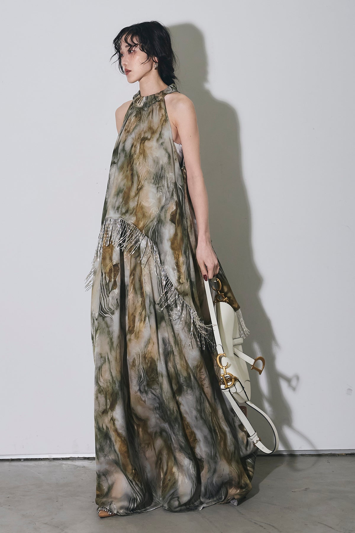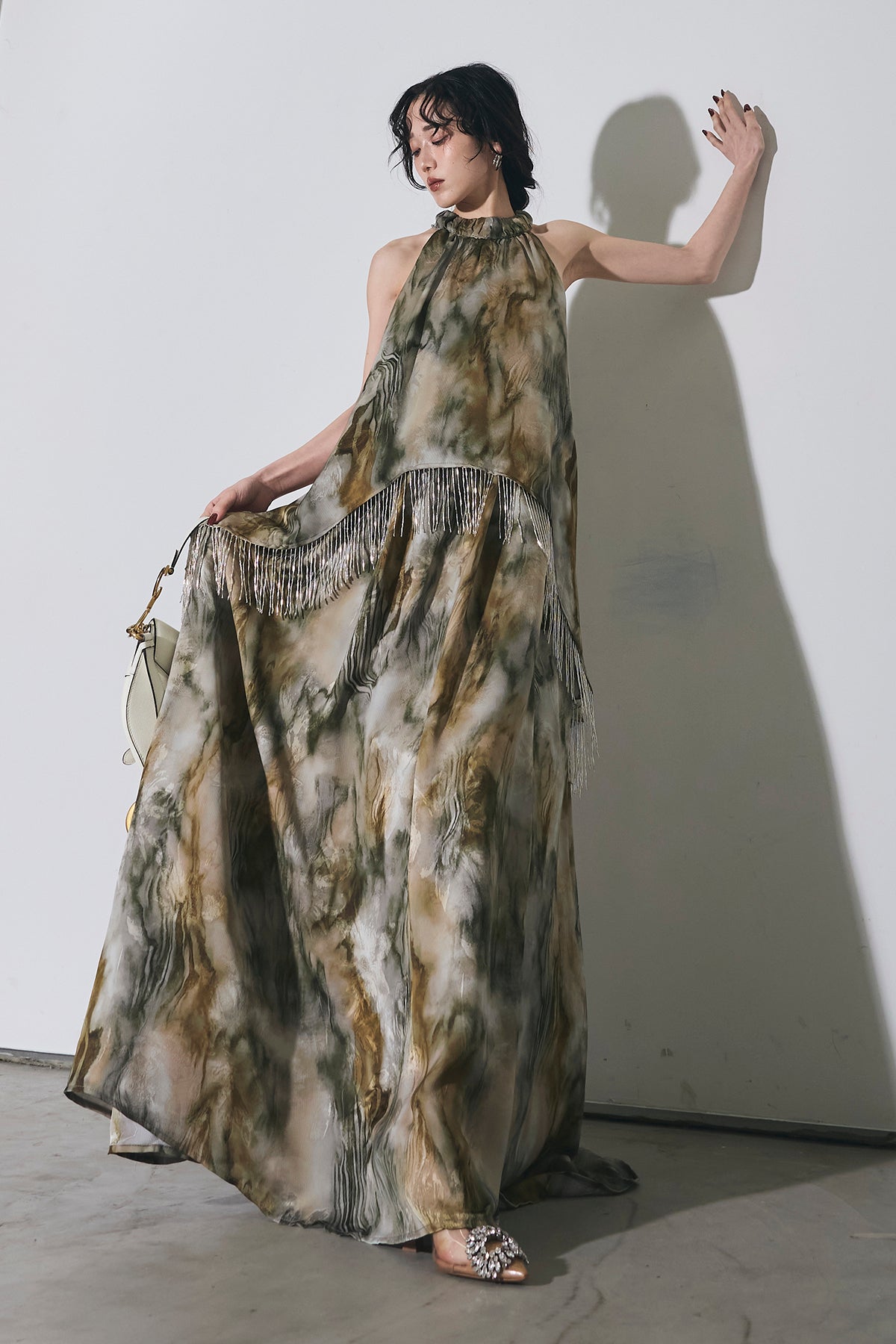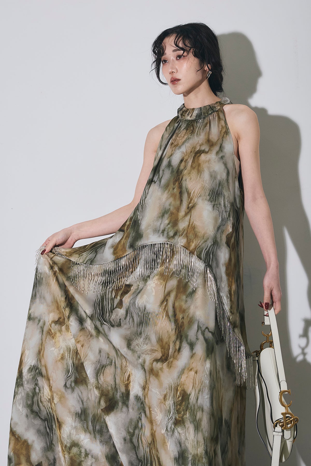 【SET】タイダイフリンジアートワンピース+スタンドカラーデニムジャケット