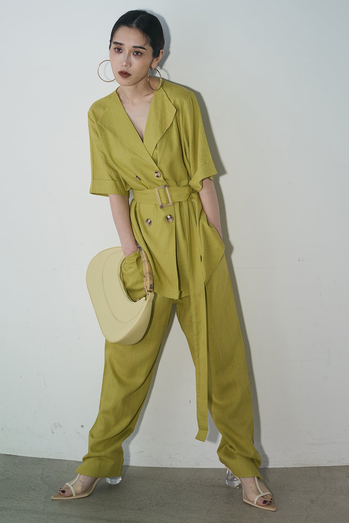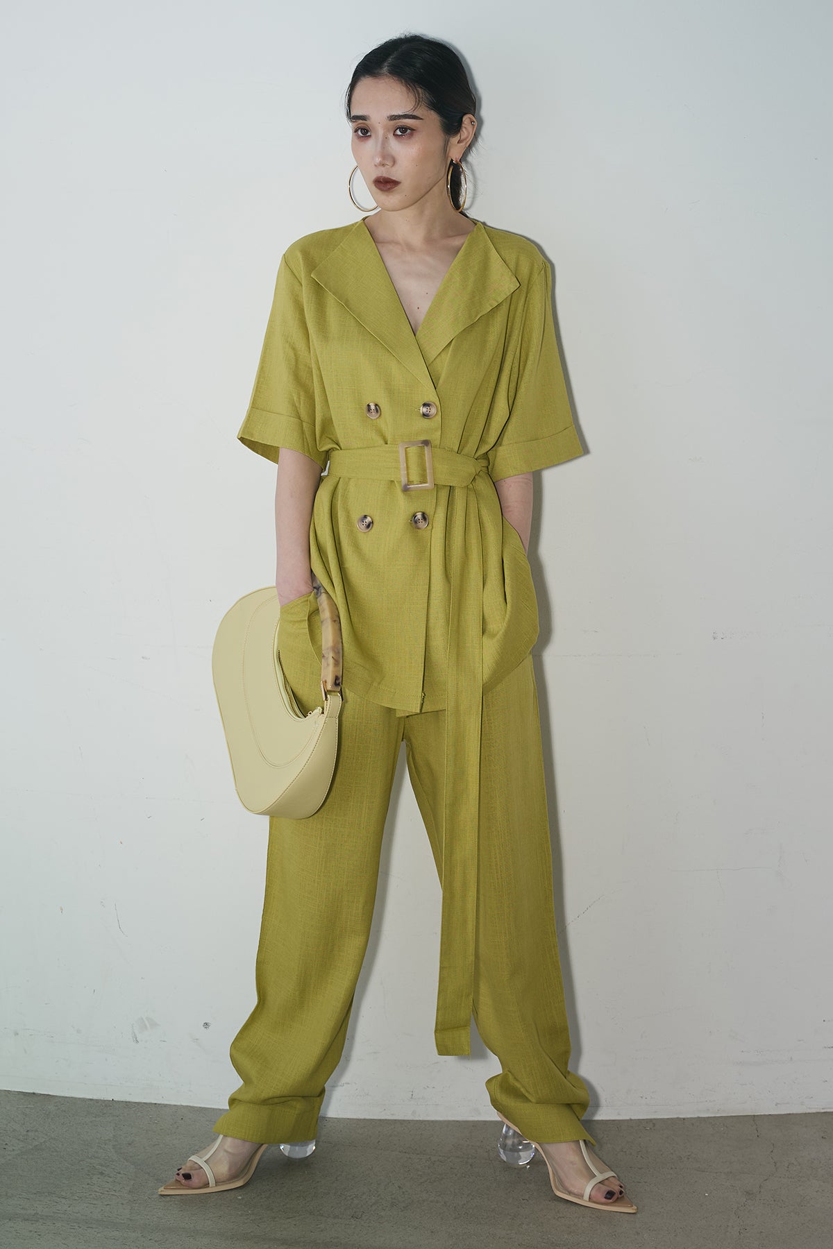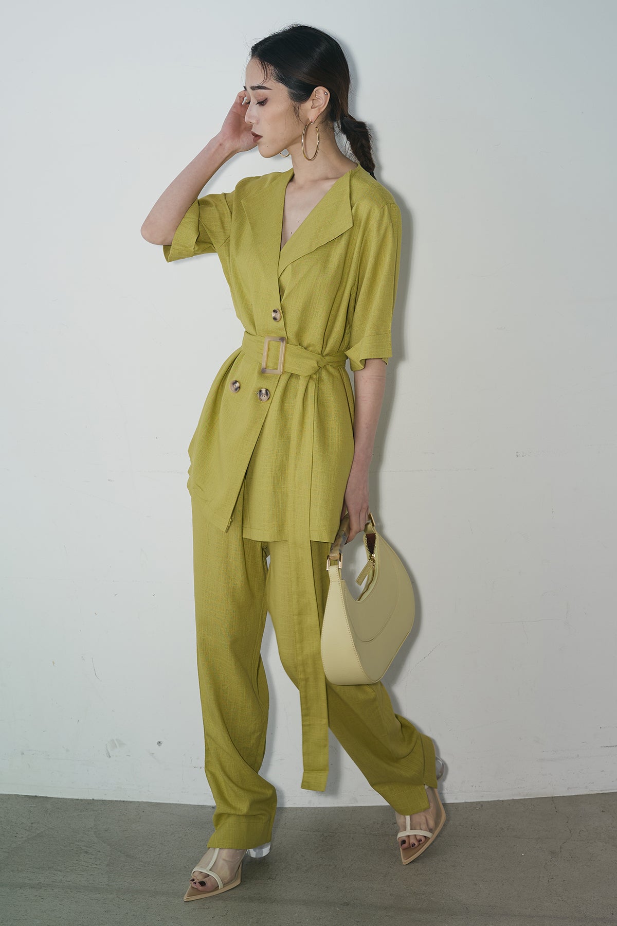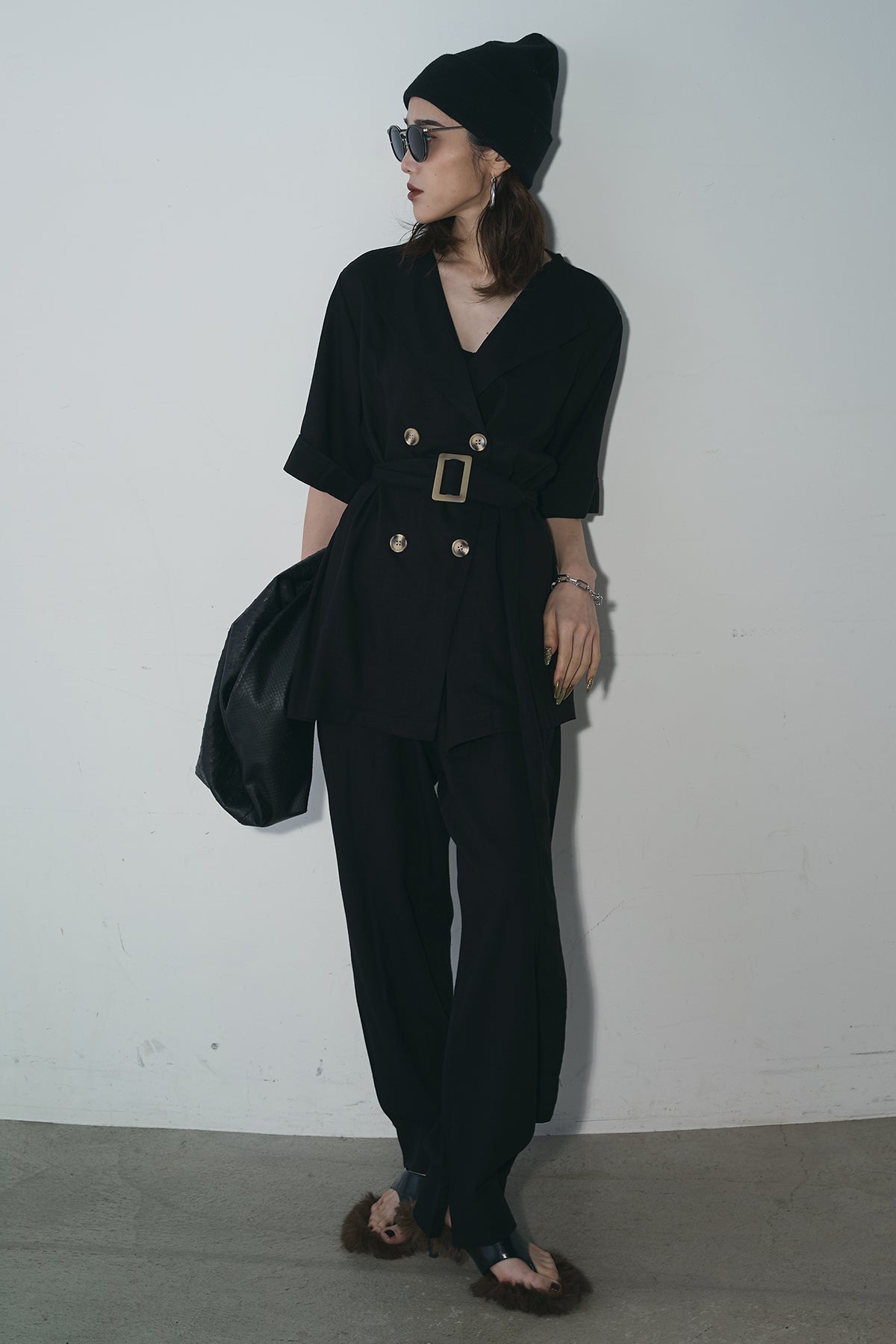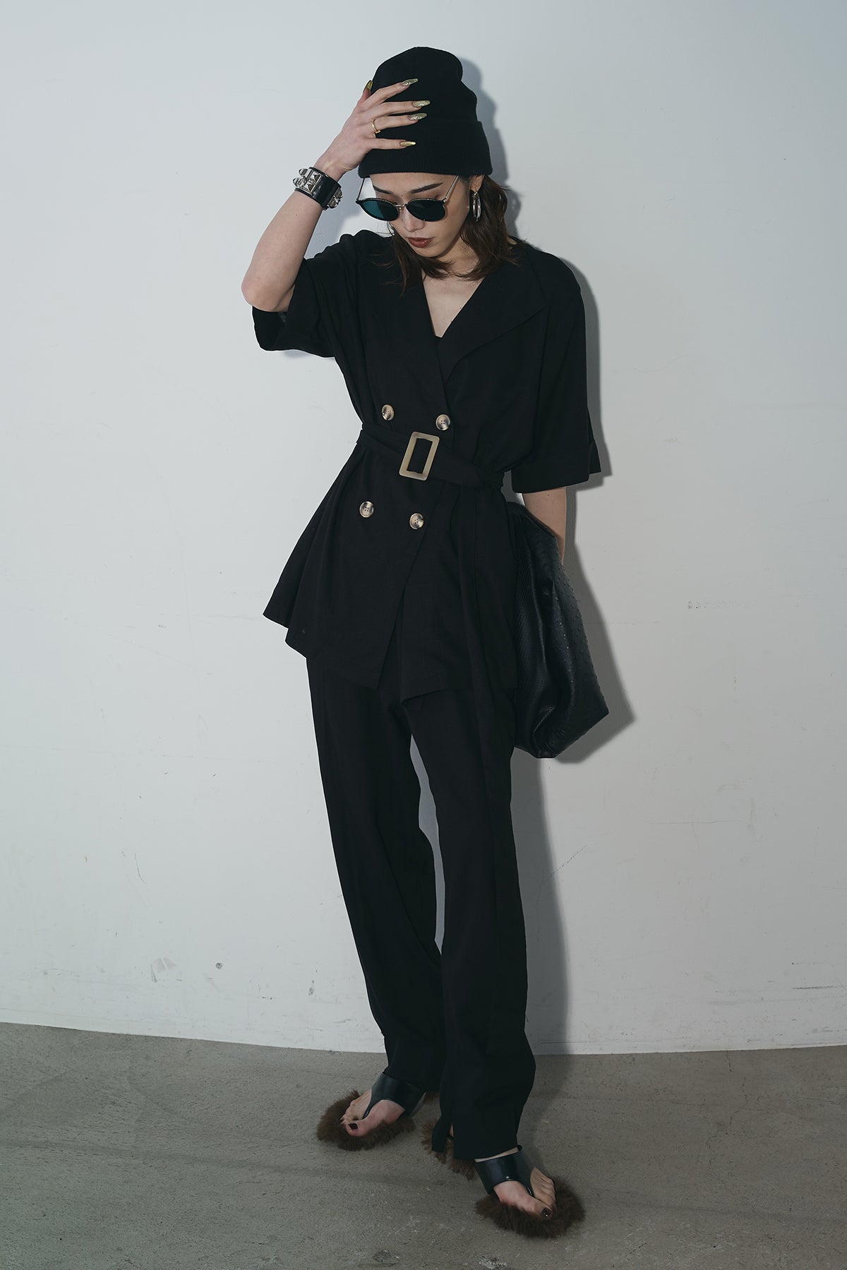 ゆったりとしたシルエットのダブルジャケットは、ハーフスリーブで軽やかな印象に。ゴールドボタンとウエストベルトがアクセントになり、メリハリのあるスタイルを演出します。パンツはストレートシルエットで、ジャケットとのバランスも絶妙。セットで着用すればモード感漂う洗練された着こなしに。単品でも着回しやすく、カジュアルからオフィスシーンまで幅広く活躍するアイテムです。