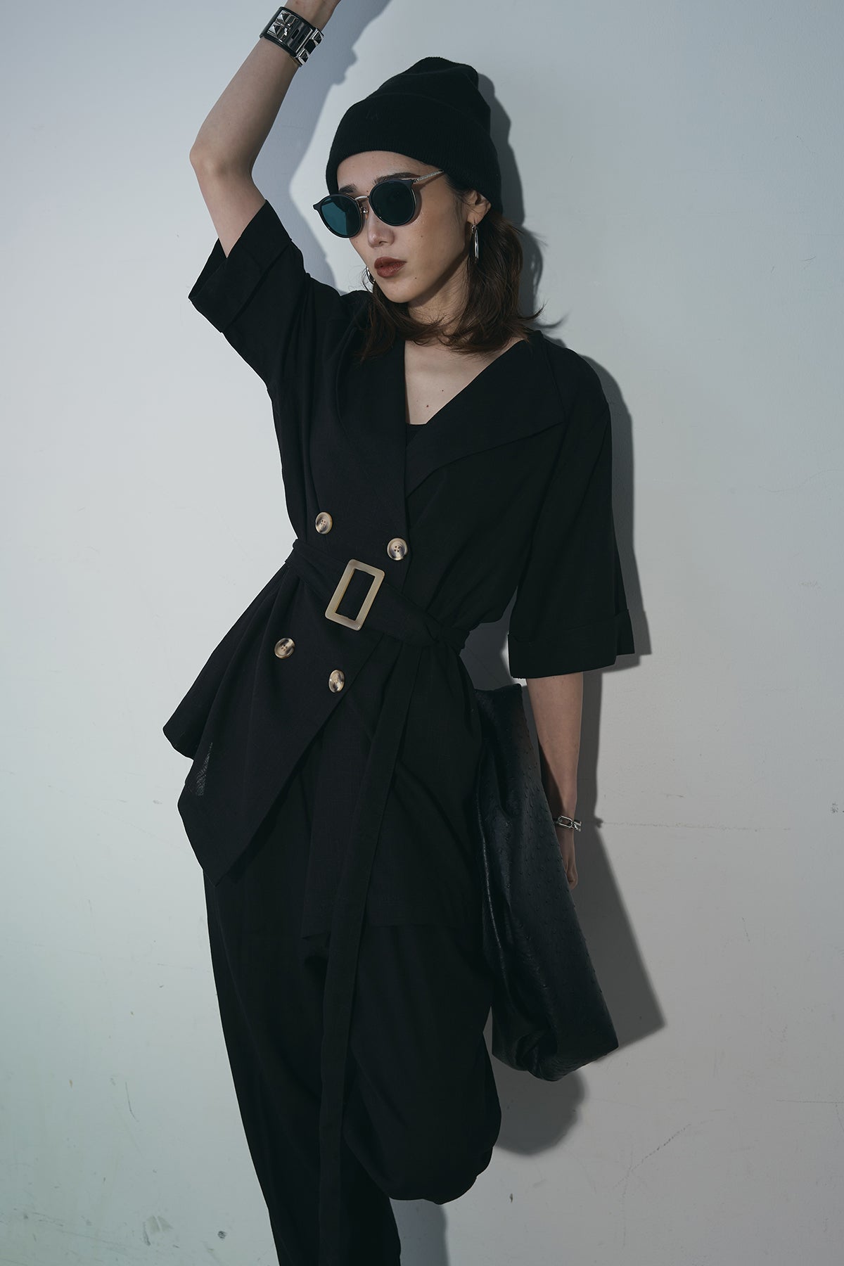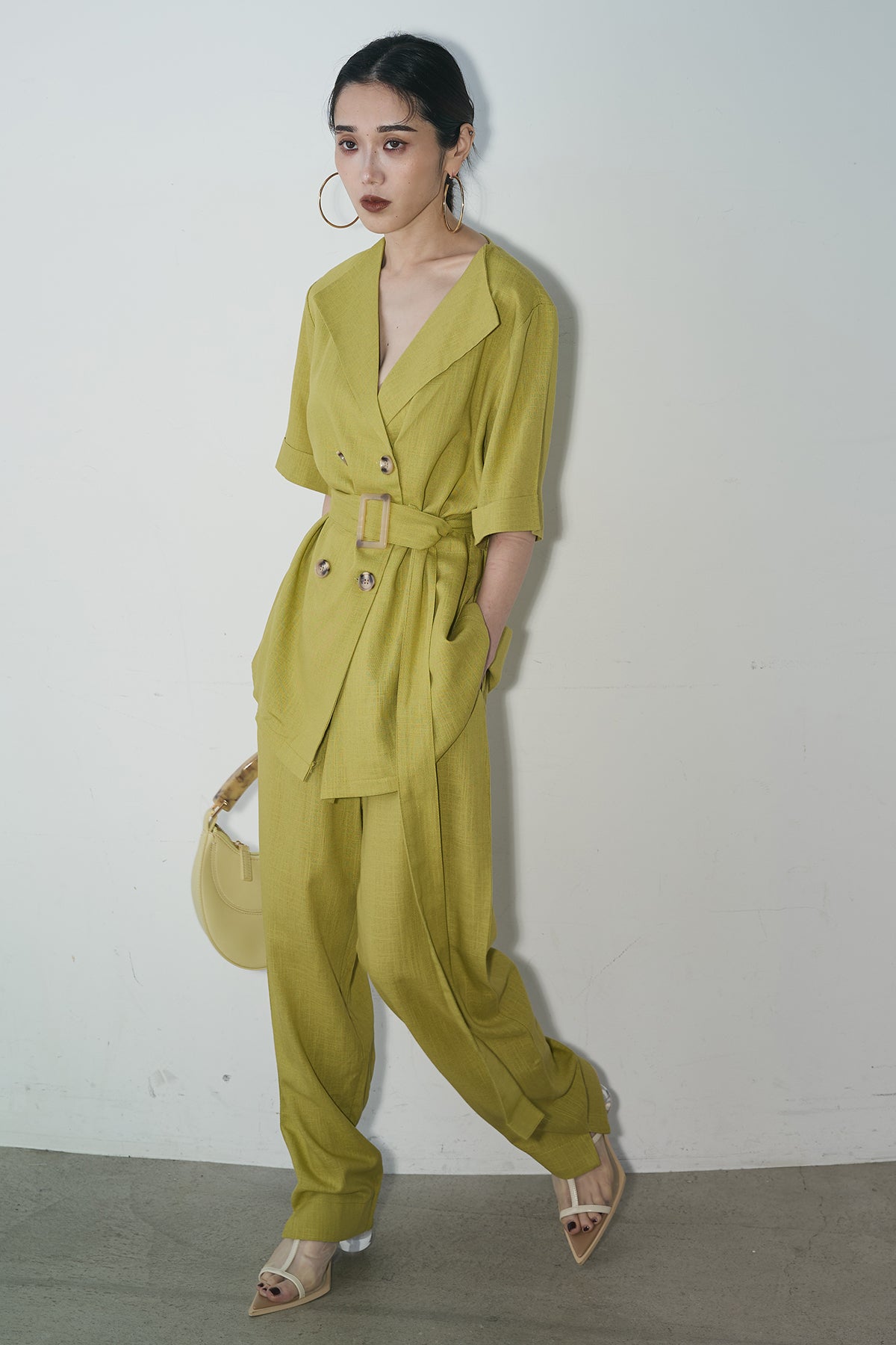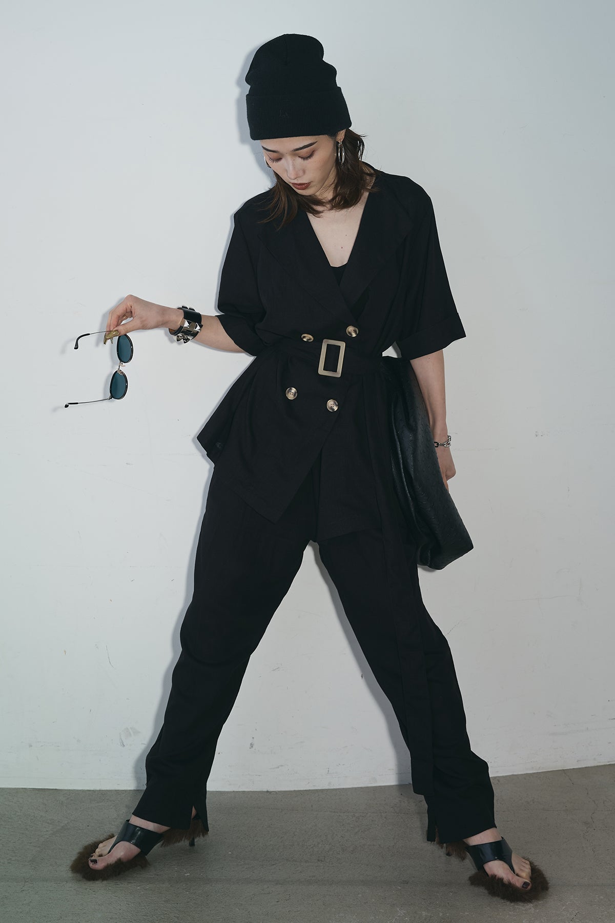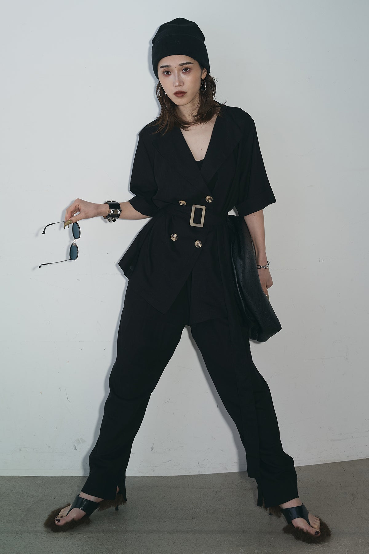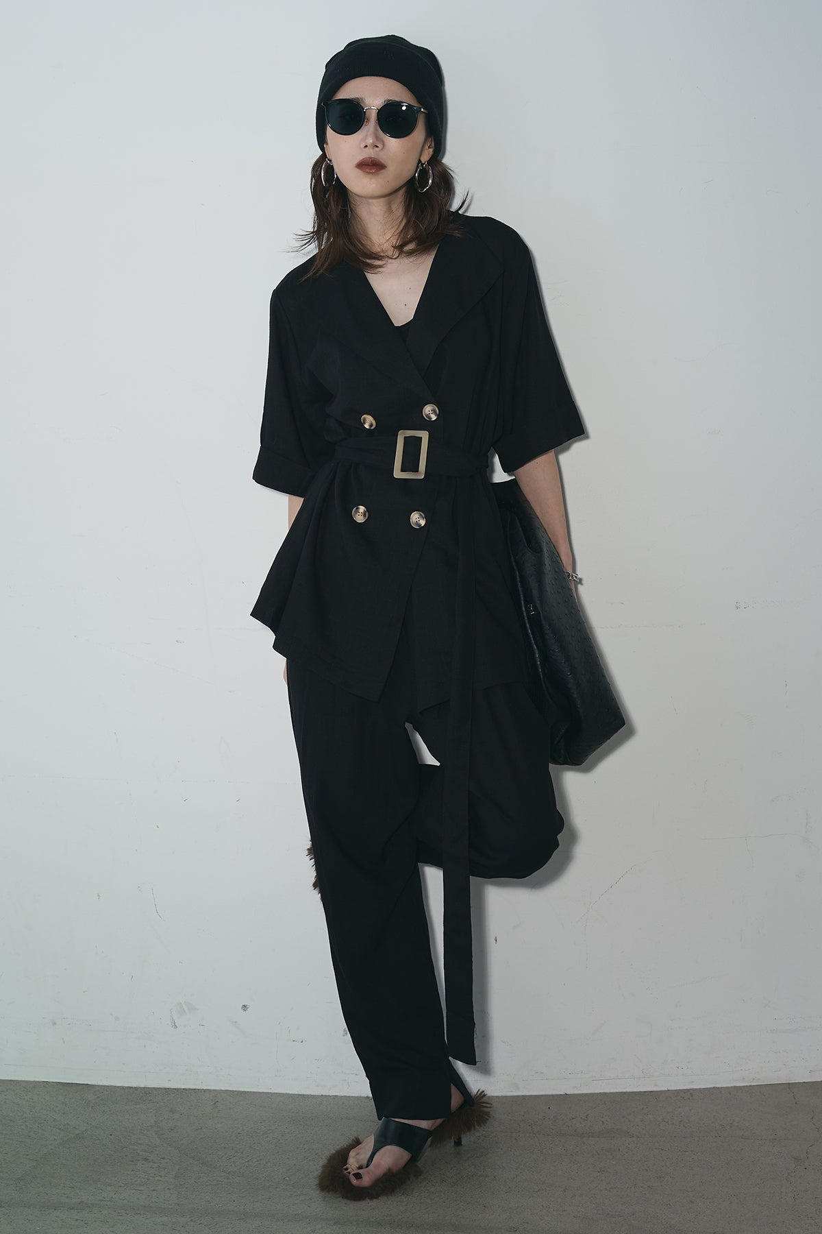 ゆったりとしたシルエットのダブルジャケットは、ハーフスリーブで軽やかな印象に。ゴールドボタンとウエストベルトがアクセントになり、メリハリのあるスタイルを演出します。パンツはストレートシルエットで、ジャケットとのバランスも絶妙。セットで着用すればモード感漂う洗練された着こなしに。単品でも着回しやすく、カジュアルからオフィスシーンまで幅広く活躍するアイテムです。