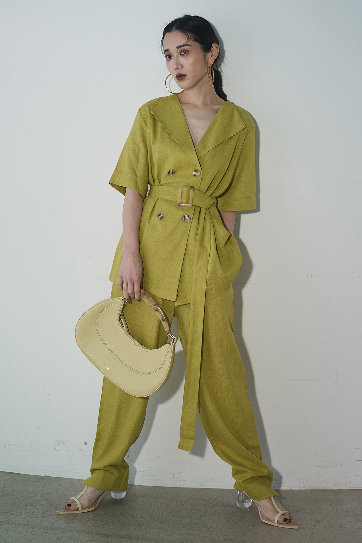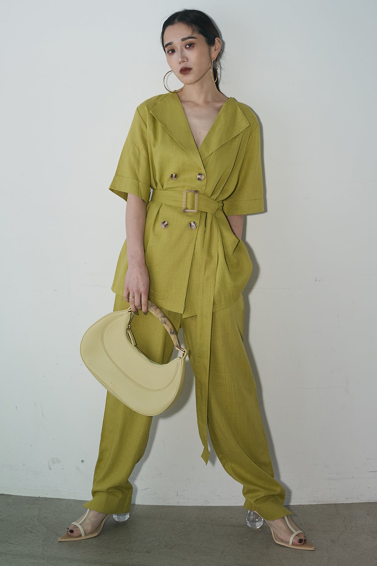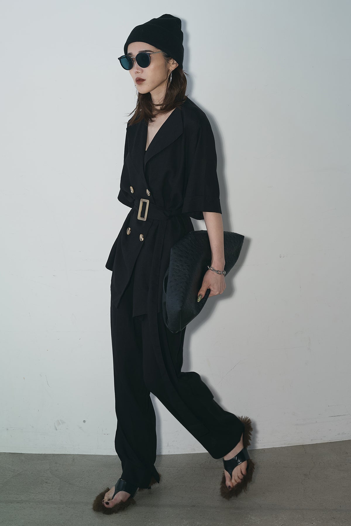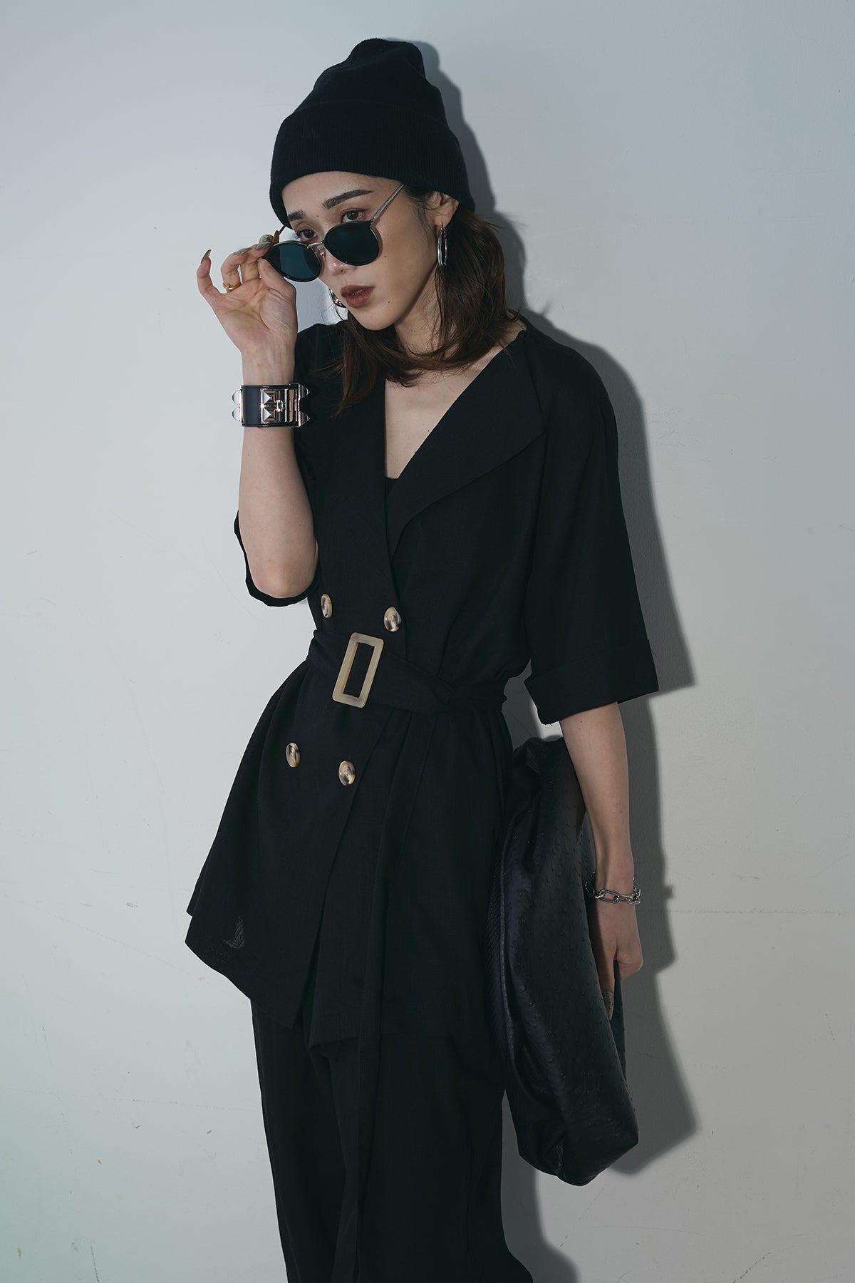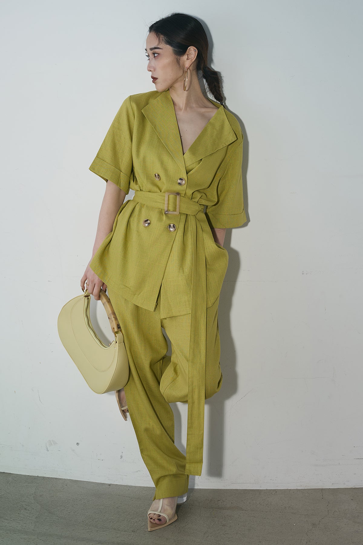 ゆったりとしたシルエットのダブルジャケットは、ハーフスリーブで軽やかな印象に。ゴールドボタンとウエストベルトがアクセントになり、メリハリのあるスタイルを演出します。パンツはストレートシルエットで、ジャケットとのバランスも絶妙。セットで着用すればモード感漂う洗練された着こなしに。単品でも着回しやすく、カジュアルからオフィスシーンまで幅広く活躍するアイテムです。