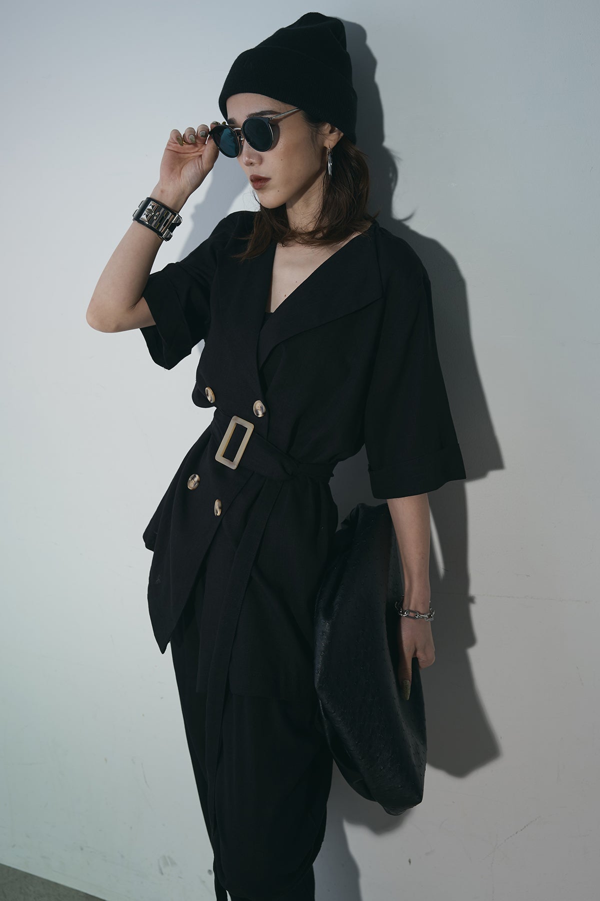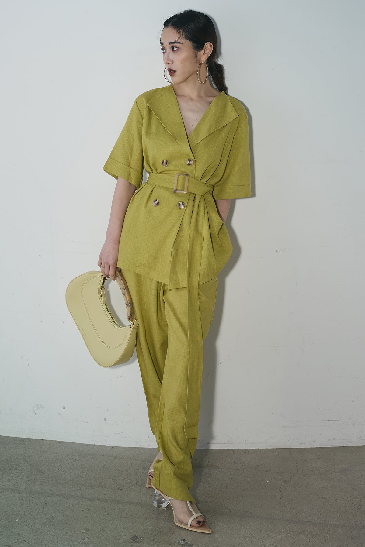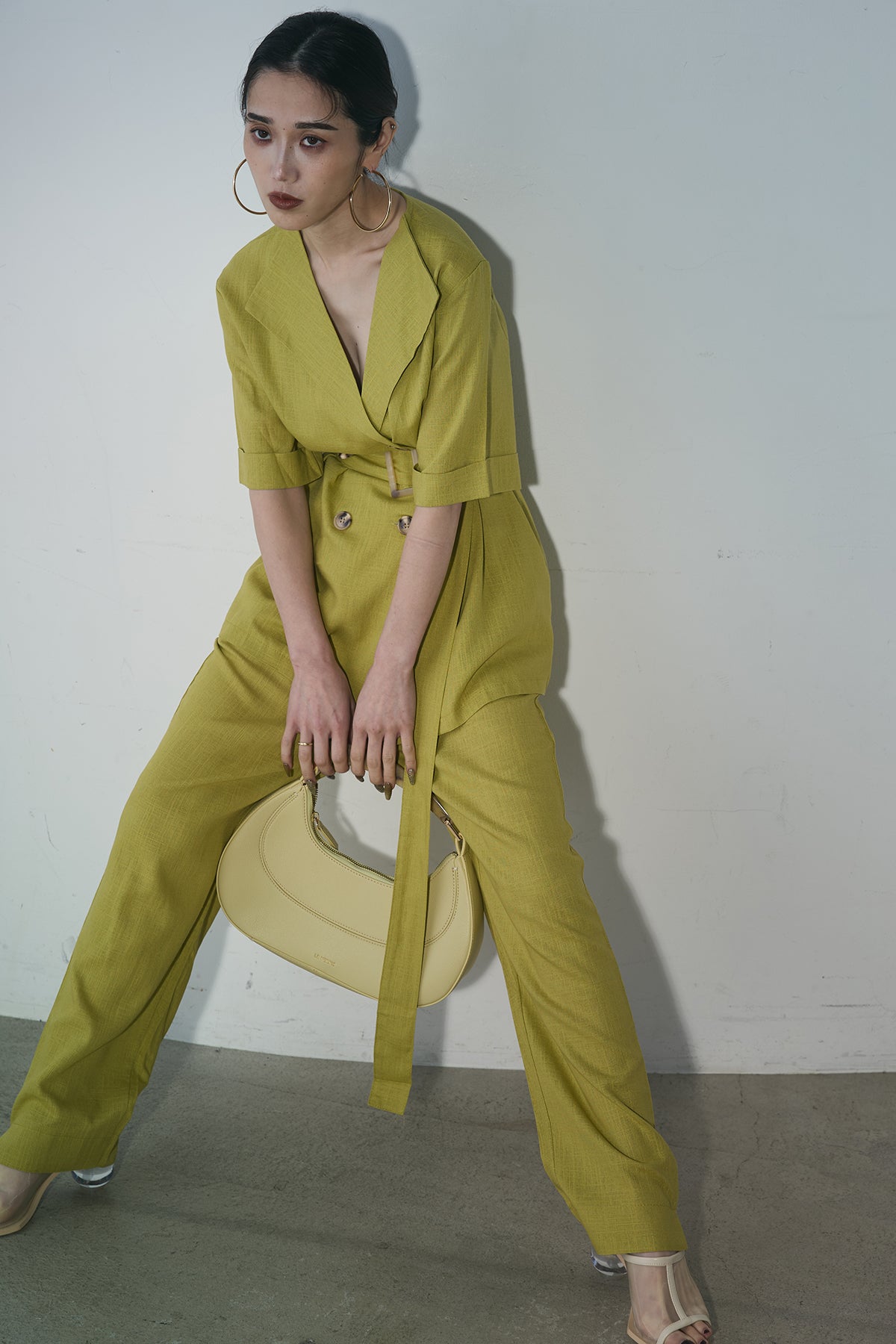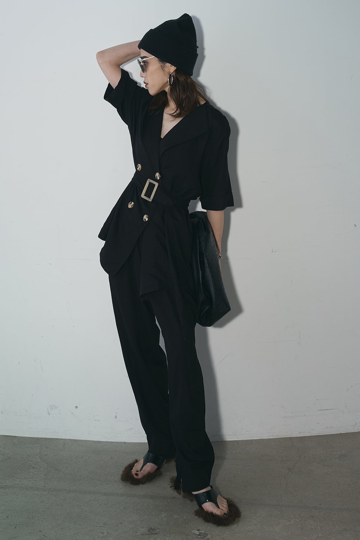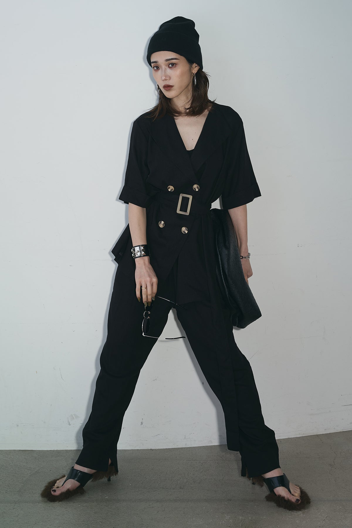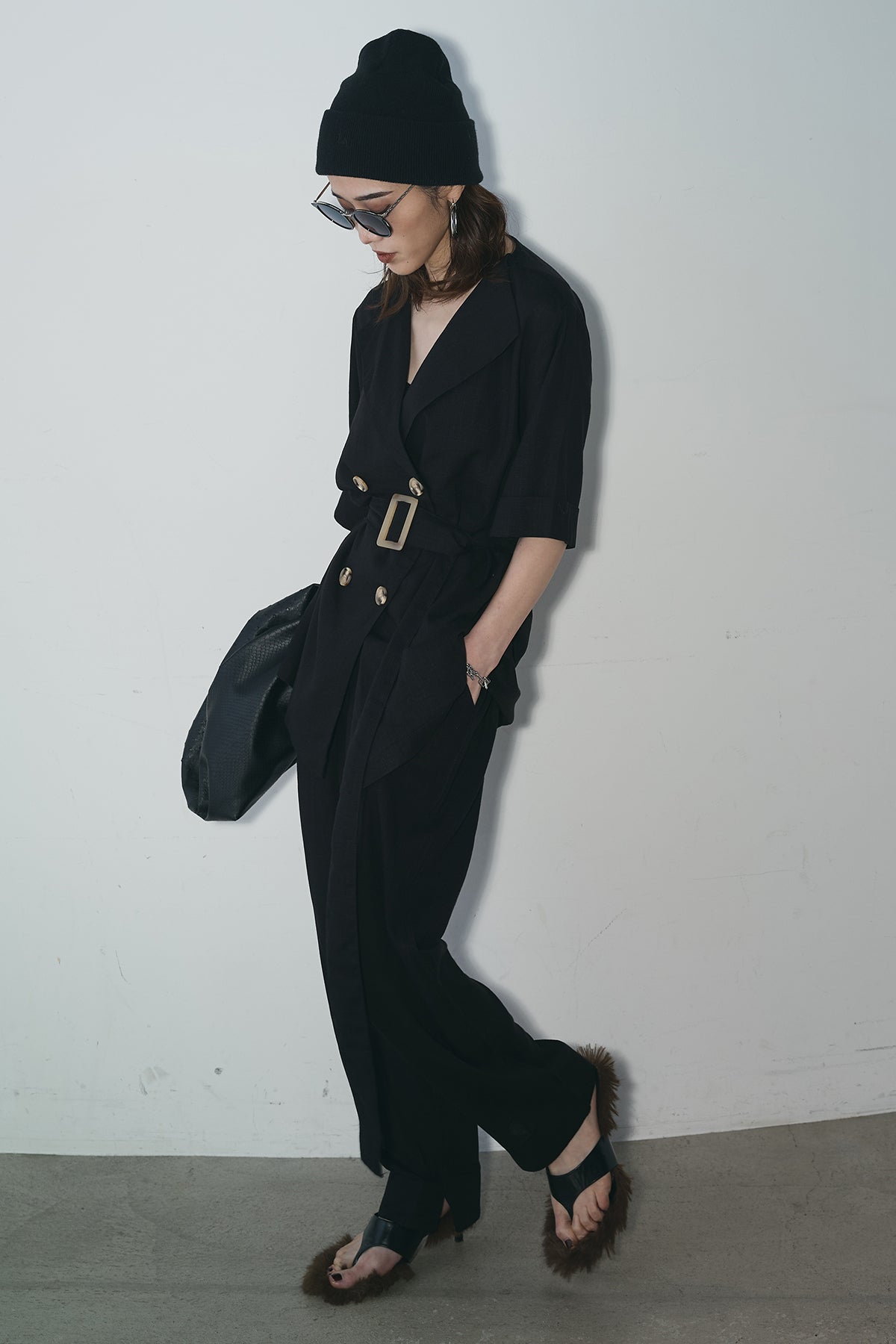 ゆったりとしたシルエットのダブルジャケットは、ハーフスリーブで軽やかな印象に。ゴールドボタンとウエストベルトがアクセントになり、メリハリのあるスタイルを演出します。パンツはストレートシルエットで、ジャケットとのバランスも絶妙。セットで着用すればモード感漂う洗練された着こなしに。単品でも着回しやすく、カジュアルからオフィスシーンまで幅広く活躍するアイテムです。
