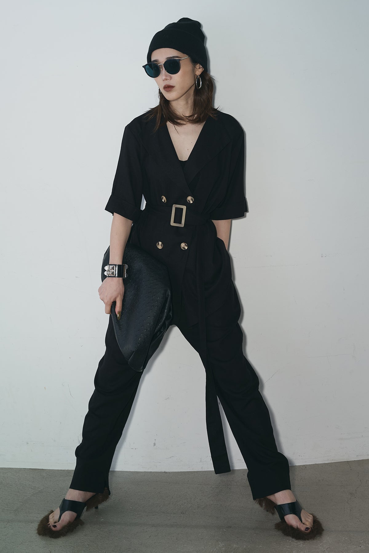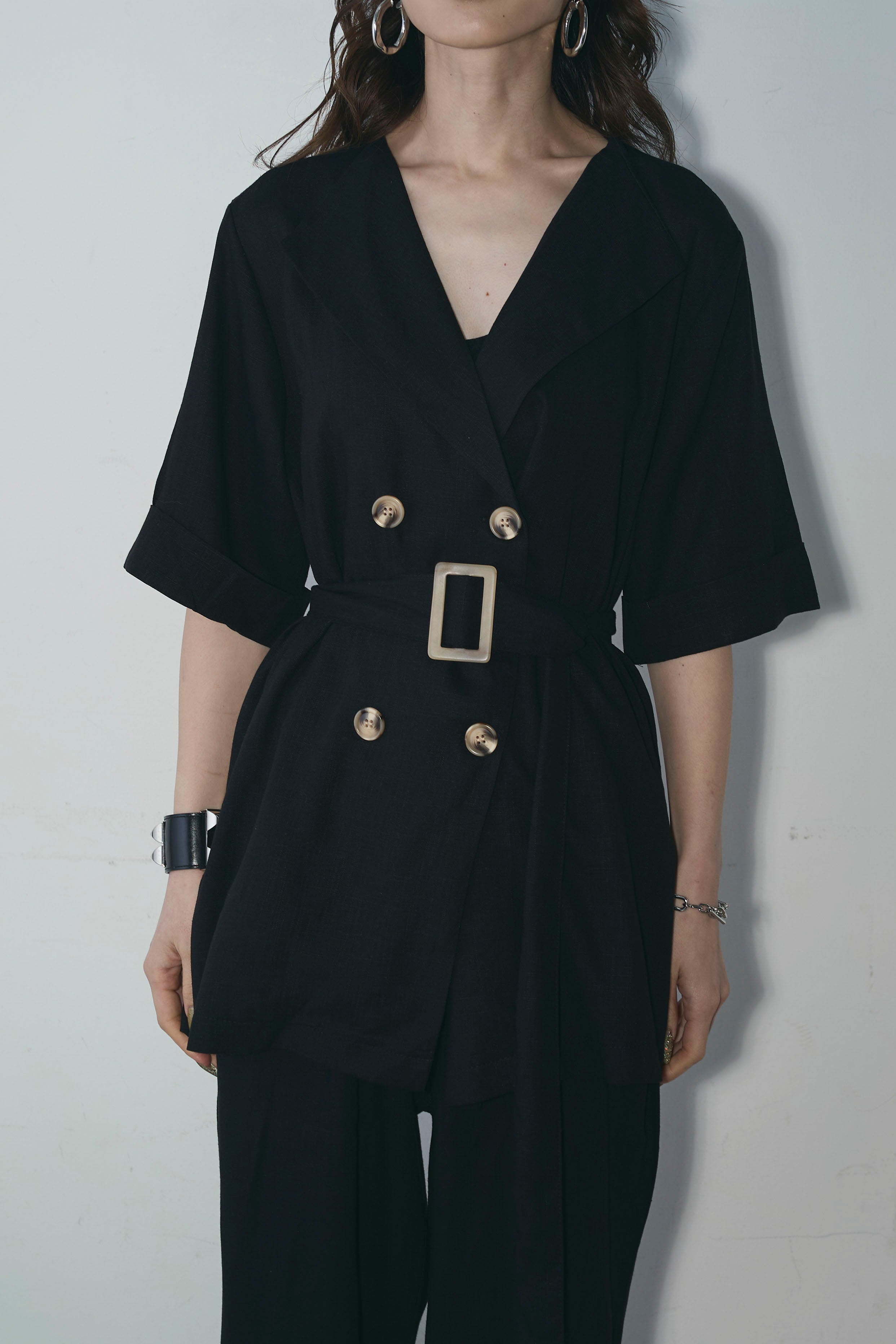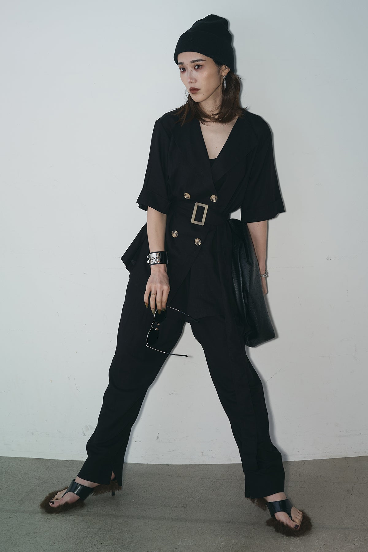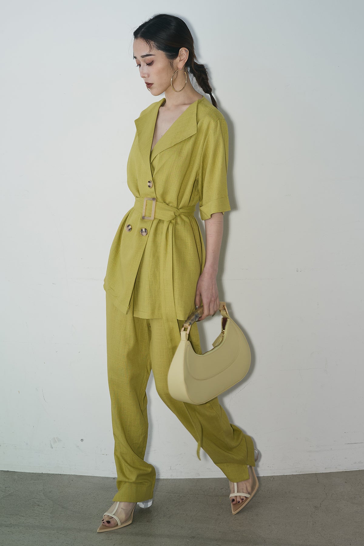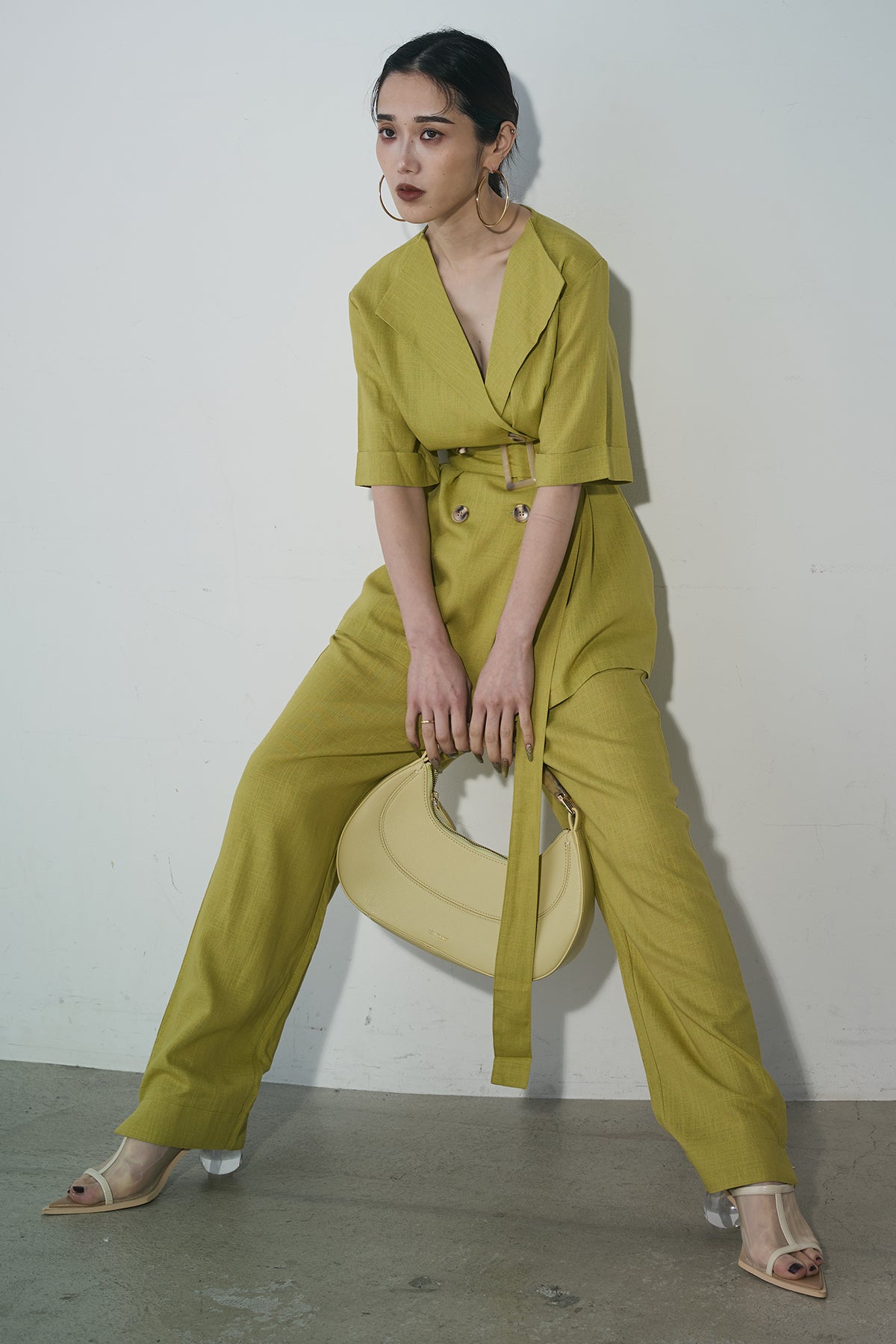 ゆったりとしたシルエットのダブルジャケットは、ハーフスリーブで軽やかな印象に。ゴールドボタンとウエストベルトがアクセントになり、メリハリのあるスタイルを演出します。パンツはストレートシルエットで、ジャケットとのバランスも絶妙。セットで着用すればモード感漂う洗練された着こなしに。単品でも着回しやすく、カジュアルからオフィスシーンまで幅広く活躍するアイテムです。