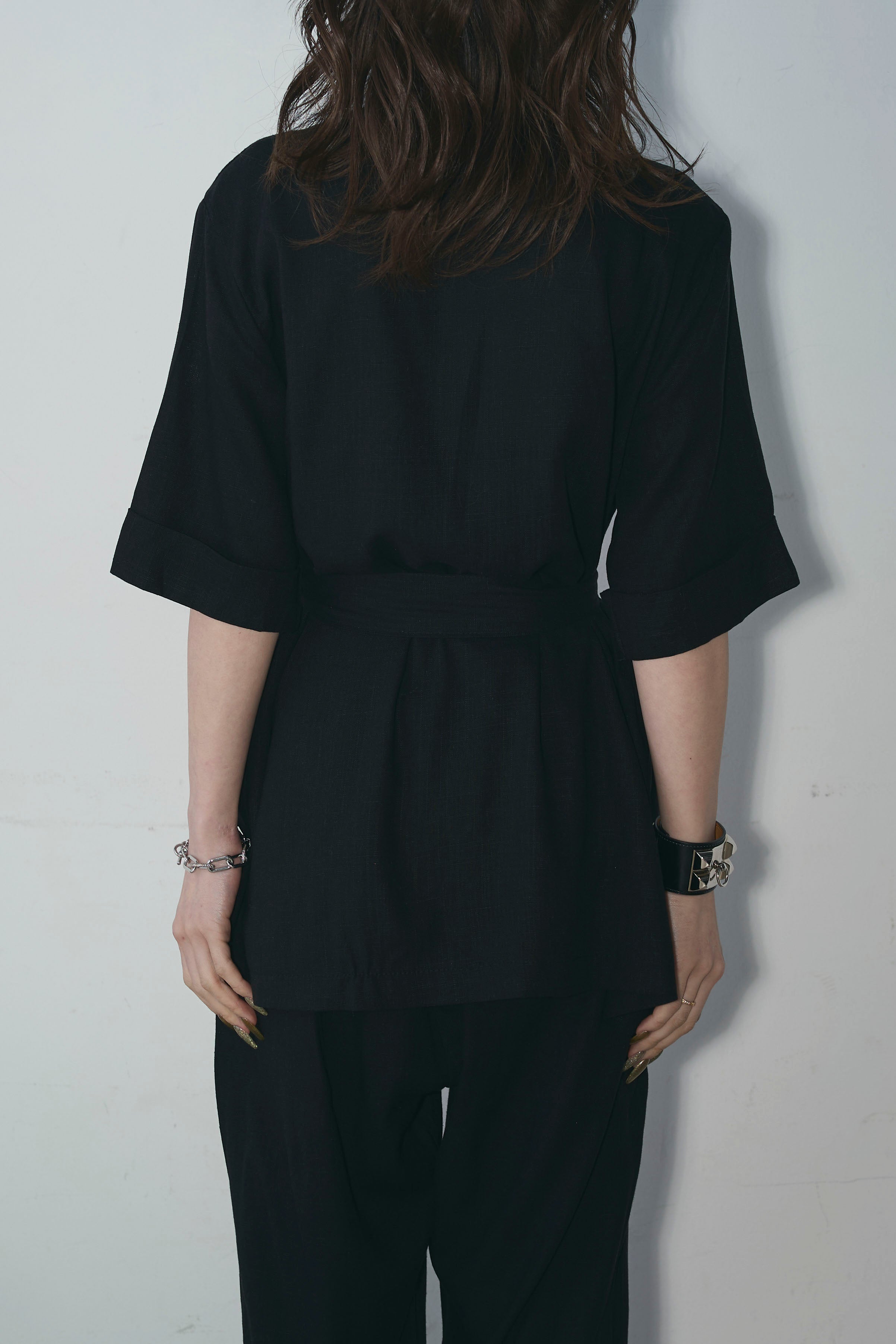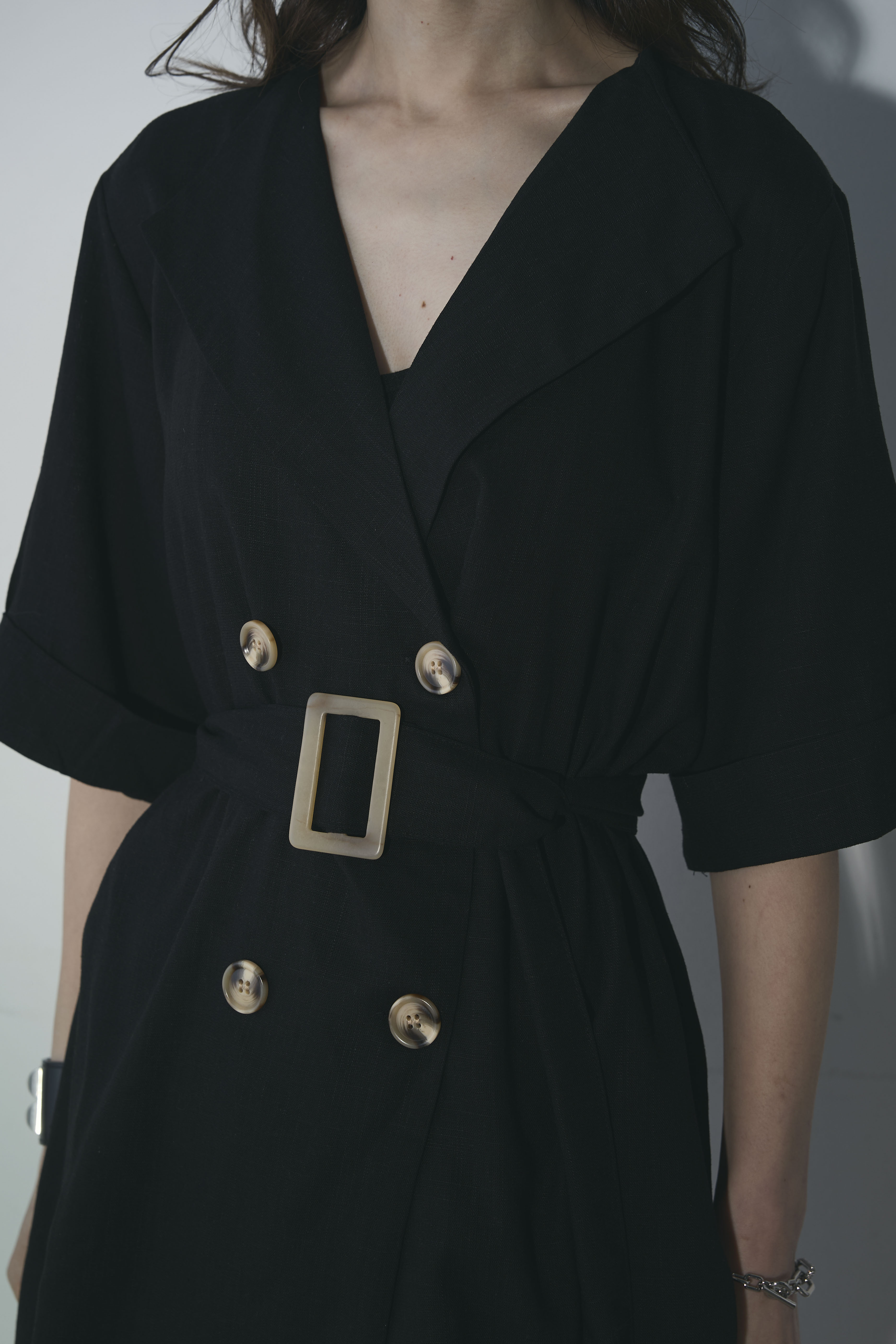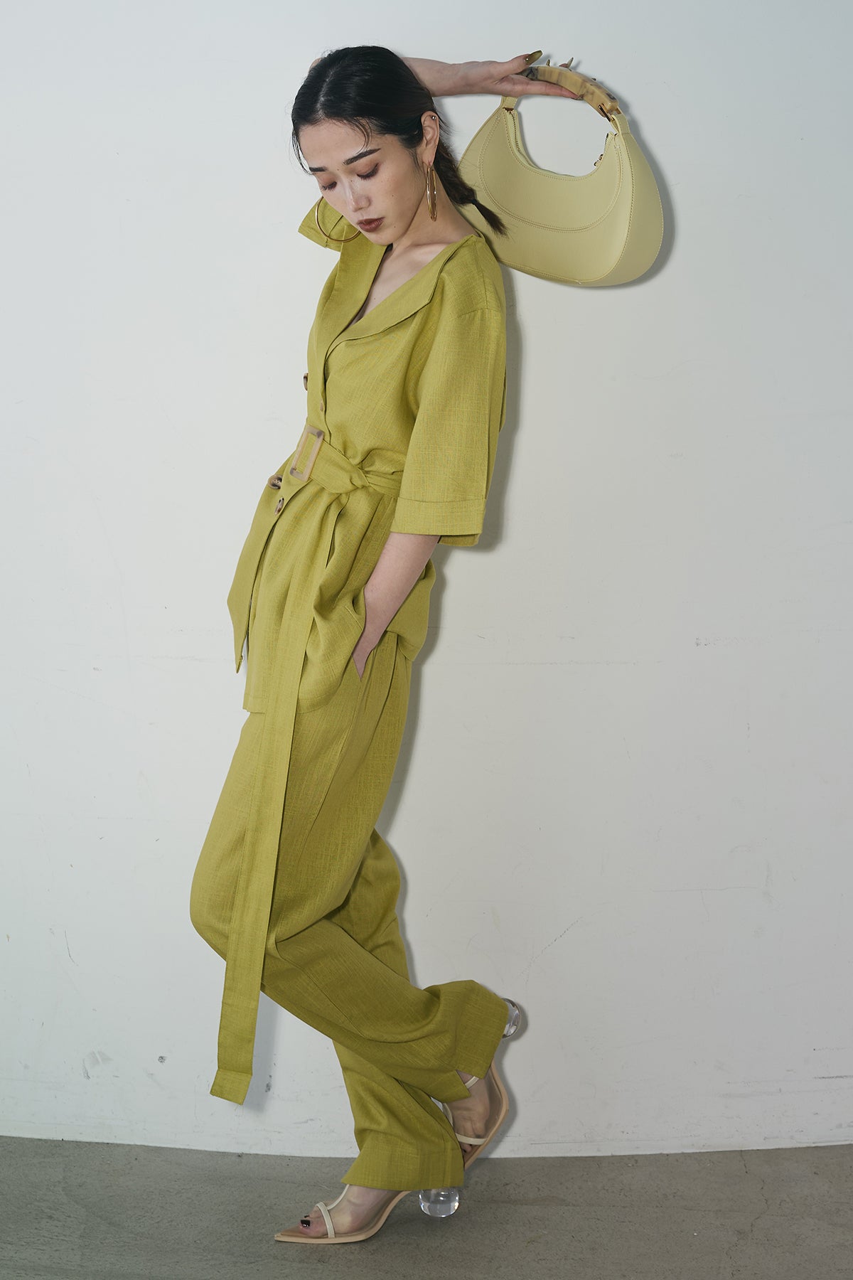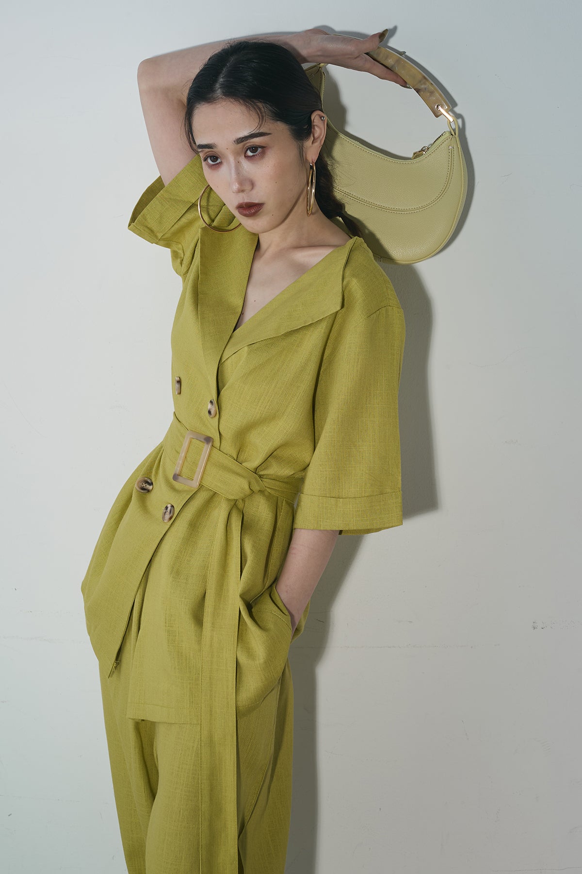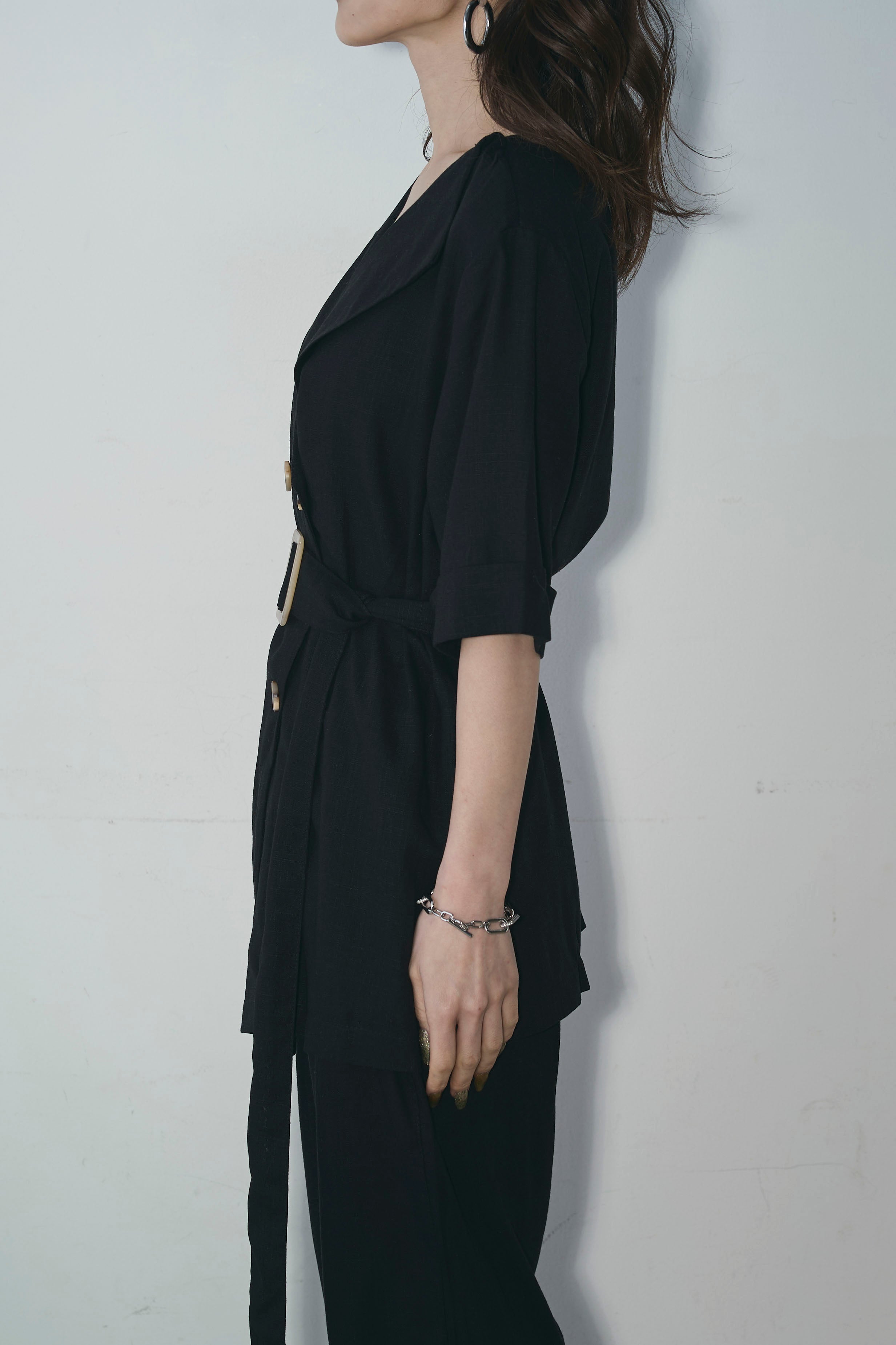 ゆったりとしたシルエットのダブルジャケットは、ハーフスリーブで軽やかな印象に。ゴールドボタンとウエストベルトがアクセントになり、メリハリのあるスタイルを演出します。パンツはストレートシルエットで、ジャケットとのバランスも絶妙。セットで着用すればモード感漂う洗練された着こなしに。単品でも着回しやすく、カジュアルからオフィスシーンまで幅広く活躍するアイテムです。