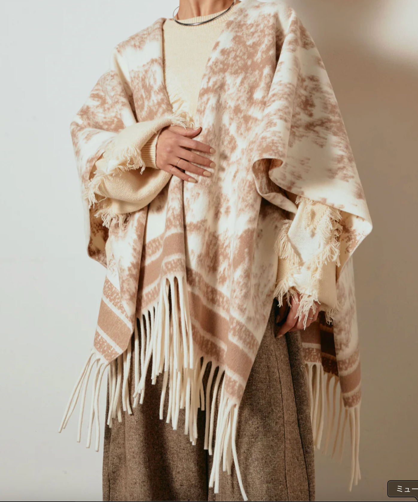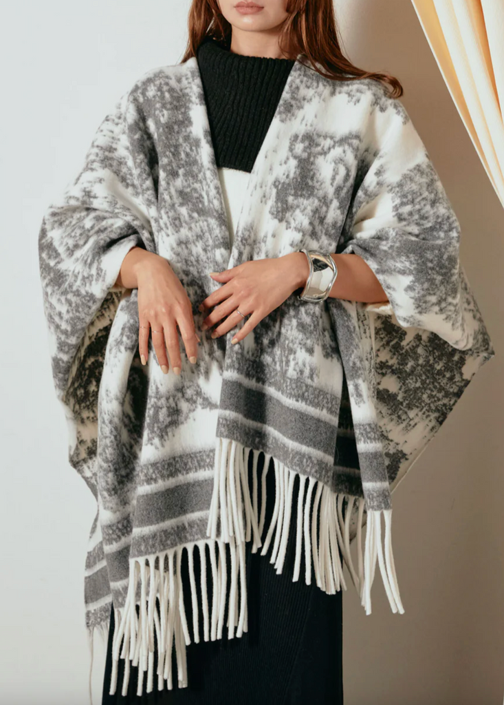 このモノクロパターンのショールは、ユニークな模様とフリンジディテールが特徴です。柔らかな素材で肌触りが良く、秋冬シーズンにぴったりのアイテムです。シンプルなコーディネートにプラスするだけで、一気におしゃれな印象を演出してくれます。