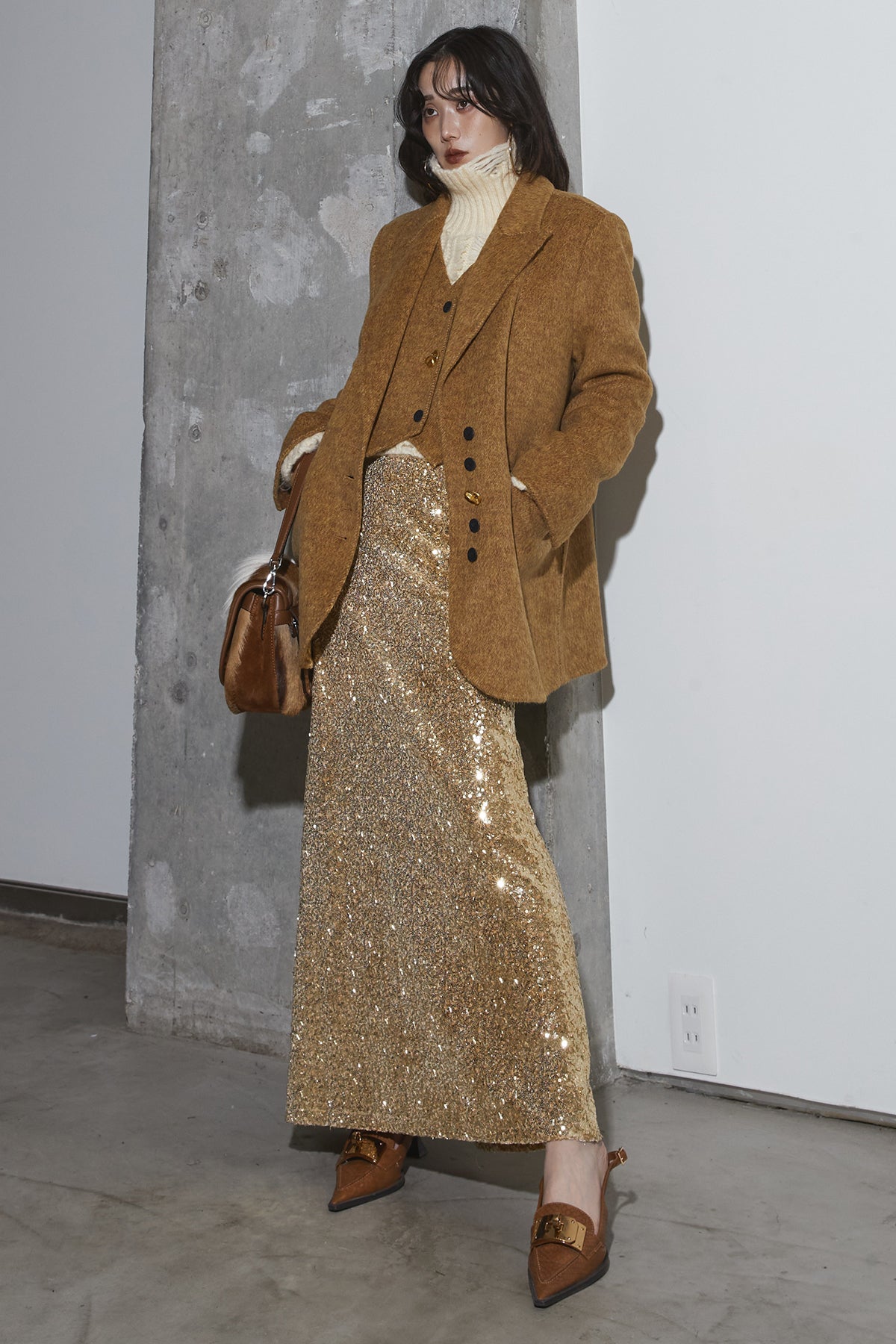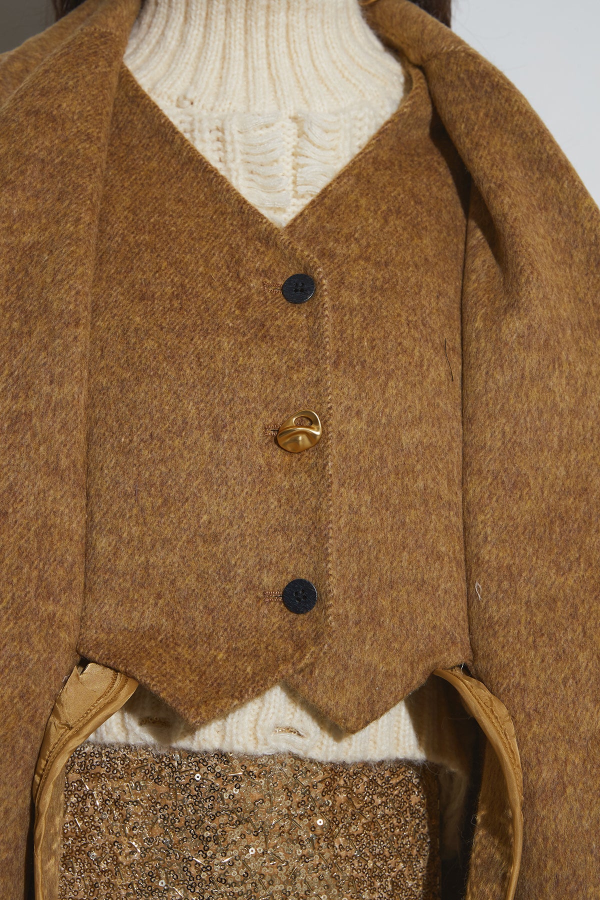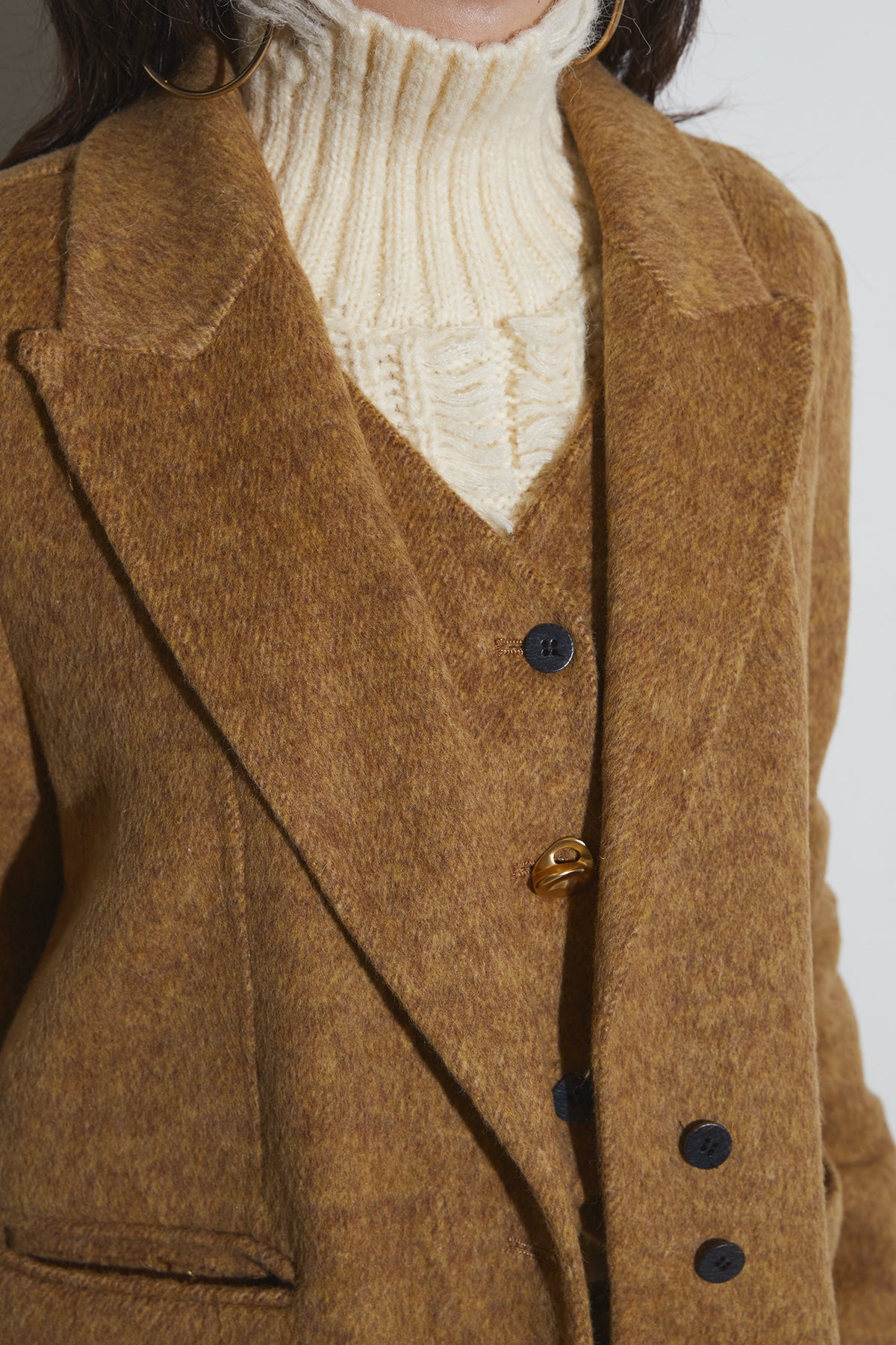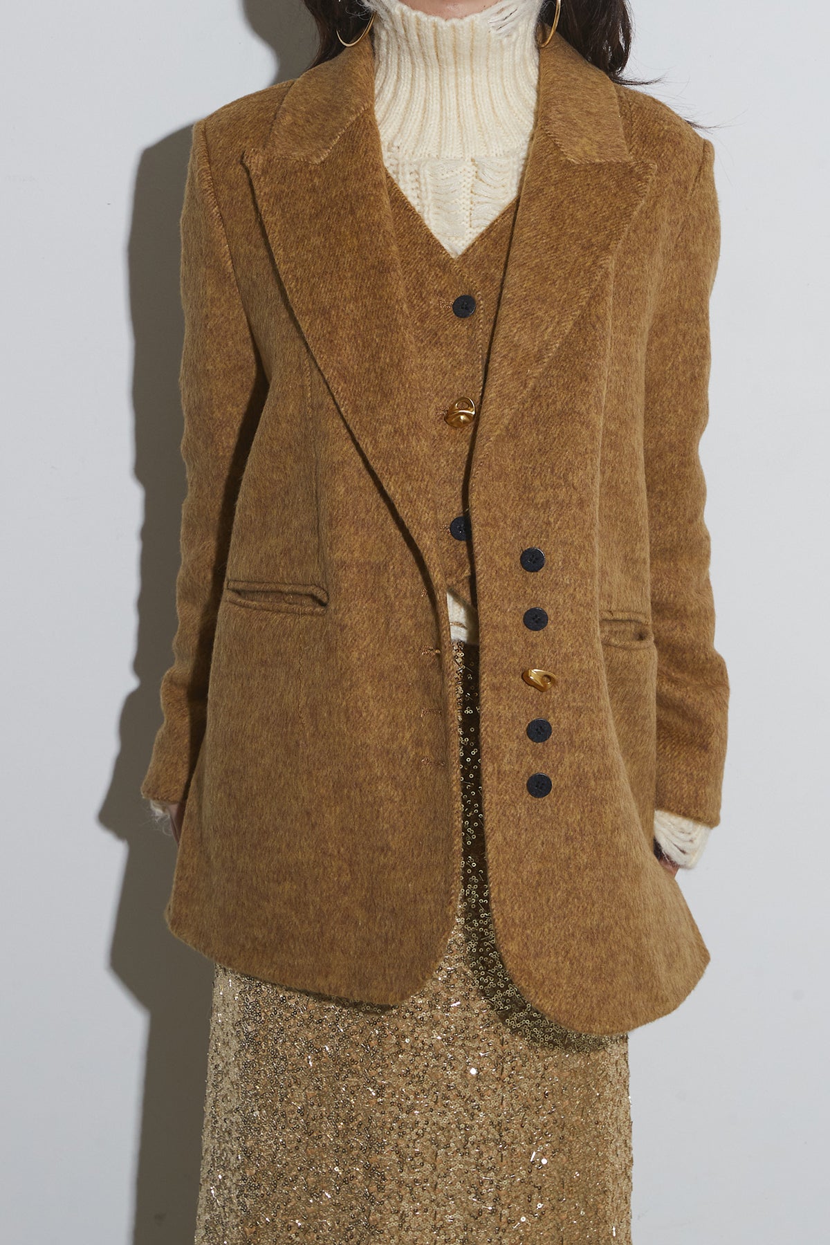 テーラードジャケットに同素材のベストをドッキングしたデザインで、レイヤードしたような奥行きのあるシルエットが魅力の一着です。単品で着たように見えるまとまり感がありつつ、フロントのボタンディテールがスタイリングに程よいアクセントを添えてくれます。