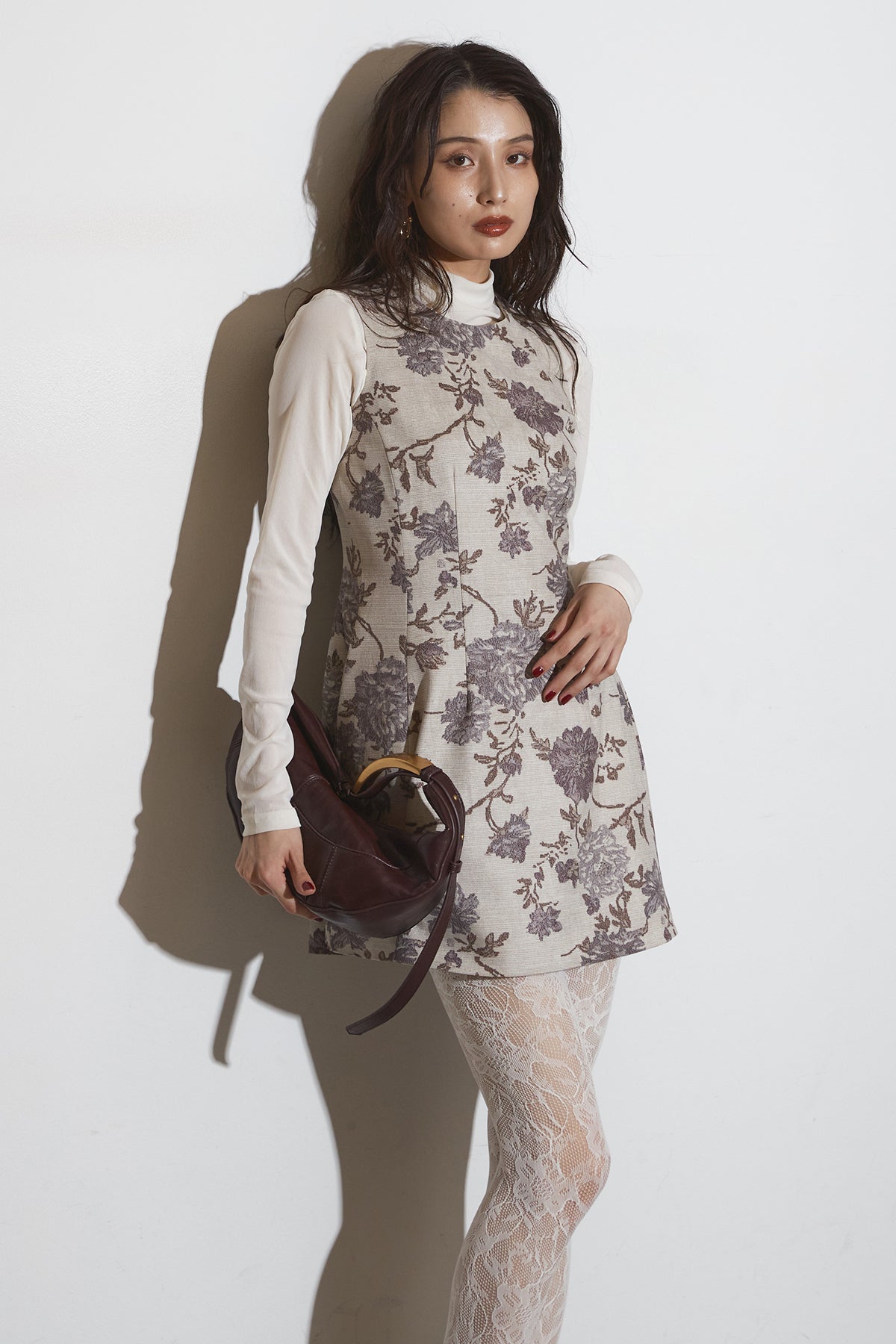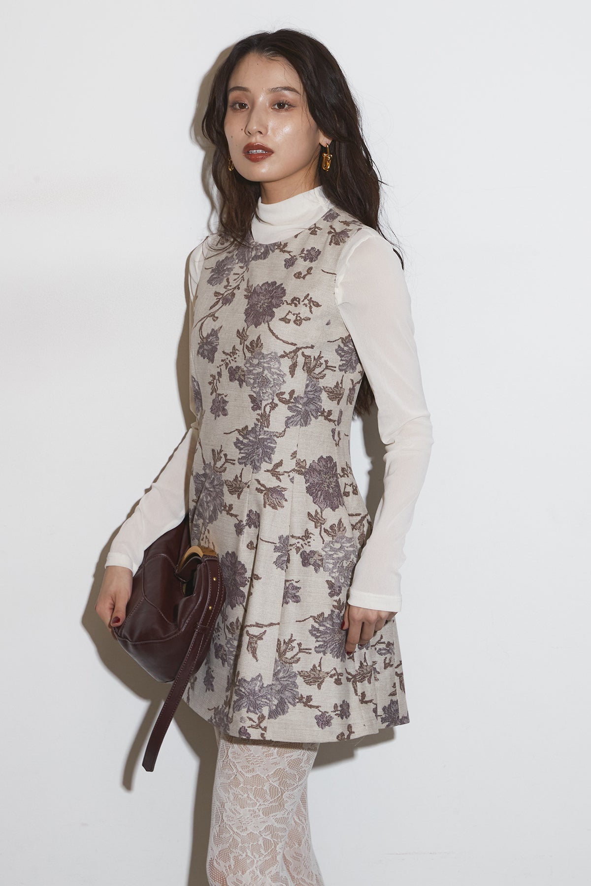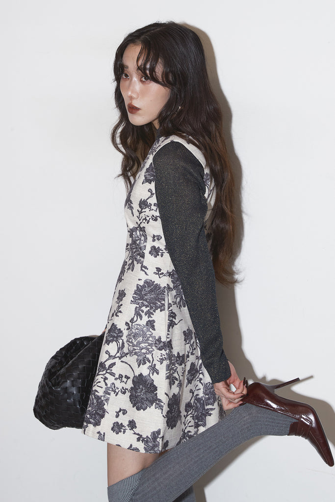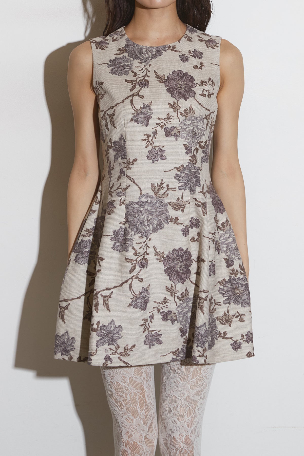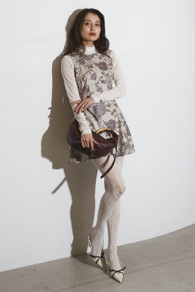 繊細なフラワーパターンが上品な印象を与えるノースリーブワンピース。 程よくハリのある生地感で、美しいシルエットをキープします。 一枚で着るのはもちろん、ジャケットやカーディガンを合わせて フォーマルにもデイリーにも活躍するアイテムです。