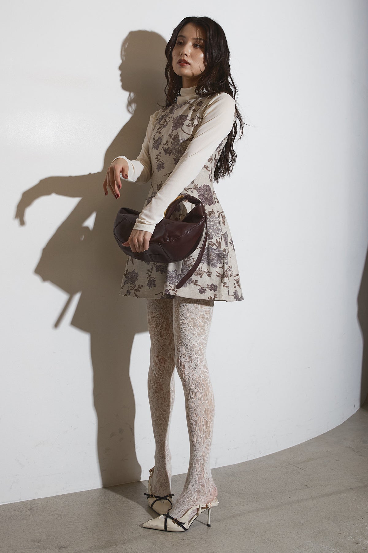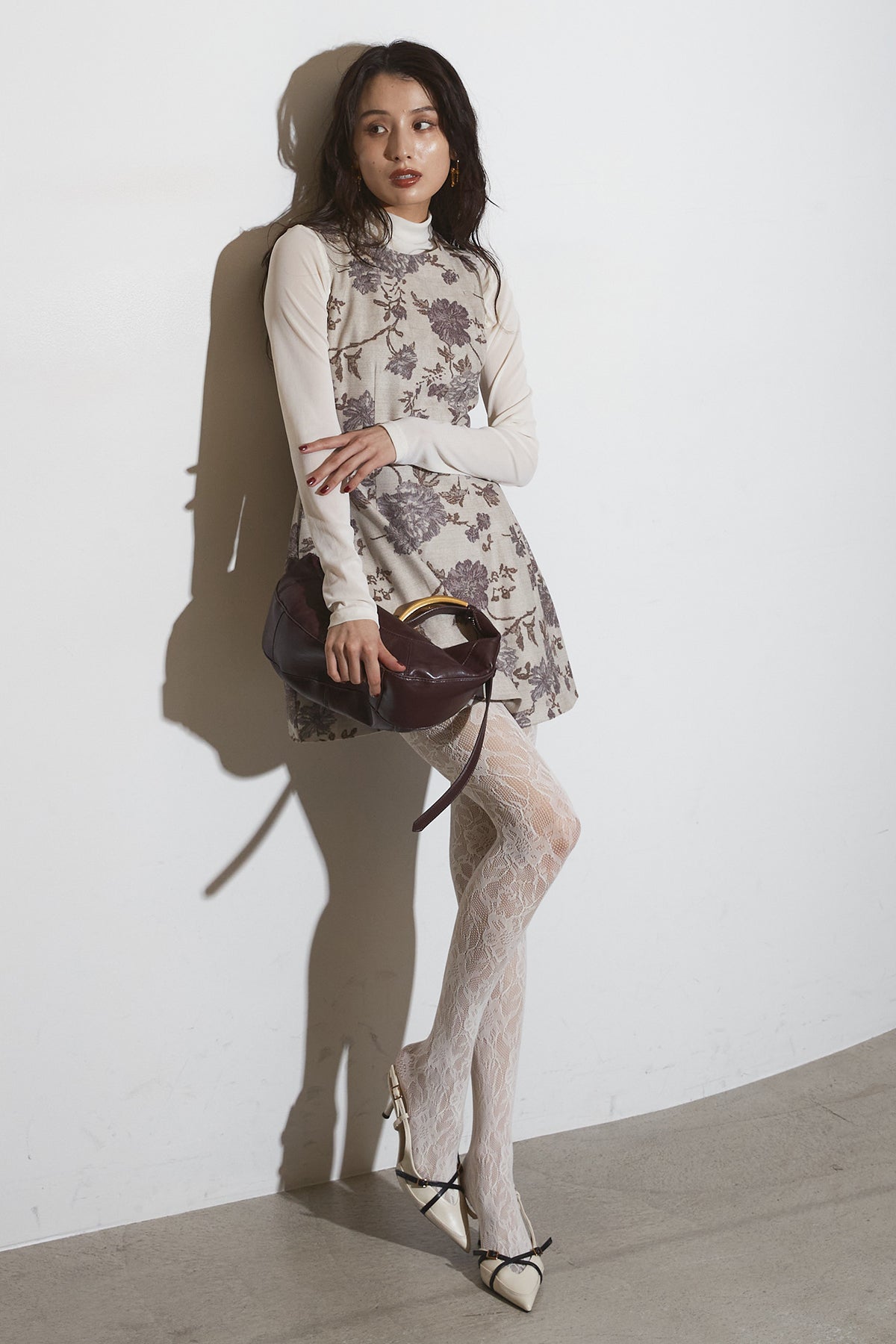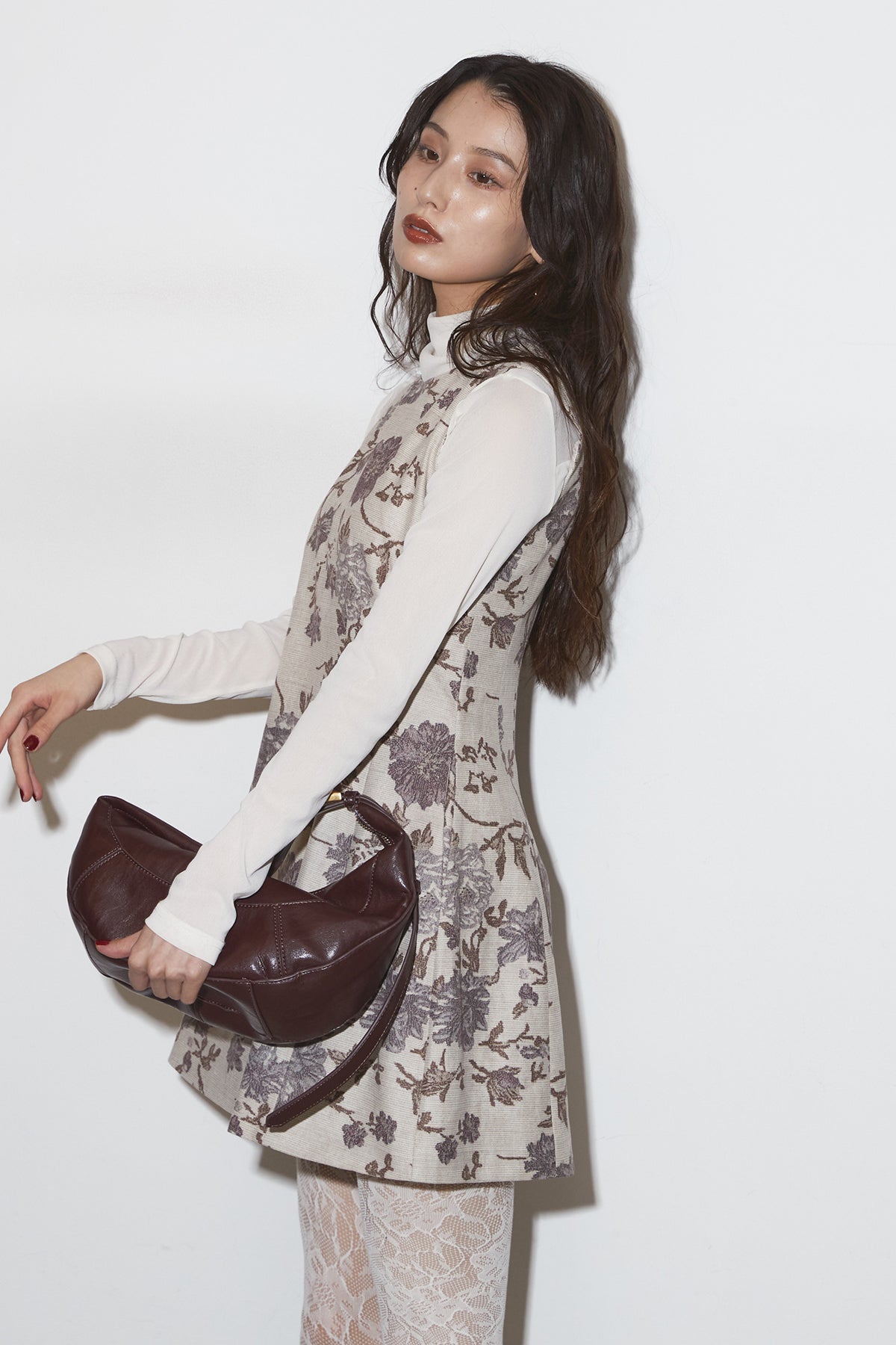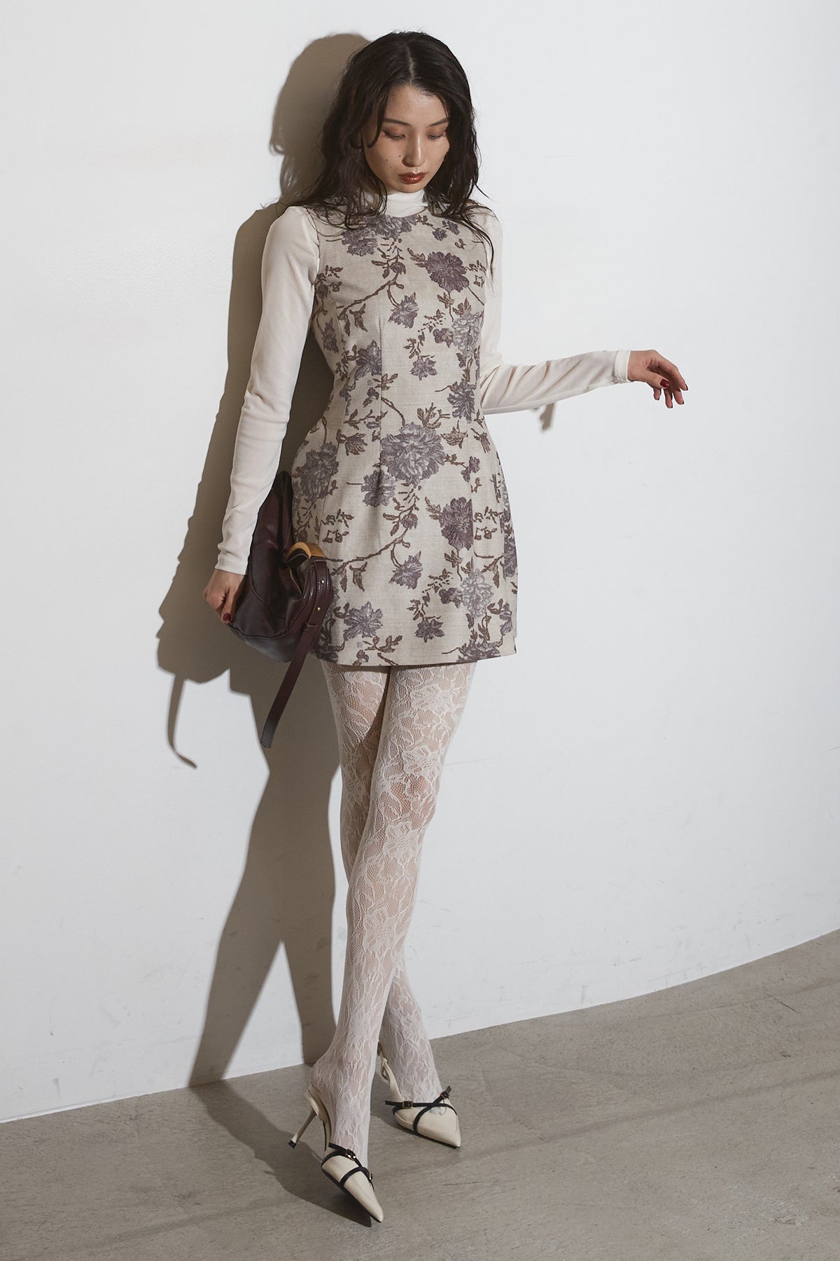 繊細なフラワーパターンが上品な印象を与えるノースリーブワンピース。 程よくハリのある生地感で、美しいシルエットをキープします。 一枚で着るのはもちろん、ジャケットやカーディガンを合わせて フォーマルにもデイリーにも活躍するアイテムです。