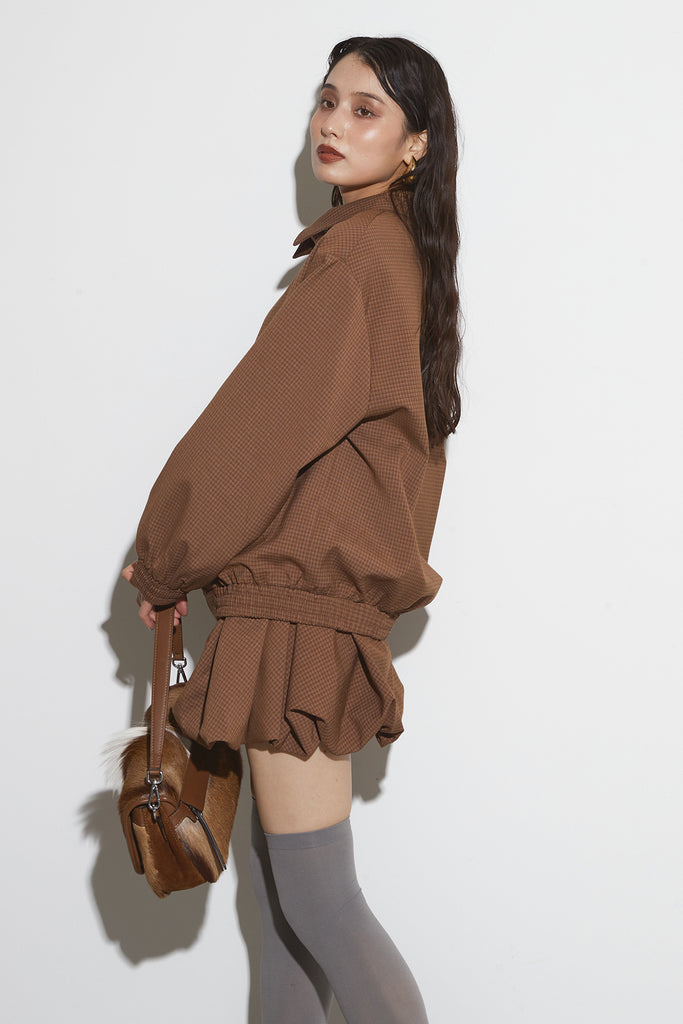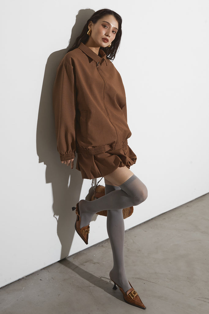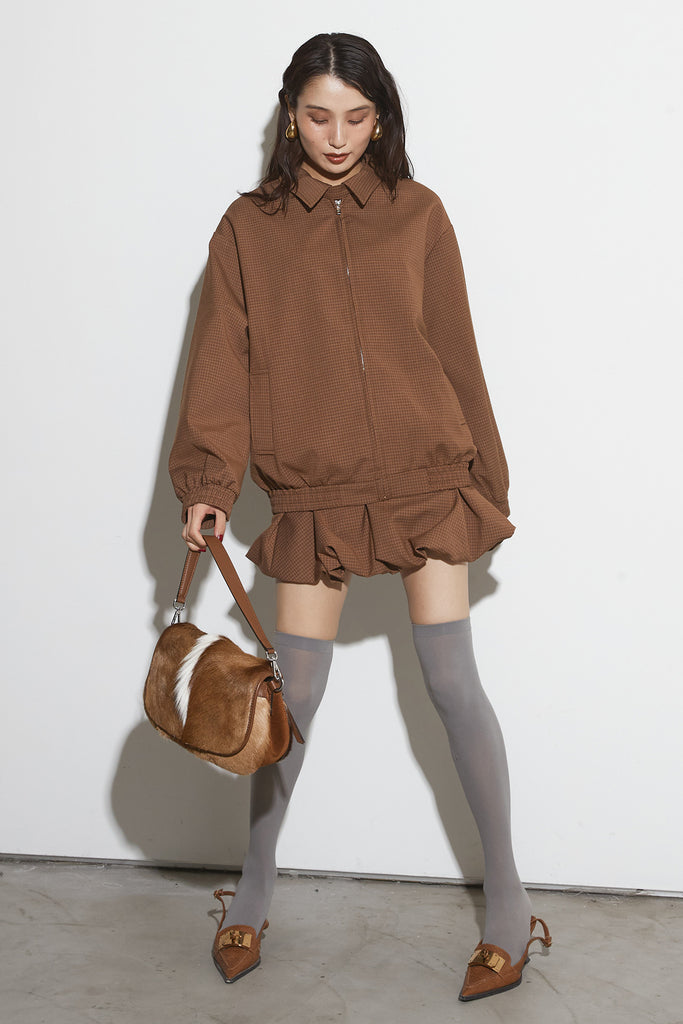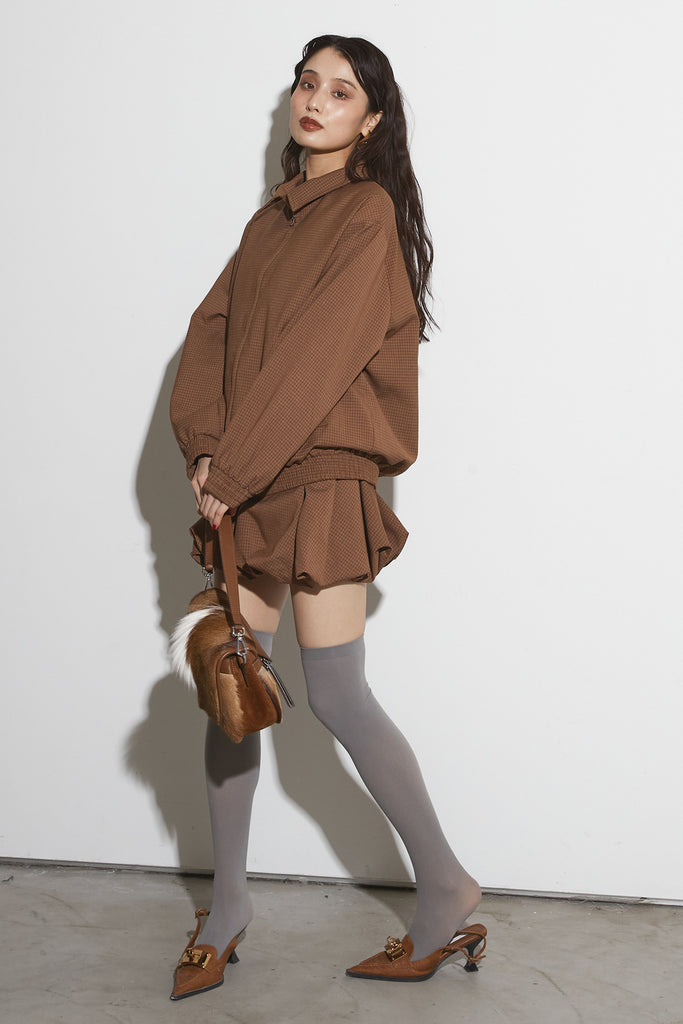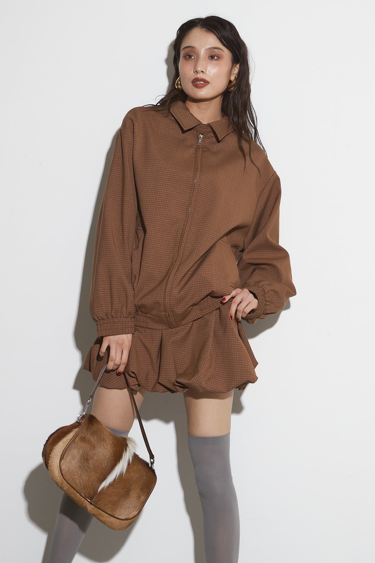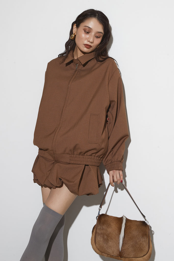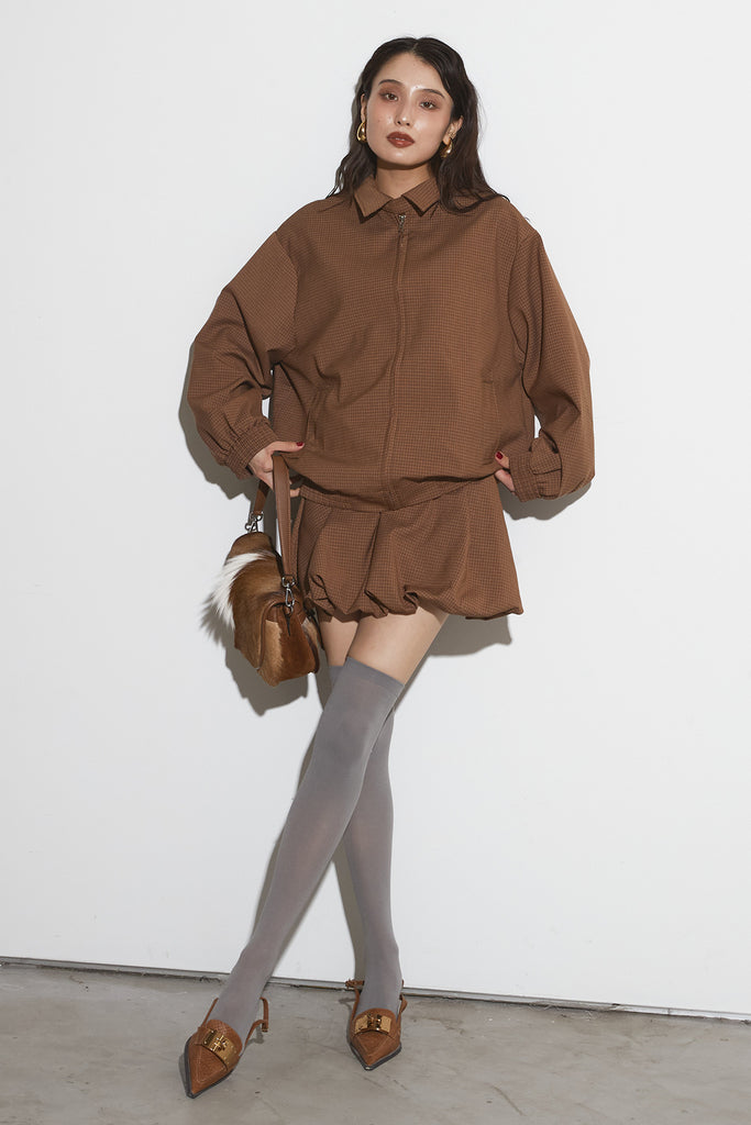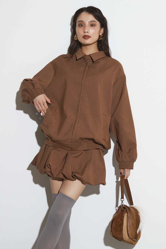 小さなチェック柄が上品な印象を与えるセットアップ。 ジップブルゾンは軽やかな着心地で、カジュアルにもきれいめにもマッチ。 ボリューム感のあるスカートが女性らしいシルエットを演出します。 それぞれ単体でも着回しやすく、スタイリングの幅が広がるアイテムです。