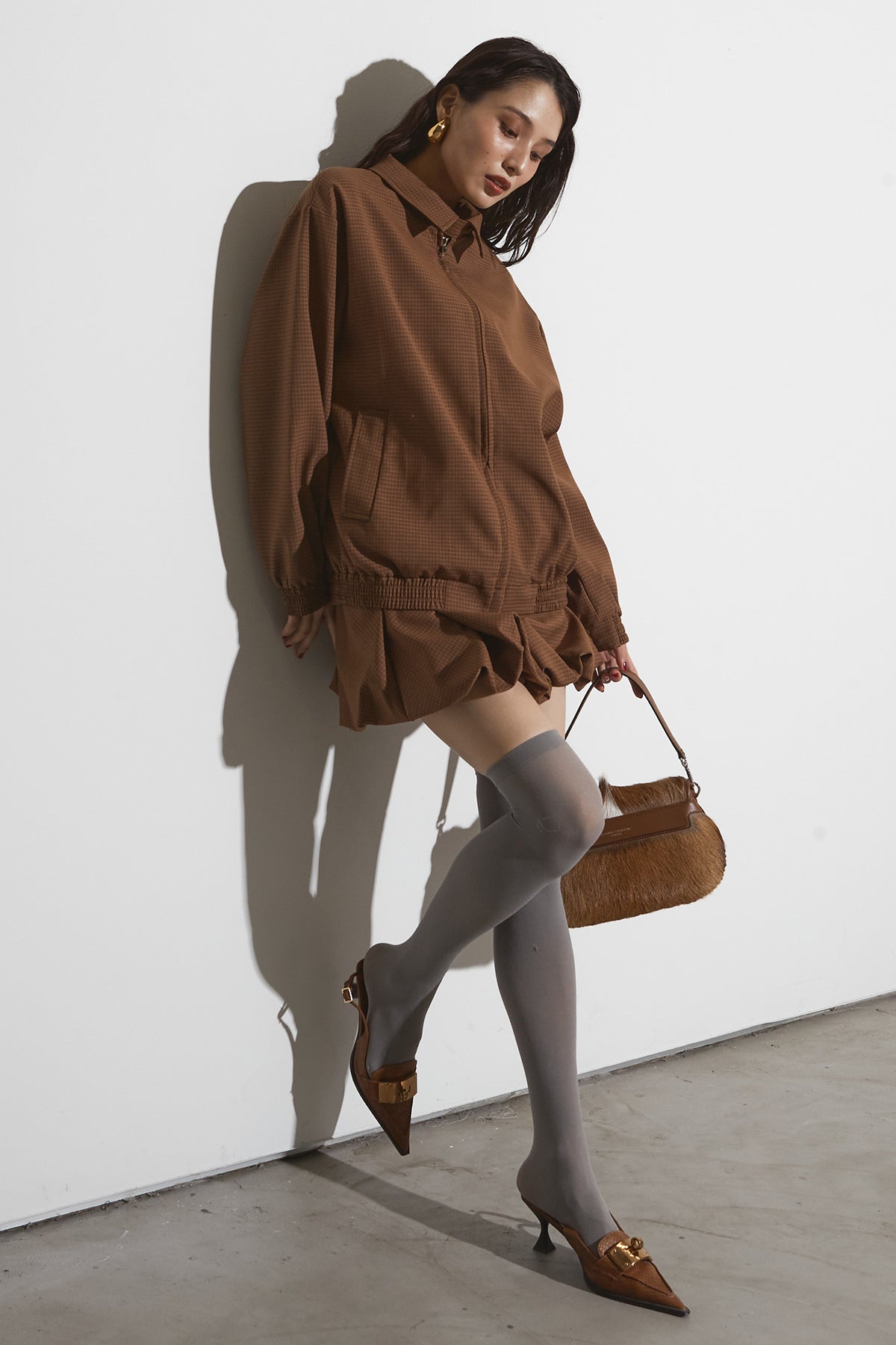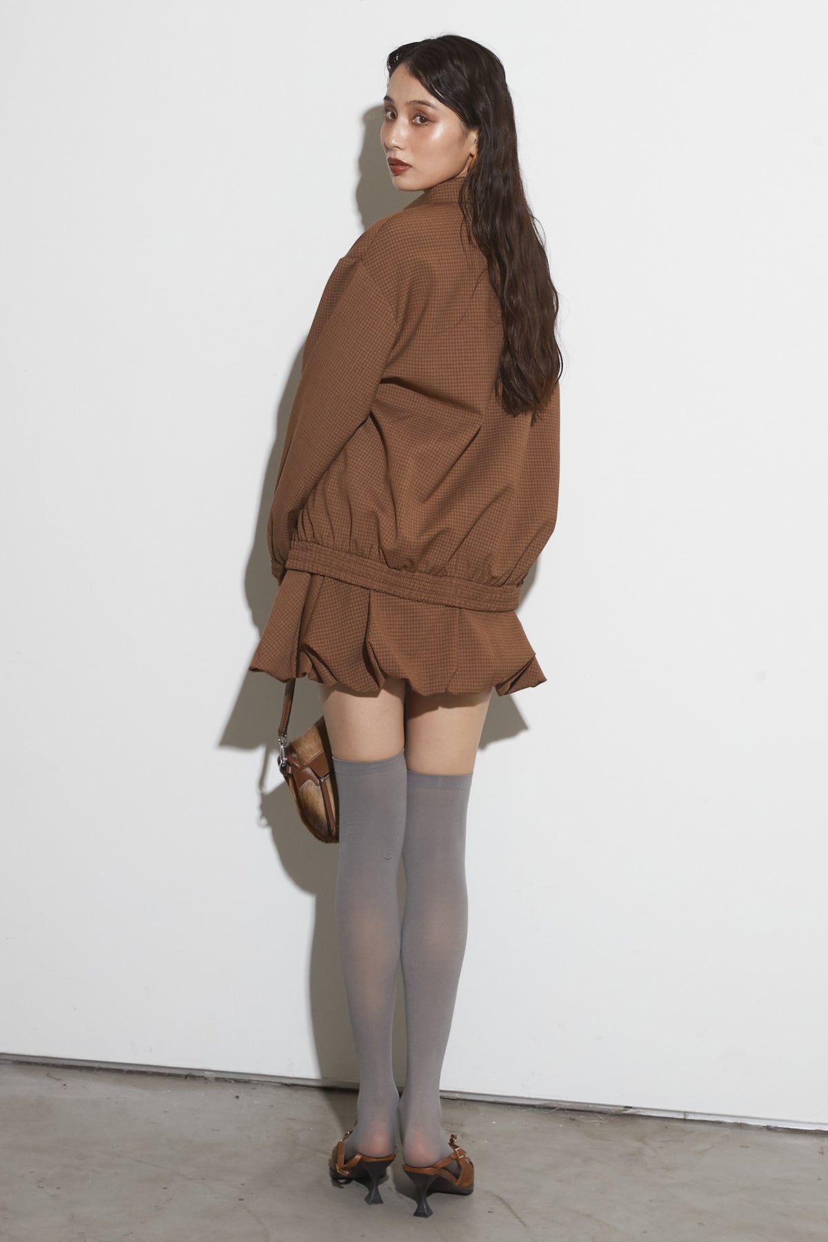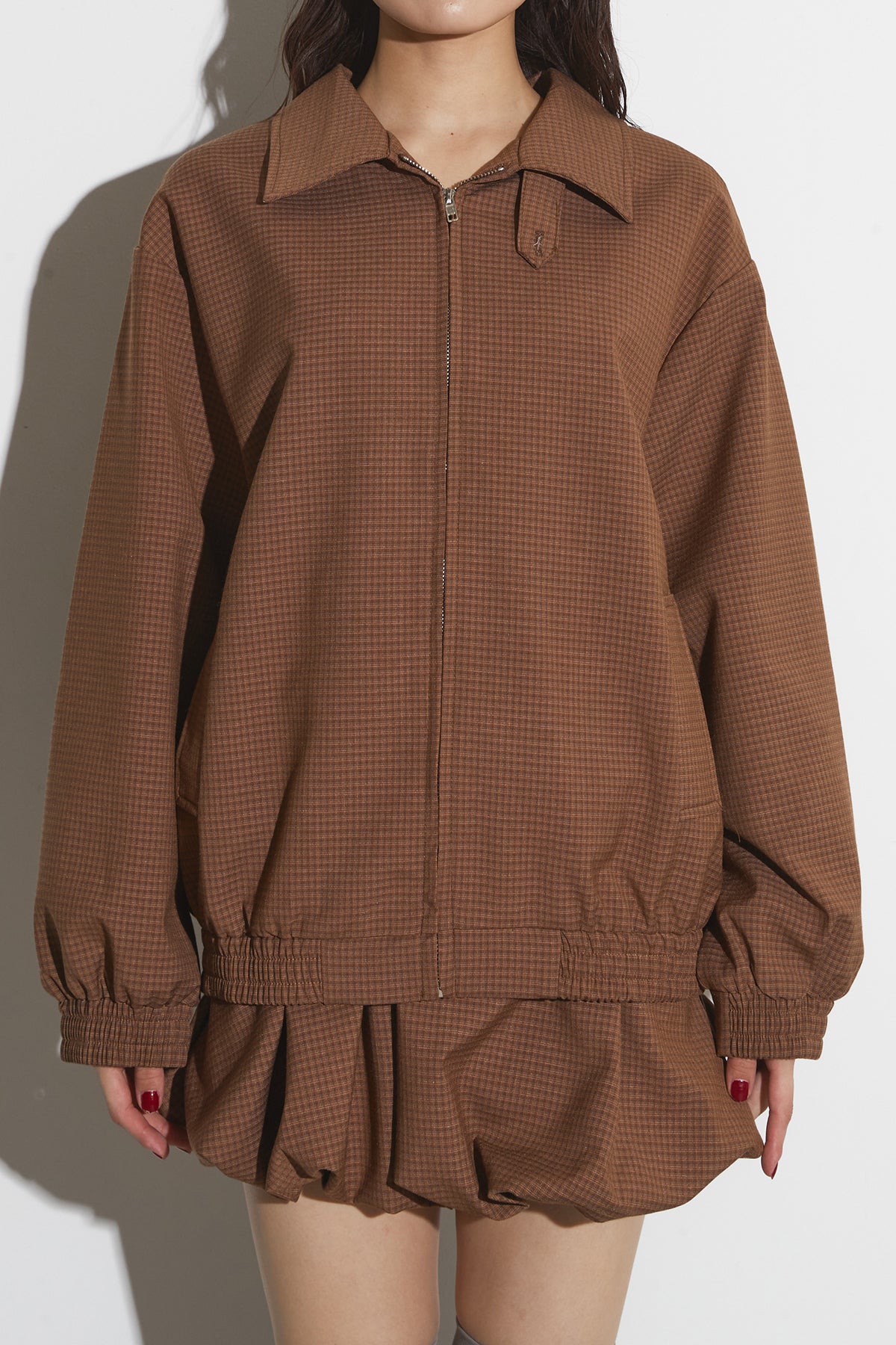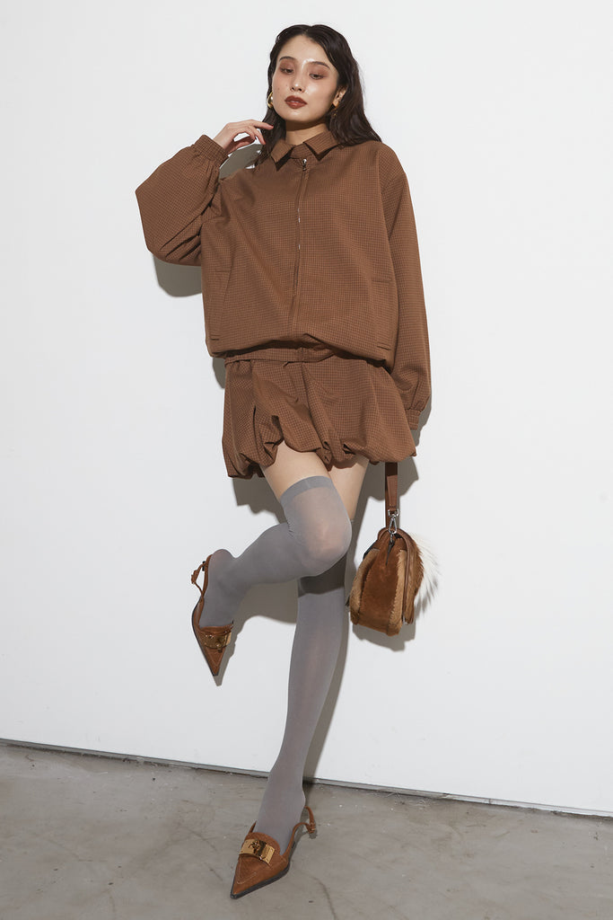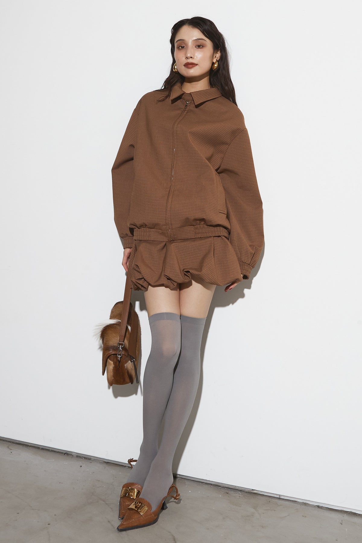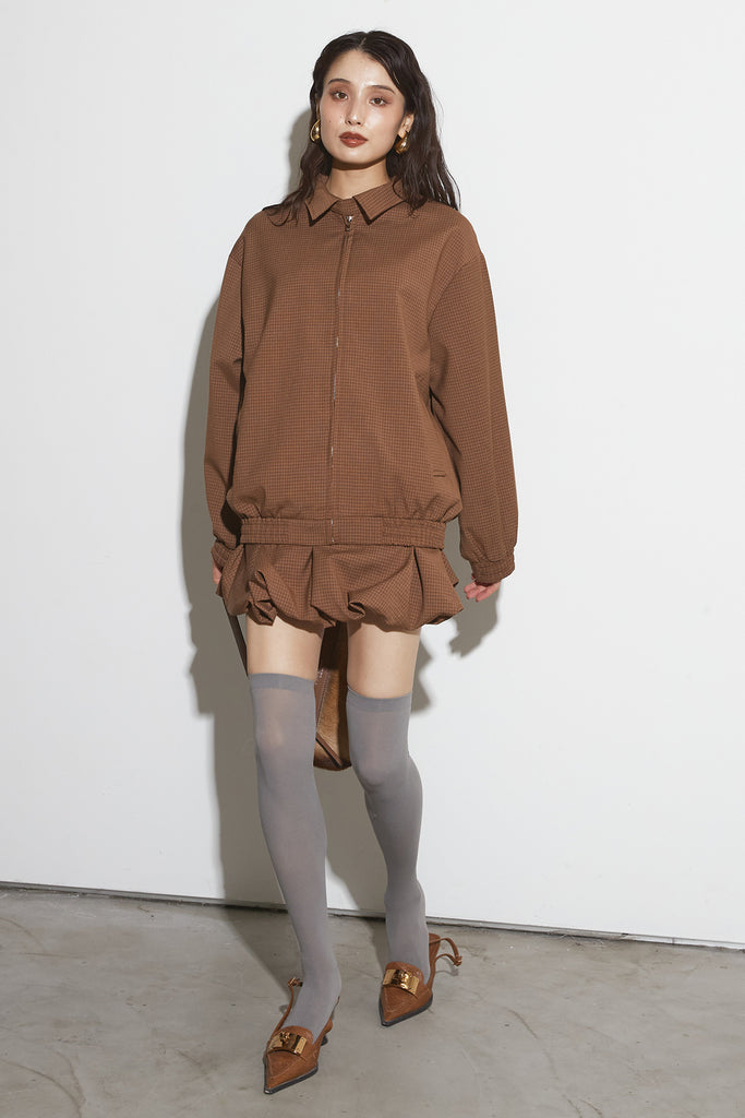小さなチェック柄が上品な印象を与えるセットアップ。 ジップブルゾンは軽やかな着心地で、カジュアルにもきれいめにもマッチ。 ボリューム感のあるスカートが女性らしいシルエットを演出します。 それぞれ単体でも着回しやすく、スタイリングの幅が広がるアイテムです。