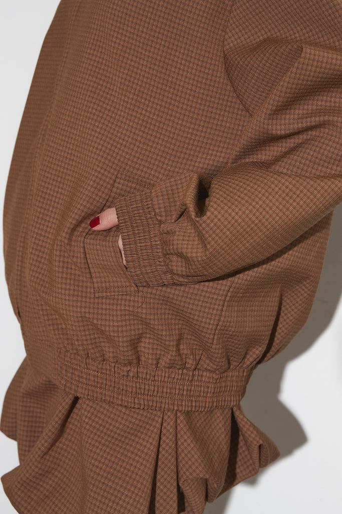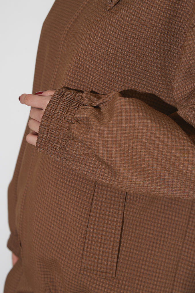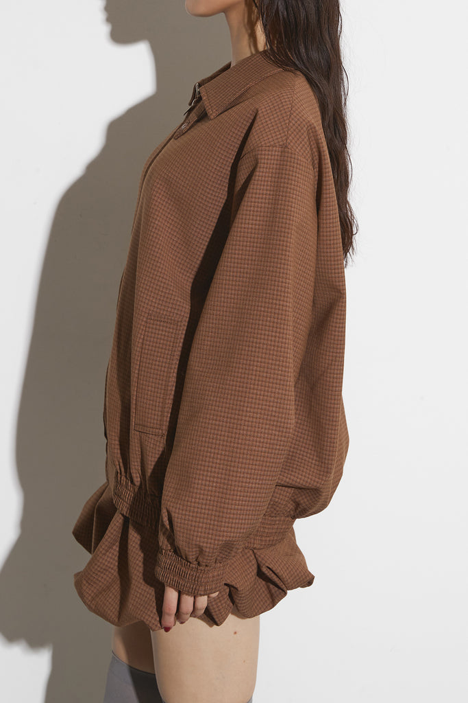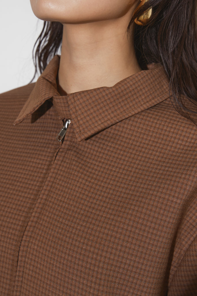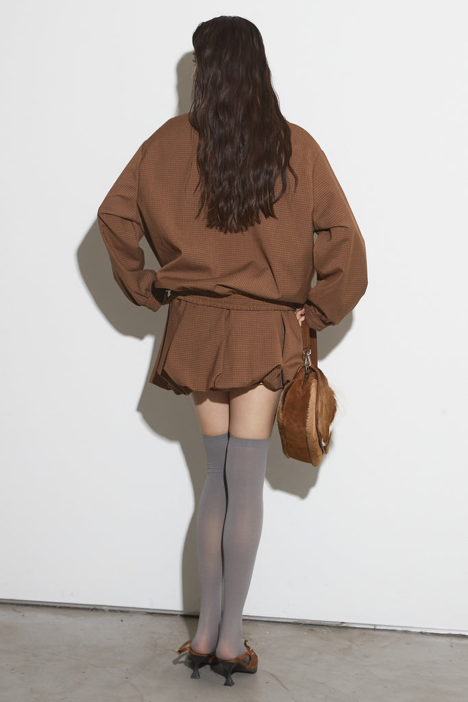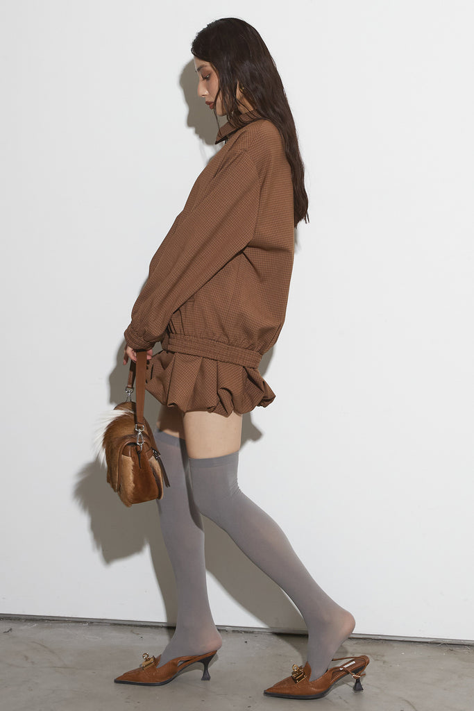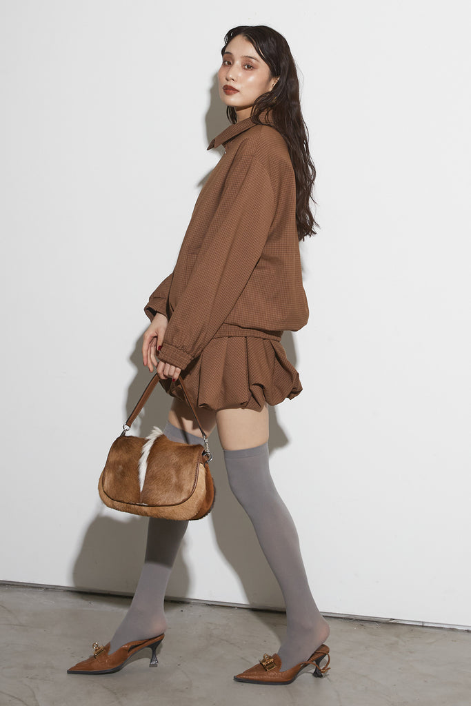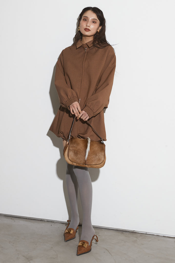 小さなチェック柄が上品な印象を与えるセットアップ。 ジップブルゾンは軽やかな着心地で、カジュアルにもきれいめにもマッチ。 ボリューム感のあるスカートが女性らしいシルエットを演出します。 それぞれ単体でも着回しやすく、スタイリングの幅が広がるアイテムです。