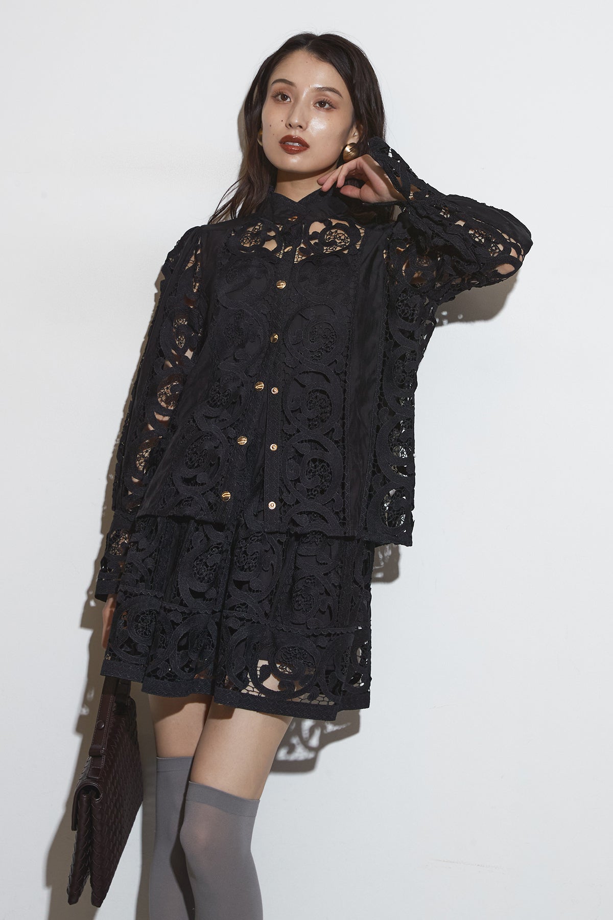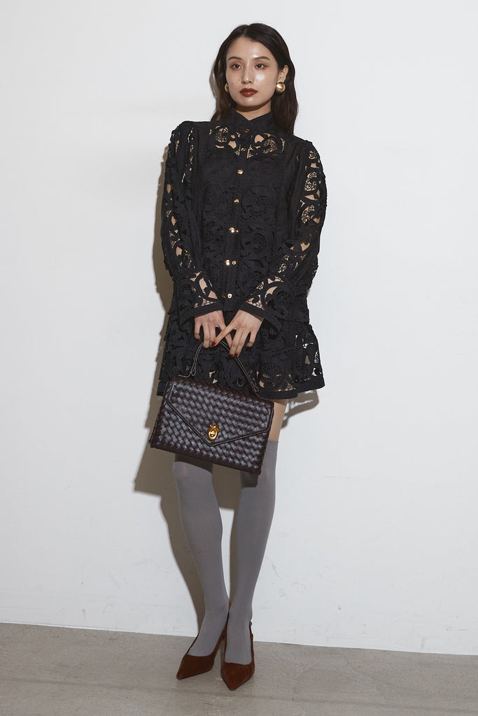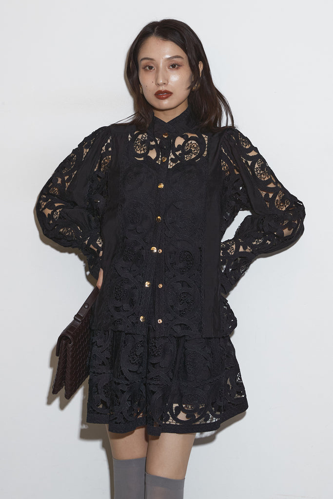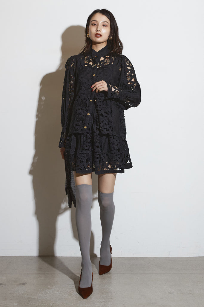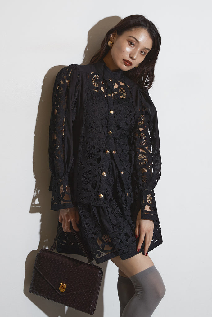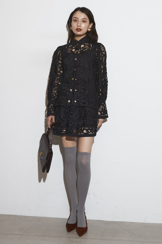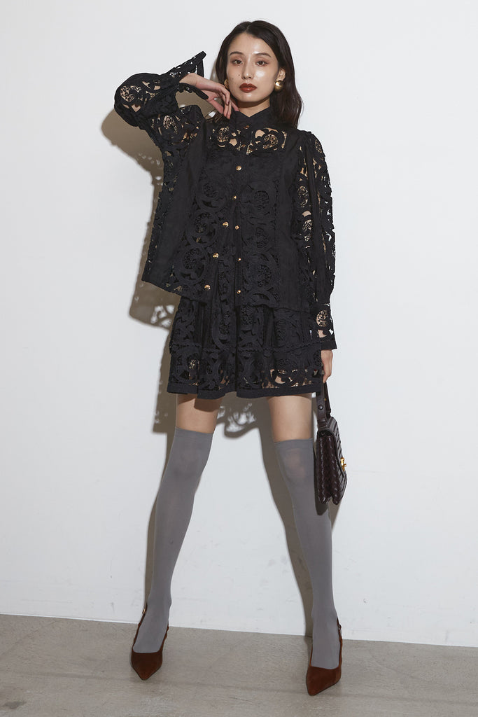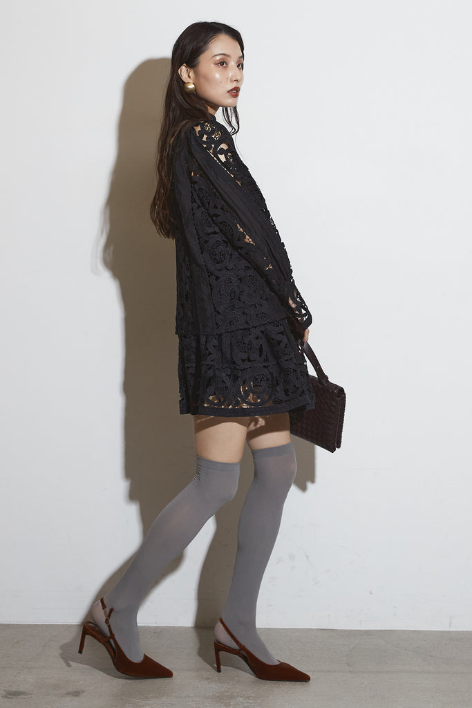 繊細なレースデザインが目を惹くセットアップ。 程よい透け感と立体的な柄が上品な印象を与え、 シンプルながらも存在感のあるスタイルを演出します。 セットではもちろん、単品使いでもコーディネートを華やかにしてくれるアイテムです。