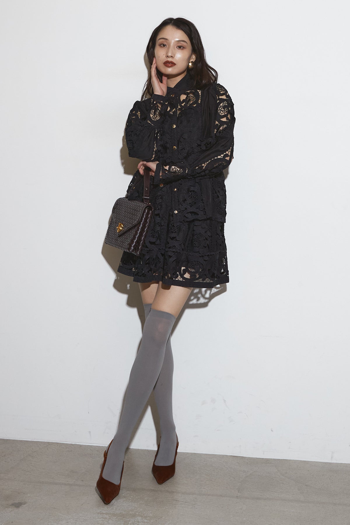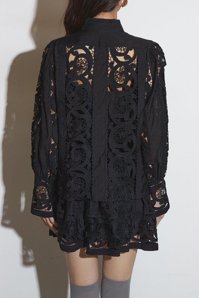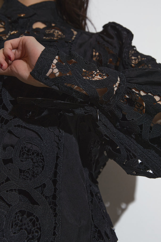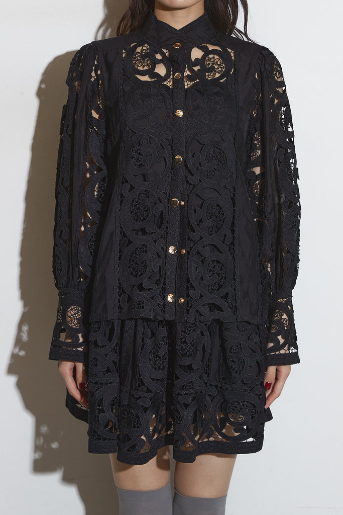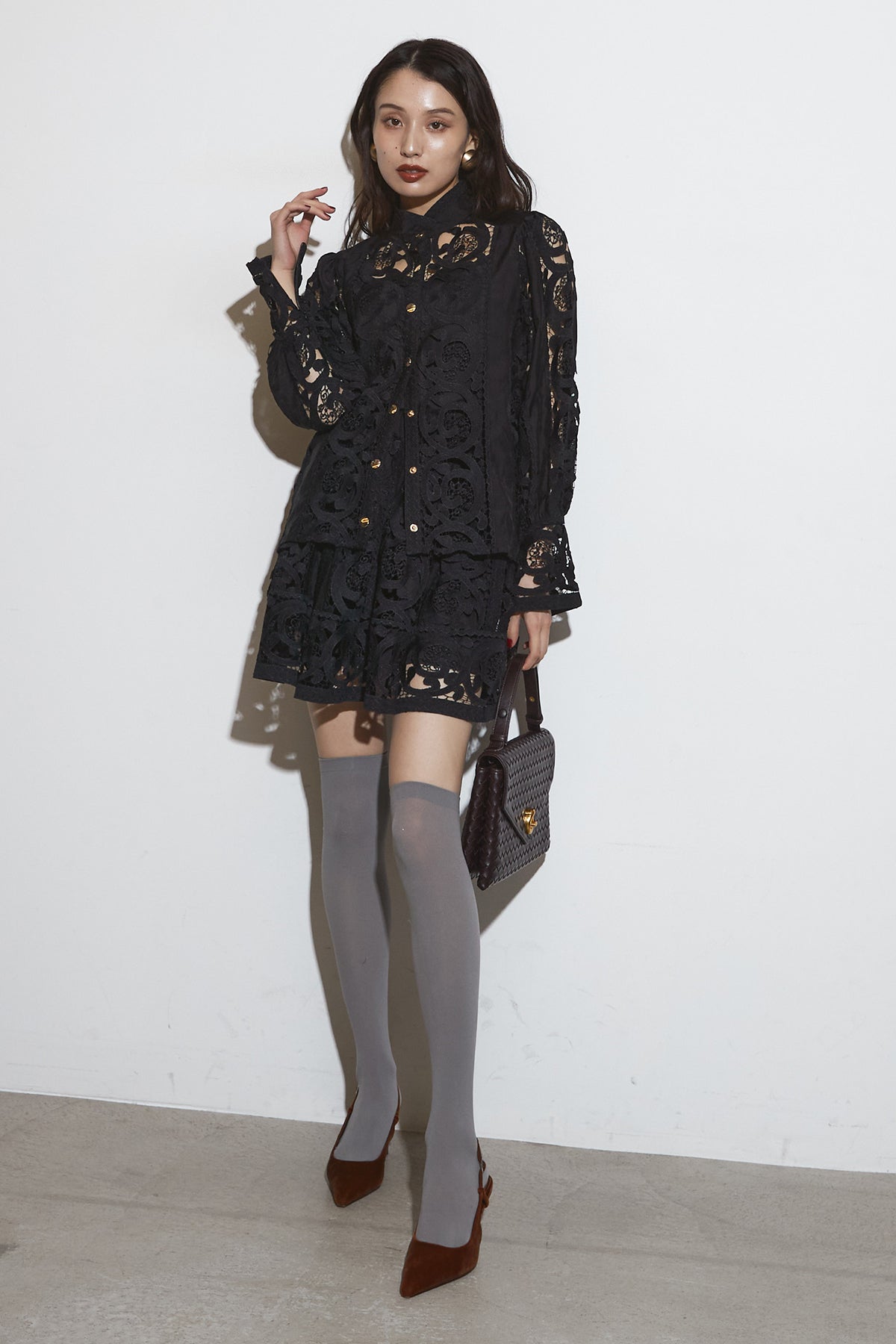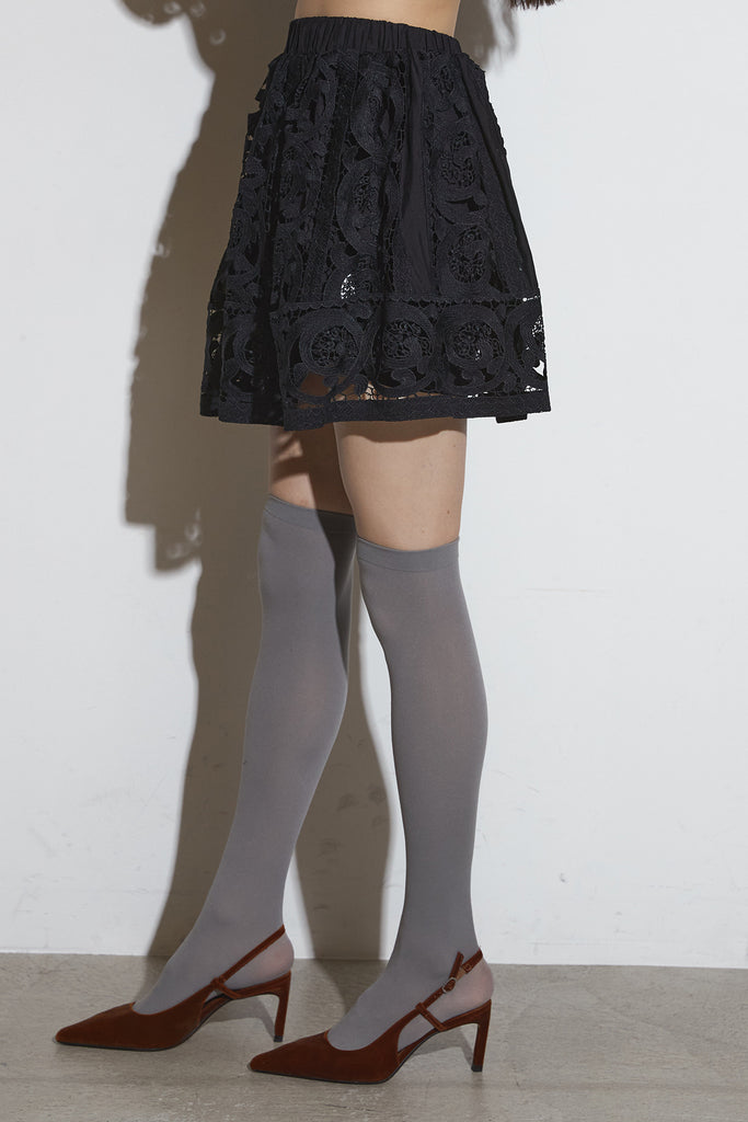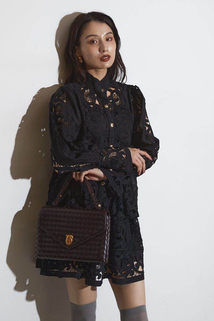 繊細なレースデザインが目を惹くセットアップ。 程よい透け感と立体的な柄が上品な印象を与え、 シンプルながらも存在感のあるスタイルを演出します。 セットではもちろん、単品使いでもコーディネートを華やかにしてくれるアイテムです。