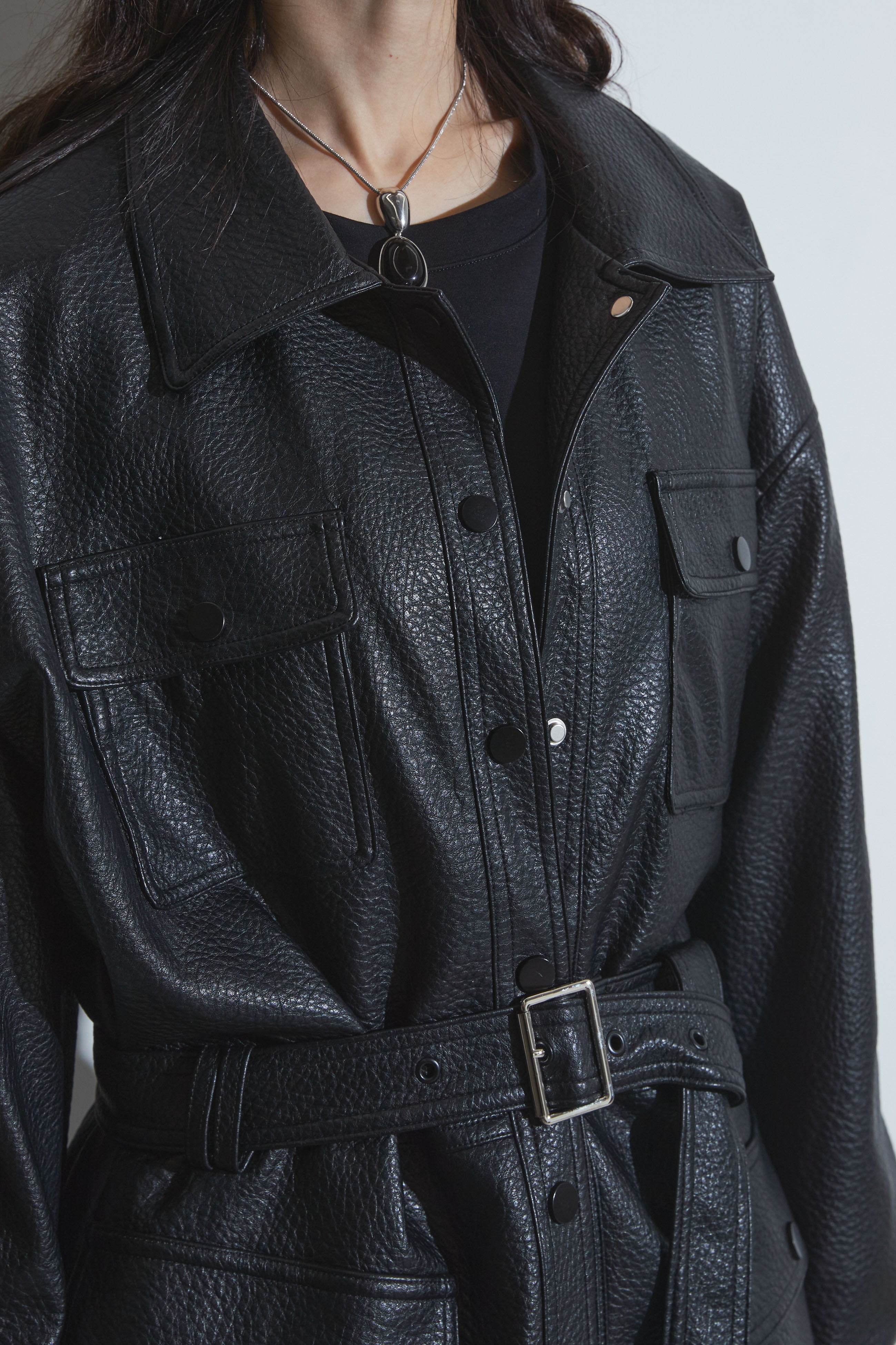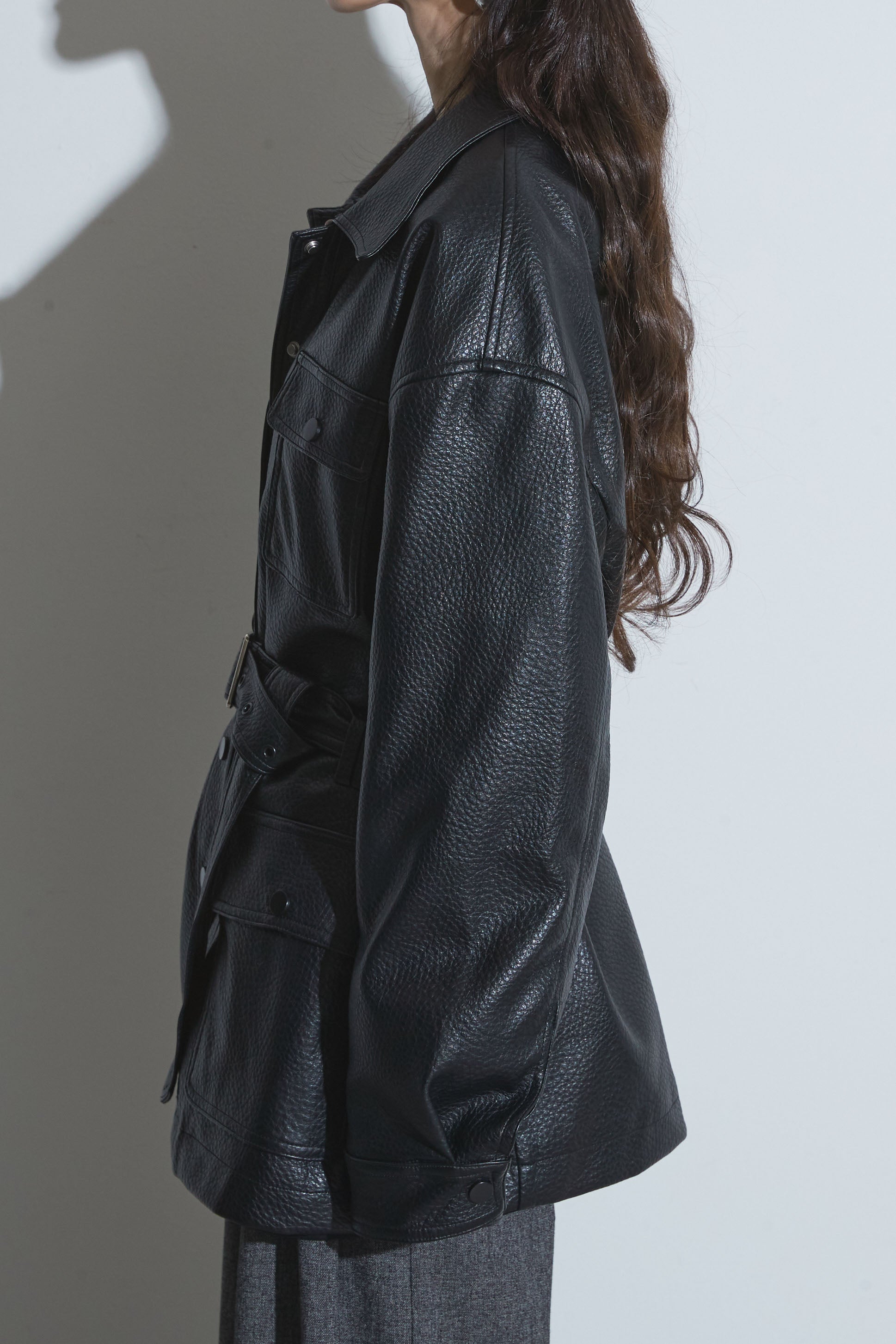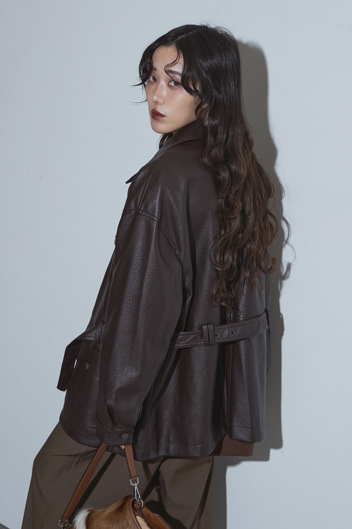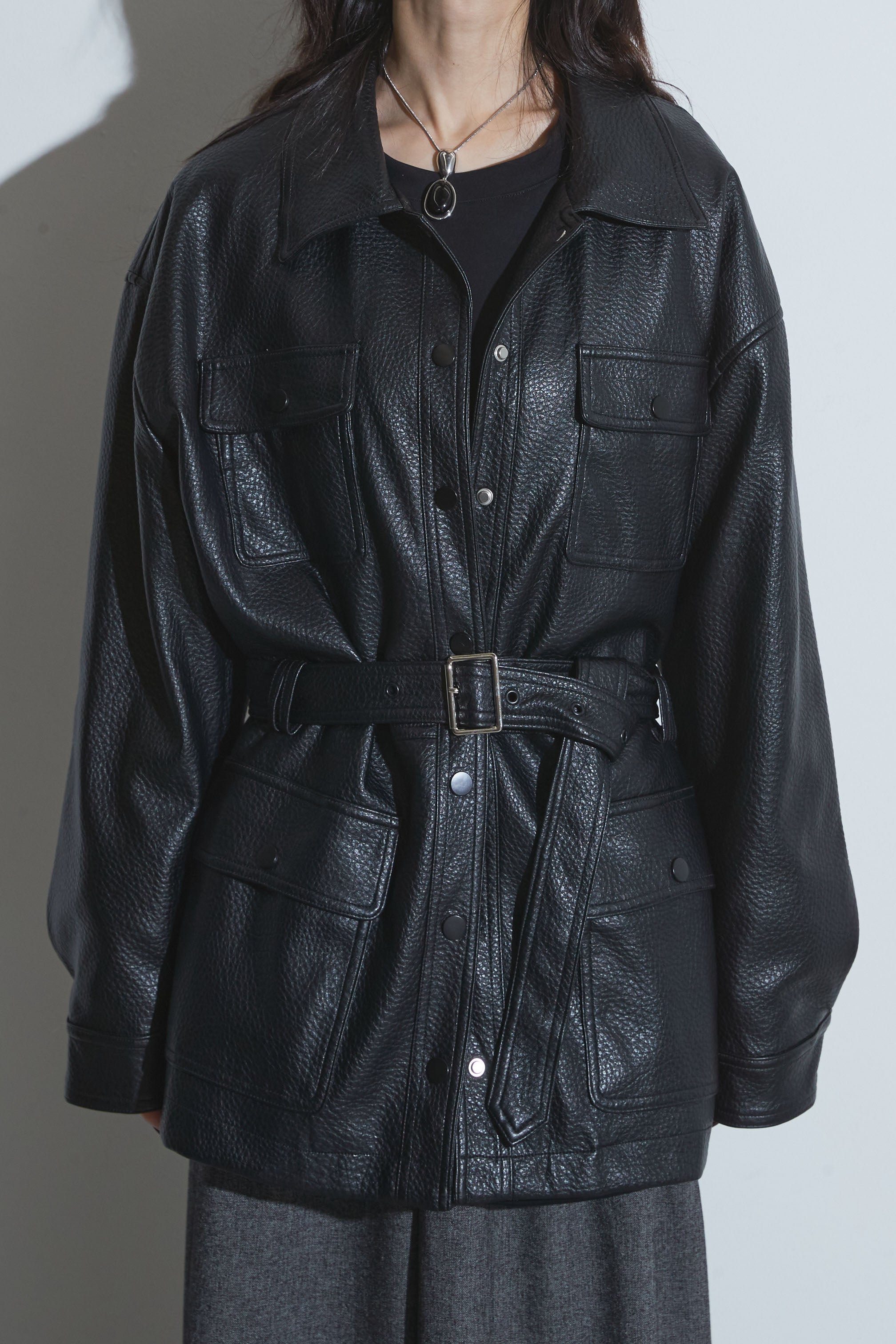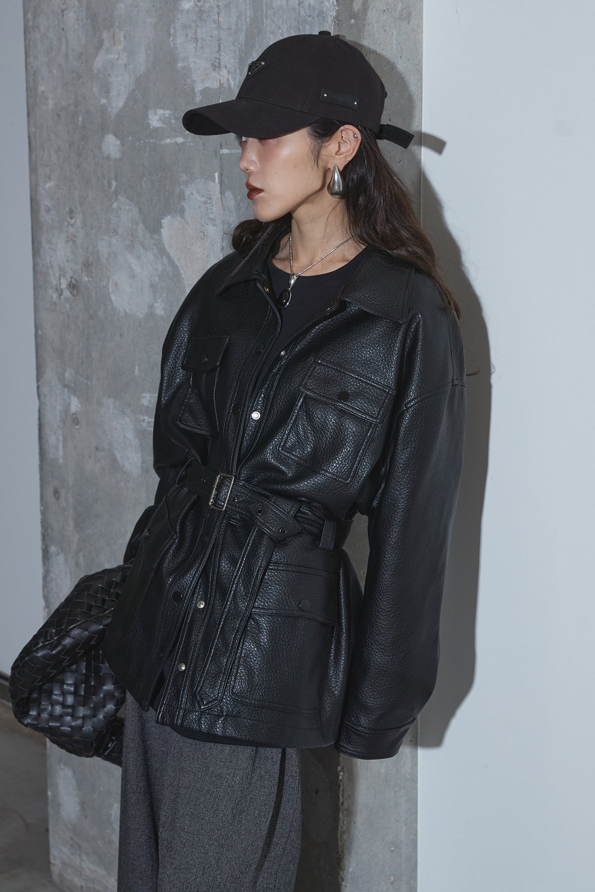 "上質なフェイクレザーを使用した、程よい光沢感とハリのある風合いが魅力のレザージャケット。 ワークテイストなポケットデザインに、ウエストベルトをプラスすることで スタイリッシュかつ女性らしいシルエットを演出。 ゆったりとしたオーバーサイズで、インナーを選ばず着こなしやすい万能アイテムです。 ハードすぎず、程よくラグジュアリーな印象に仕上げた一着。"