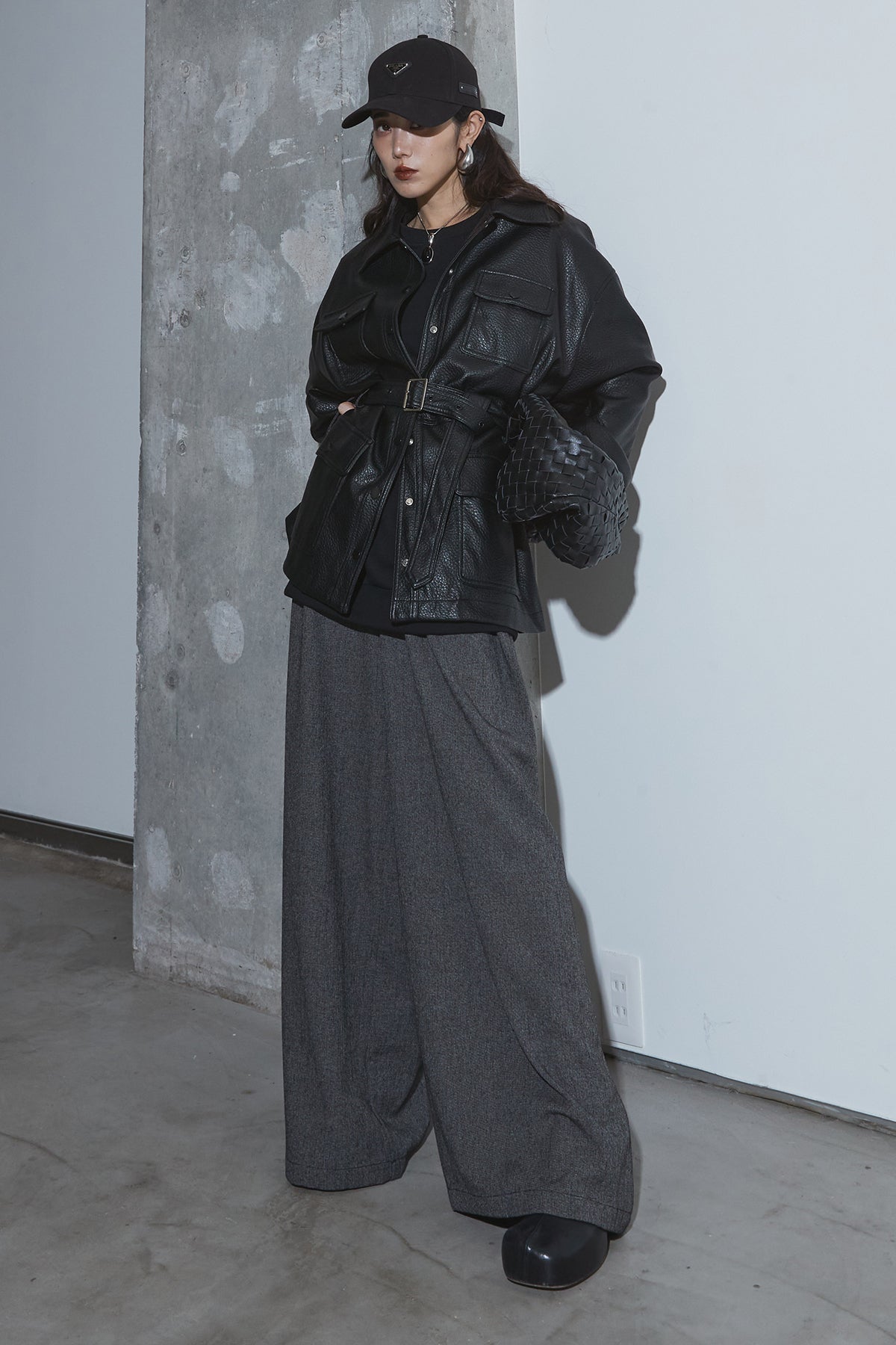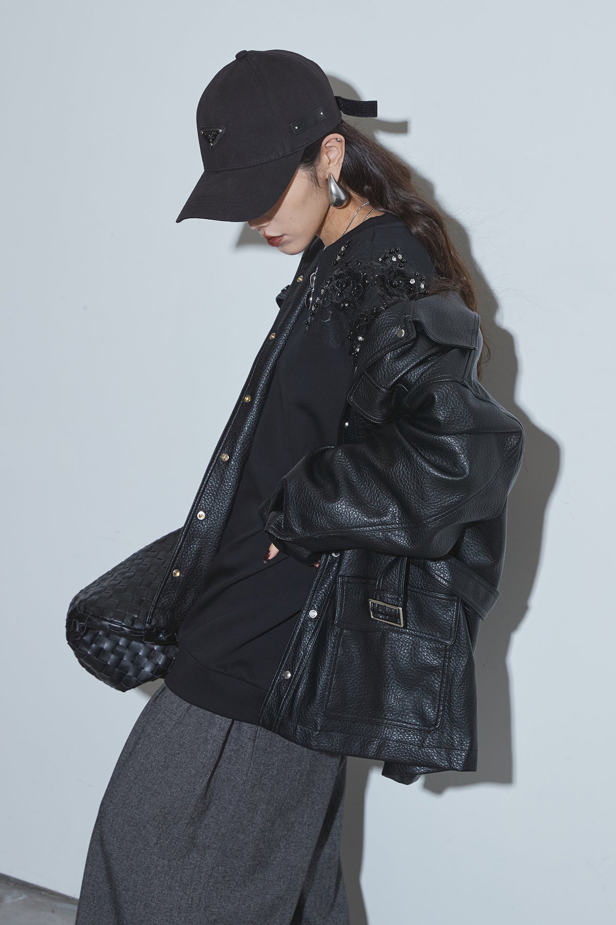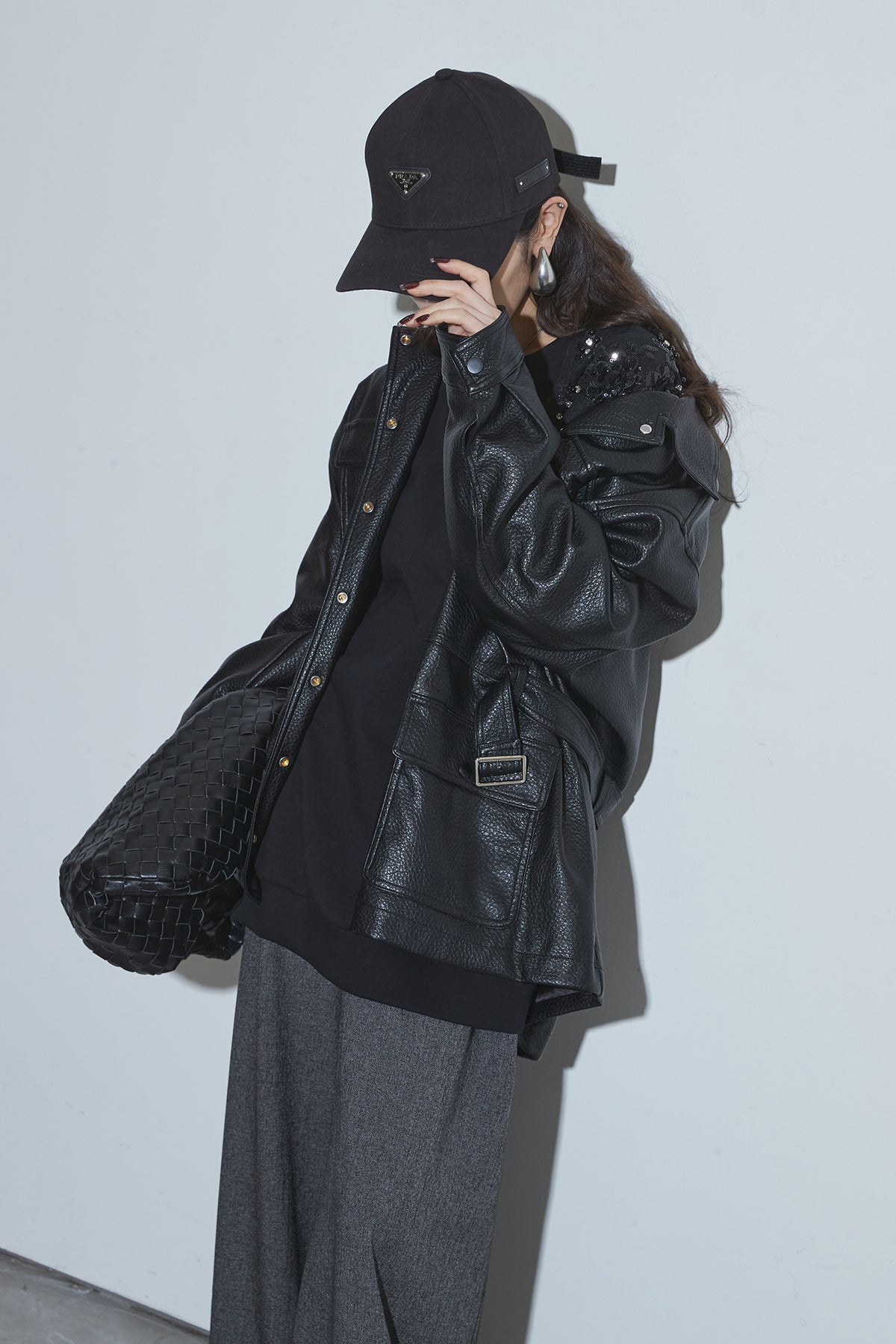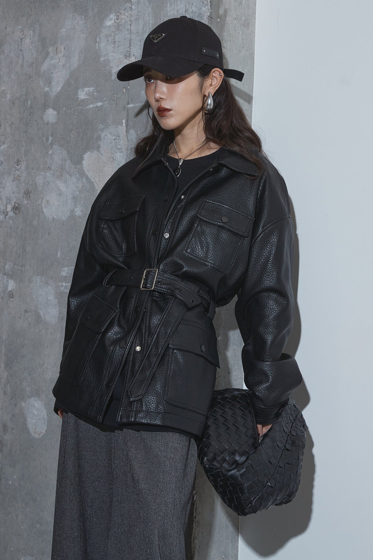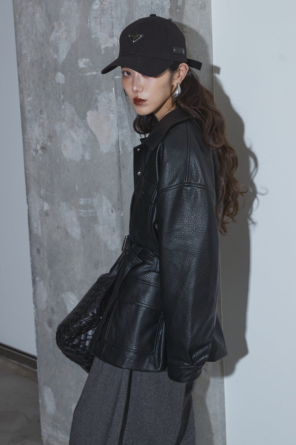 "上質なフェイクレザーを使用した、程よい光沢感とハリのある風合いが魅力のレザージャケット。 ワークテイストなポケットデザインに、ウエストベルトをプラスすることで スタイリッシュかつ女性らしいシルエットを演出。 ゆったりとしたオーバーサイズで、インナーを選ばず着こなしやすい万能アイテムです。 ハードすぎず、程よくラグジュアリーな印象に仕上げた一着。"