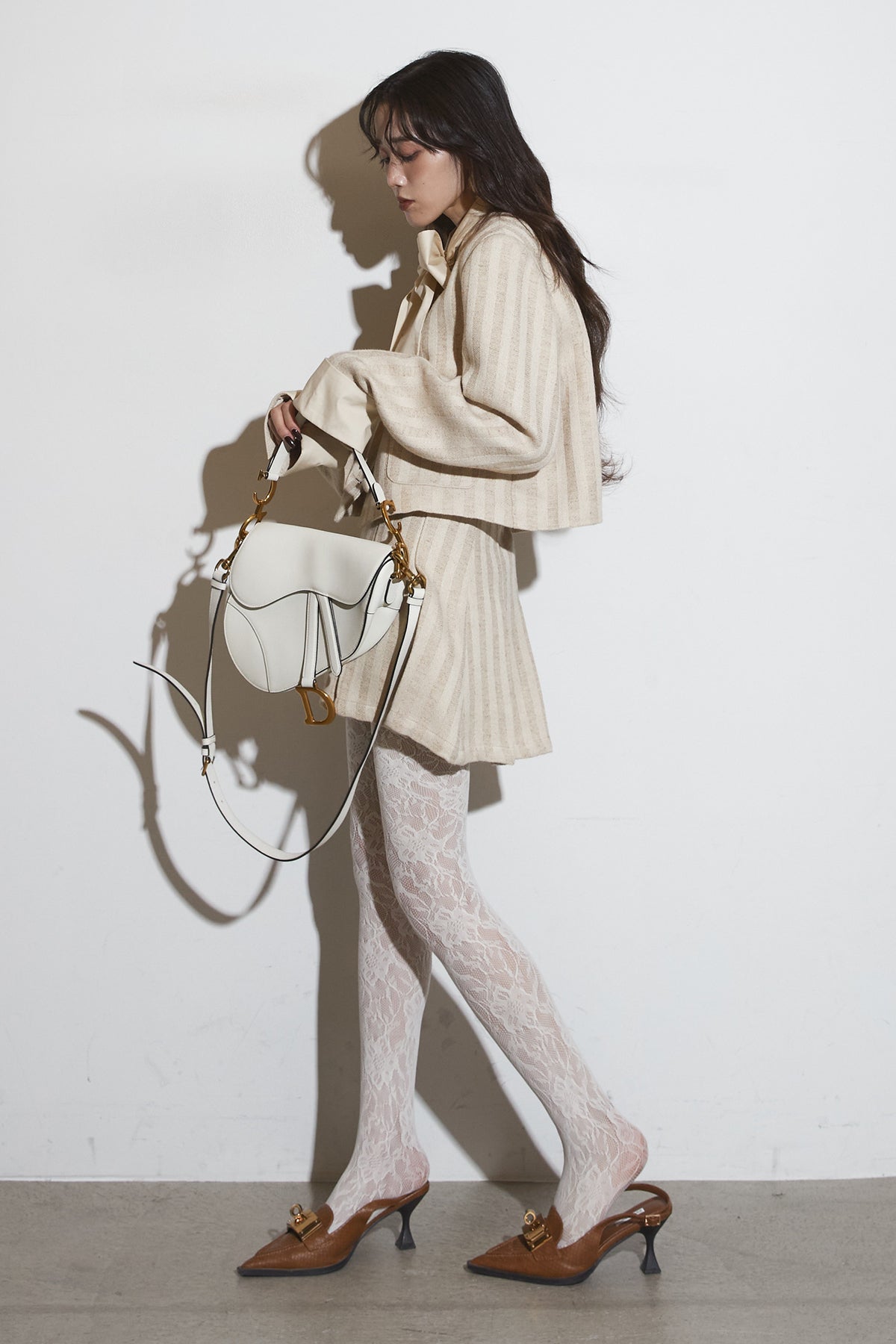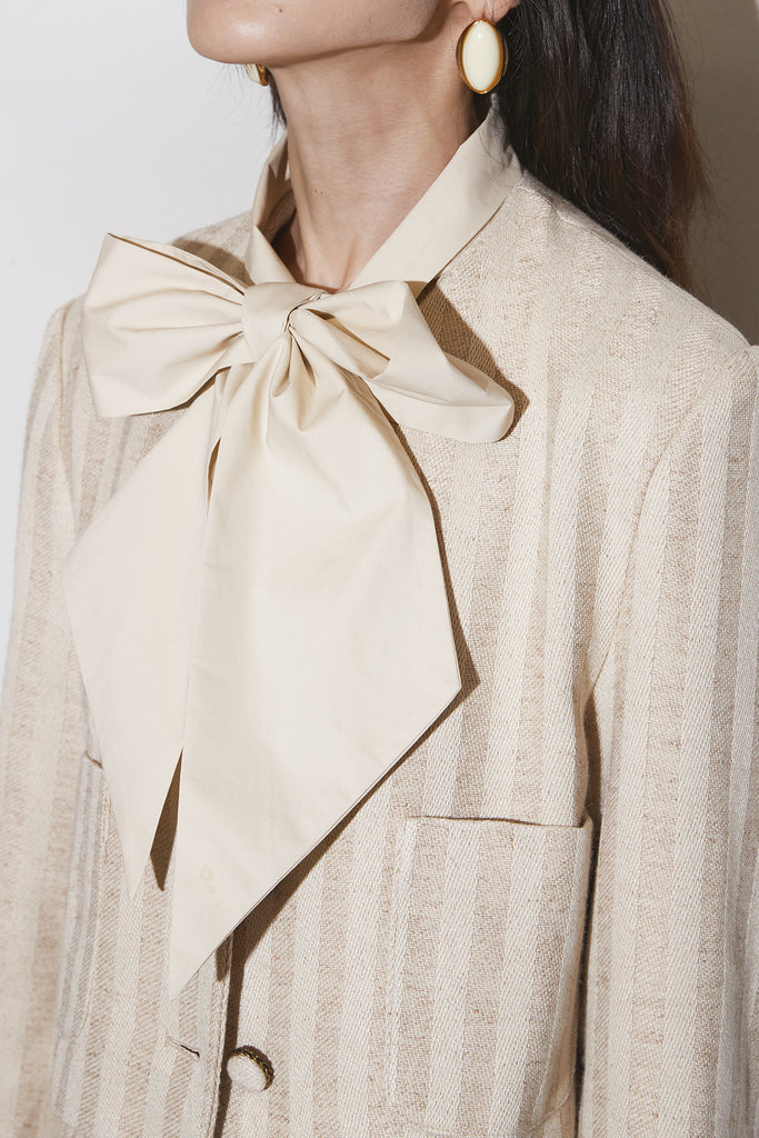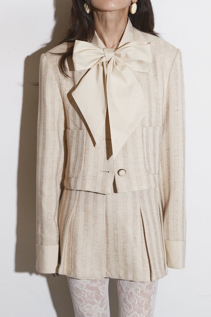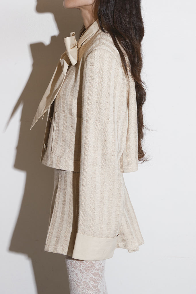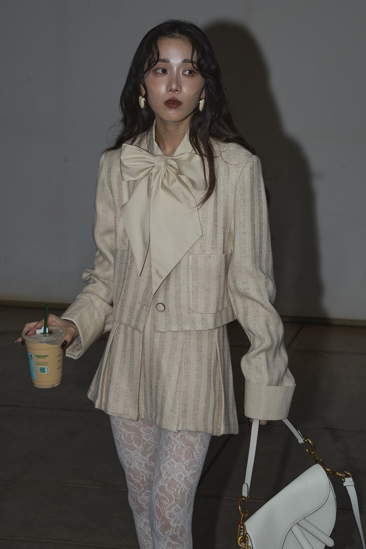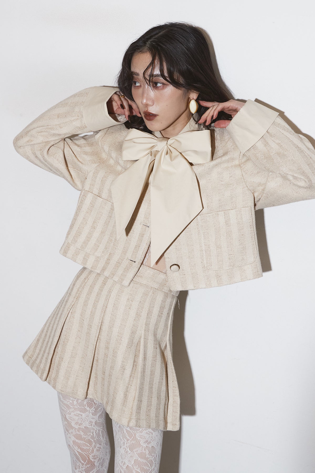 上品な印象を与えるセットアップ。 コンパクトなジャケットと、動きのあるショート丈ボトムのバランスが新鮮なスタイルです。 シンプルなデザインの中に、立体的なシルエットと細部のディテールが映える一着。 セットでの着用はもちろん、それぞれ単品でも着回しの幅が広がります。