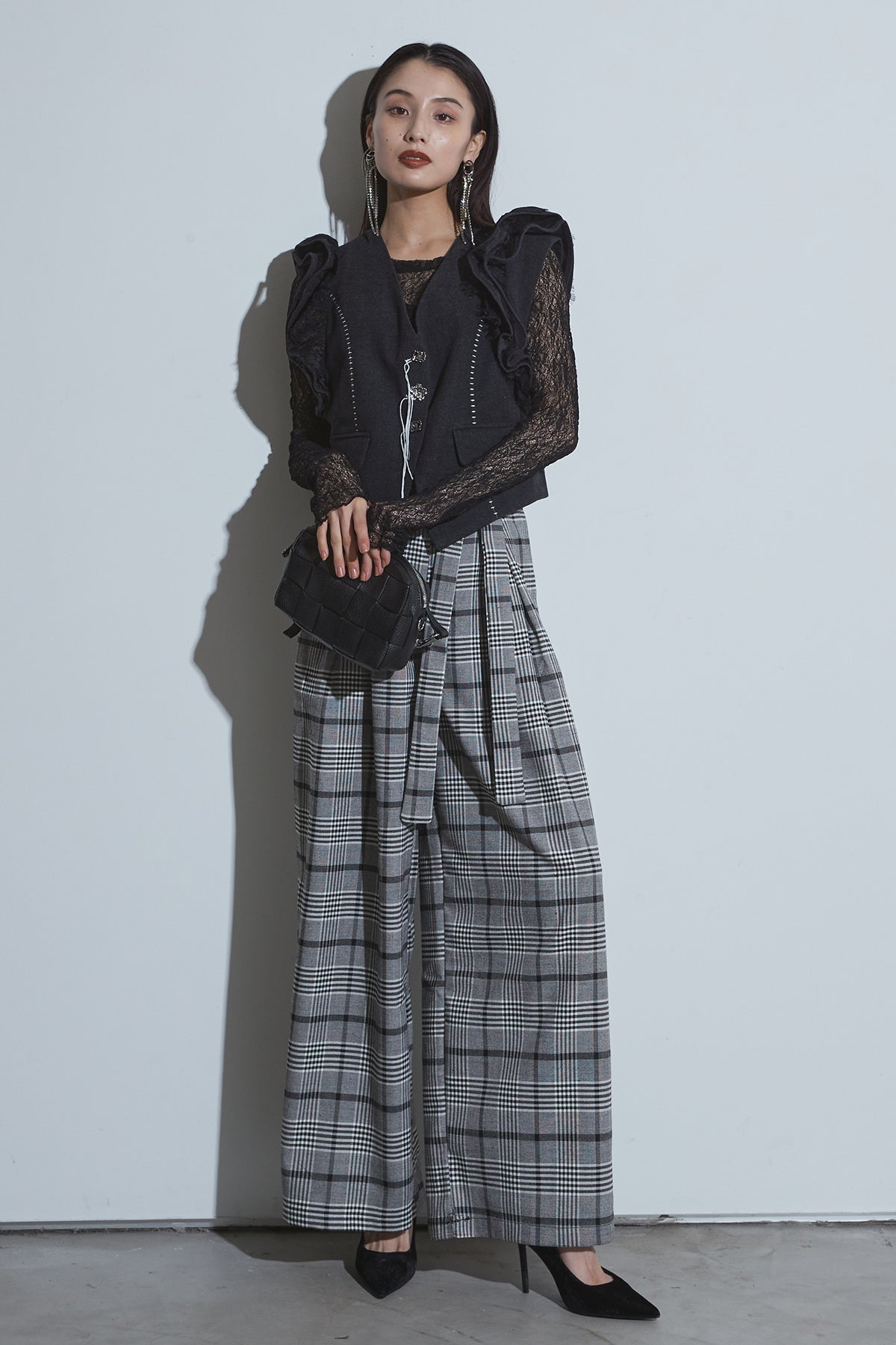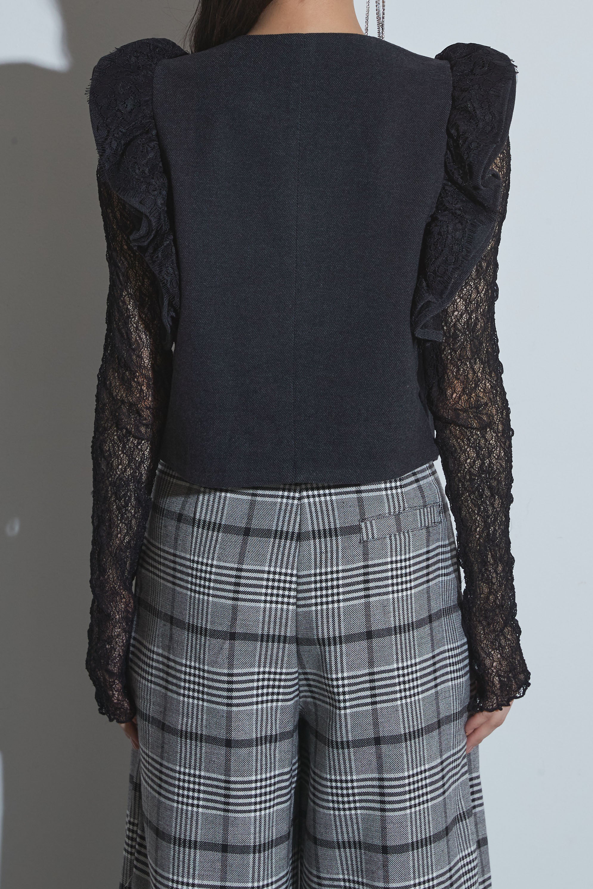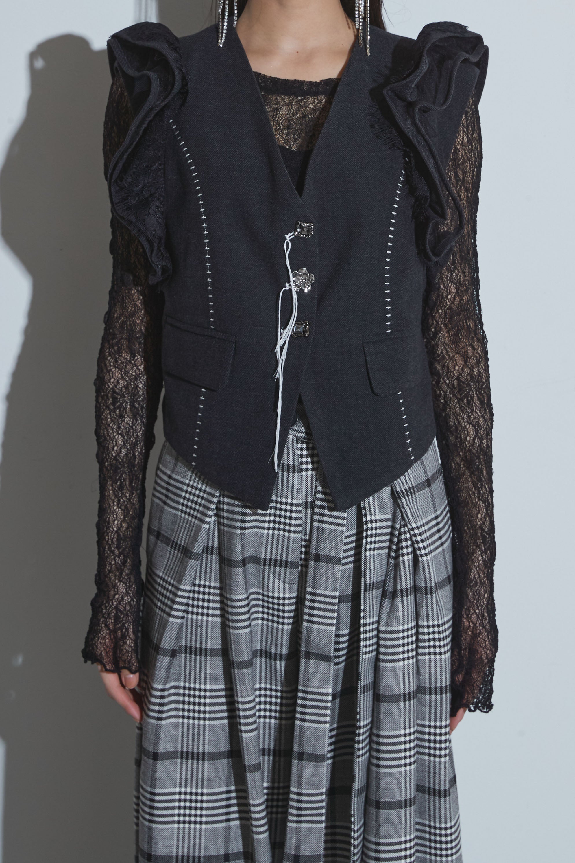 "クラシカルなテーラードベストに、立体的なフリルを大胆にあしらったデザインベスト。 ショルダーから流れるようなフリルラインがシルエットに動きを与え、 レースインナーとのレイヤードで女性らしさとエッジィさを両立させます。 フロントのメタルボタンや配色ステッチがディテールにモードなアクセントをプラス。 一枚で主役になる、存在感のあるアイテムです。 "