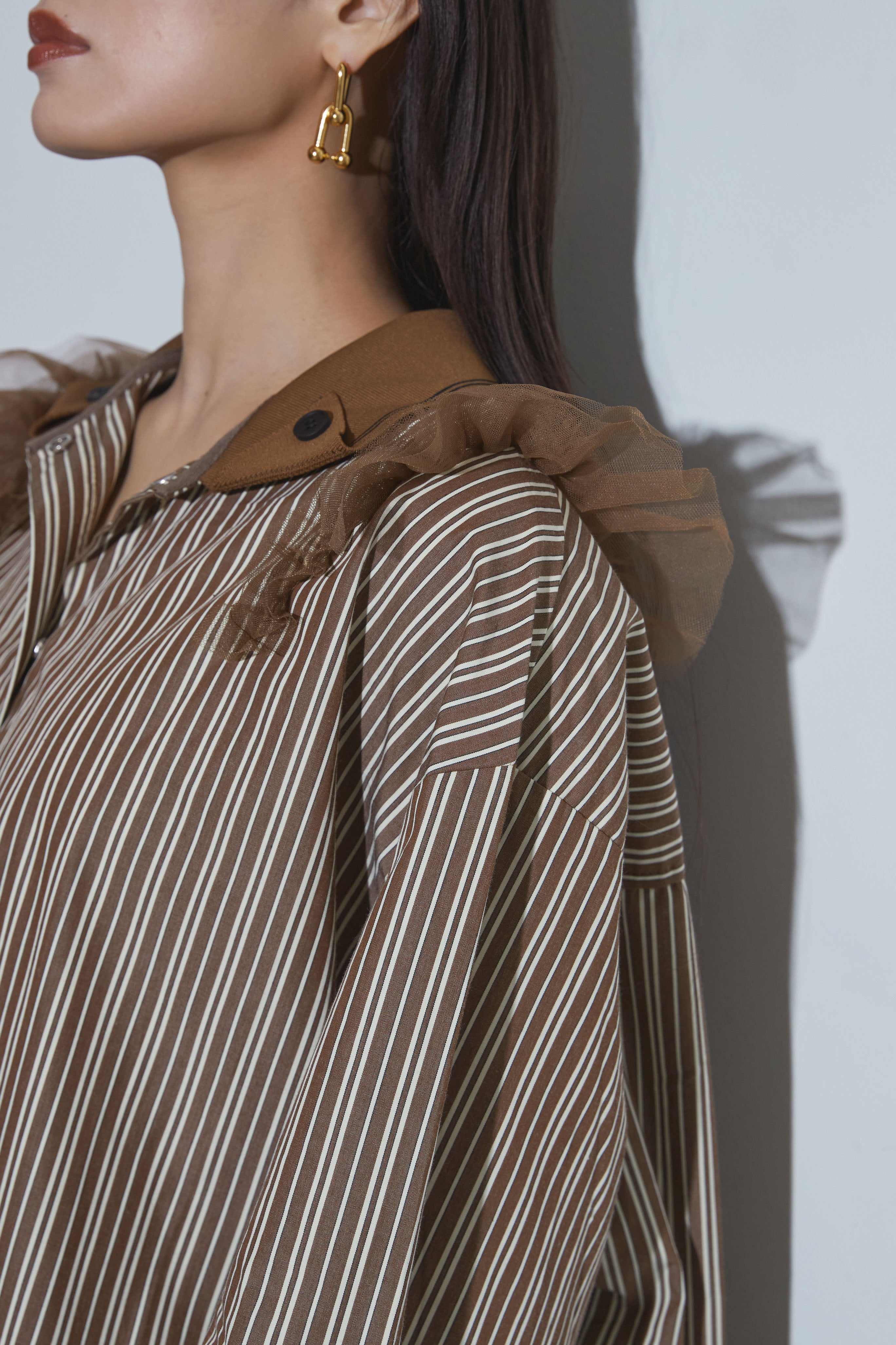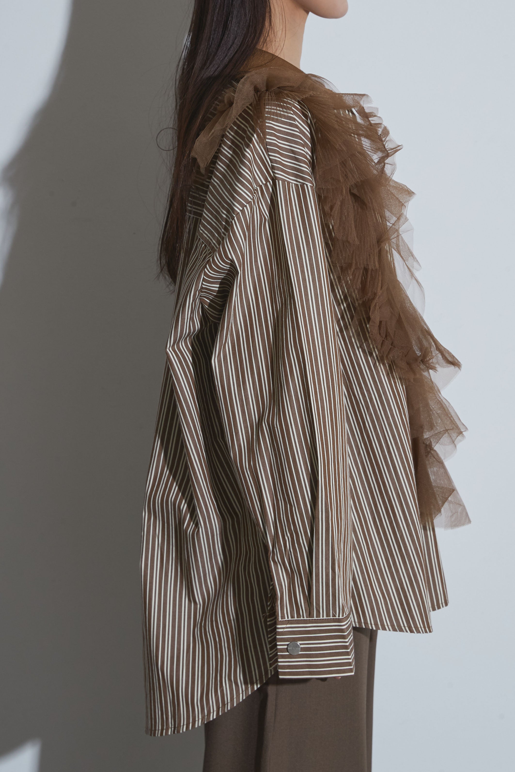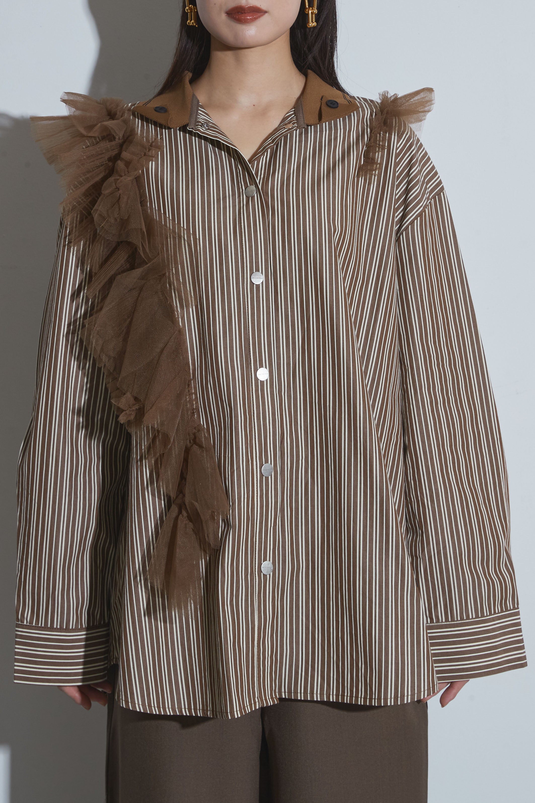 "ストライプ柄に軽やかなチュールフリルを大胆にあしらったデザインシャツ。 メンズライクなシャツにフェミニンな要素をプラスし、甘辛バランスの取れた一枚に仕上げました。 ややオーバーサイズのシルエットで、抜け感のある着こなしが可能。 一枚ではもちろん、ジャケットのインナーとしてフリルをアクセントにしたスタイリングもおすすめです。 "