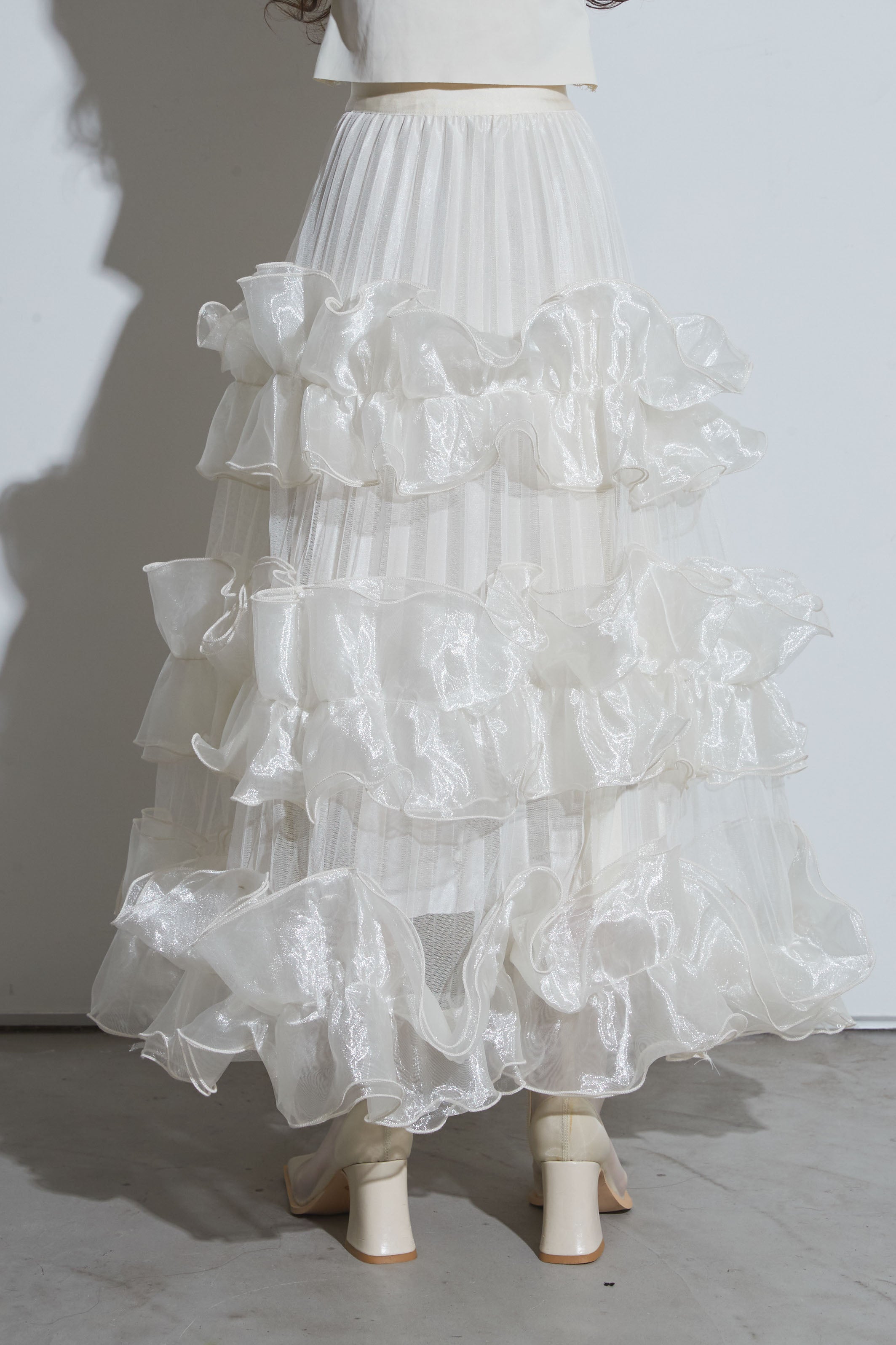 "軽やかなオーガンジー素材を贅沢に使用した、ボリュームティアードスカート。 透け感のあるフリルが立体的に重なり、動くたびに表情を変えるデザインです。 ウエストはゴム仕様でリラックス感がありつつも、 女性らしいドラマティックなシルエットを演出。 シンプルなトップスと合わせるだけで主役級のスタイリングが完成します。"