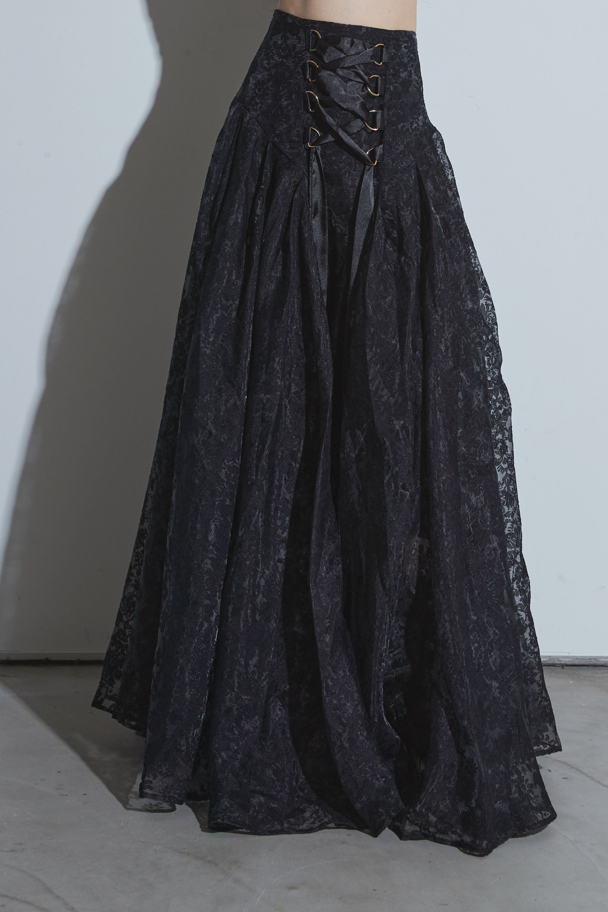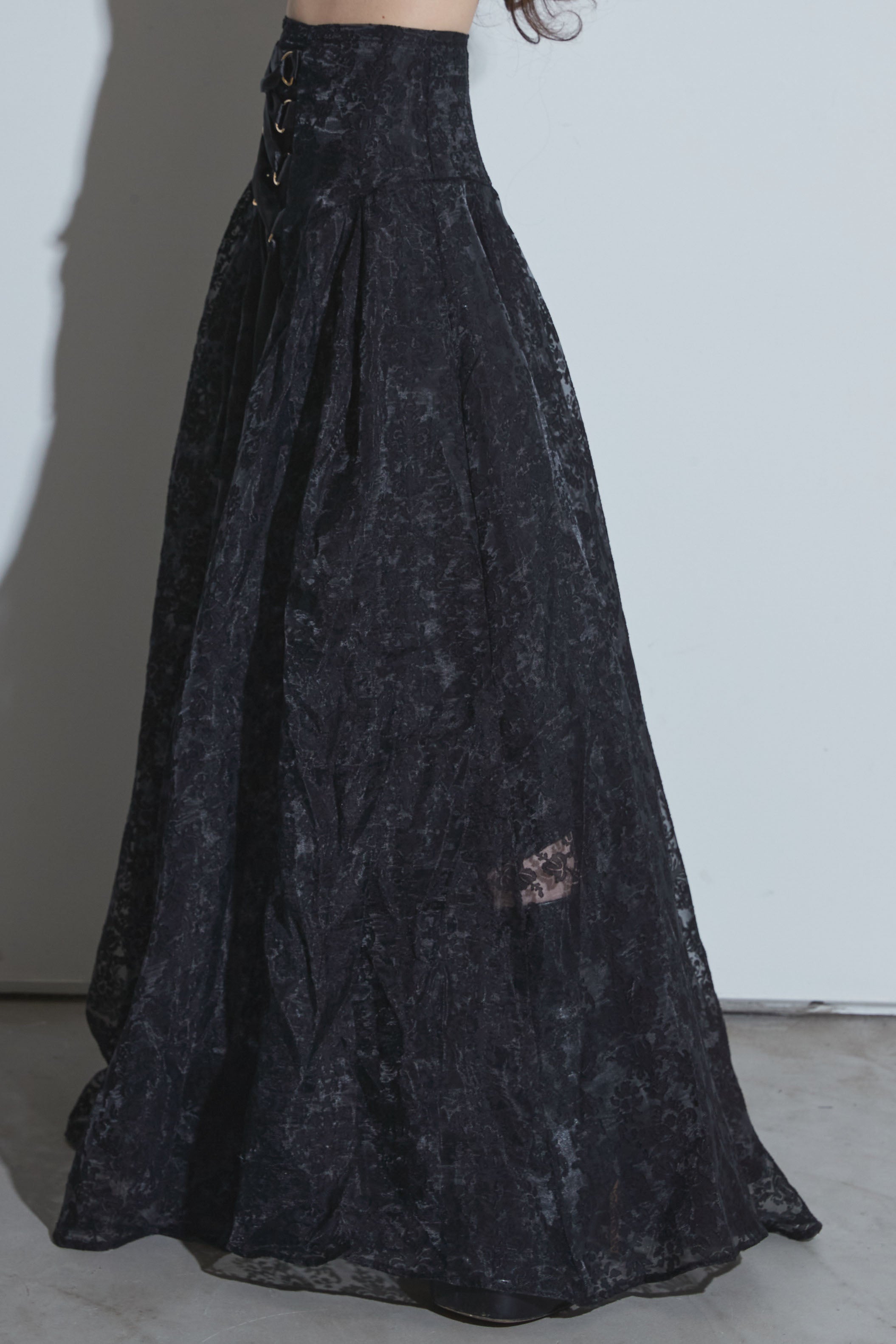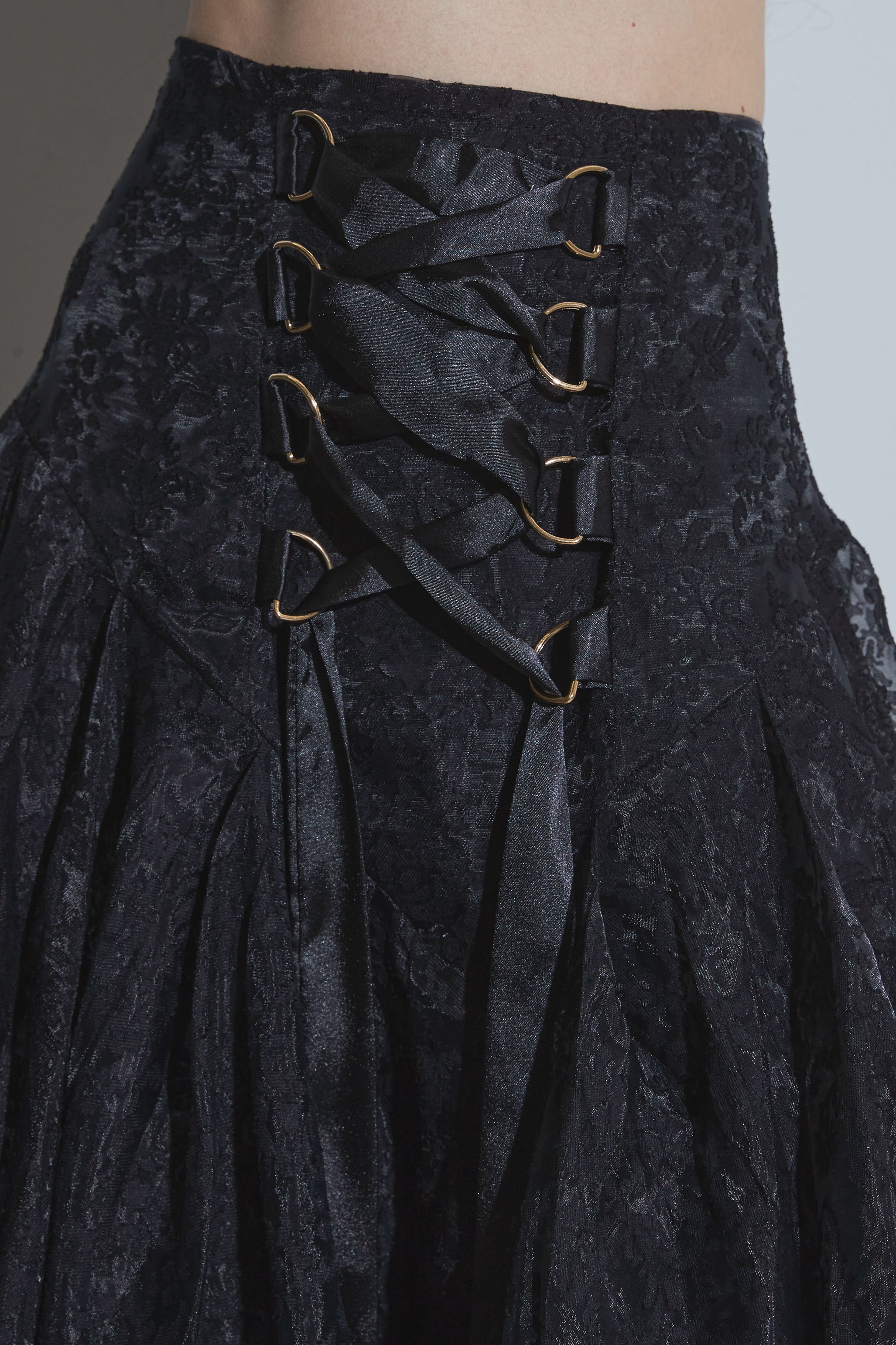 "光沢感のあるジャカード素材にレースを重ね、立体的な表情を生み出したロングスカート。 フロントのレースアップディテールがウエストラインを美しく引き立て、 エレガントな中に強さを感じる印象的なシルエットを演出します。 裾にかけて贅沢に広がるフレアラインがドラマティックなムードをプラス。 特別なシーンにも映える、存在感のある1着です。 "