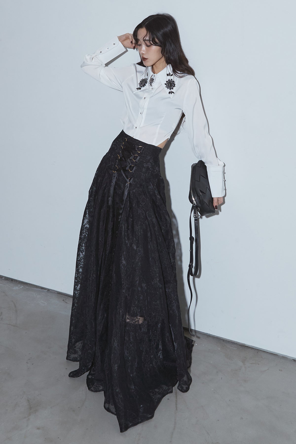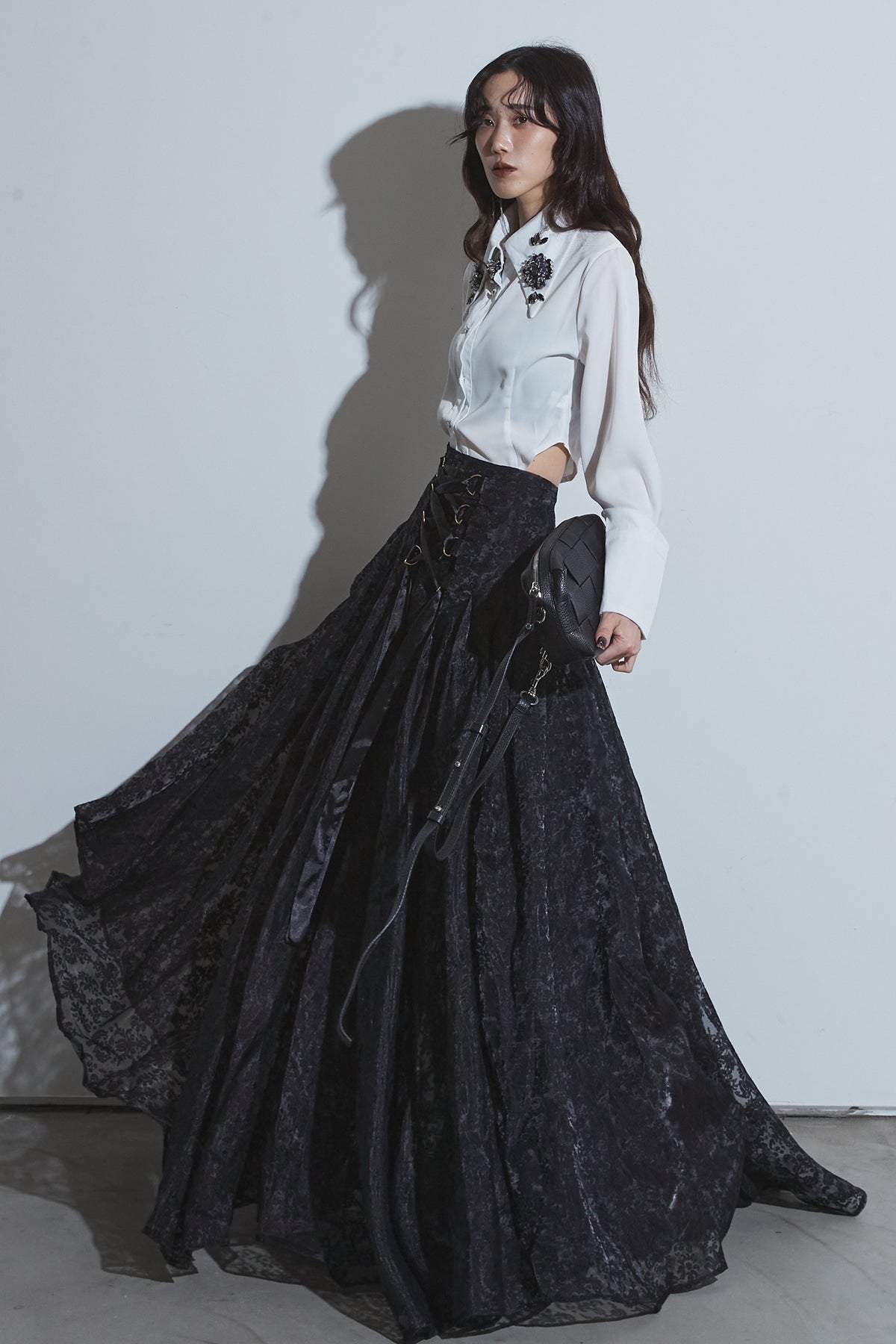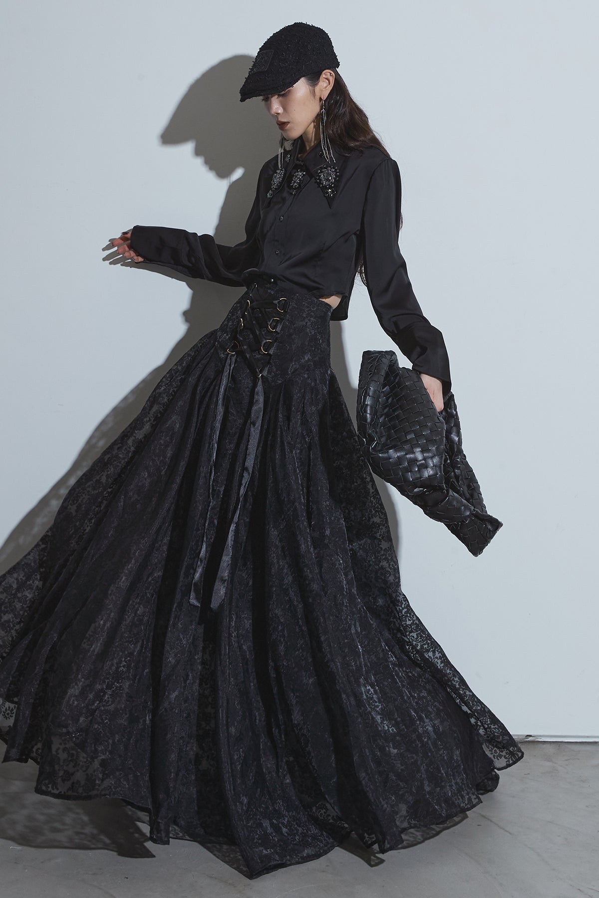 "光沢感のあるジャカード素材にレースを重ね、立体的な表情を生み出したロングスカート。 フロントのレースアップディテールがウエストラインを美しく引き立て、 エレガントな中に強さを感じる印象的なシルエットを演出します。 裾にかけて贅沢に広がるフレアラインがドラマティックなムードをプラス。 特別なシーンにも映える、存在感のある1着です。 "